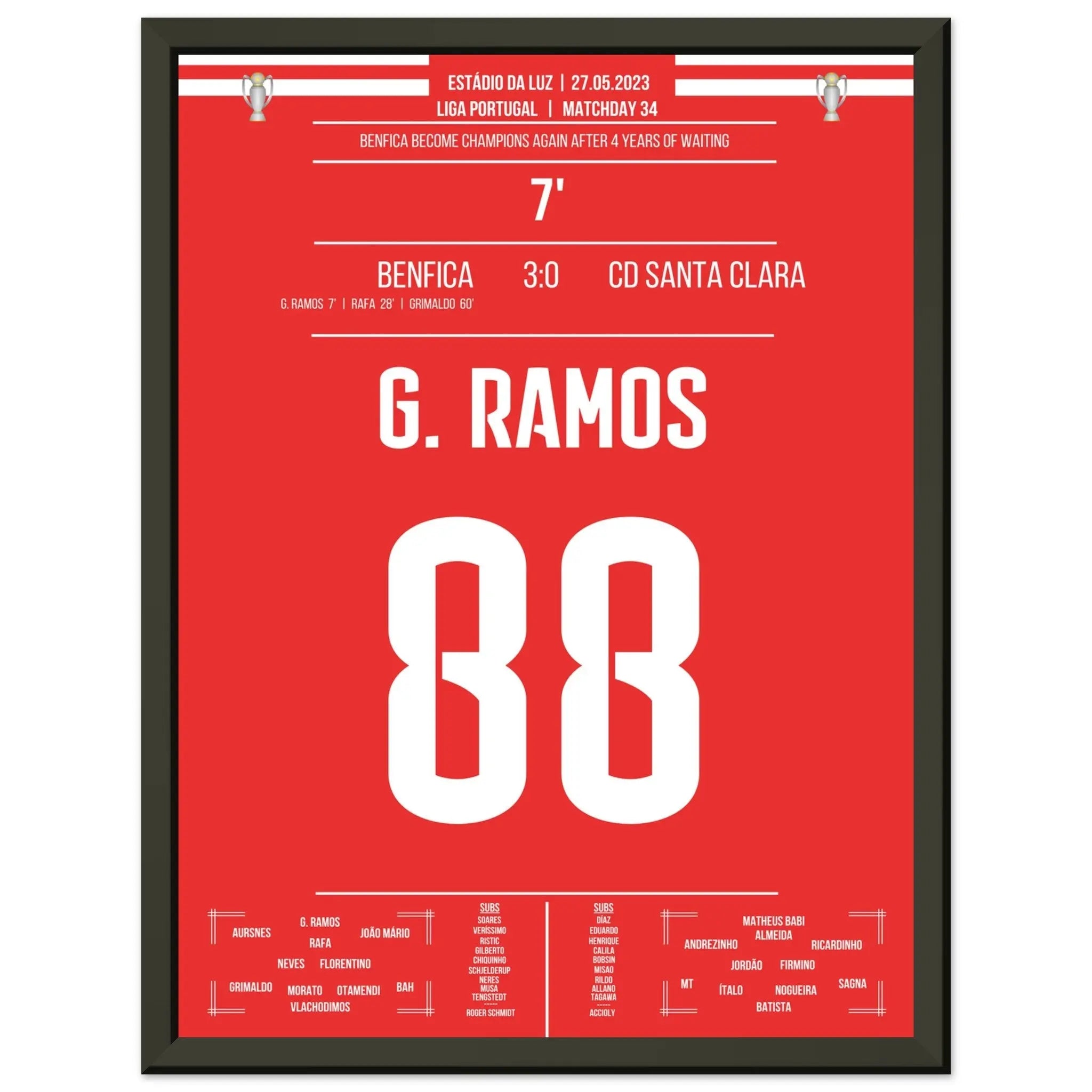 Sie können sicher sein, dass jedes Poster und jeder Rahmen in einer robusten Verpackung versandt wird, damit es in tadellosem Zustand ankommt. Es ist die perfekte Ergänzung für die Sammlung eines jeden Fußballfans oder das perfekte Geschenk für den eingefleischten Fußball-Fan ihres Freundes- oder Familienkreises.