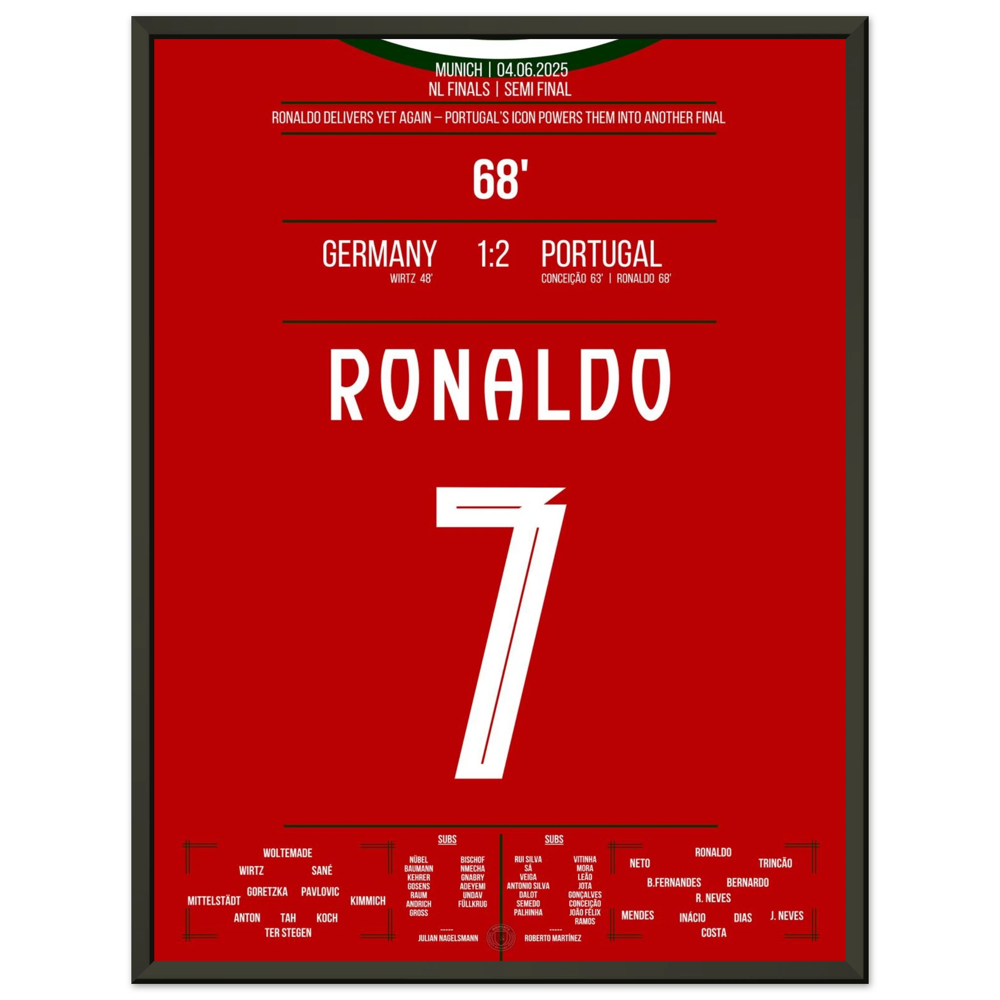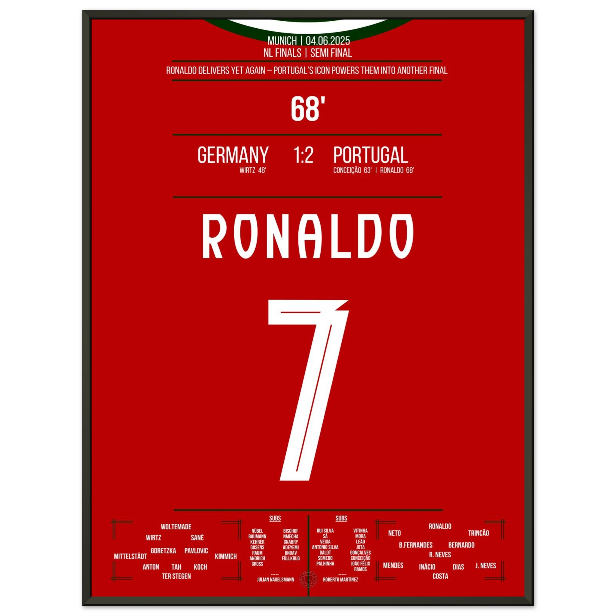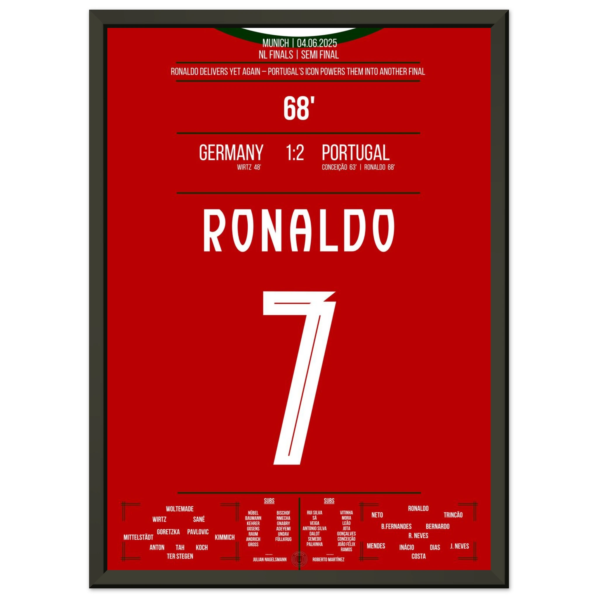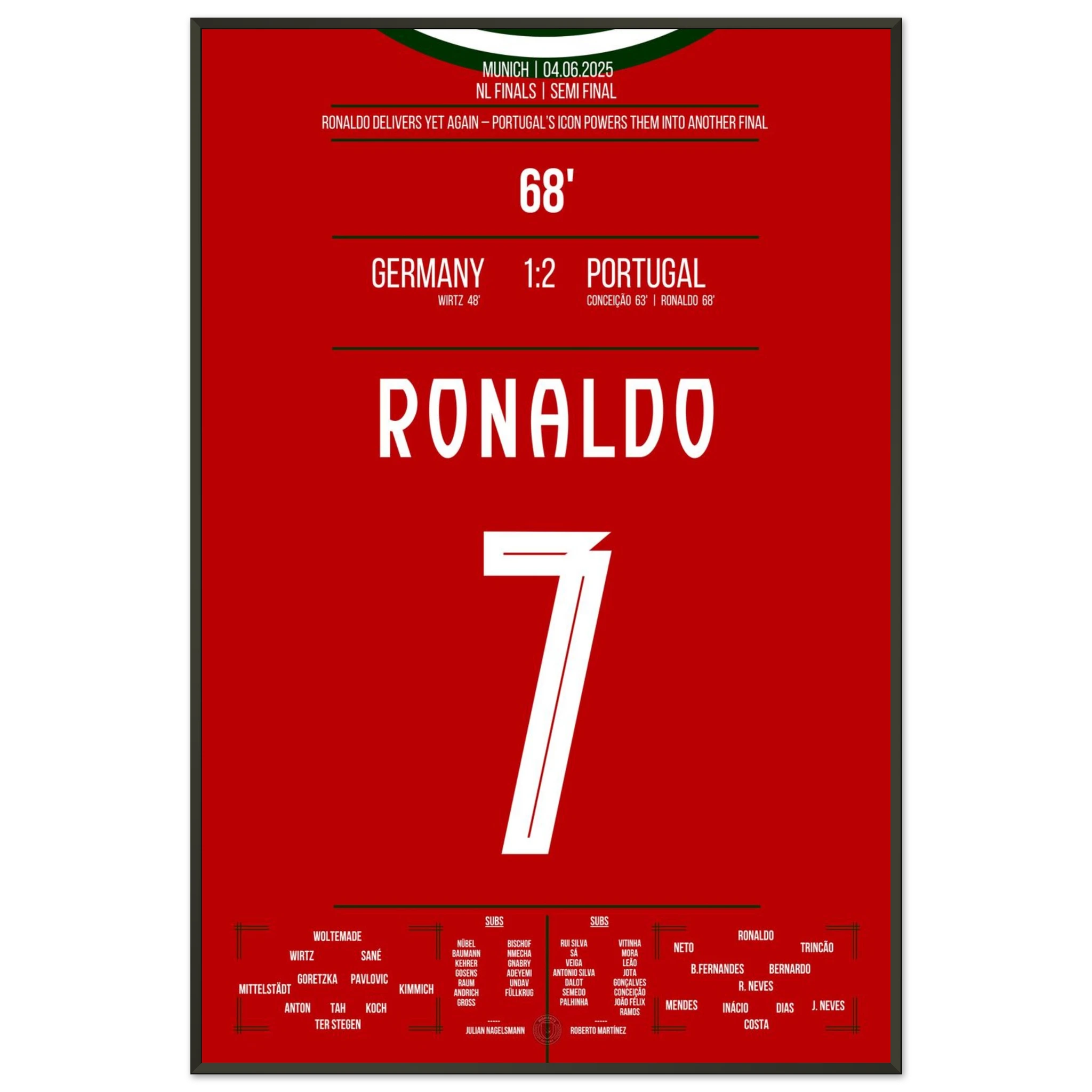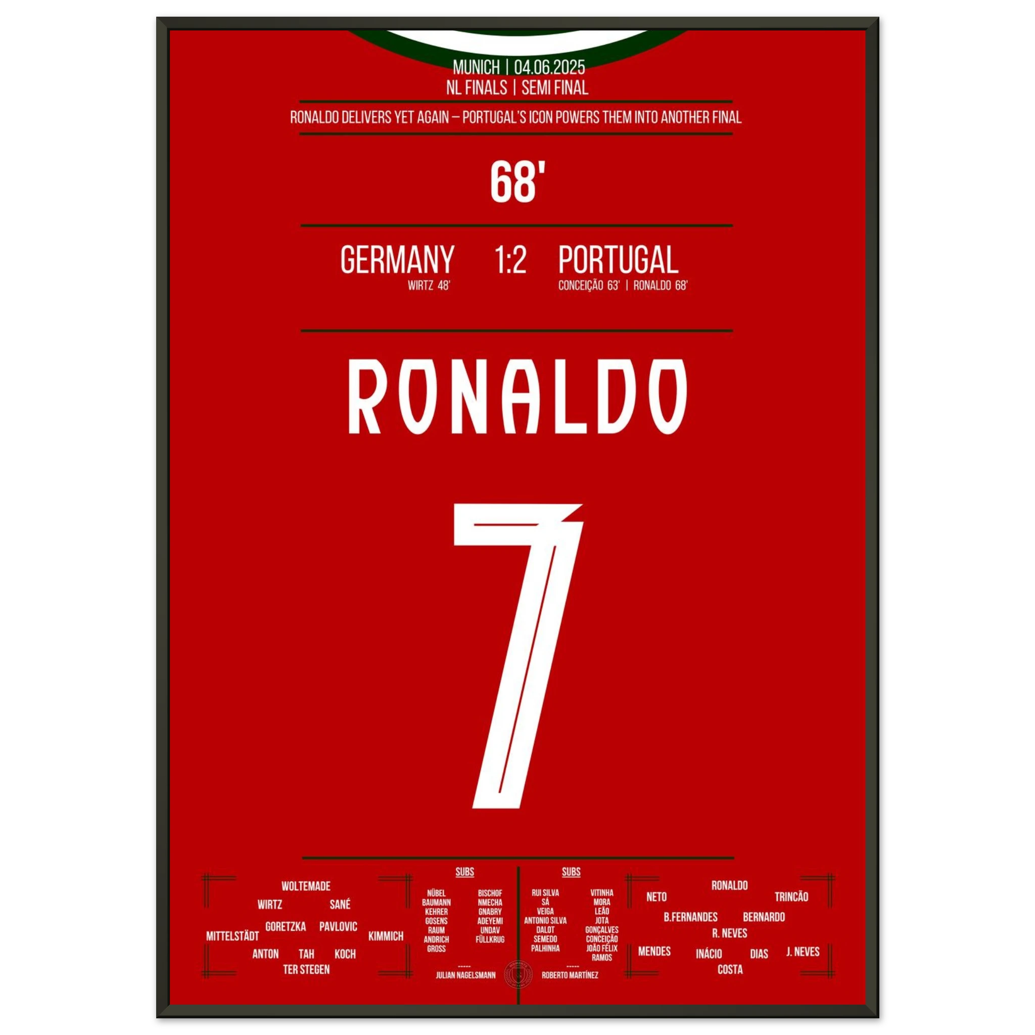 Unser Poster feiert diesen ikonischen Moment – Ronaldo, Präzision, Perfektion und pure Geschichte. 🇵🇹✨
