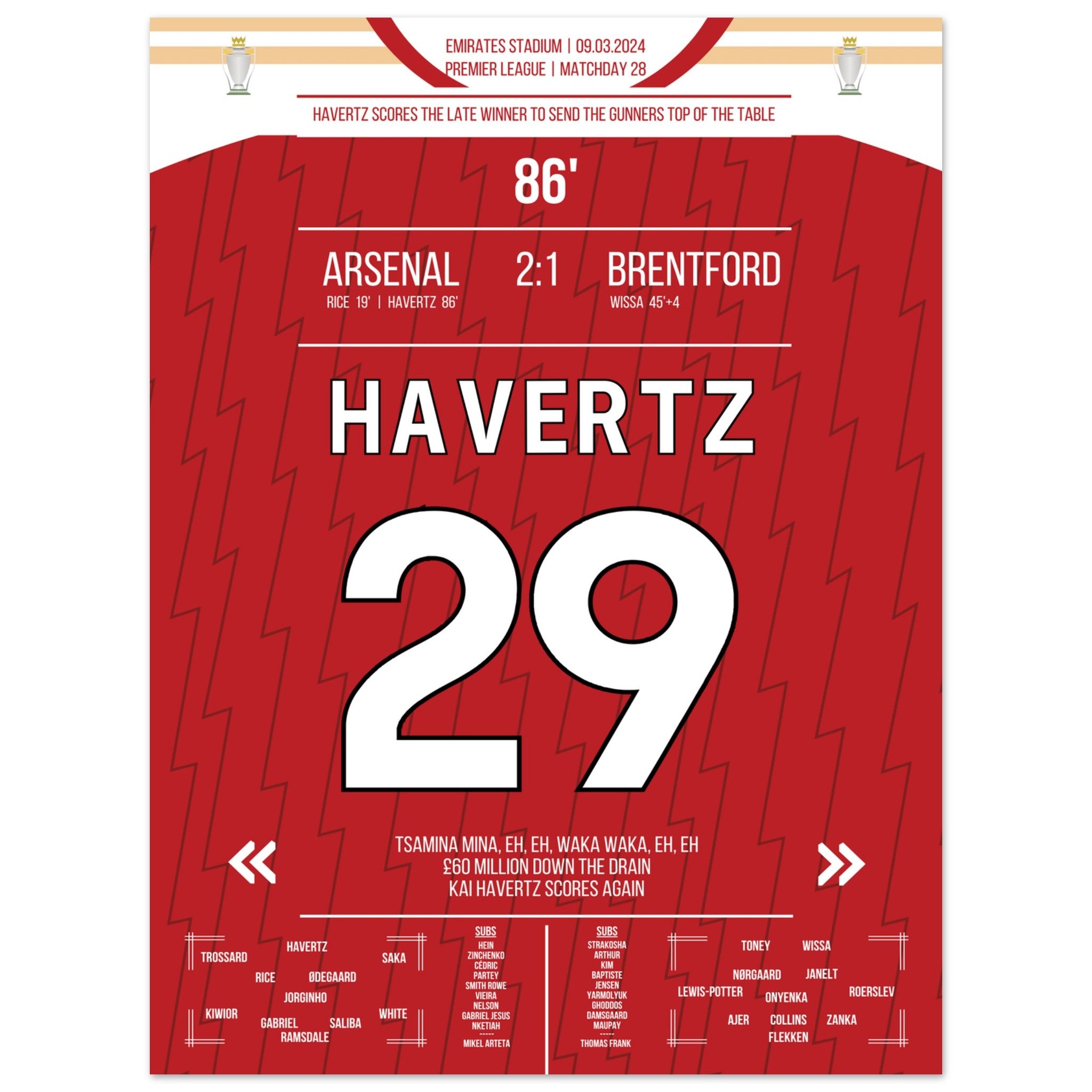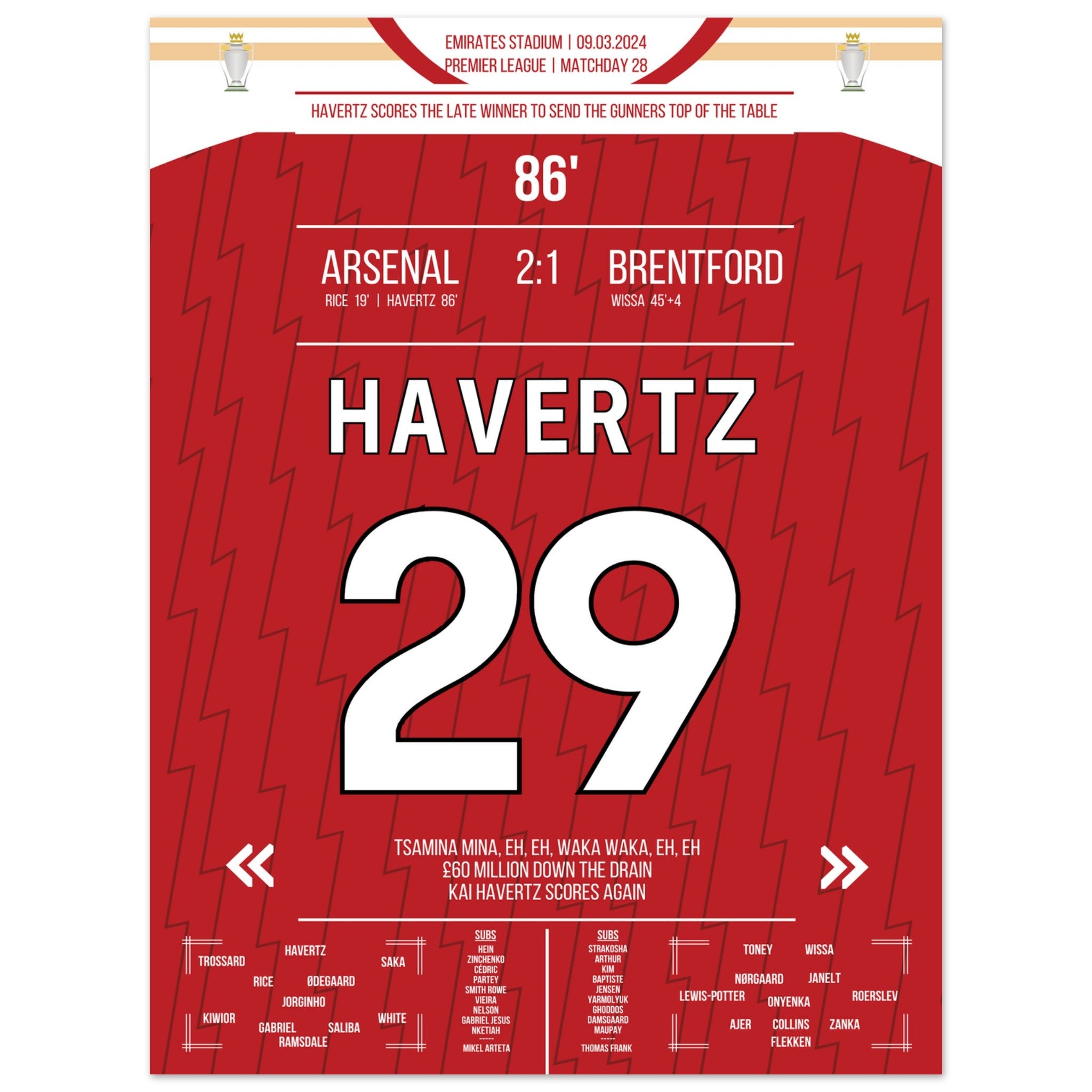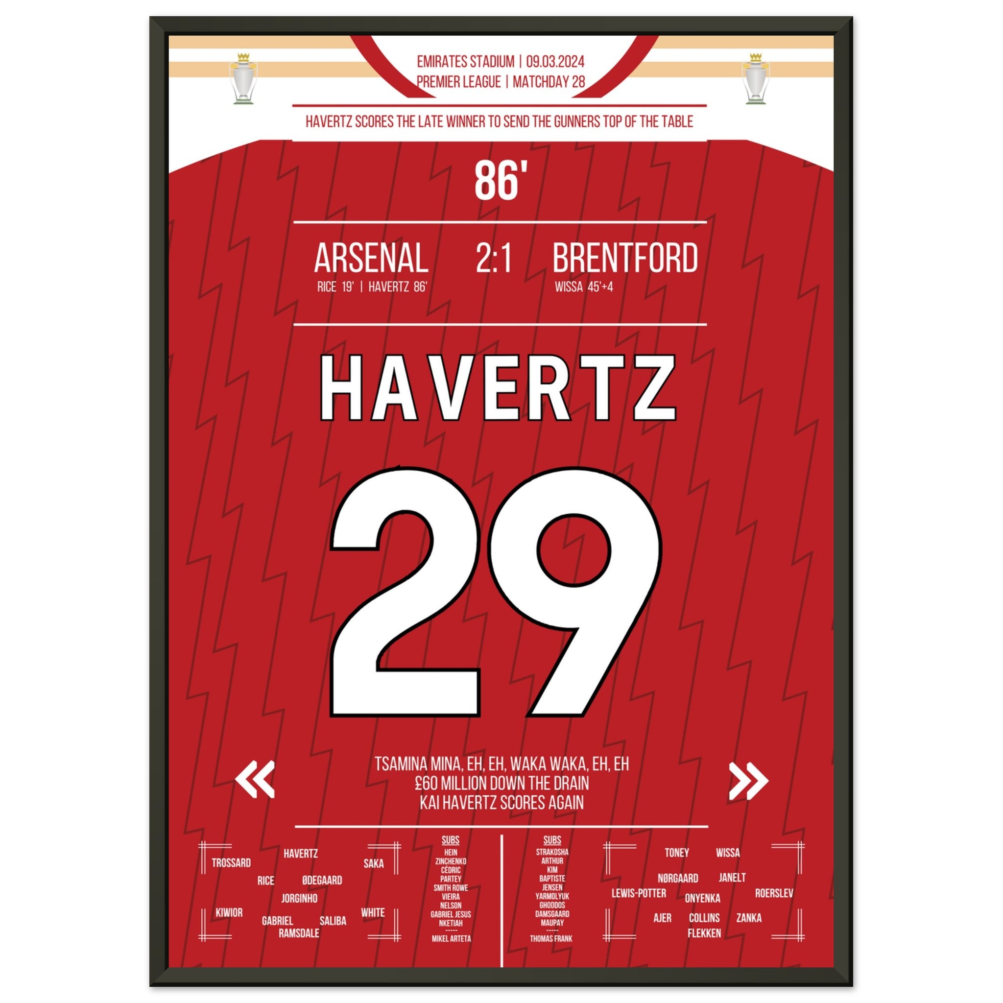 Havertz marque le but de la victoire tardif des Gunners qui les propulse en tête du classement.