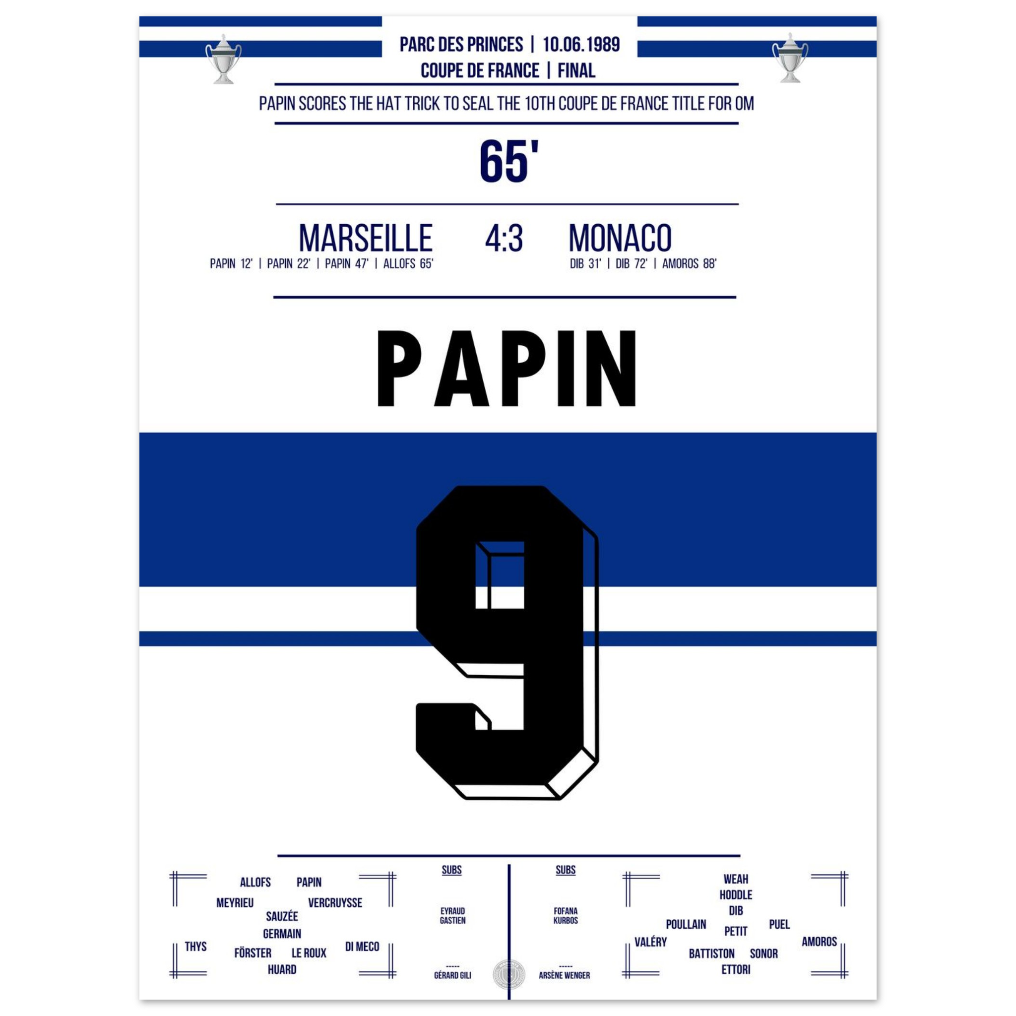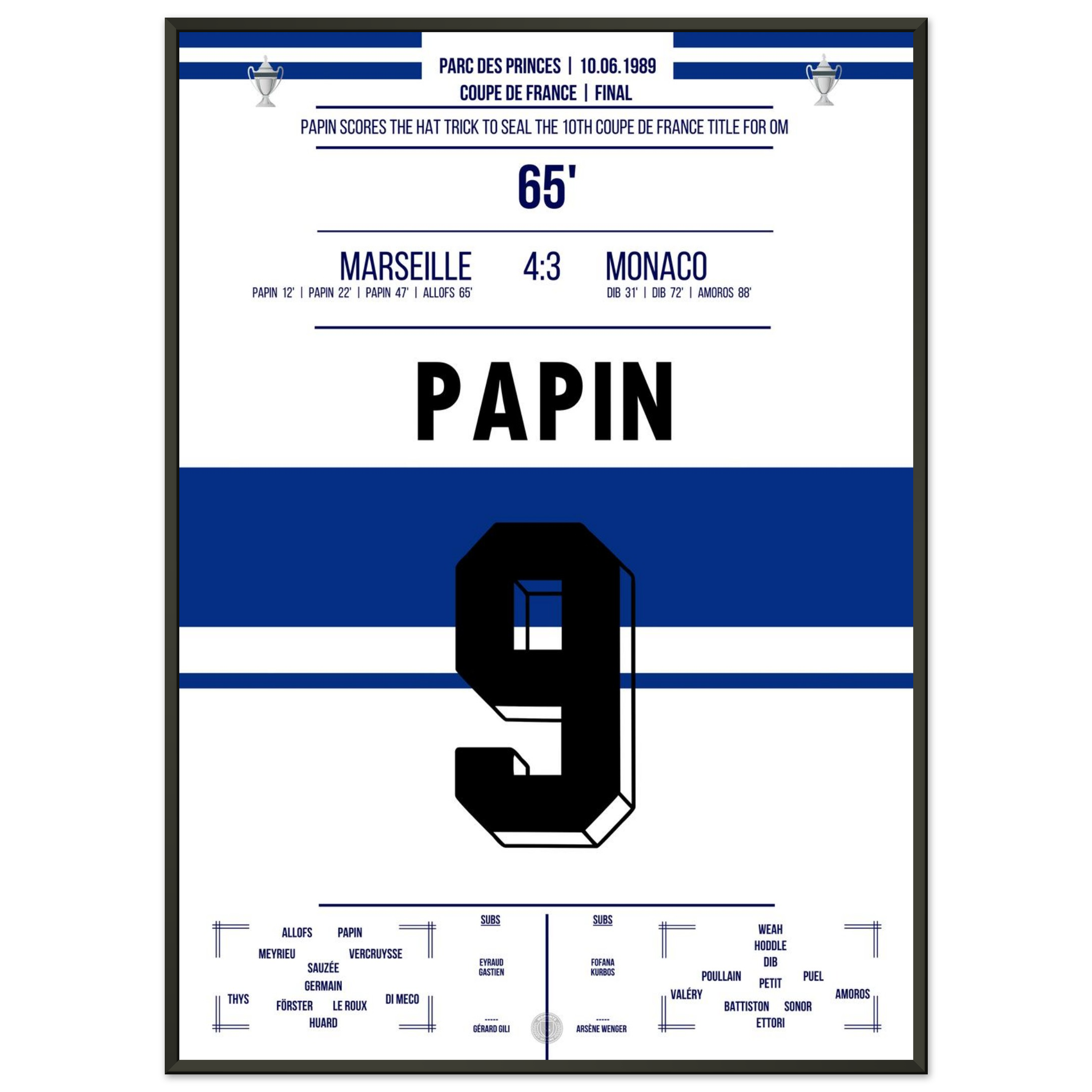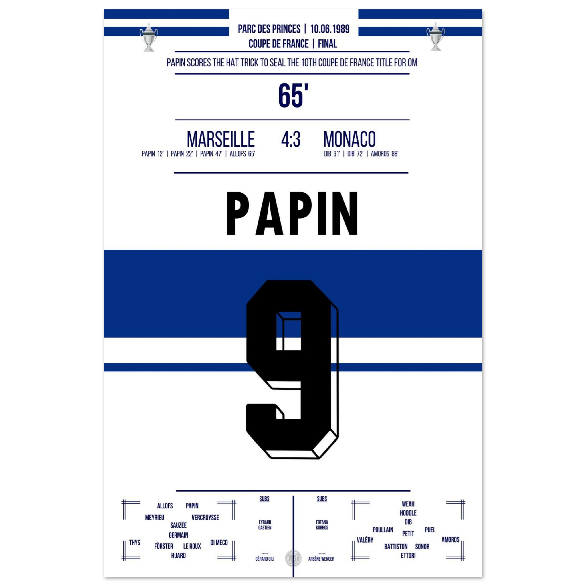 Dieses Poster fängt den Moment ein, in dem ein Stürmer zur Legende und Marseille zur Pokalmacht wurde.