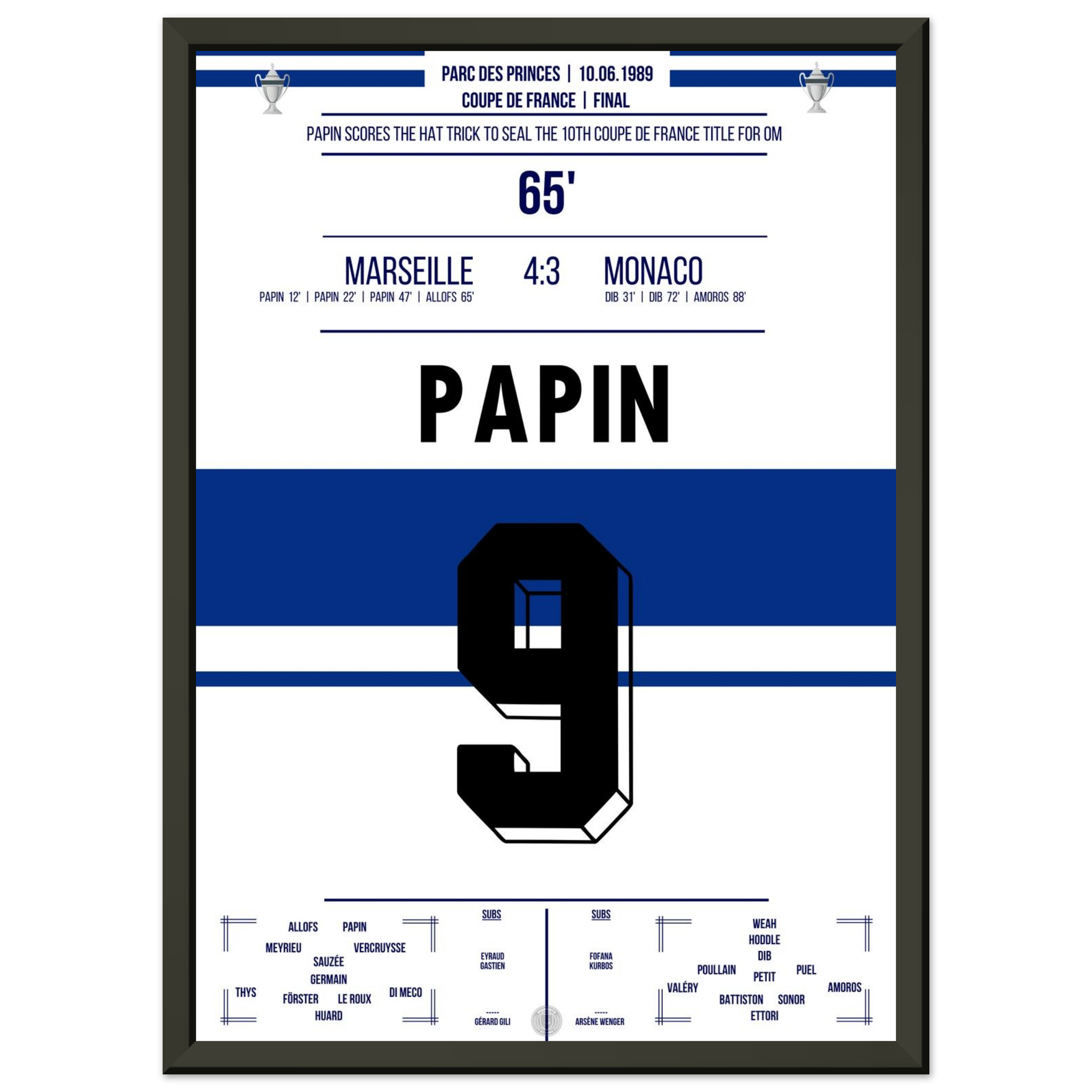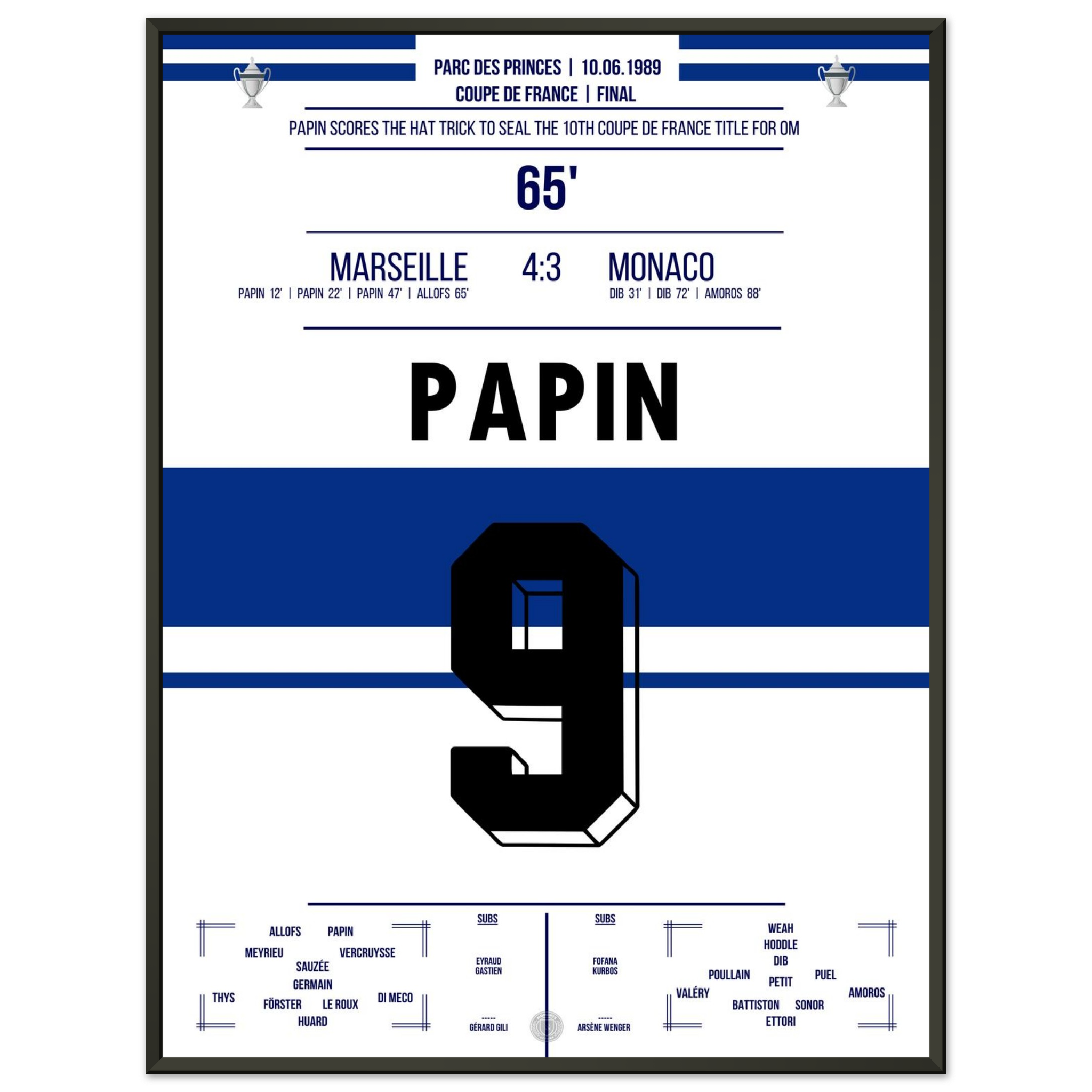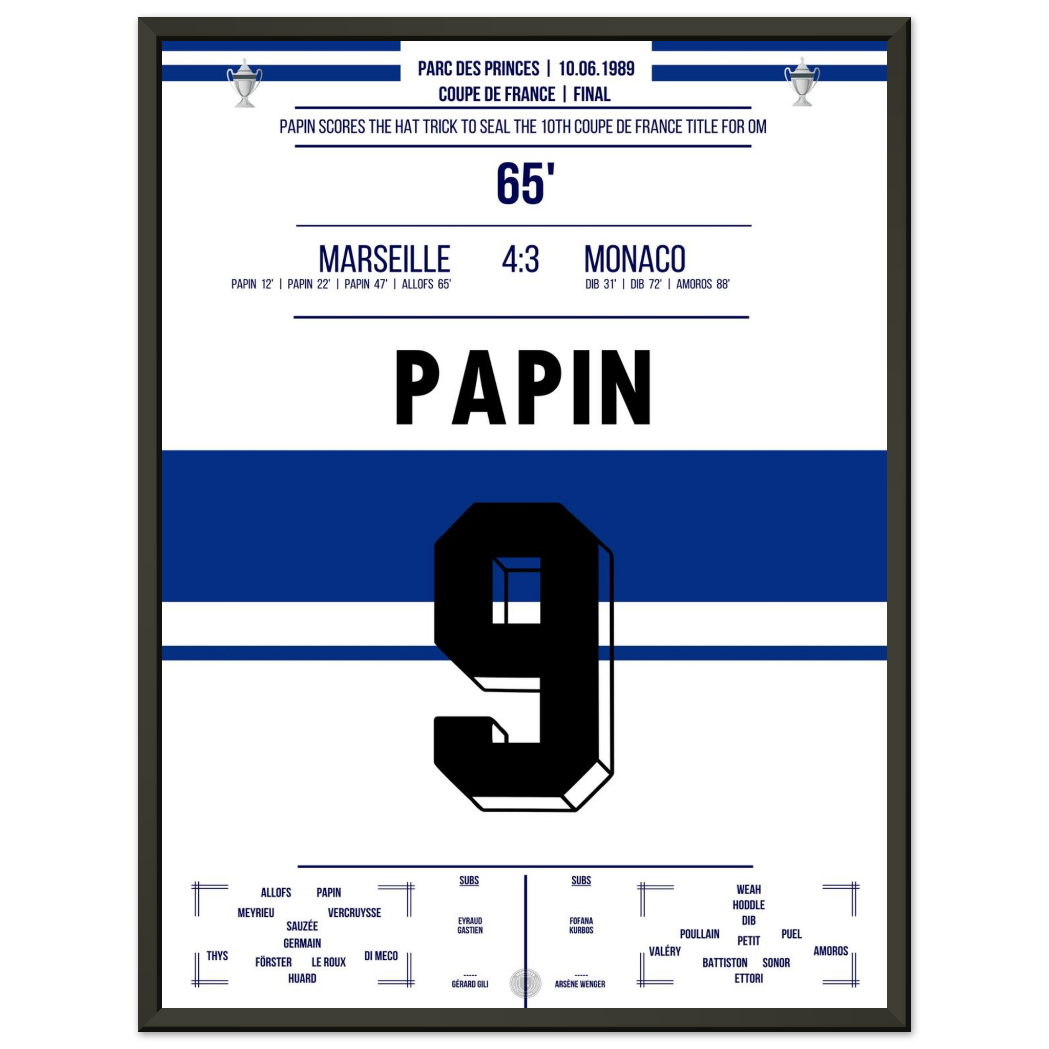 Dieses Poster fängt den Moment ein, in dem ein Stürmer zur Legende und Marseille zur Pokalmacht wurde.