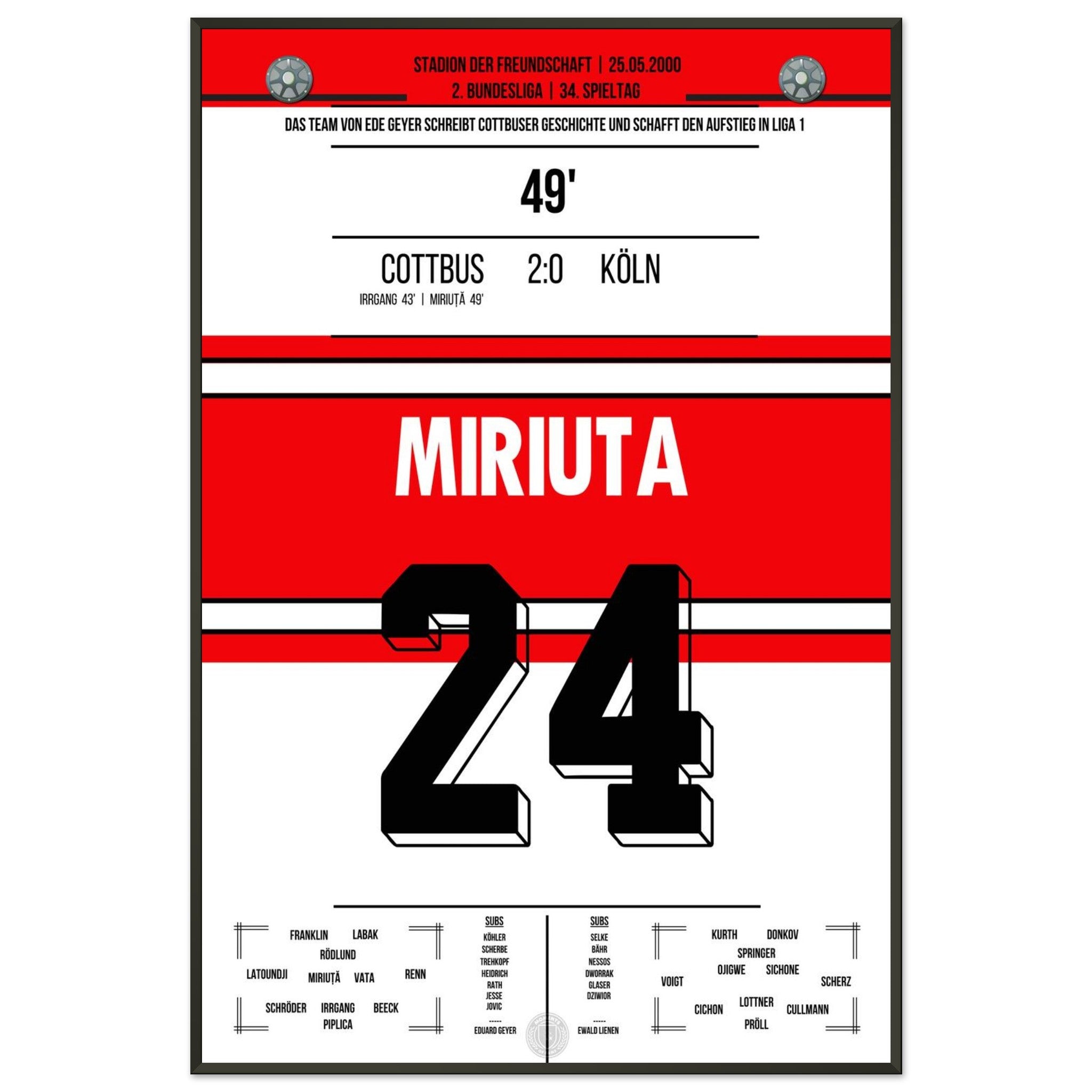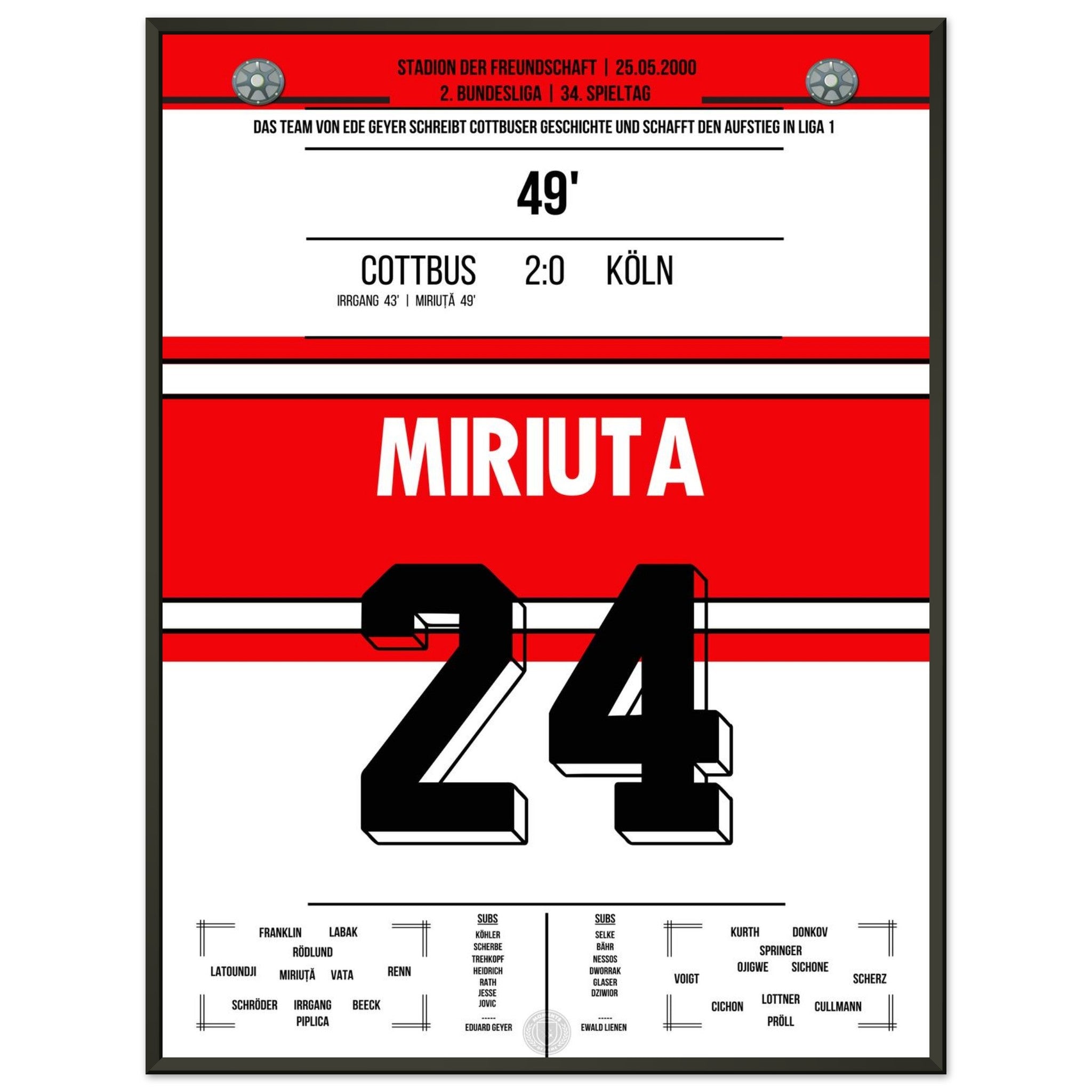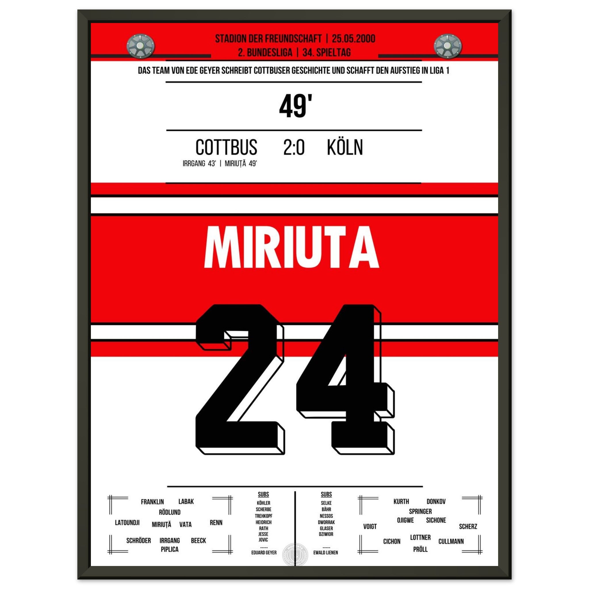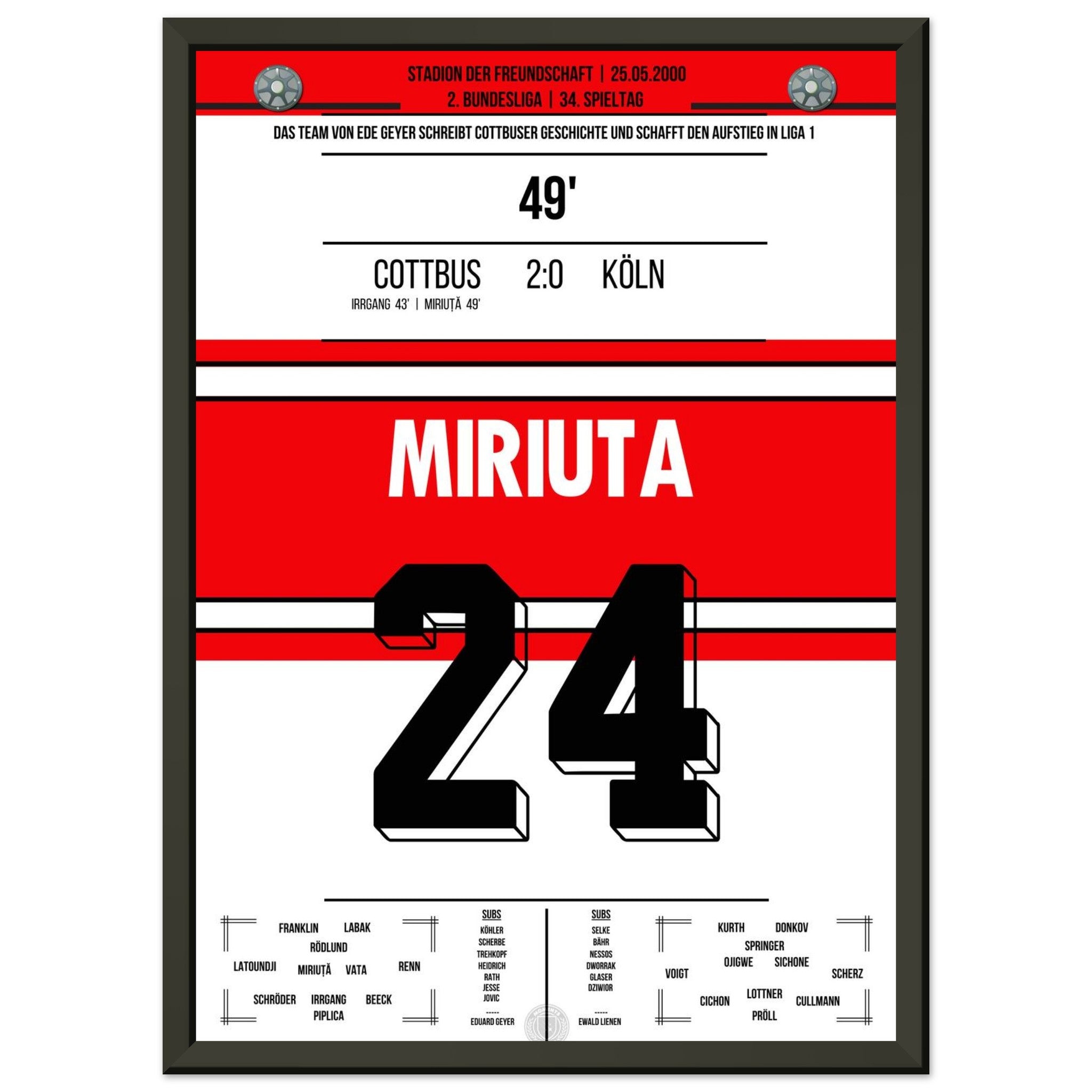 Das Poster hält den besonderen Moment fest, als Vasile Miriuță am 6. Spieltag der Saison 2000/01 per Freistoß den 2:0-Endstand für Cottbus gegen den FC markierte. Sein technisch perfekter Schuss krönte eine starke Mannschaftsleistung und sorgte im Stadion der Freundschaft für Gänsehautstimmung. Ein Klassiker für echte Cottbus-Fans.
