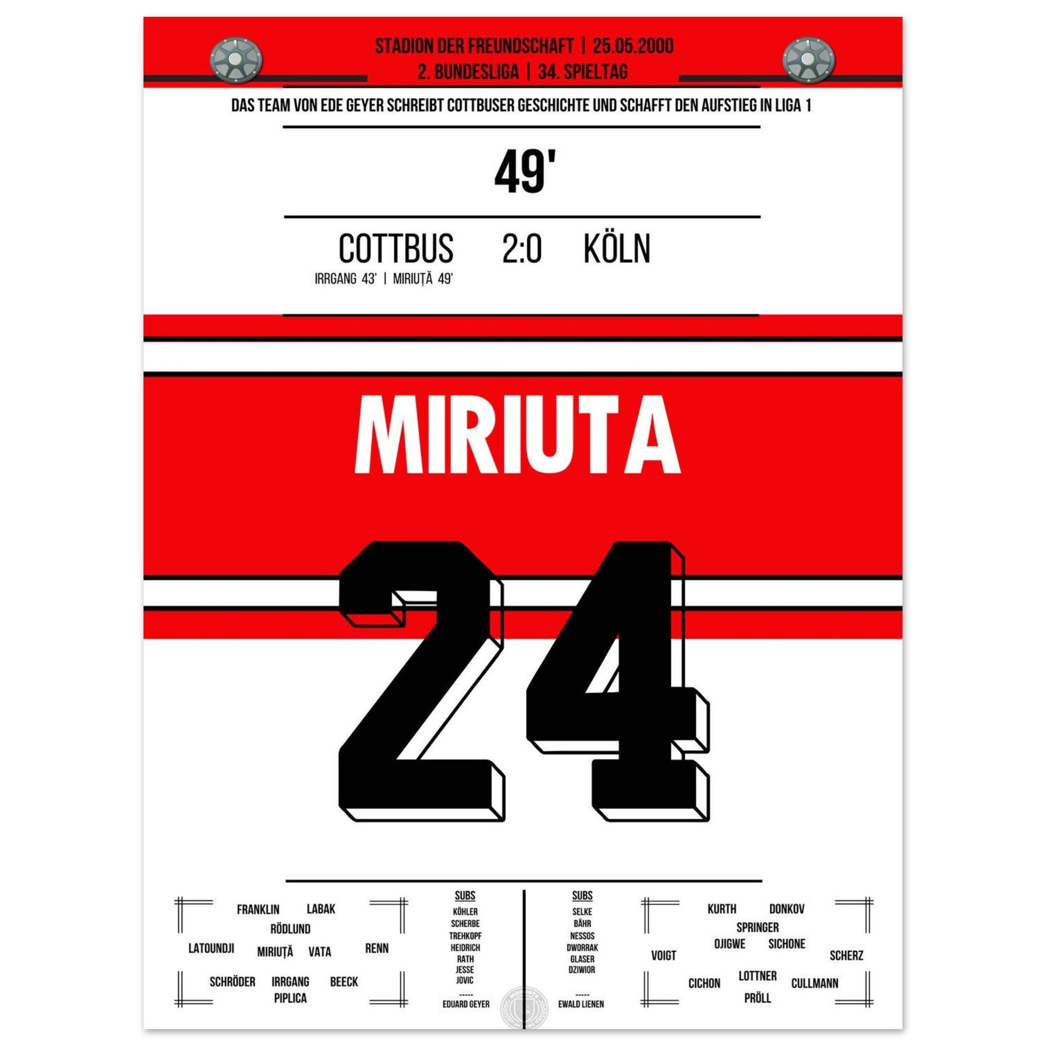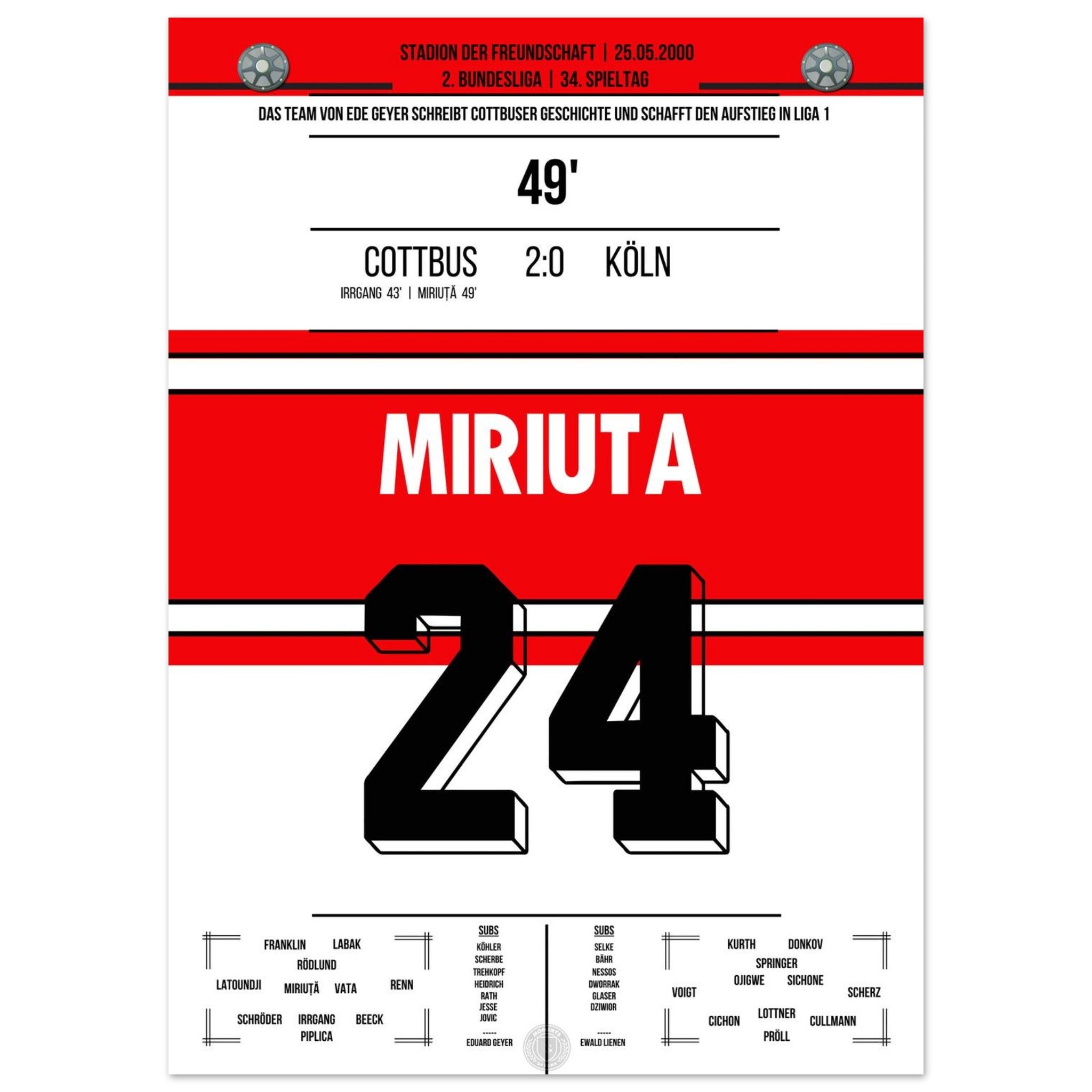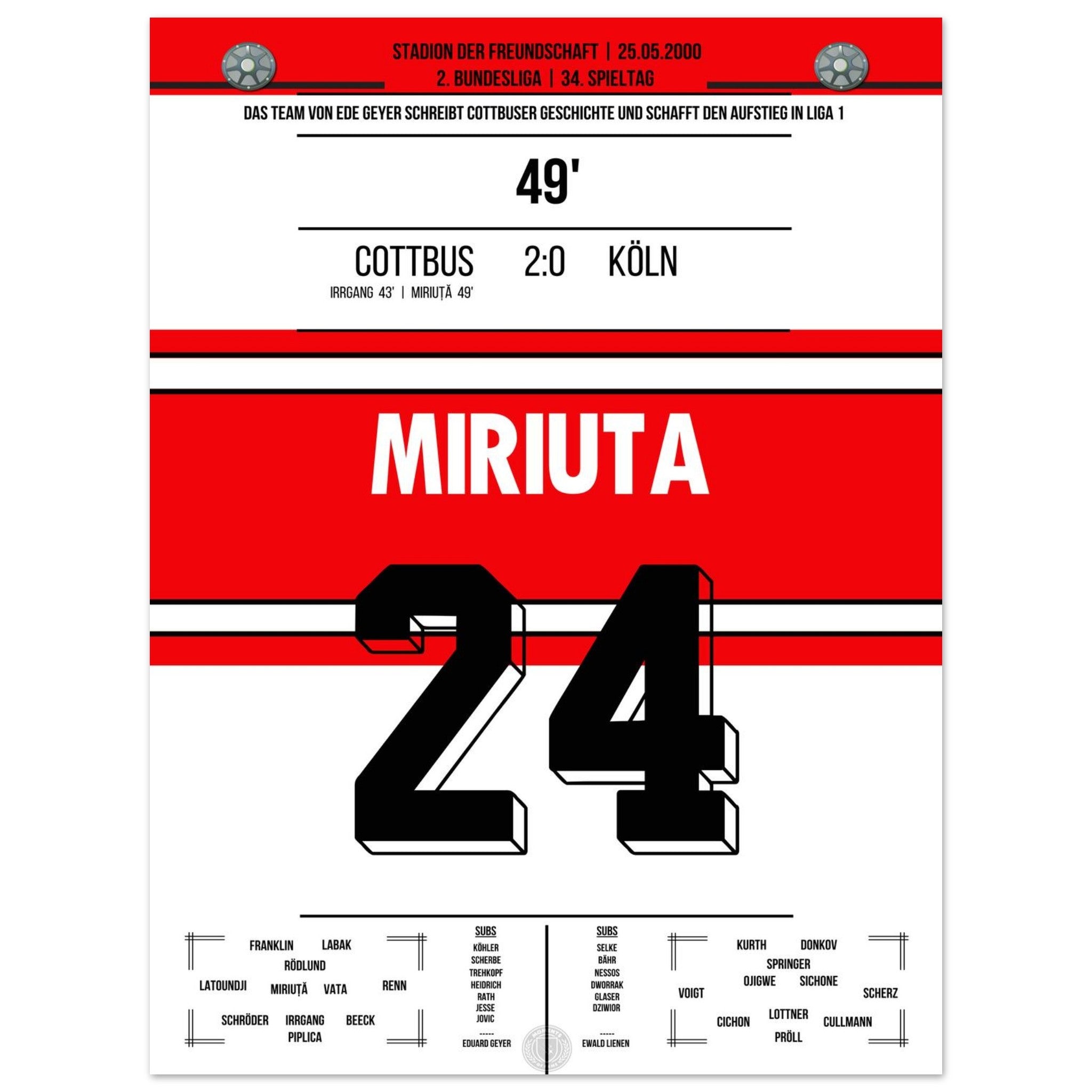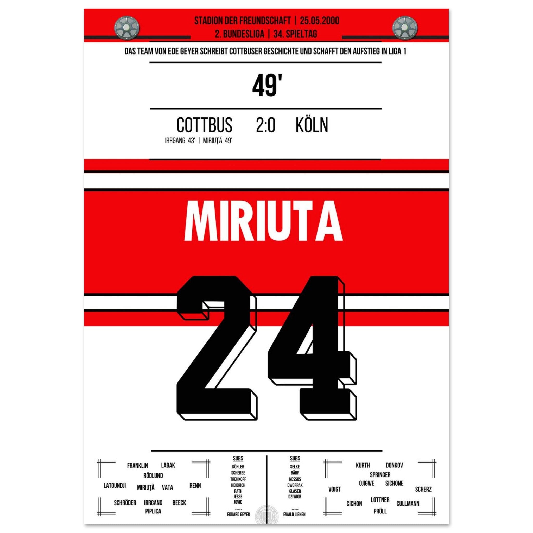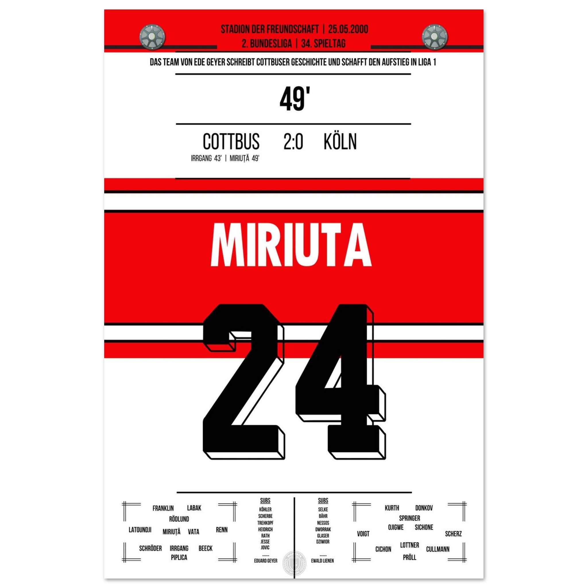 Das Poster hält den besonderen Moment fest, als Vasile Miriuță am 6. Spieltag der Saison 2000/01 per Freistoß den 2:0-Endstand für Cottbus gegen den FC markierte. Sein technisch perfekter Schuss krönte eine starke Mannschaftsleistung und sorgte im Stadion der Freundschaft für Gänsehautstimmung. Ein Klassiker für echte Cottbus-Fans.