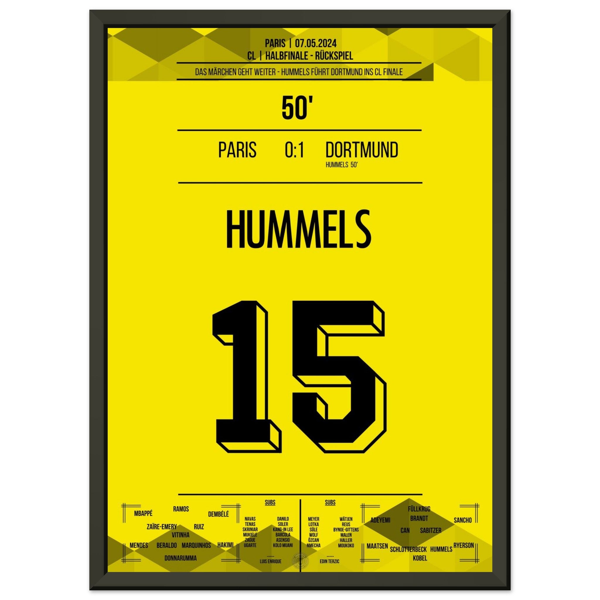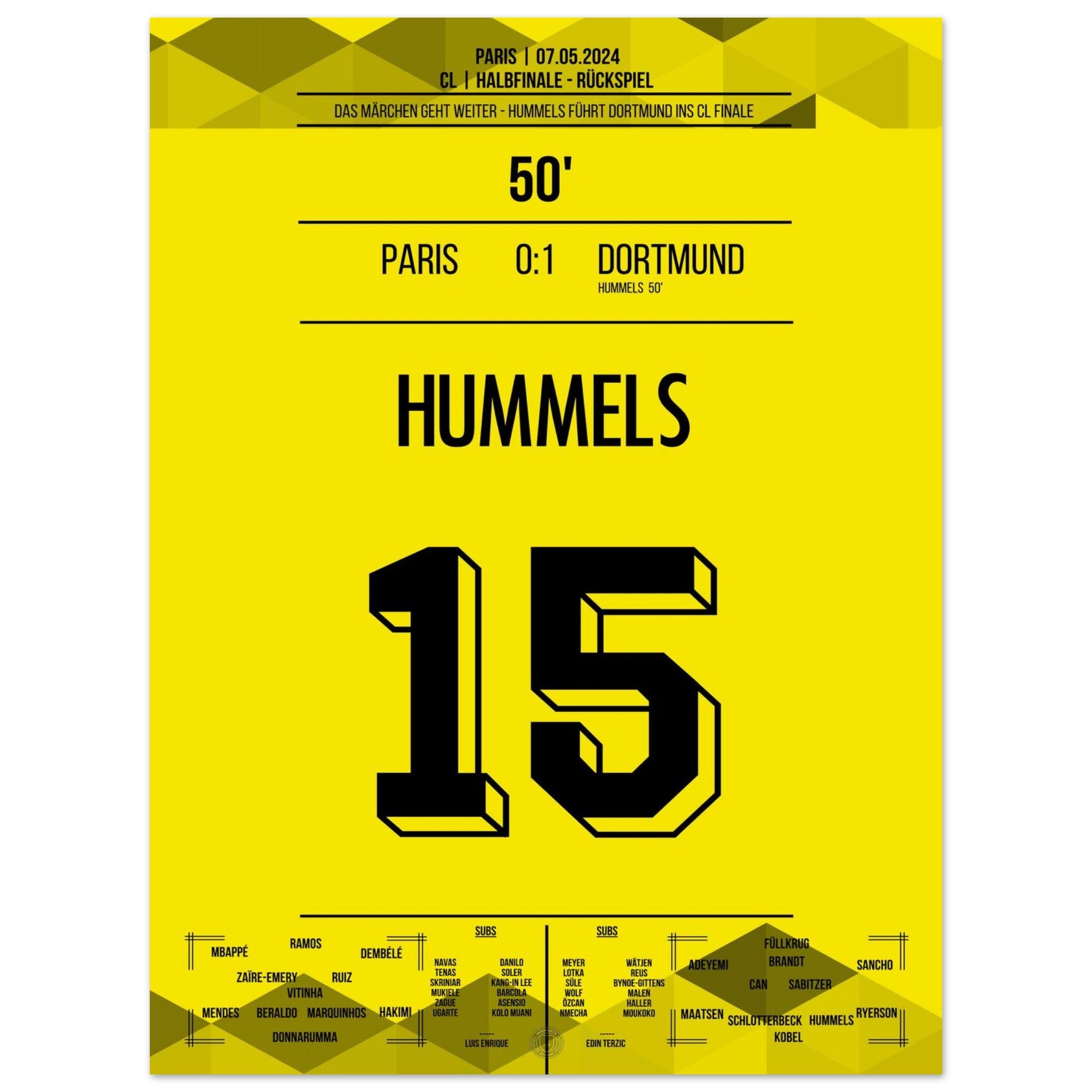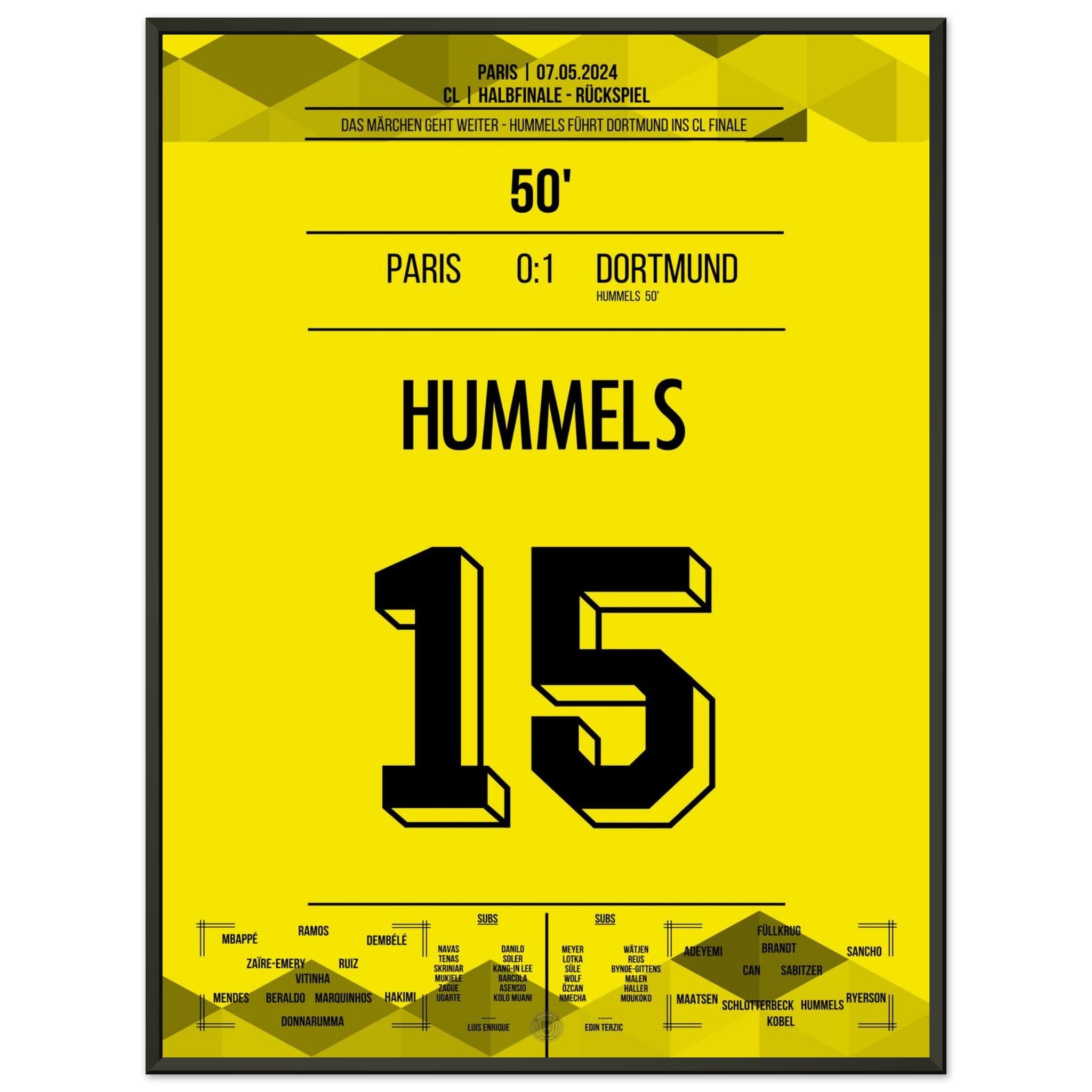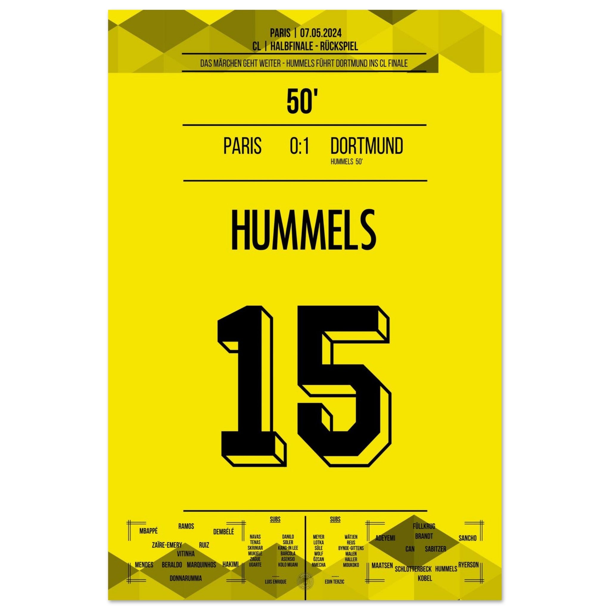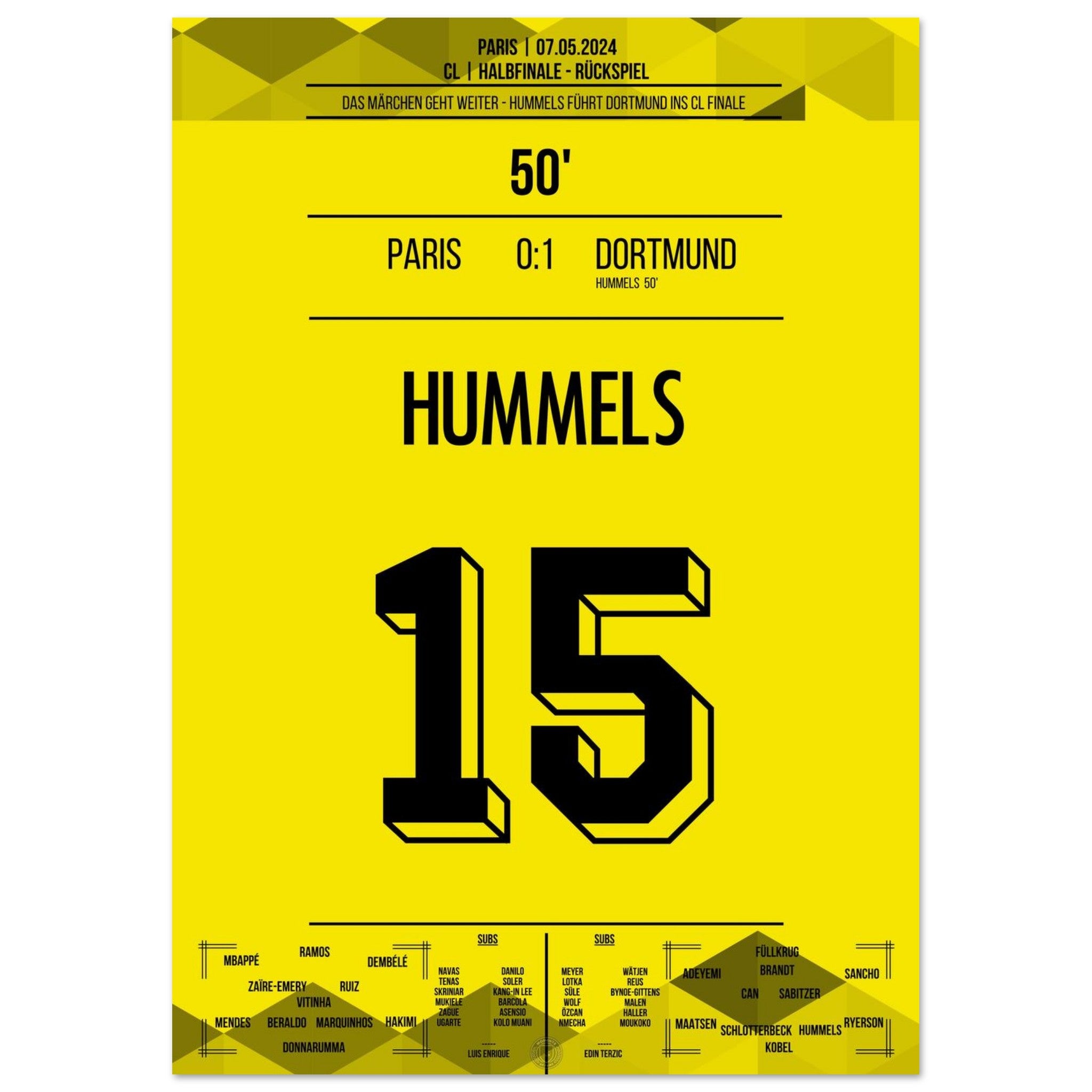 7. Mai 2024 – Paris vs. Dortmund 0:1: In der 50. Minute steigt Mats Hummels nach einer Ecke am höchsten und köpft Dortmund ins CL-Finale. Mit einer Weltklasseleistung in der Defensive krönt er sich zum Matchwinner im Pariser Hexenkessel. Unser Poster hält diesen königlichen Moment für immer fest.
