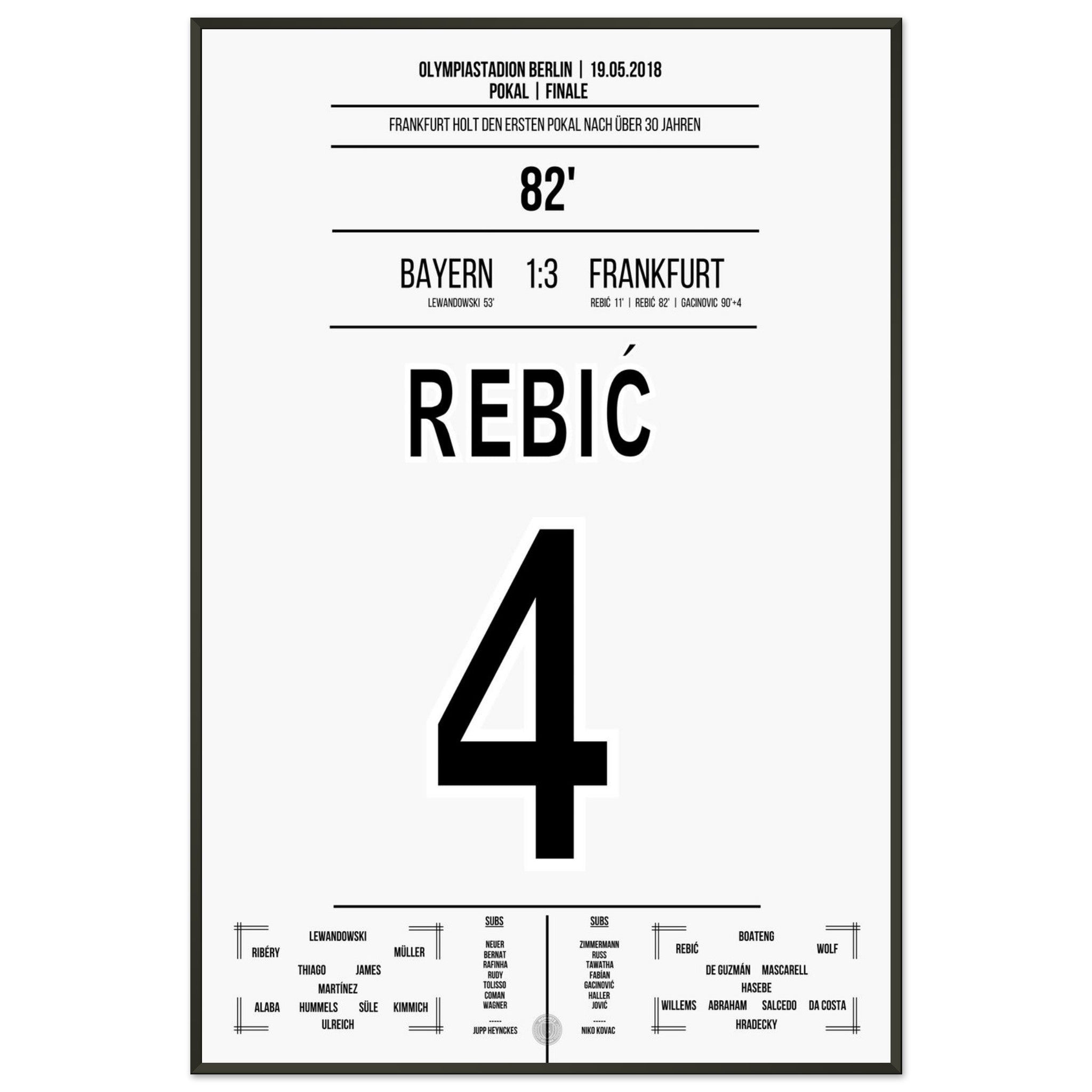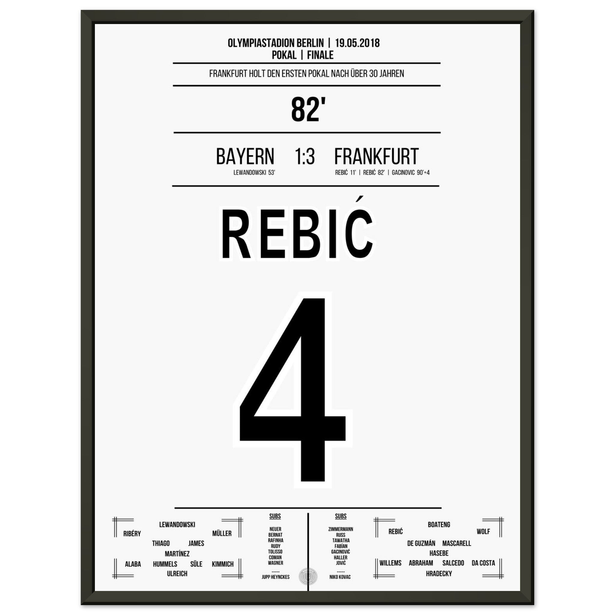 19. Mai 2018 – Bayern vs. Frankfurt 1:3: In der 82. Minute macht Ante Rebić mit seinem zweiten Treffer im Pokalfinale gegen Bayern alles klar – Frankfurt steht vor dem ersten Titel seit 30 Jahren. Tempo, Wille, Abschluss – ein perfekter Moment. Unser Poster verewigt diesen historischen Triumph im Berliner Olympiastadion.