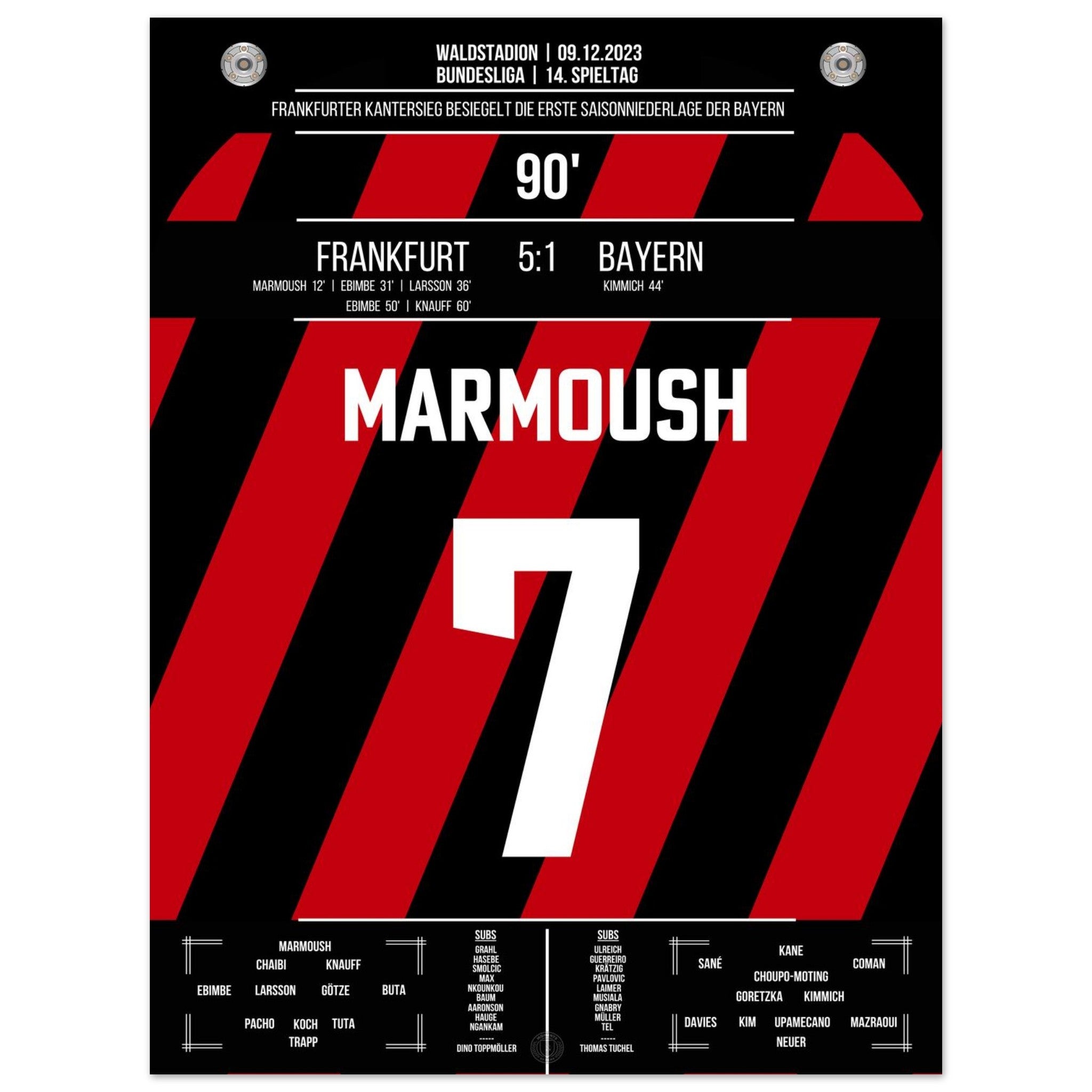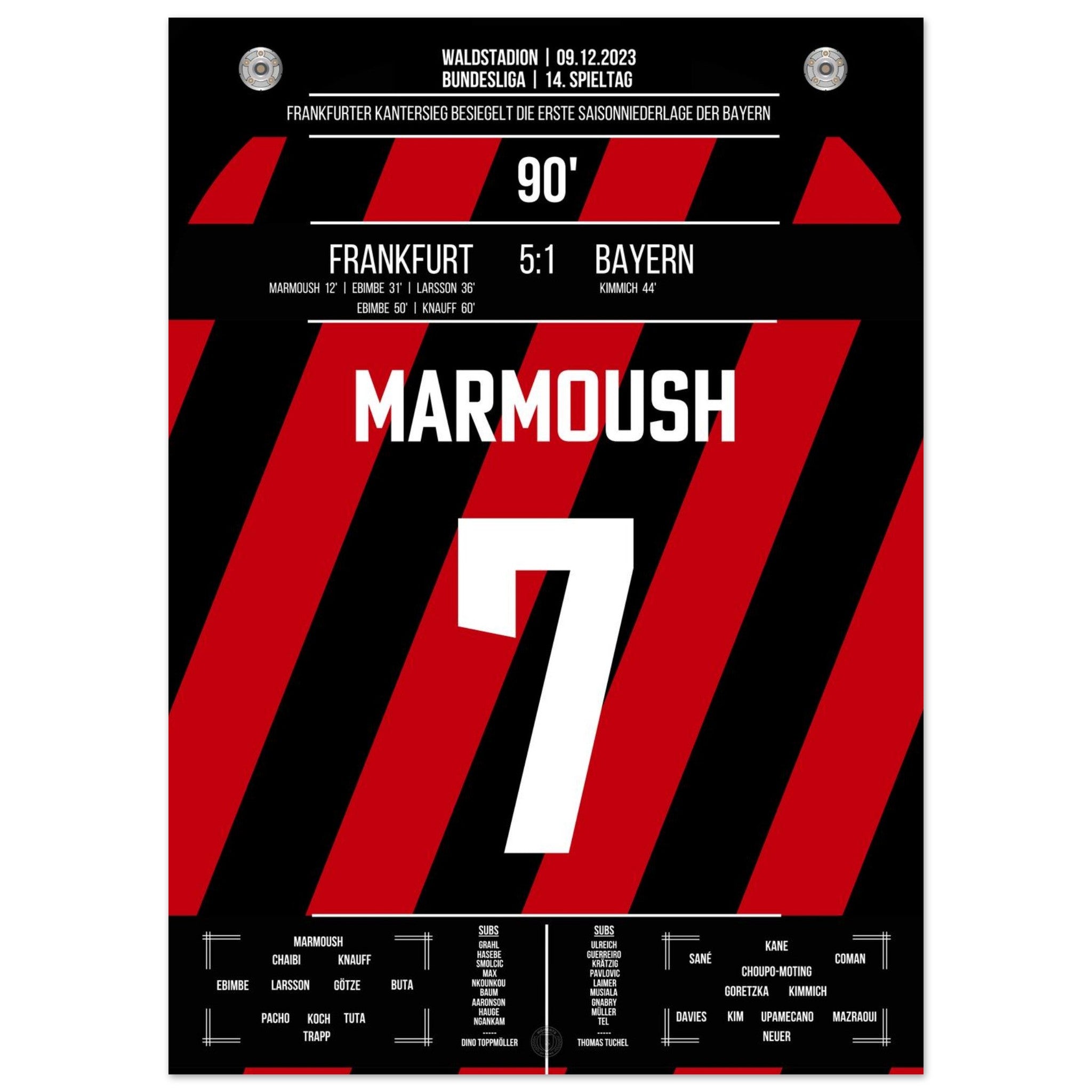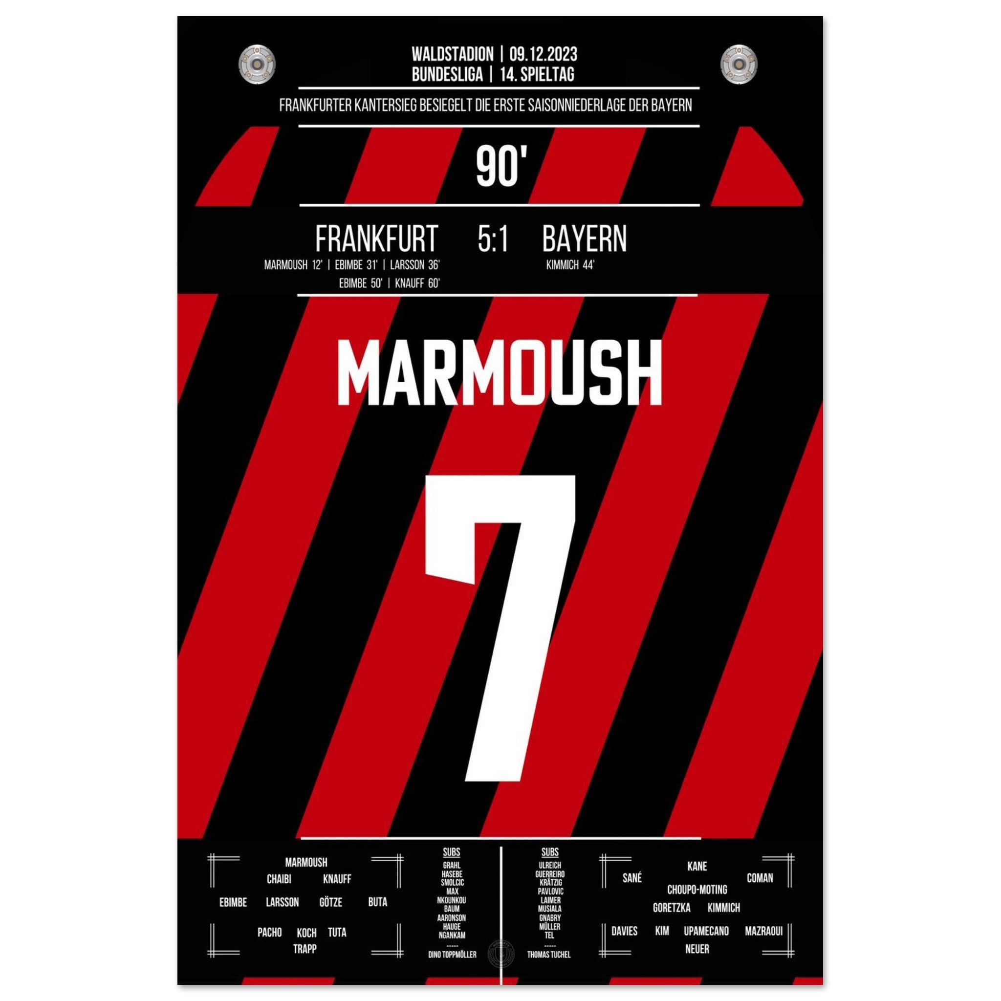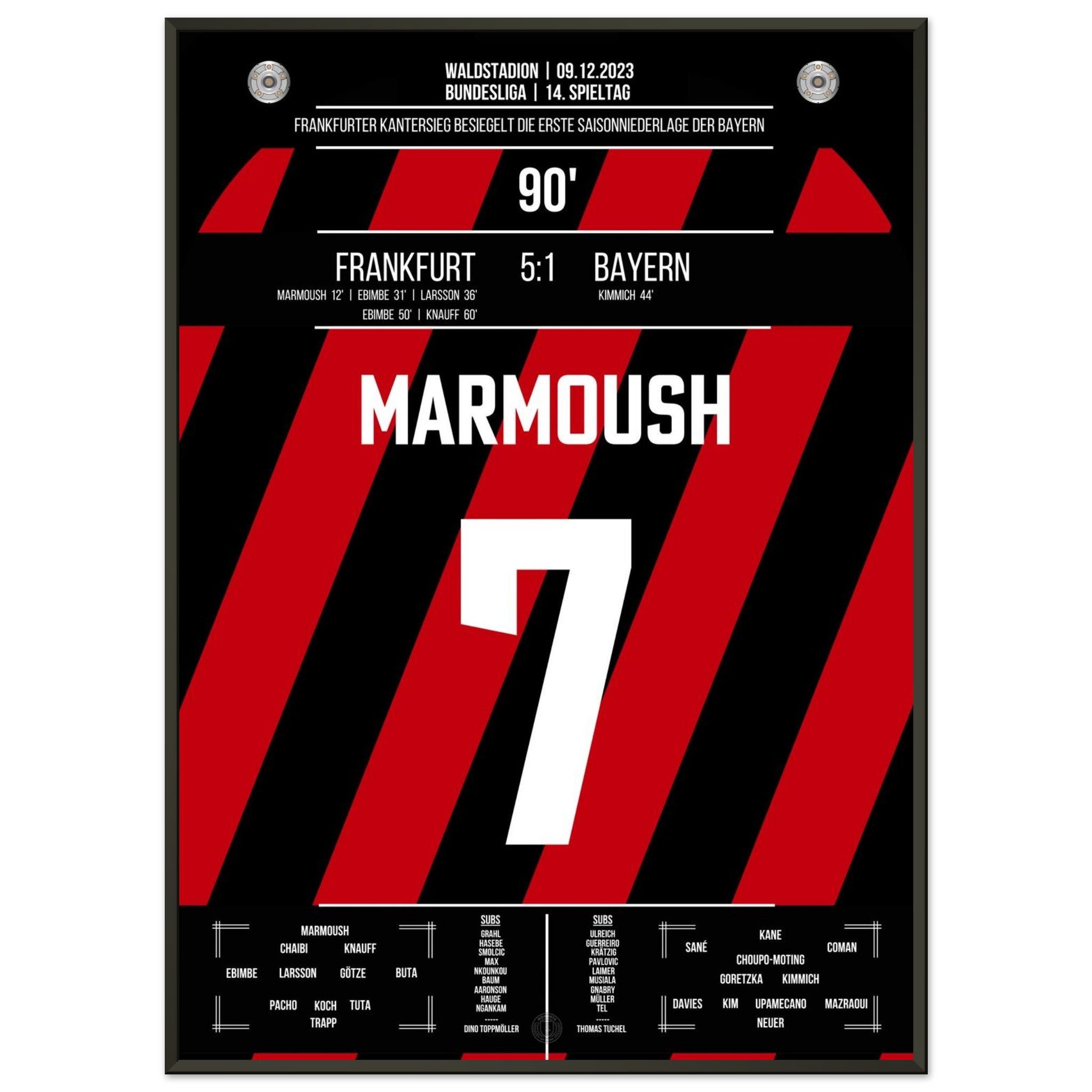9. Dezember 2023 – Frankfurt vs. Bayern 5:1: In der 90. Minute setzt Omar Marmoush den Schlusspunkt eines denkwürdigen Spiels – Frankfurt fegt die Bayern mit 5:1 vom Platz. Tempo, Wucht, Vollendung – ein perfekter Nachmittag am Main. Unser Poster hält diesen historischen Moment in Weiß-Schwarz fest.