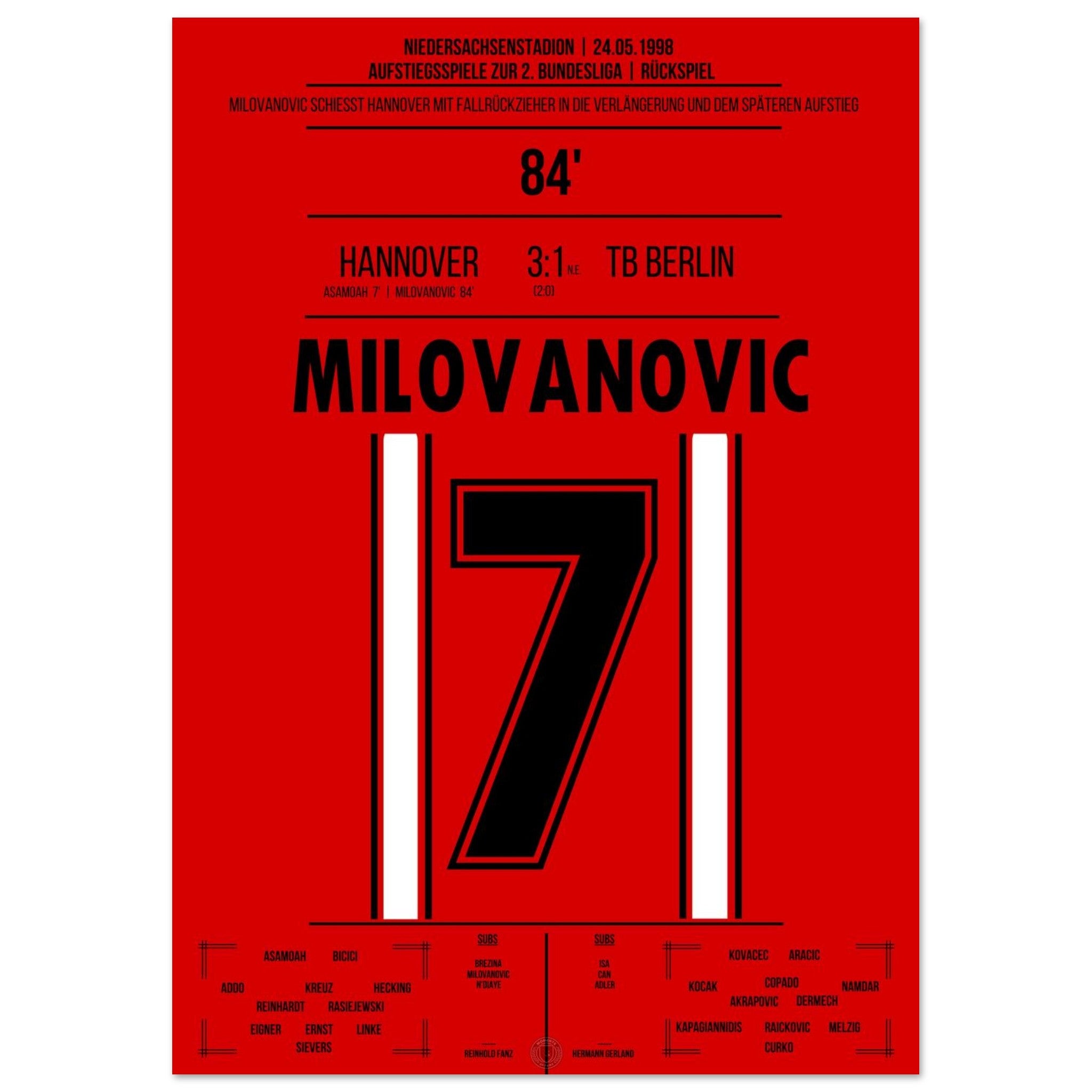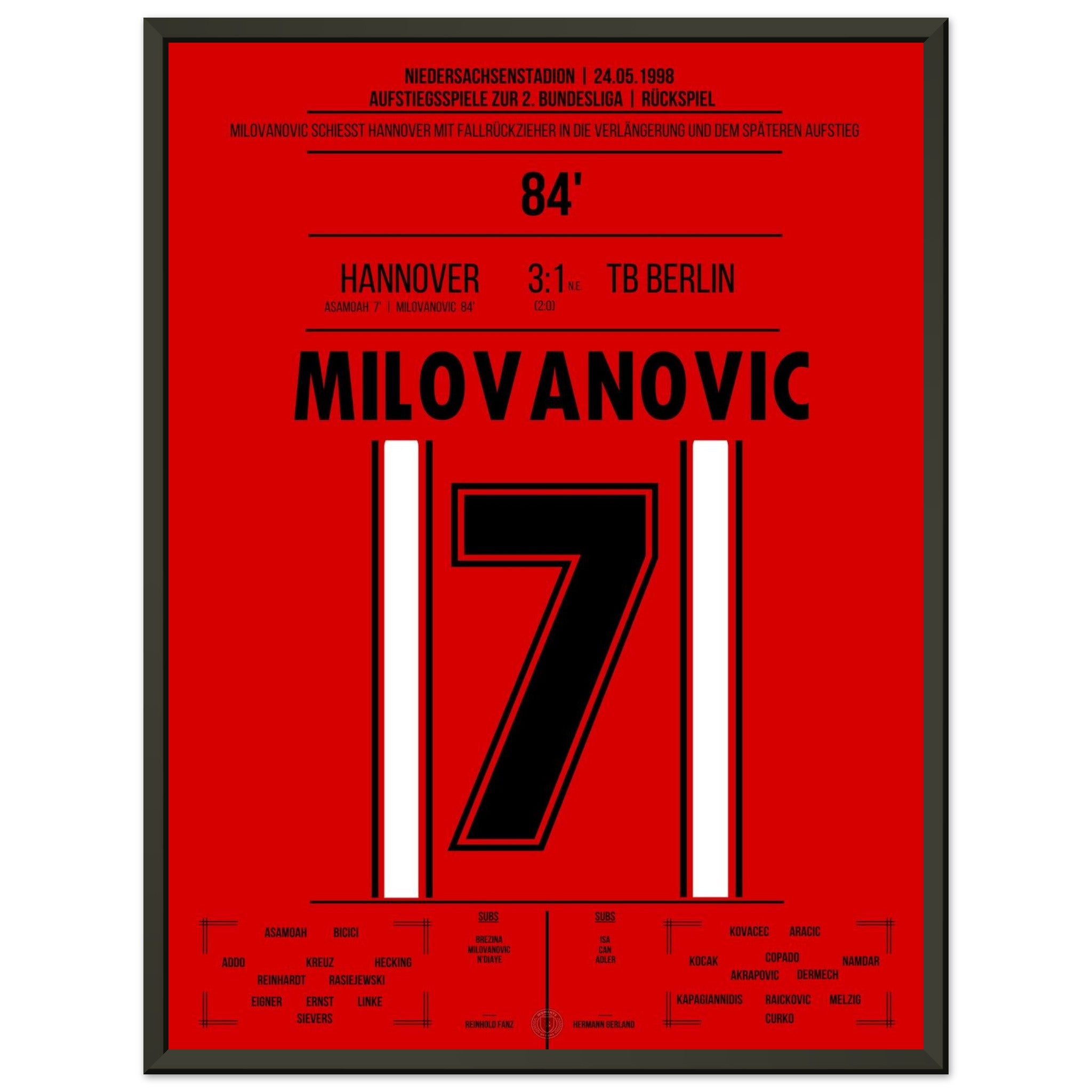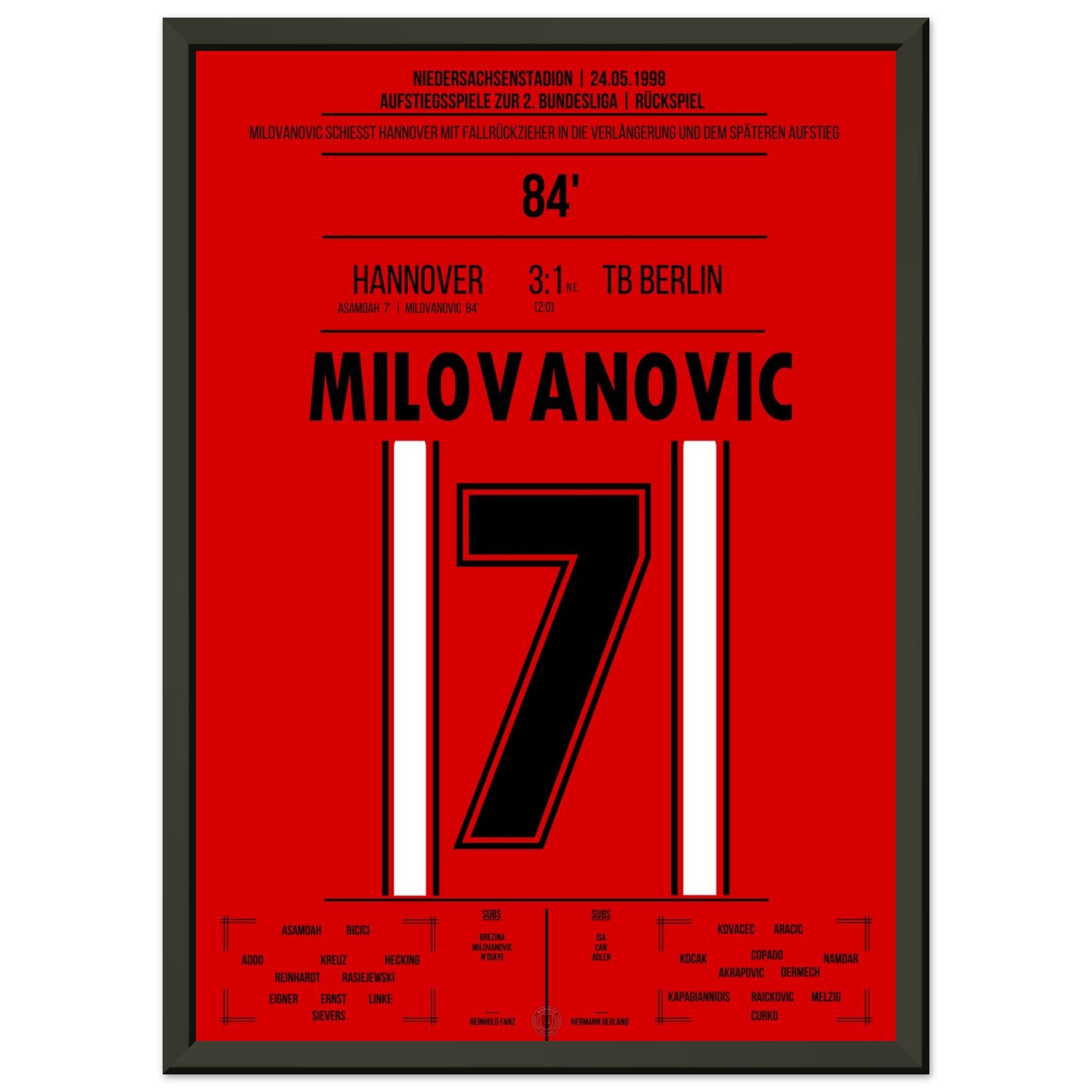 24. Mai 1998 – Hannover vs. Tennis Borussia Berlin 2:1: In der 89. Minute erzielt Milovanovic per spektakulärem Fallrückzieher das 2:1 und sichert Hannover den Aufstieg in die 2. Bundesliga. Ein kunstvoller Treffer im entscheidenden Moment, der für immer in Erinnerung bleibt. Unser Poster verewigt diesen magischen Aufstiegsmoment.