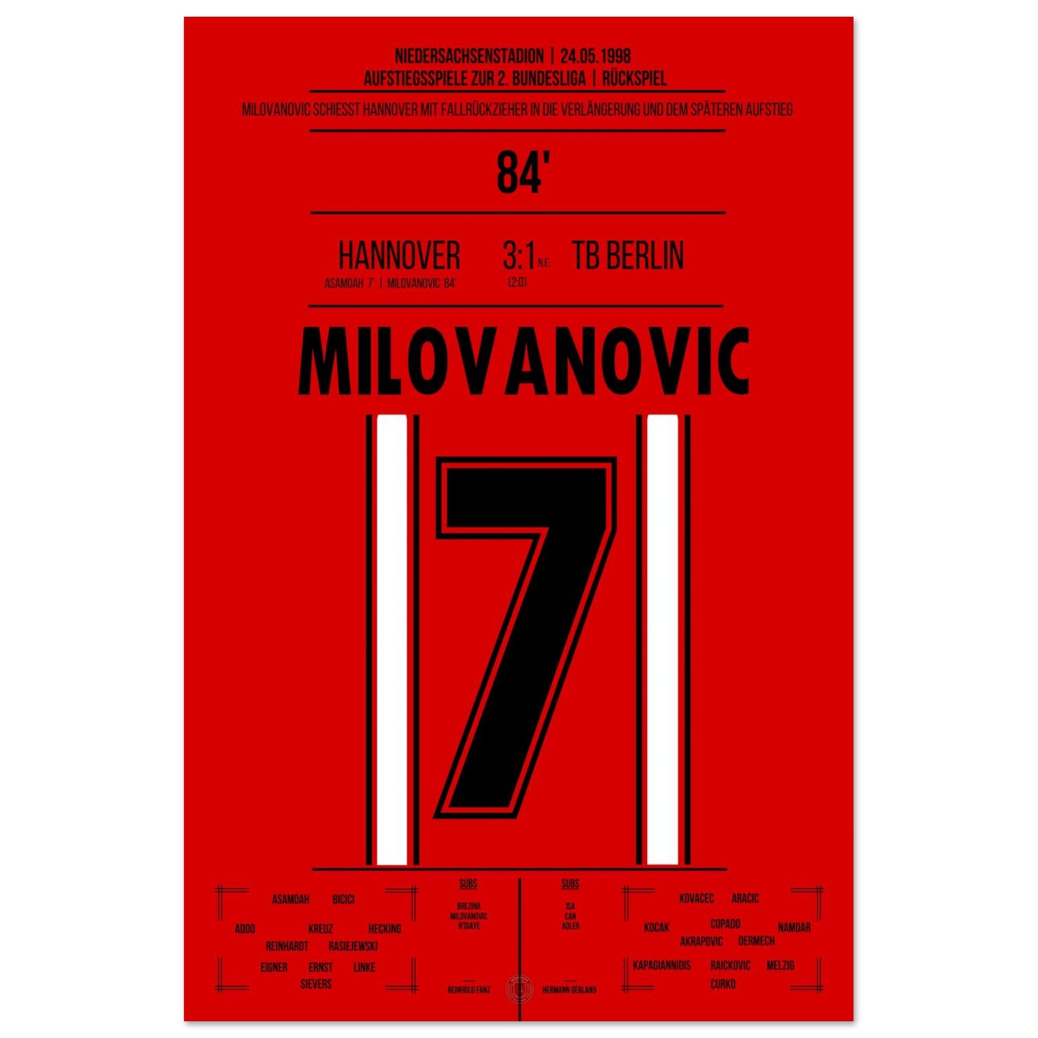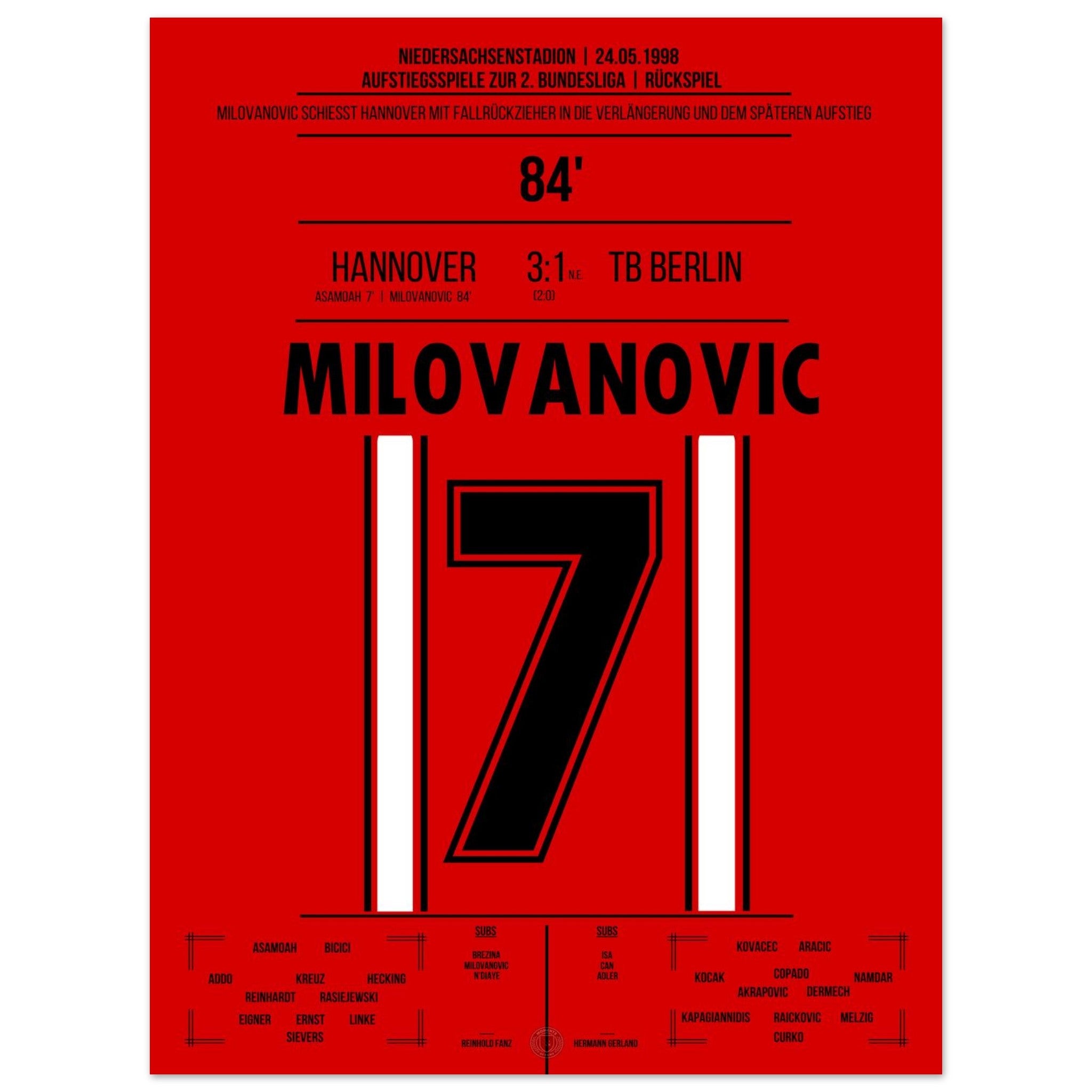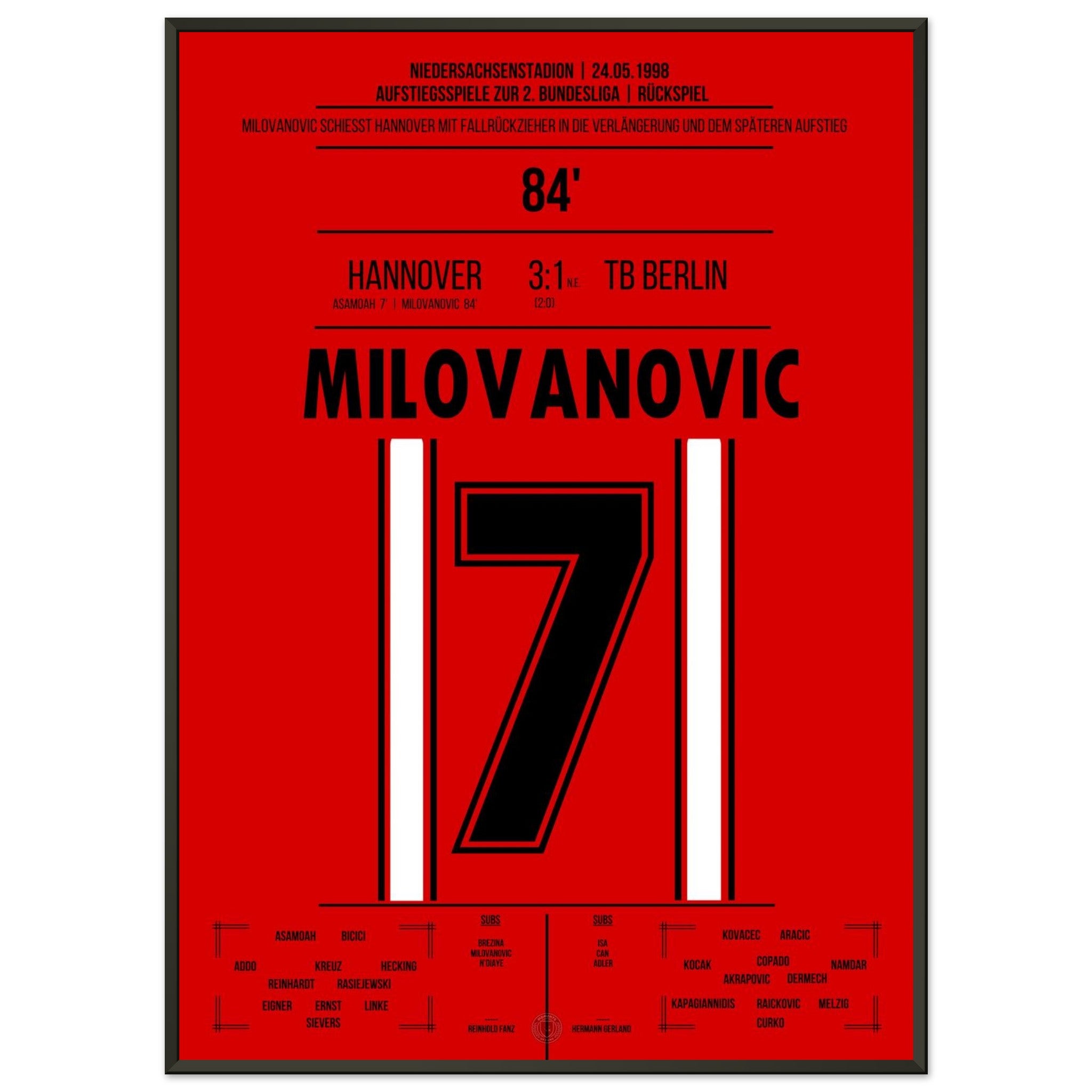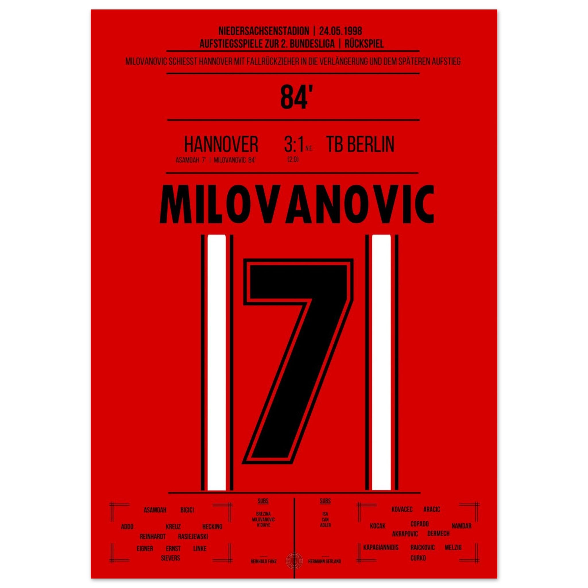 24. Mai 1998 – Hannover vs. Tennis Borussia Berlin 2:1: In der 89. Minute erzielt Milovanovic per spektakulärem Fallrückzieher das 2:1 und sichert Hannover den Aufstieg in die 2. Bundesliga. Ein kunstvoller Treffer im entscheidenden Moment, der für immer in Erinnerung bleibt. Unser Poster verewigt diesen magischen Aufstiegsmoment.