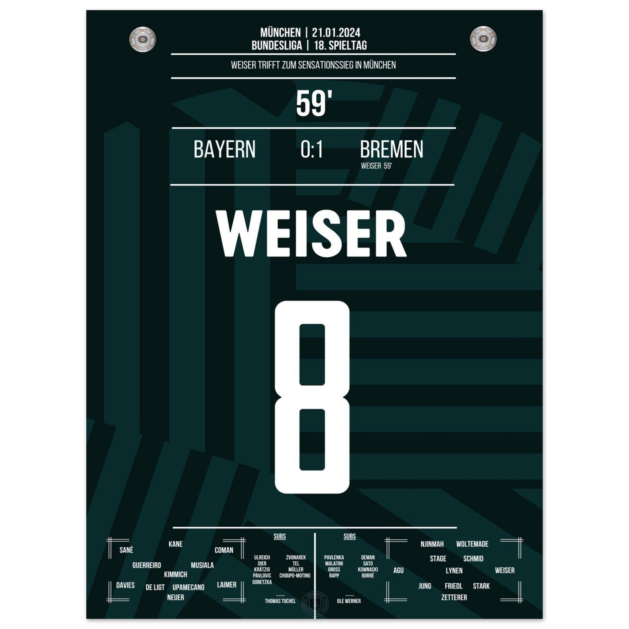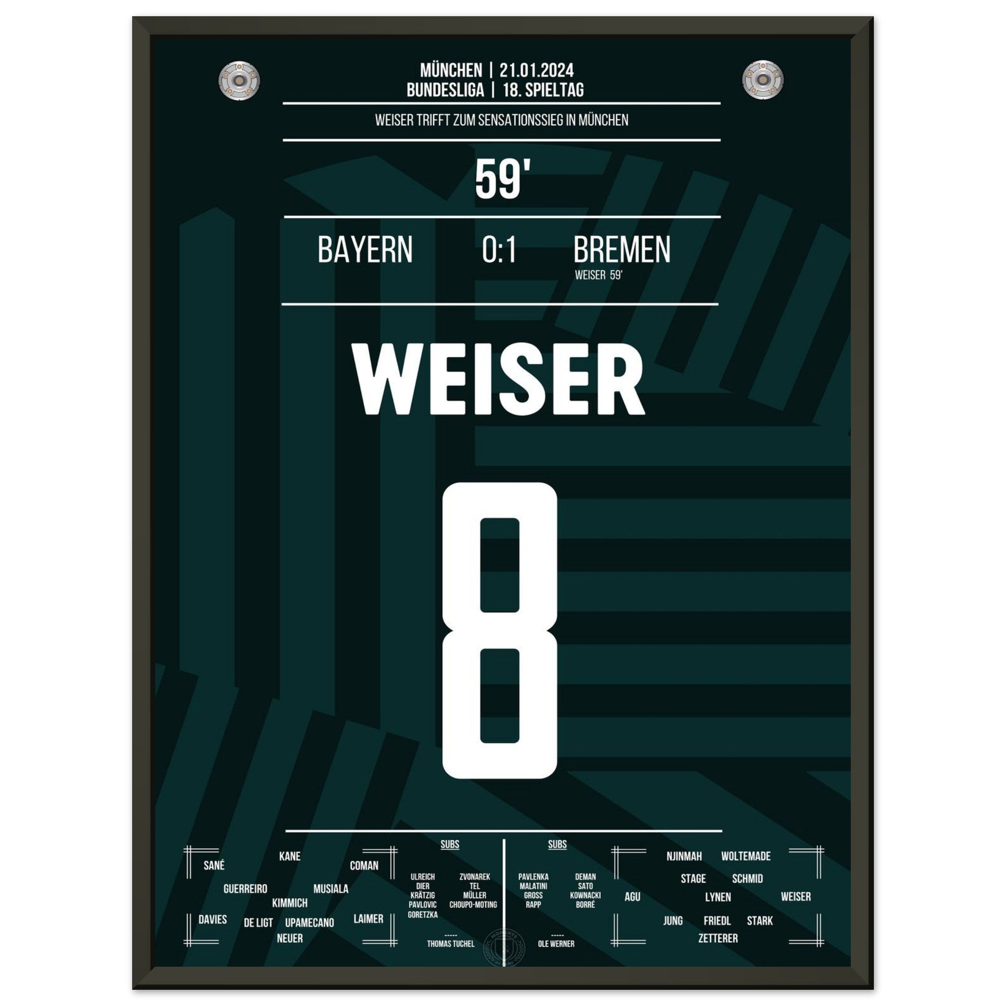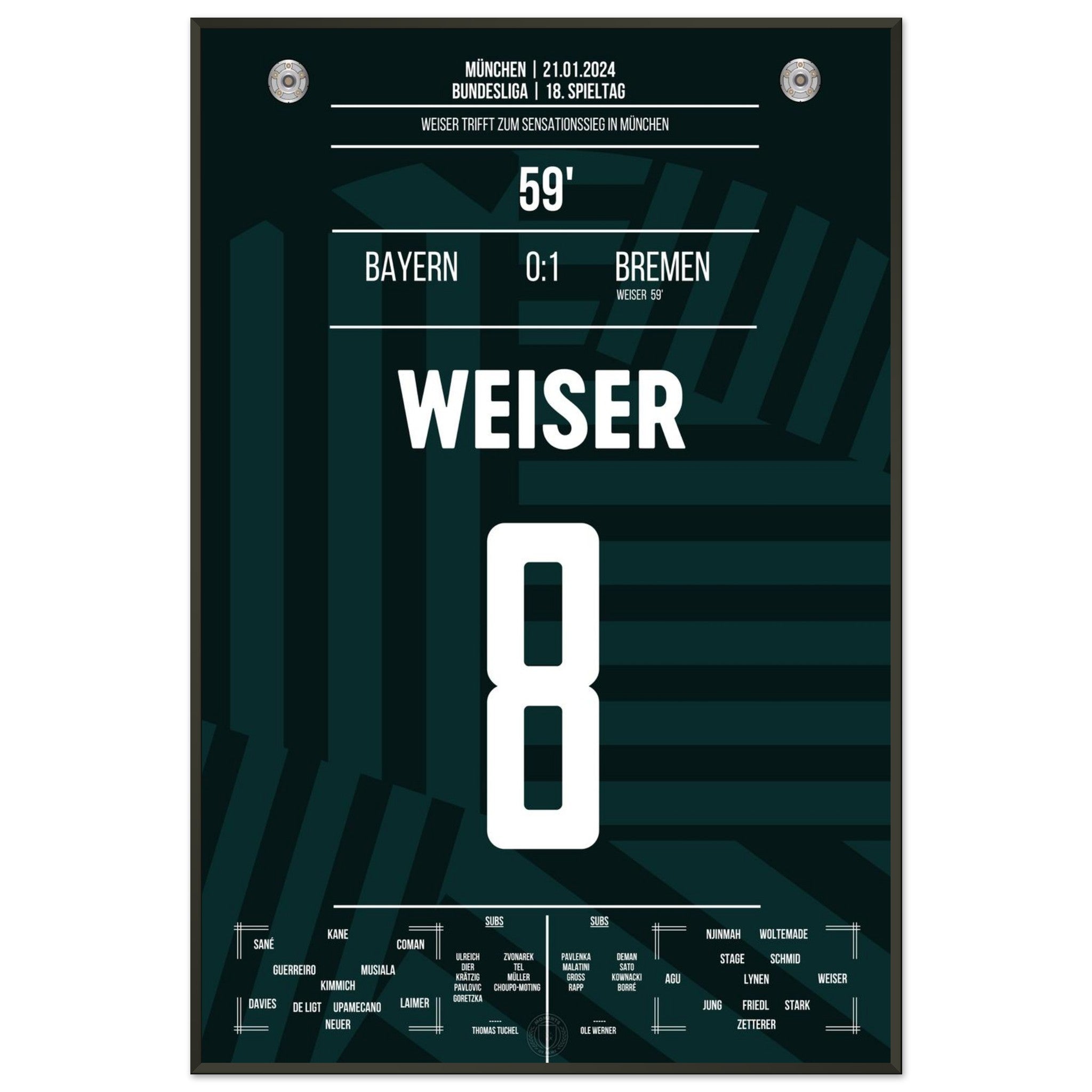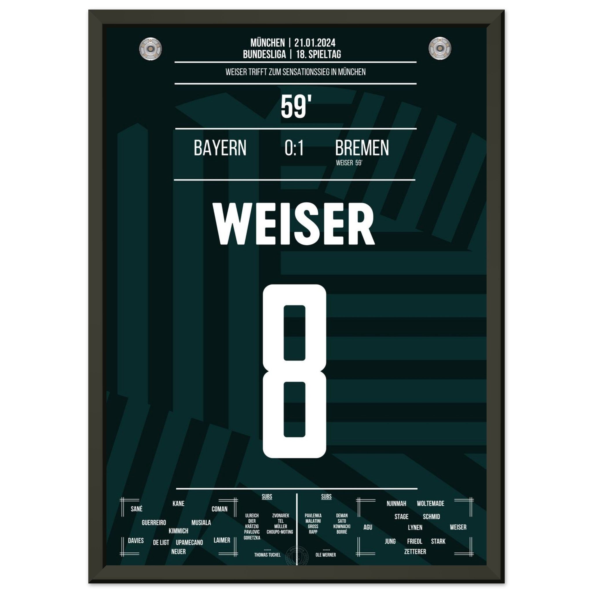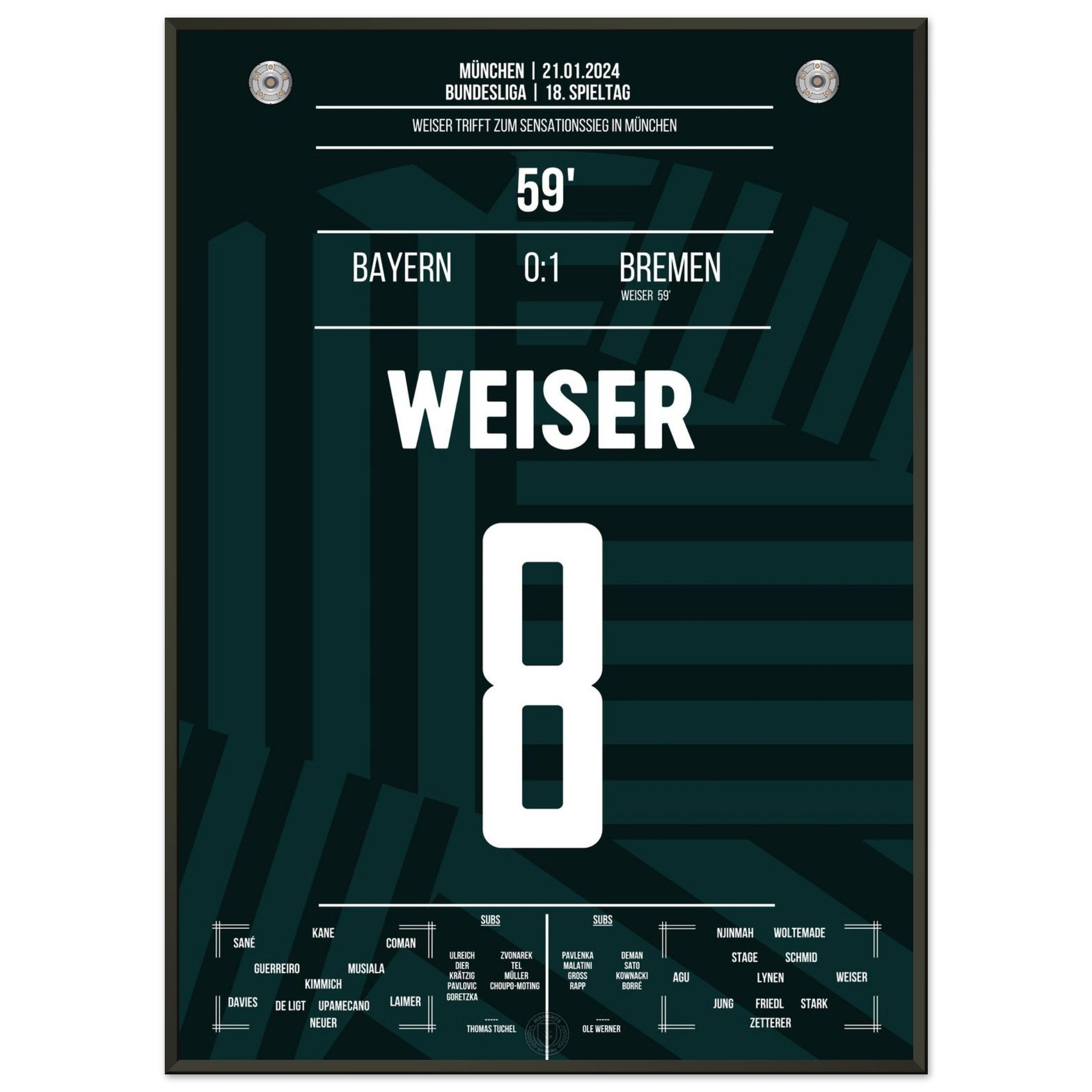 Mitchell Weiser. 59. Minute. Allianz Arena. Ex-Bayern-Spieler. Dribbling gegen Davies. Linksschuss unter die Latte. 1:0. Bremen beendet 15 Jahre Durststrecke – jetzt als Poster für deine Wand.