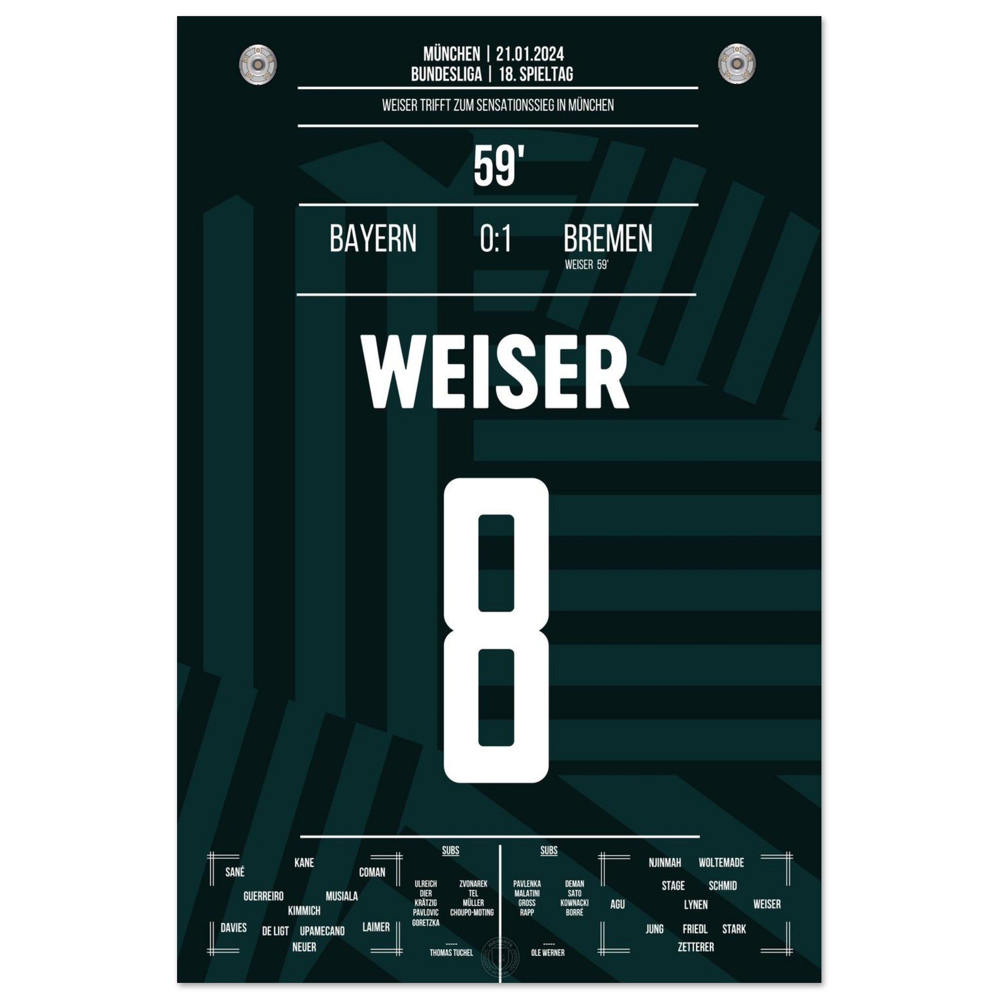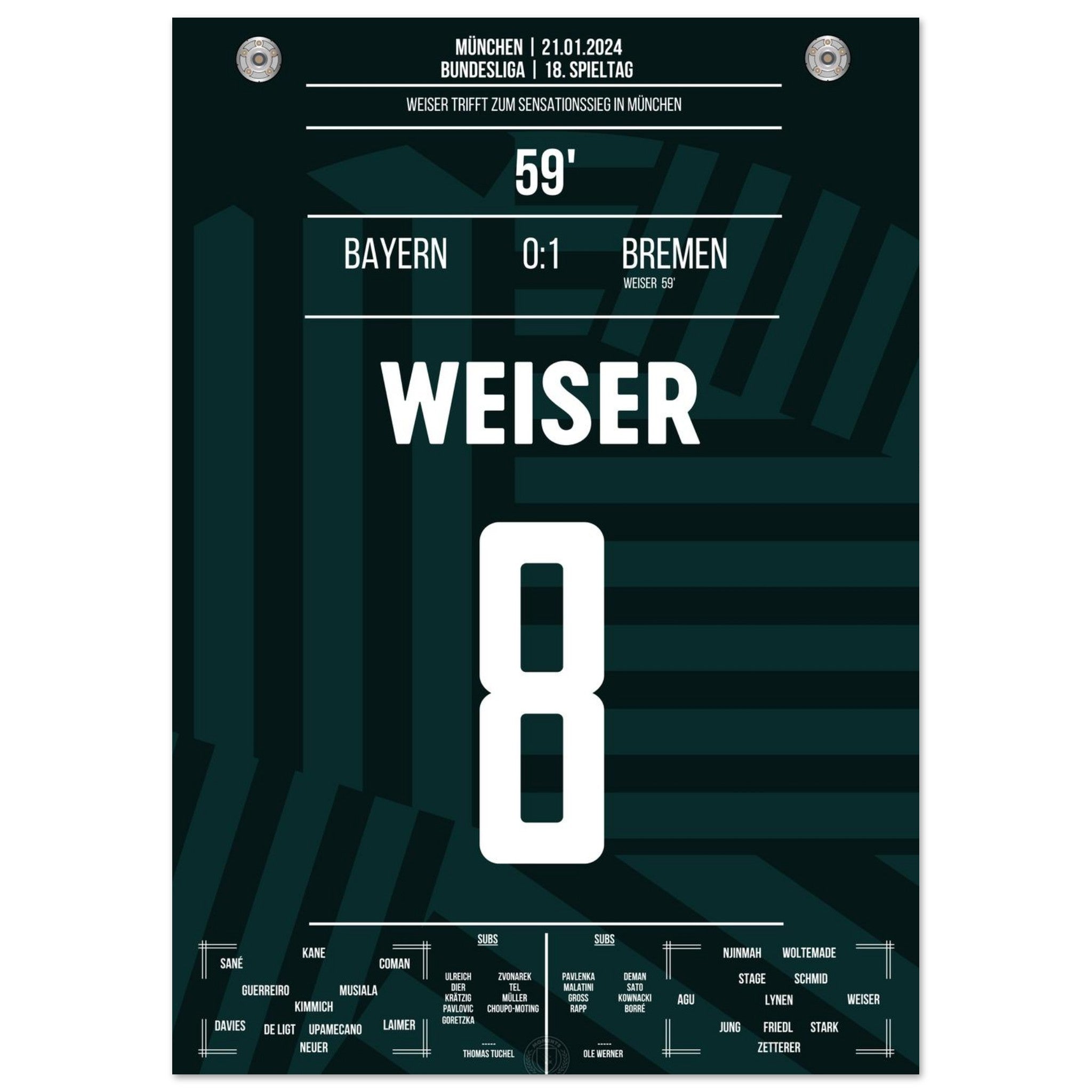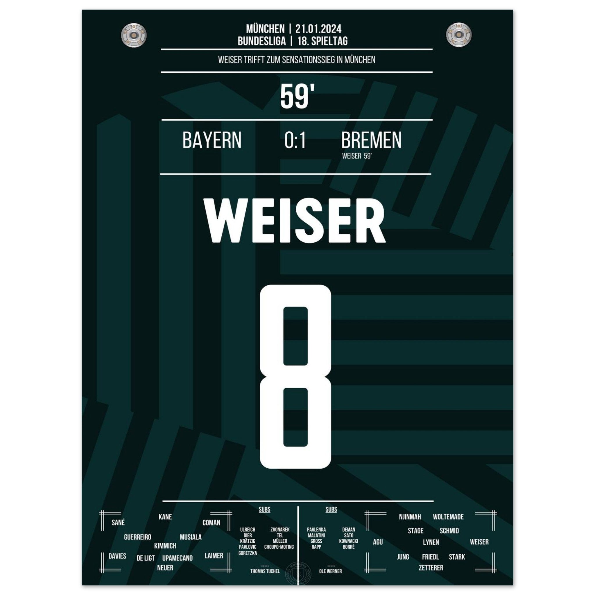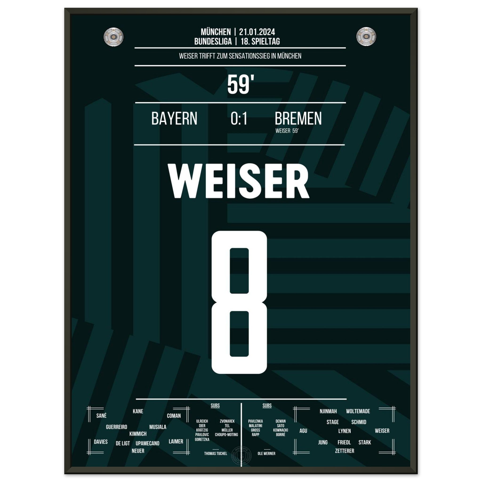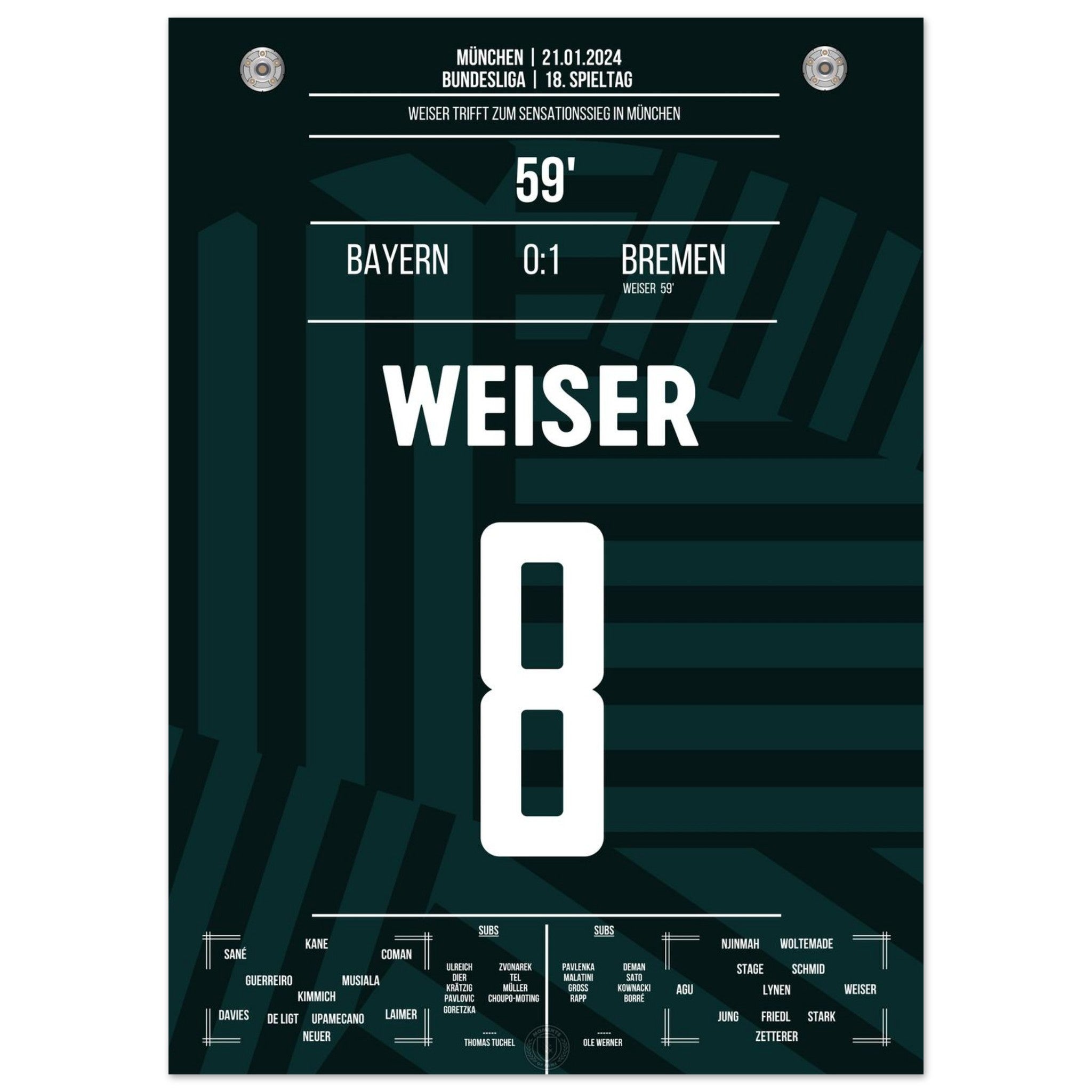 Mitchell Weiser. 59. Minute. Allianz Arena. Ex-Bayern-Spieler. Dribbling gegen Davies. Linksschuss unter die Latte. 1:0. Bremen beendet 15 Jahre Durststrecke – jetzt als Poster für deine Wand.