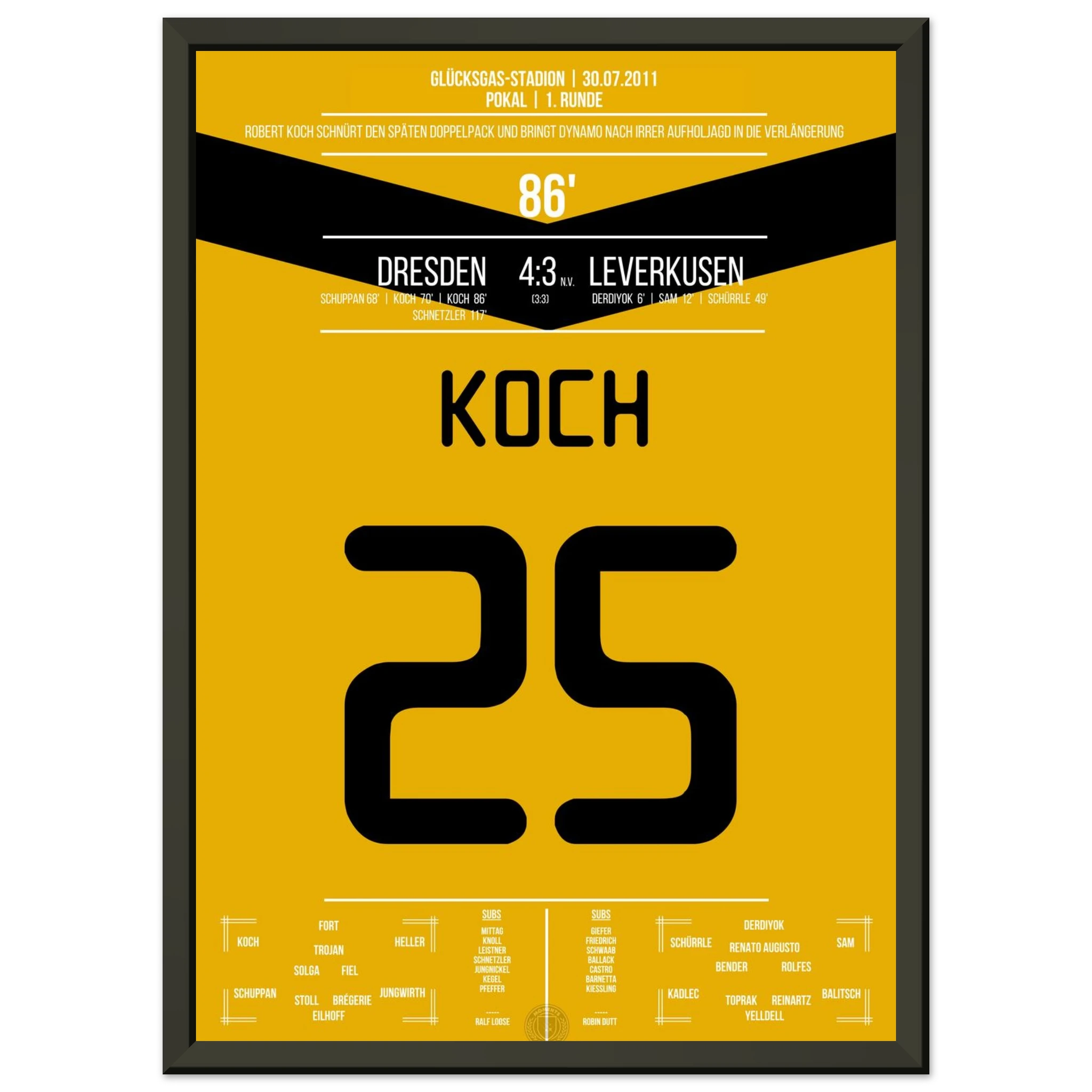 29. Juli 2011 – Dresden vs. Leverkusen 4:3 n. V.: In einem der spektakulärsten Pokalspiele überhaupt trifft Robert Koch zum 3:3-Ausgleich und bringt Dynamo in die Verlängerung. Seine Treffer leiten die sensationelle Aufholjagd nach 0:3-Rückstand gegen den Bundesligisten ein. Unser Poster hält diesen magischen Pokalmoment für die Ewigkeit fest.