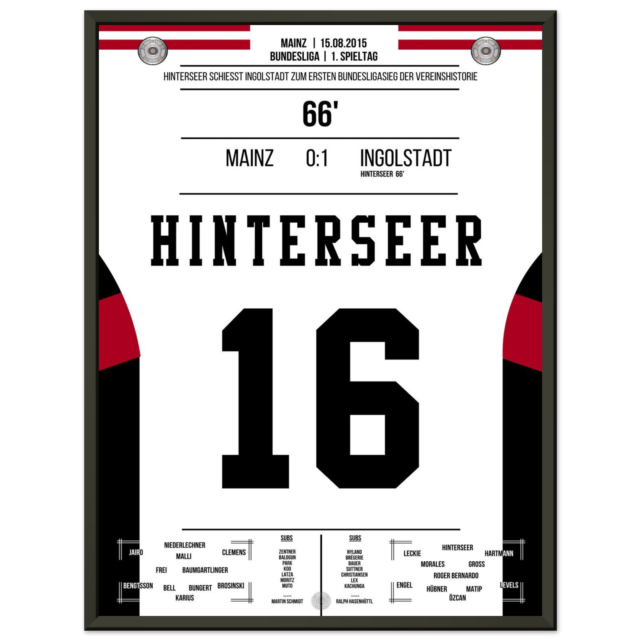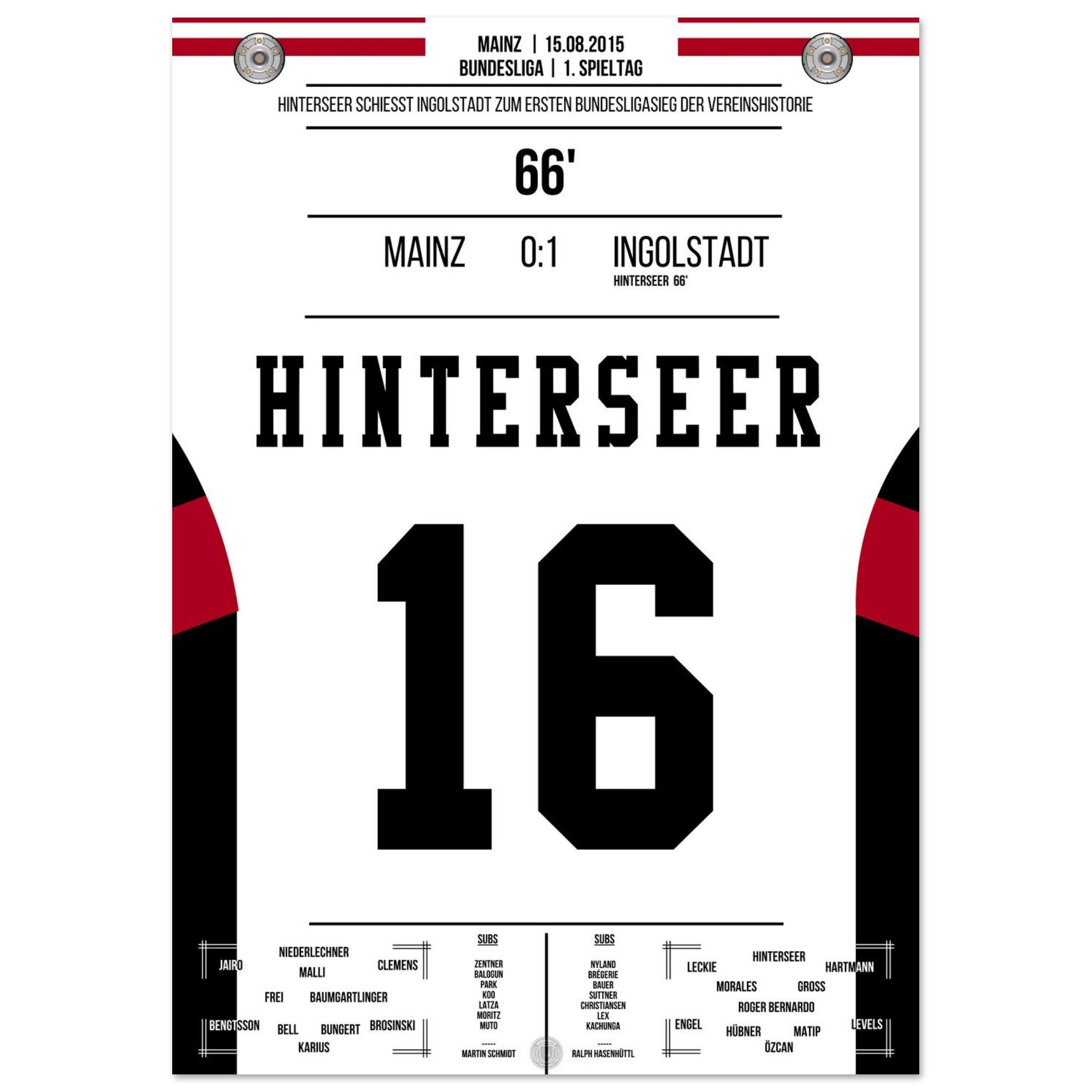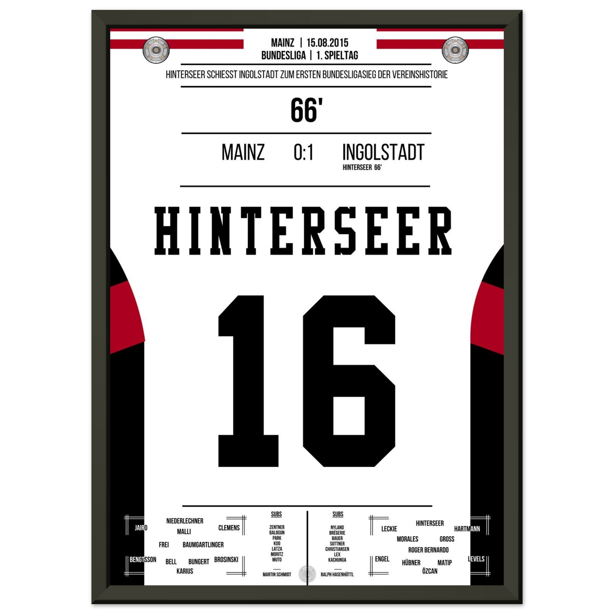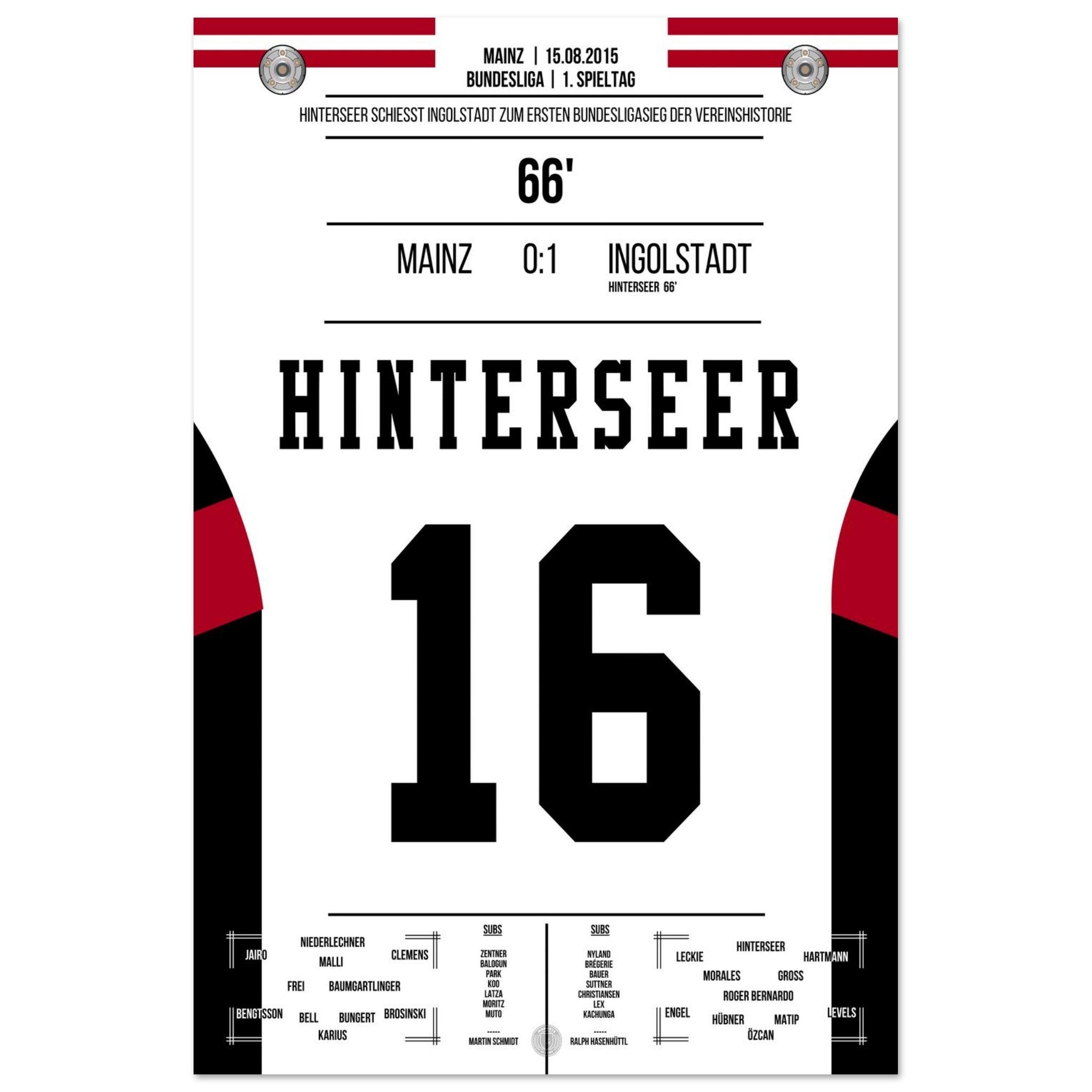 15. August 2015 – Mainz vs. Ingolstadt 0:1: In der 66. Minute trifft Lukas Hinterseer nach einem mustergültigen Konter zum ersten Bundesliga-Tor der Vereinsgeschichte und sichert Ingolstadt zum Auftakt direkt drei Punkte. Ein historischer Moment für den Aufsteiger beim Debüt in Deutschlands höchster Spielklasse. Unser Poster fängt diesen besonderen Augenblick für die Ewigkeit ein.