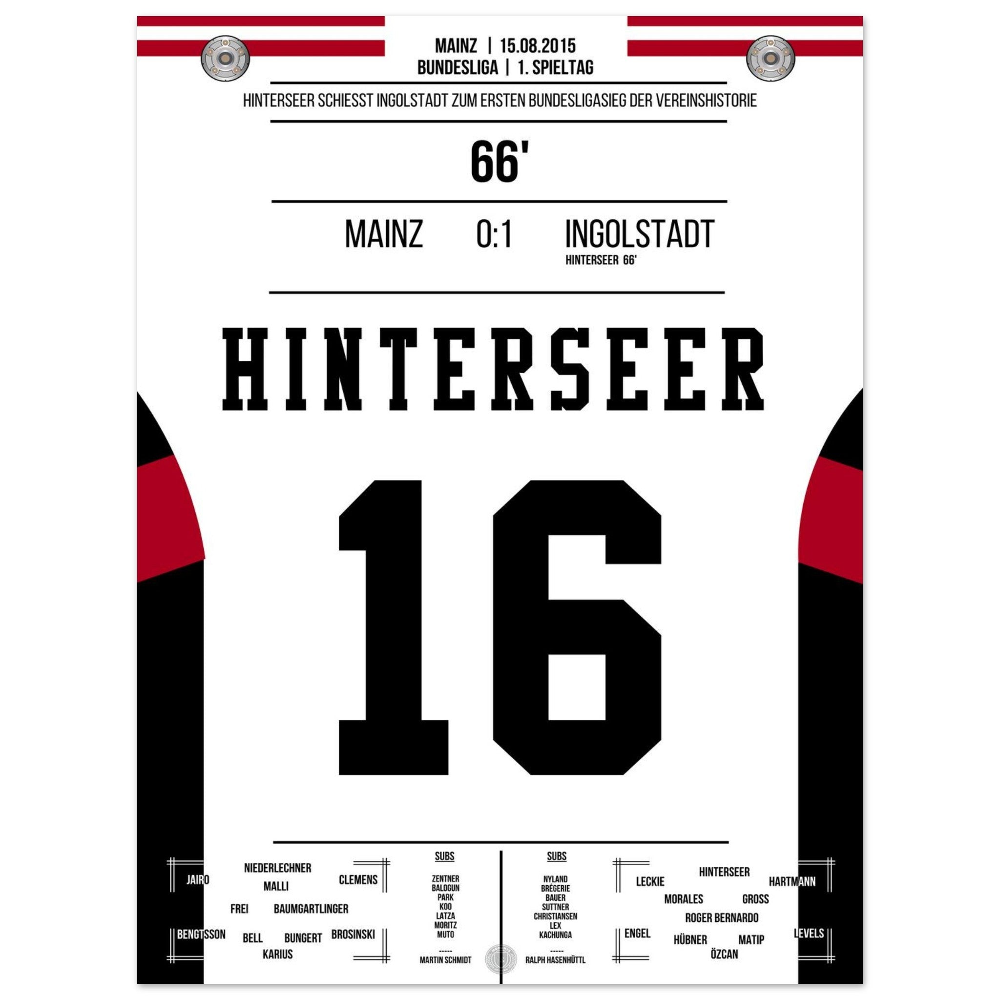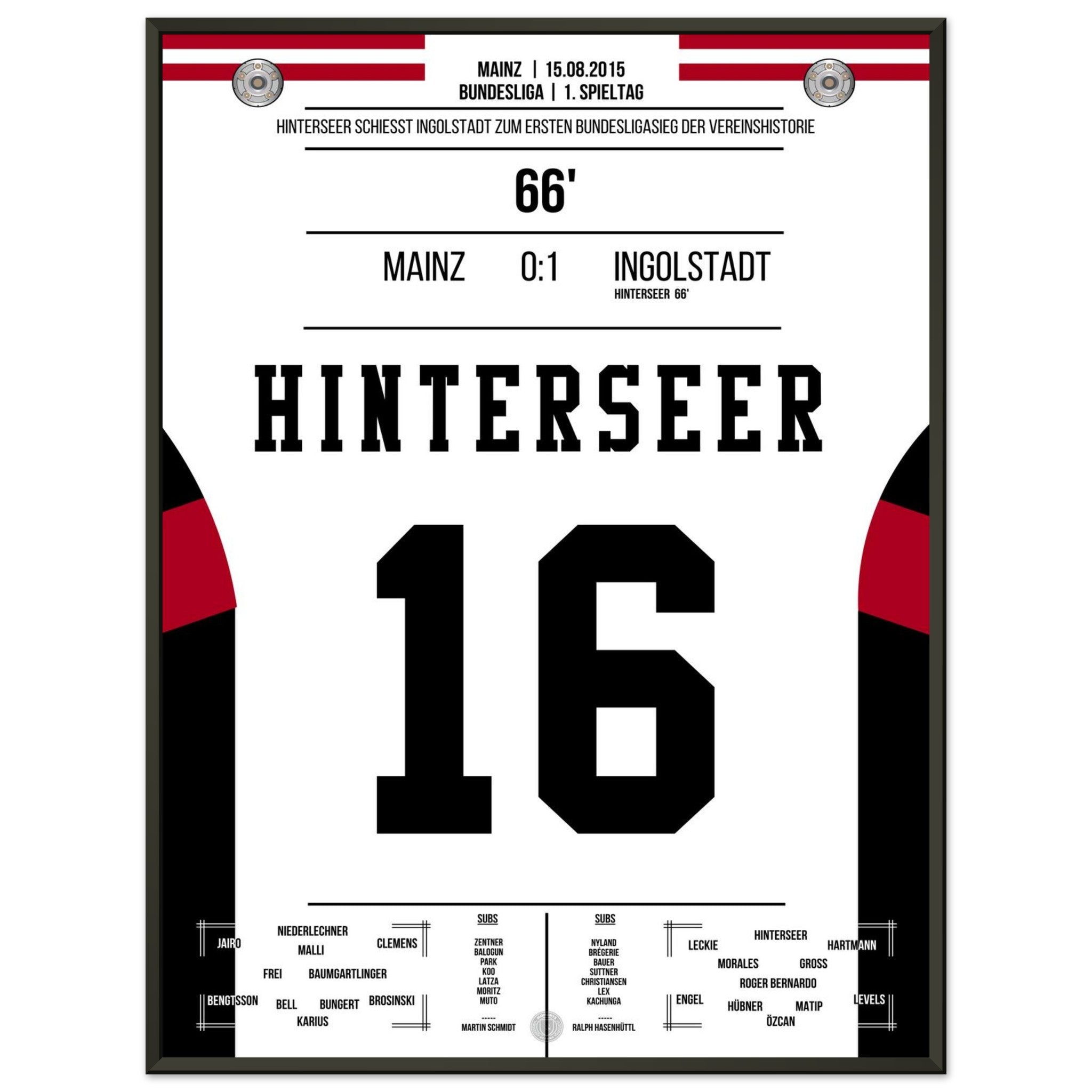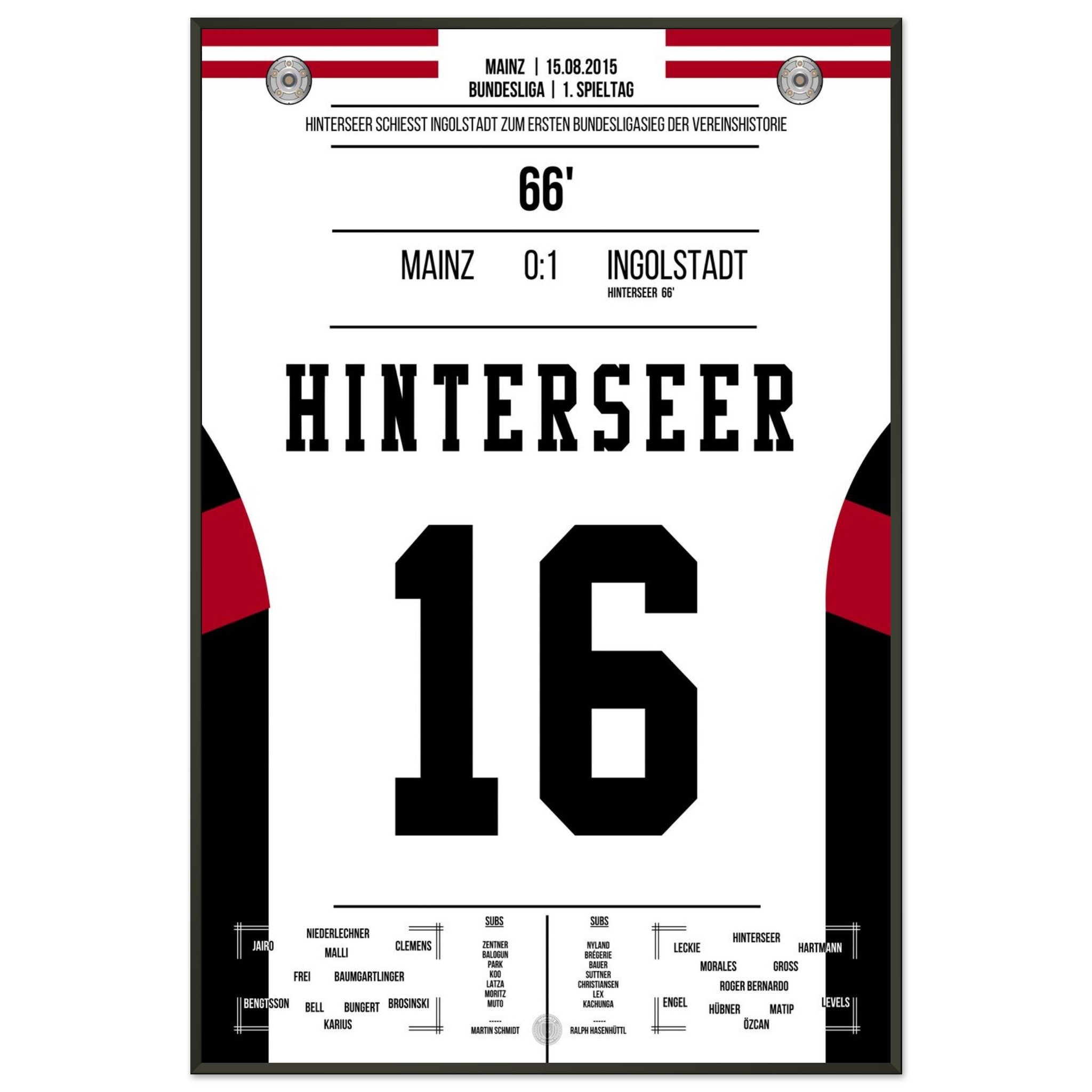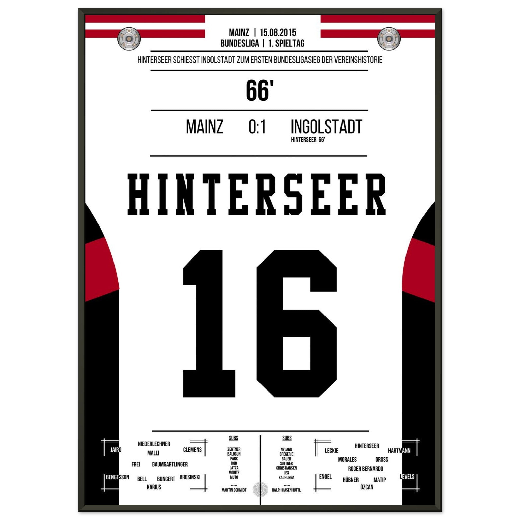 15. August 2015 – Mainz vs. Ingolstadt 0:1: In der 66. Minute trifft Lukas Hinterseer nach einem mustergültigen Konter zum ersten Bundesliga-Tor der Vereinsgeschichte und sichert Ingolstadt zum Auftakt direkt drei Punkte. Ein historischer Moment für den Aufsteiger beim Debüt in Deutschlands höchster Spielklasse. Unser Poster fängt diesen besonderen Augenblick für die Ewigkeit ein.