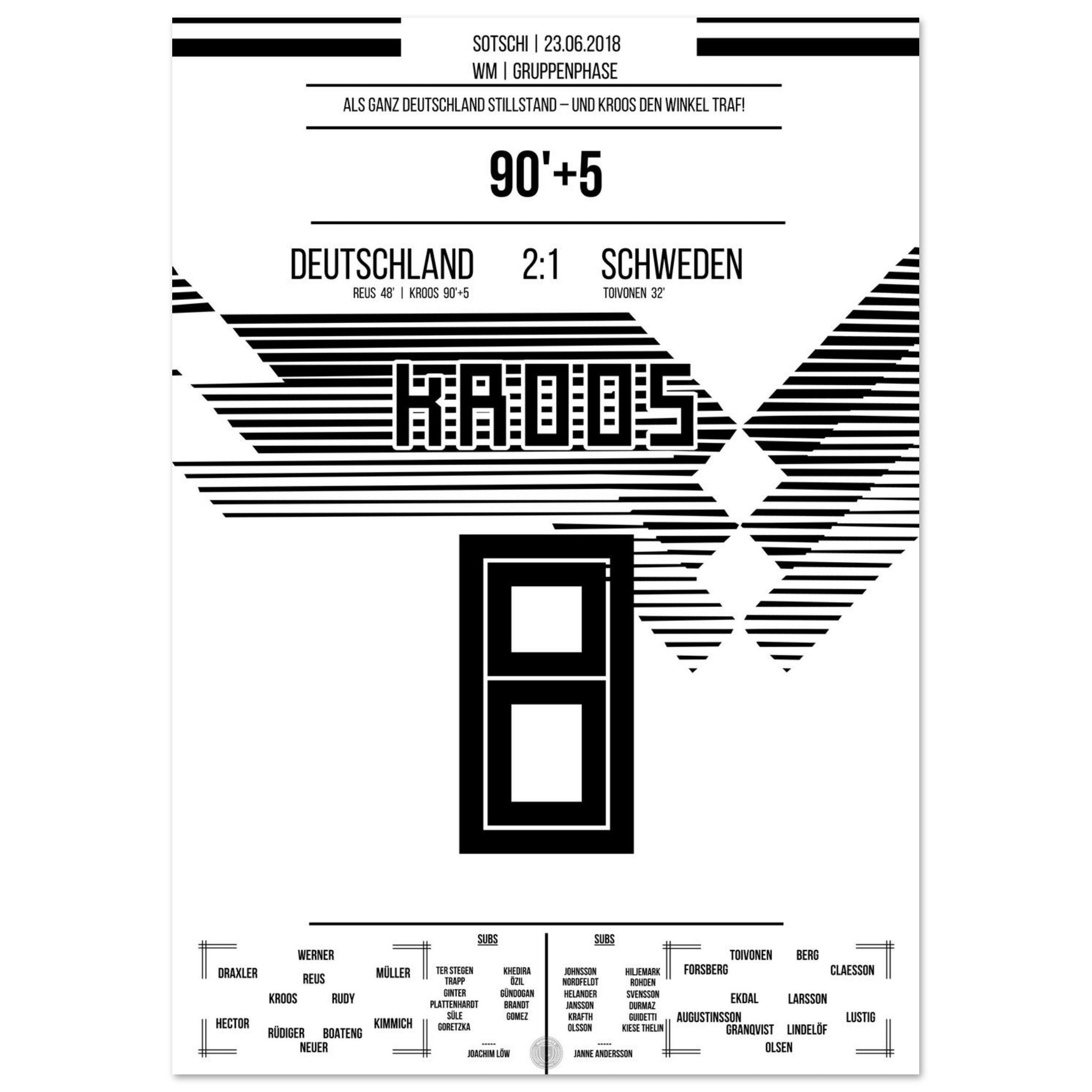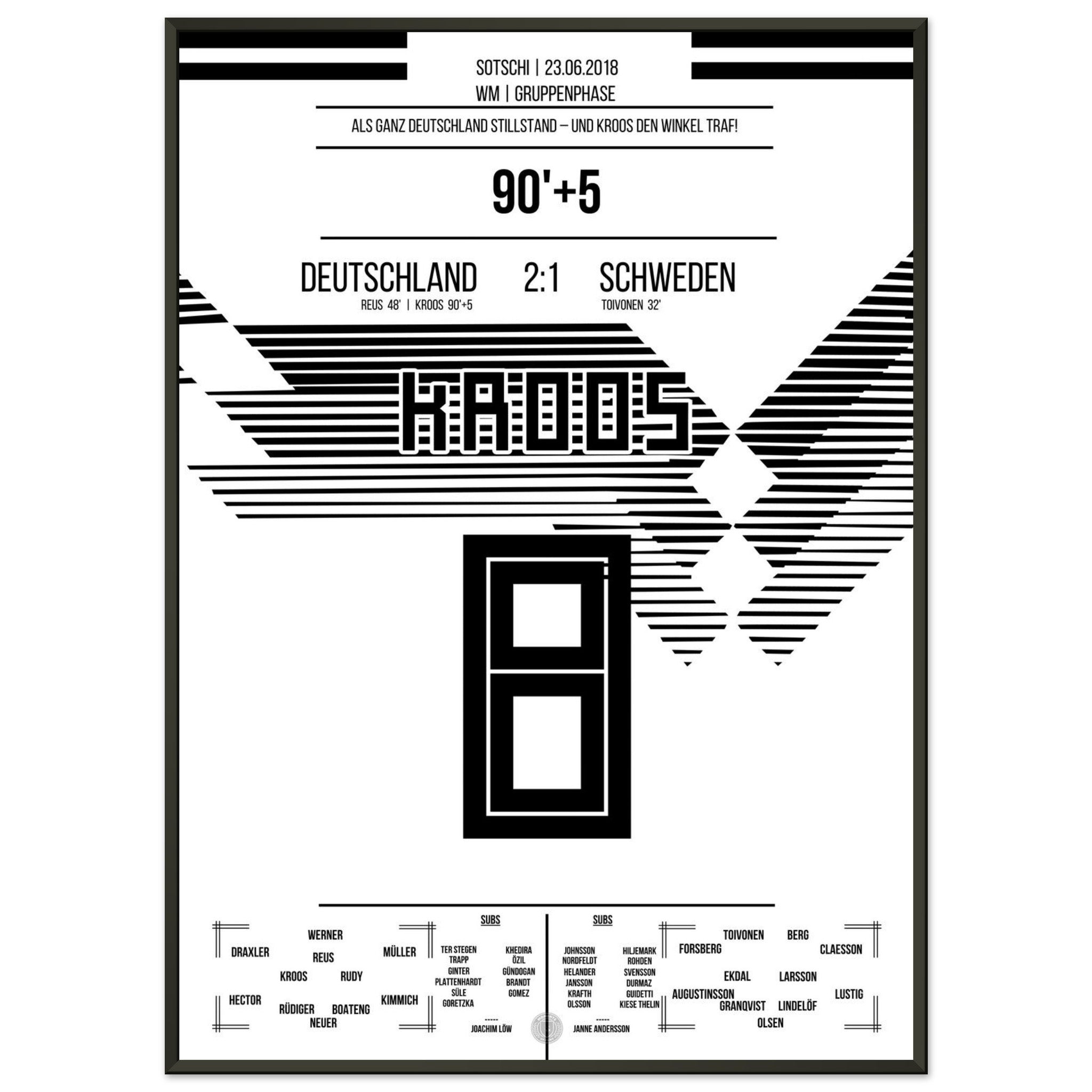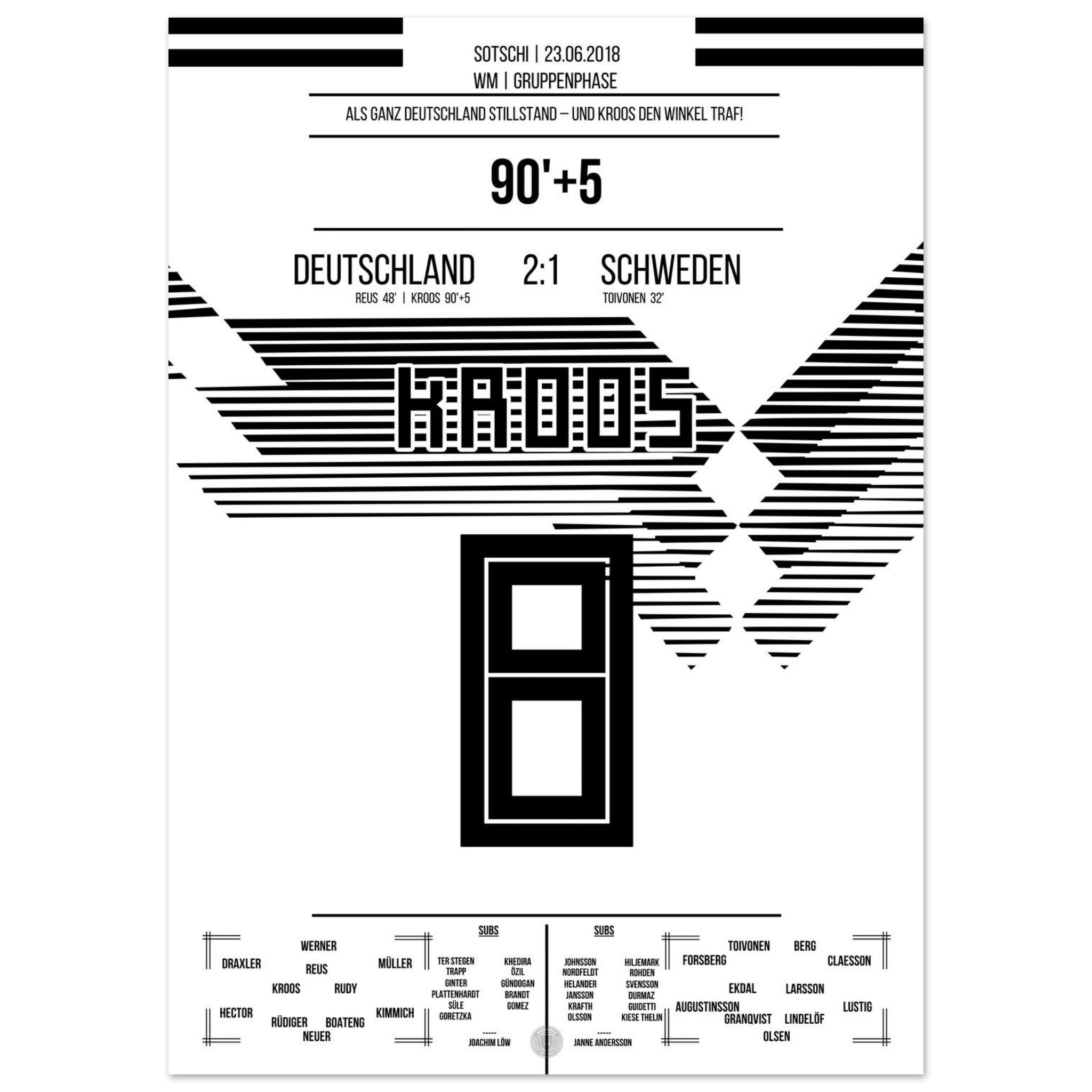 23. Juni 2018 – Deutschland vs. Schweden 2:1: In der 95. Minute dreht Toni Kroos den Ball nach einem kurzen Anspiel traumhaft ins lange Eck – ein Last-Minute-Freistoß wie aus dem Bilderbuch, der Deutschland bei der WM 2018 vor dem Aus bewahrt. Unser Poster fängt diesen magischen Moment im Sonnenuntergang von Sotschi ein.