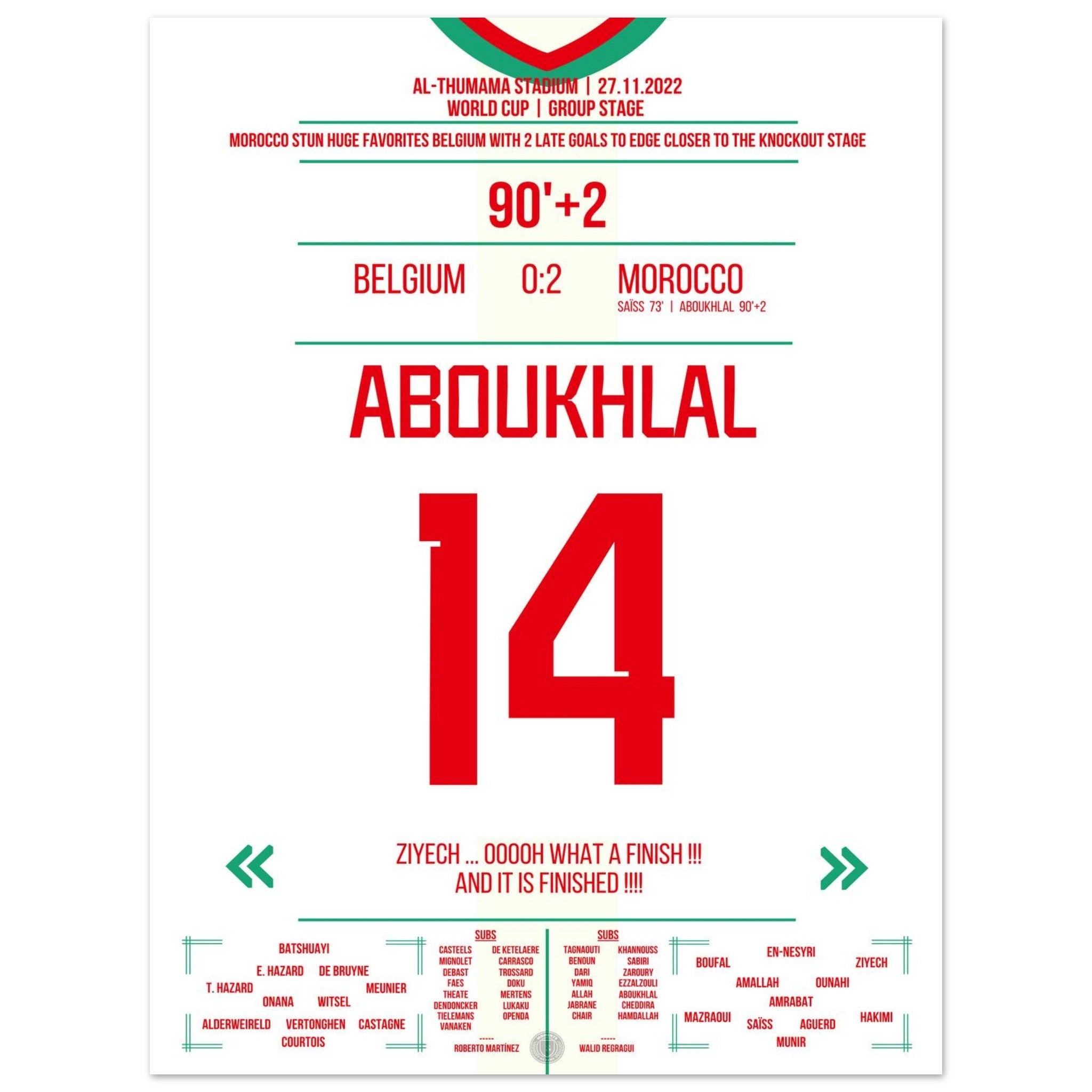 In Doha sorgt Marokko für eine der großen Überraschungen der Weltmeisterschaft. Sabiri trifft per Freistoß, Aboukhlal legt nach – und die Roten Teufel sind geschlagen. Ganz Nordafrika jubelt über einen historischen Sieg, der Stolz, Leidenschaft und Einheit verkörpert.