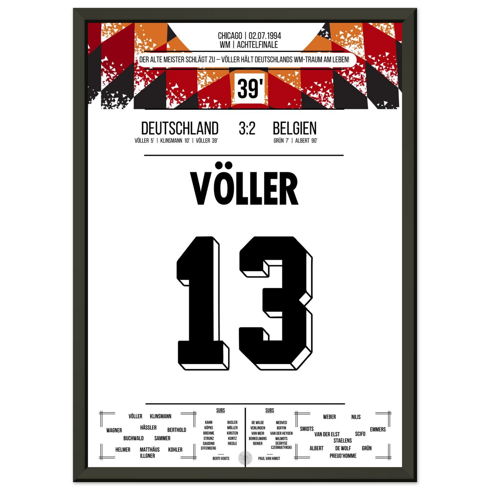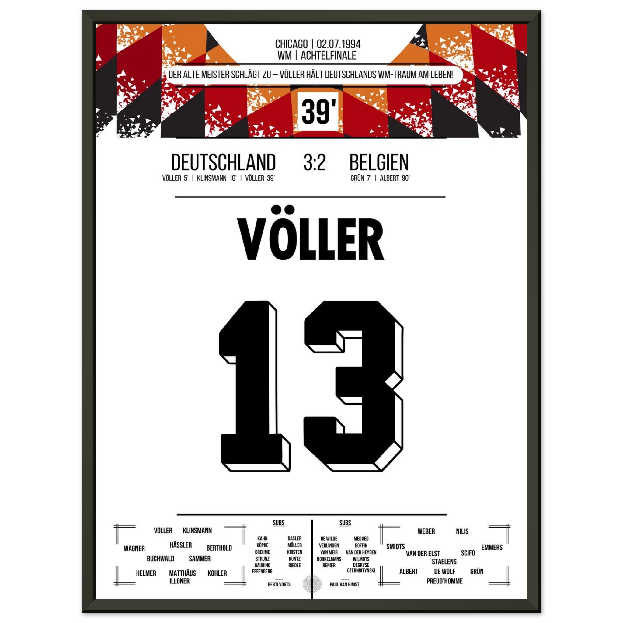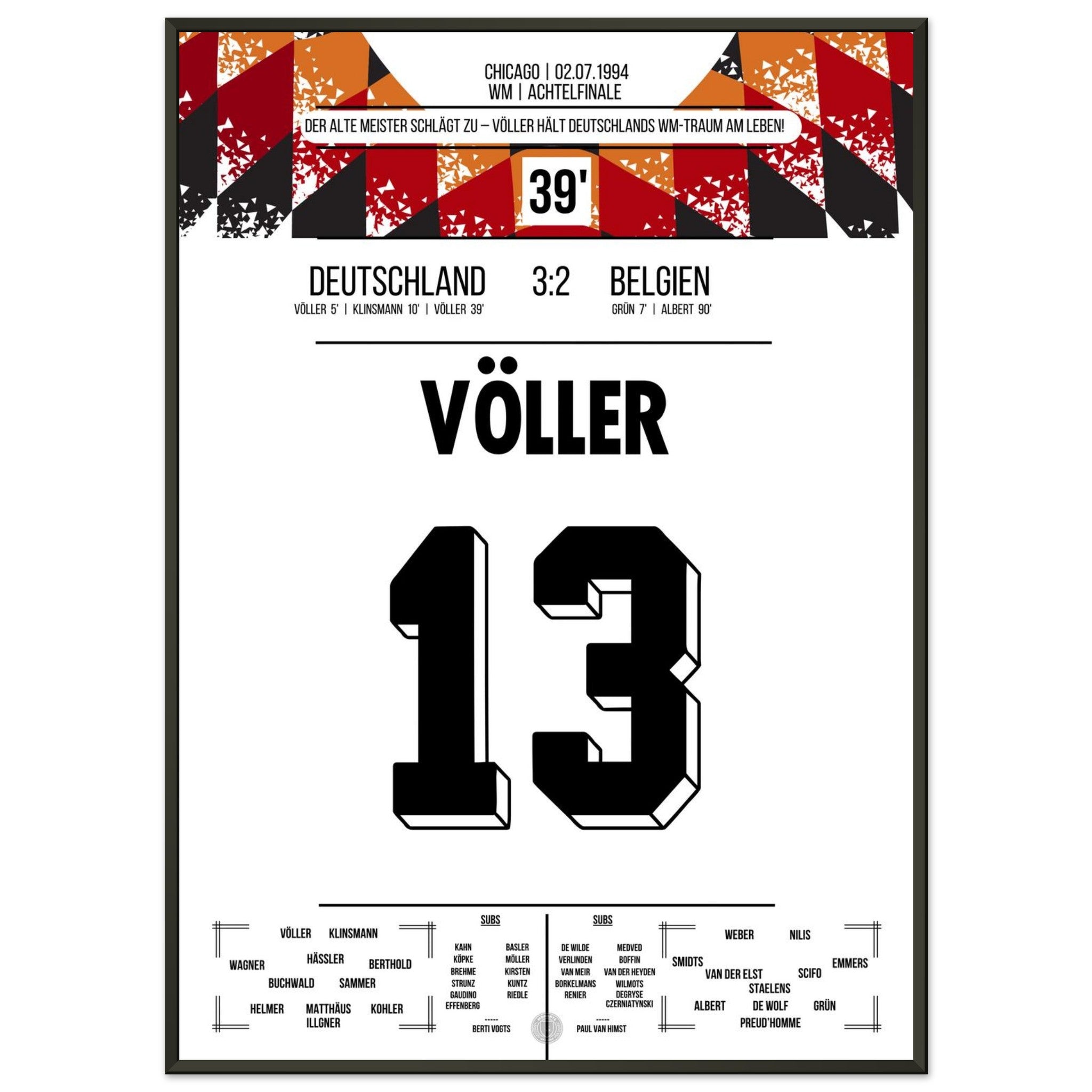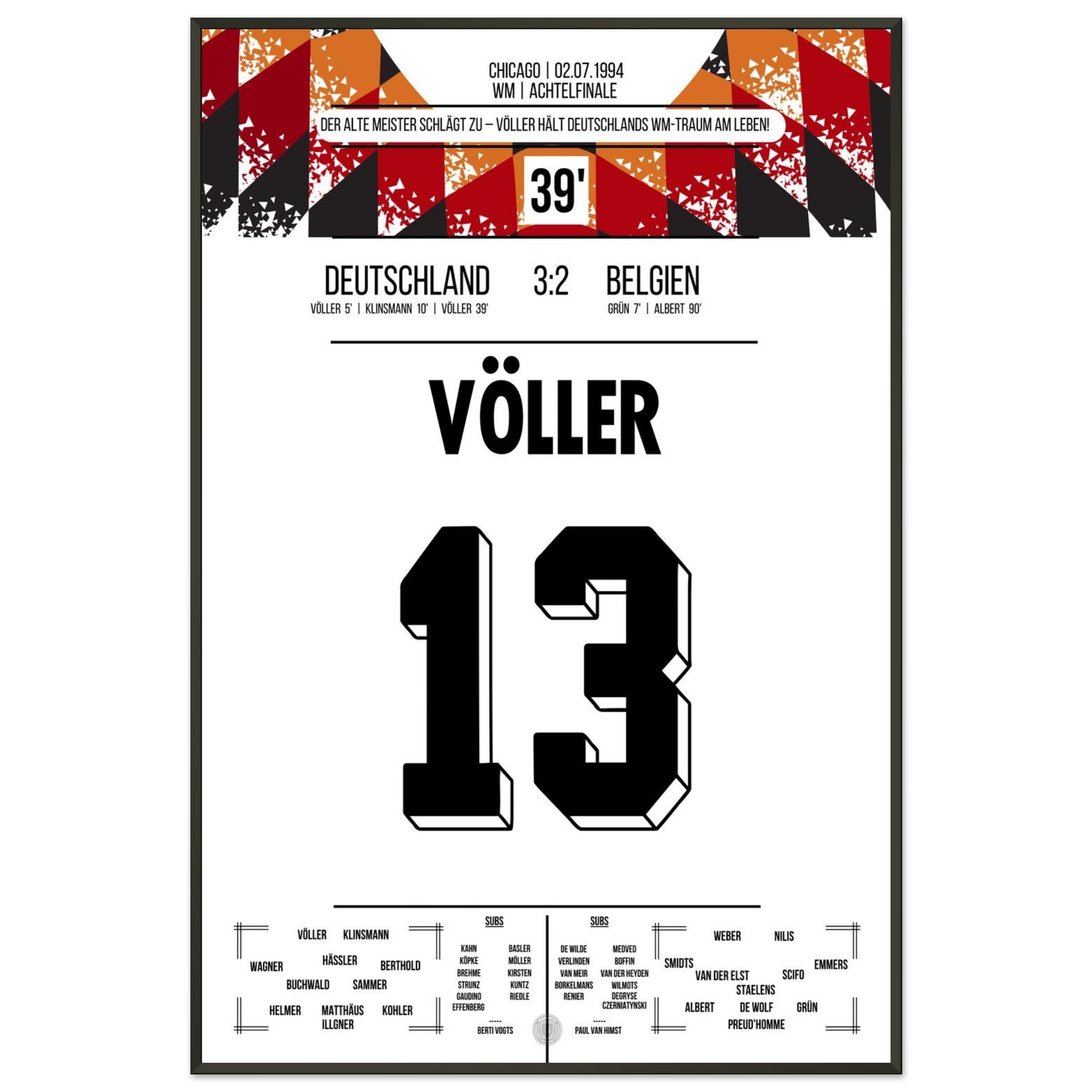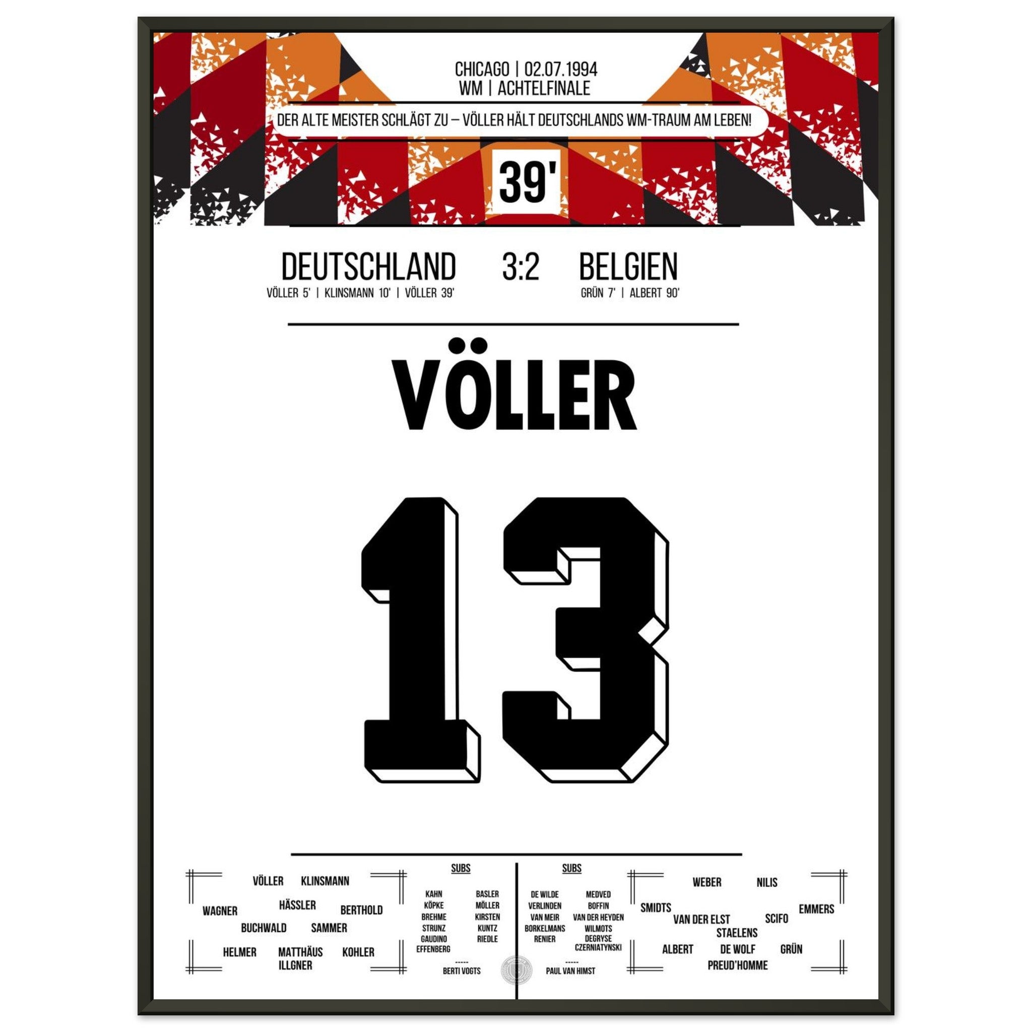 2. Juli 1994 – Deutschland vs. Belgien 3:2: Rudi Völler zeigt im WM-Achtelfinale seinen legendären Torriecher und schnürt einen Doppelpack gegen Belgien. Ein echter Klassiker des Altmeisters auf amerikanischem Boden – unser Poster hält diesen starken Auftritt in Schwarz-Rot-Gold fest.