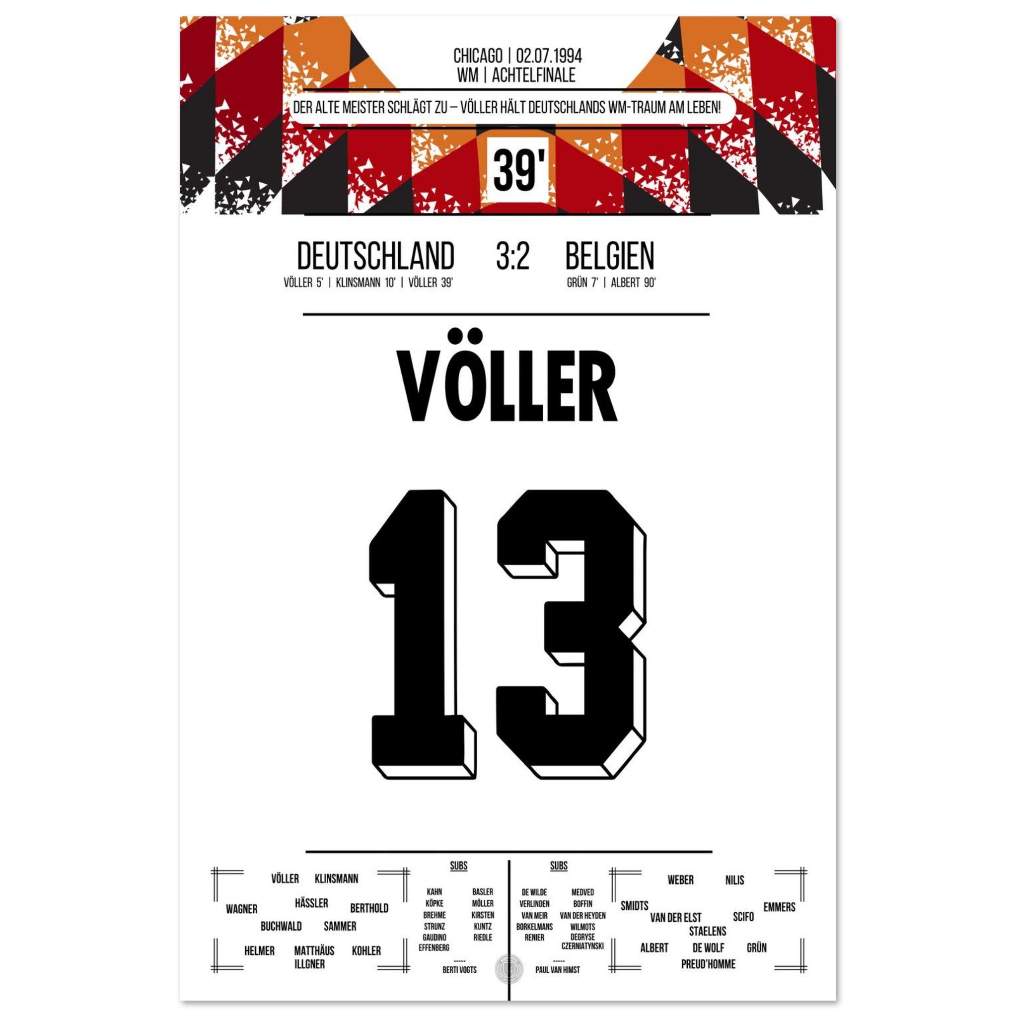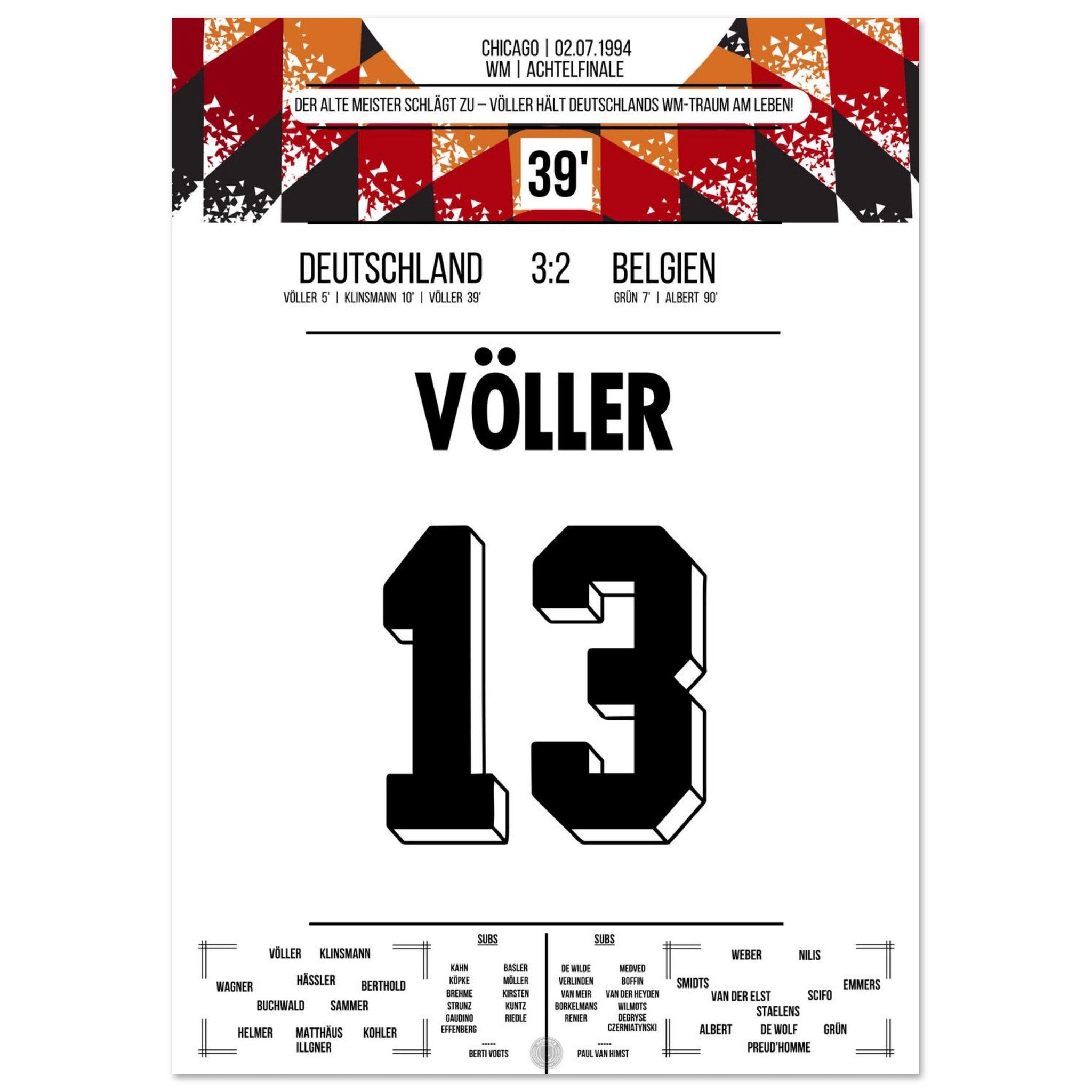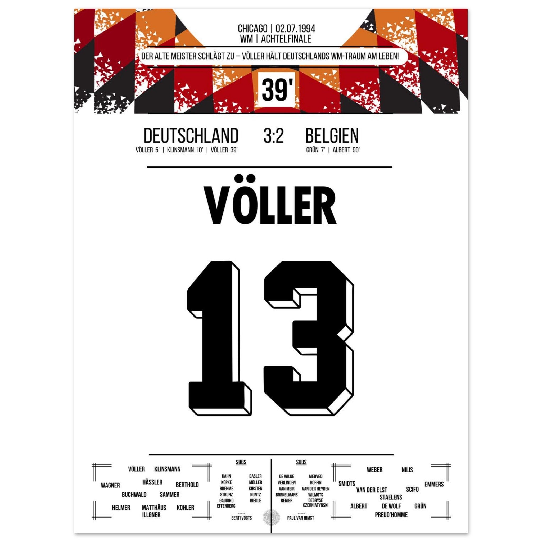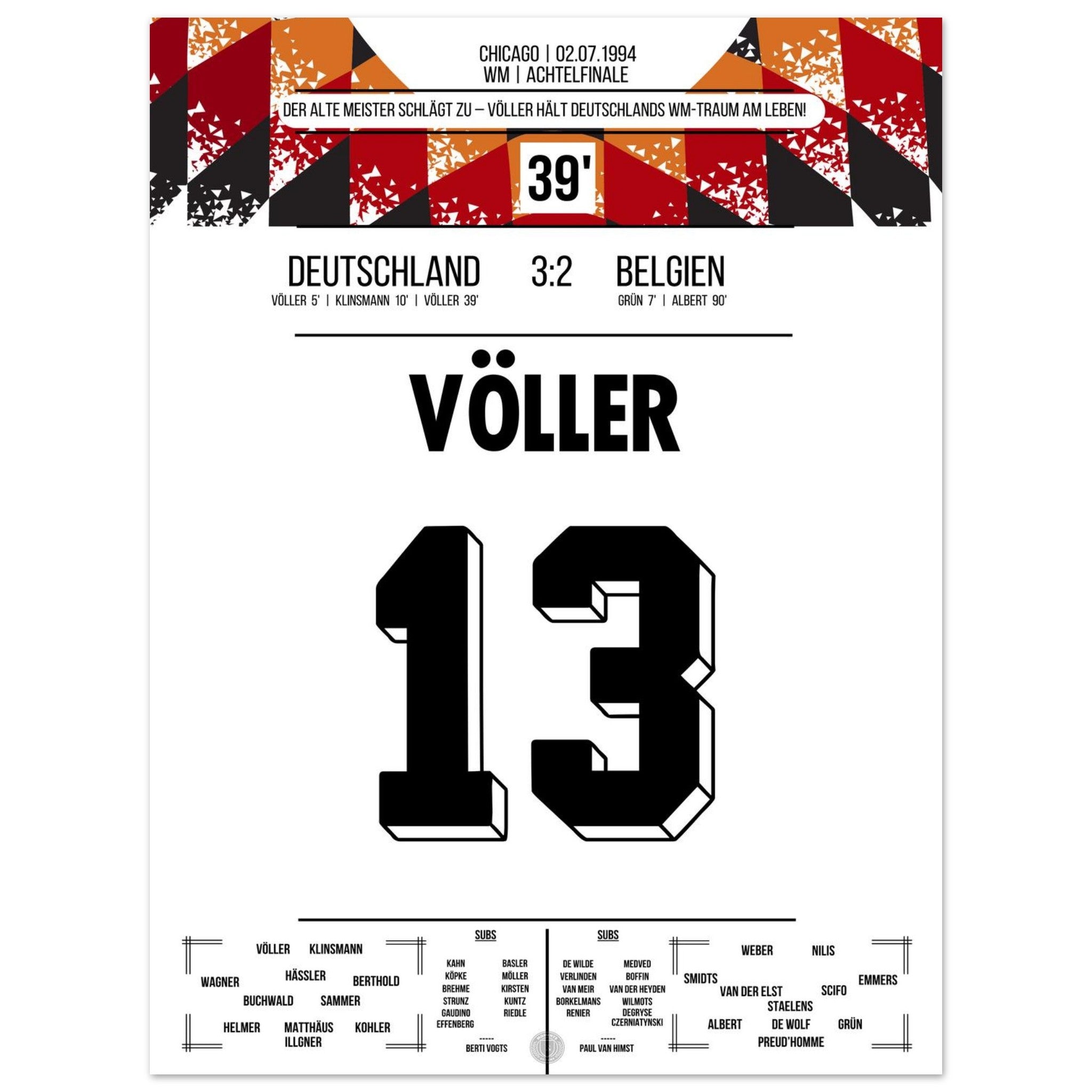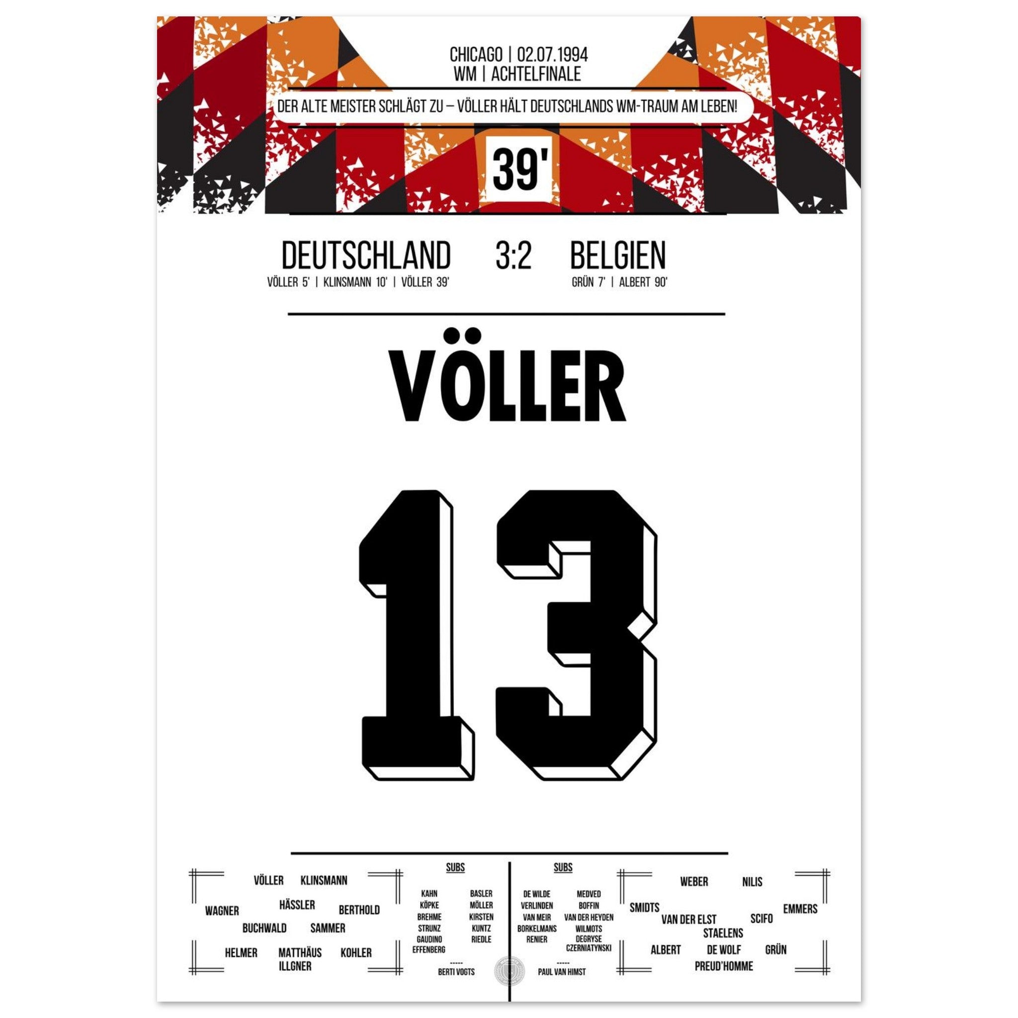 2. Juli 1994 – Deutschland vs. Belgien 3:2: Rudi Völler zeigt im WM-Achtelfinale seinen legendären Torriecher und schnürt einen Doppelpack gegen Belgien. Ein echter Klassiker des Altmeisters auf amerikanischem Boden – unser Poster hält diesen starken Auftritt in Schwarz-Rot-Gold fest.