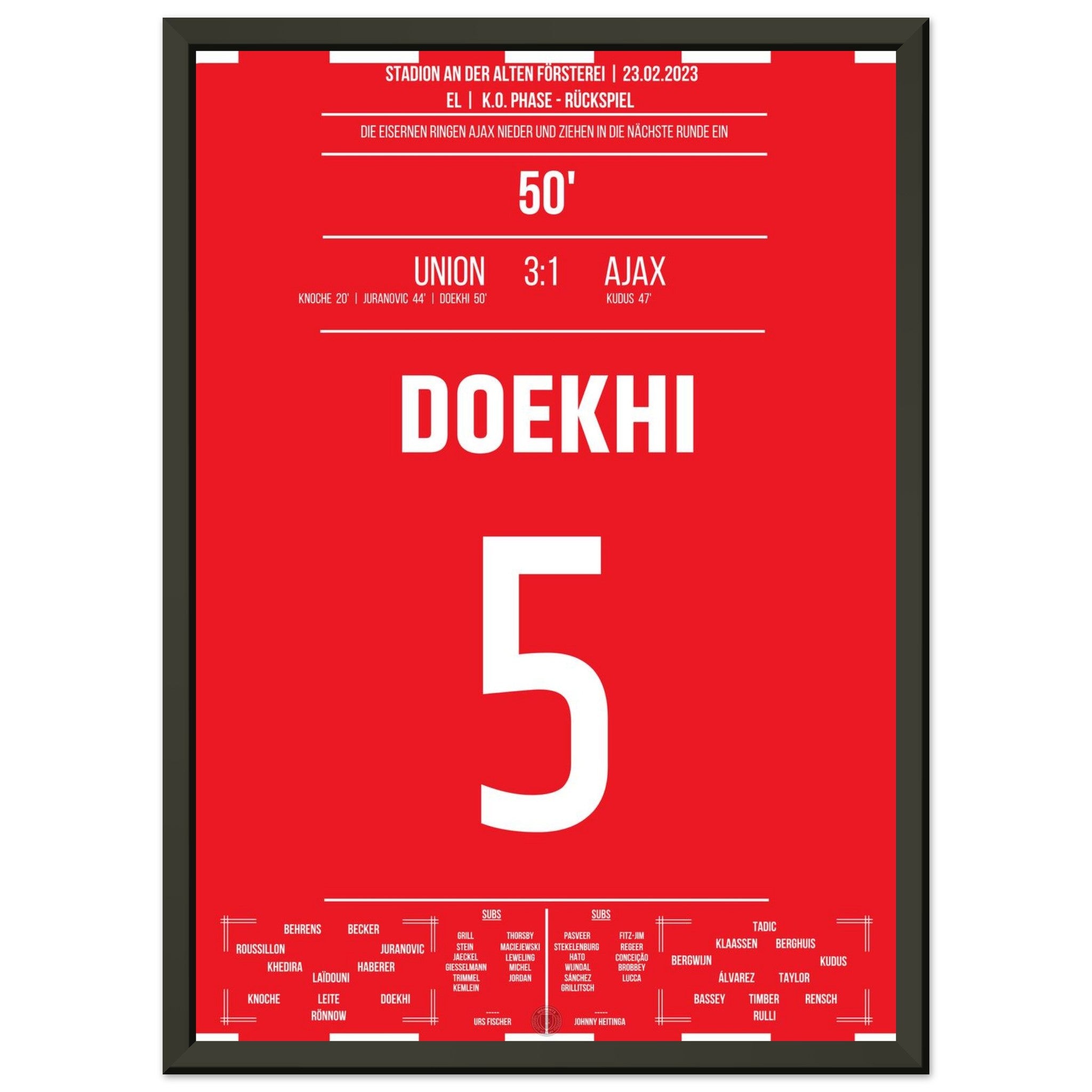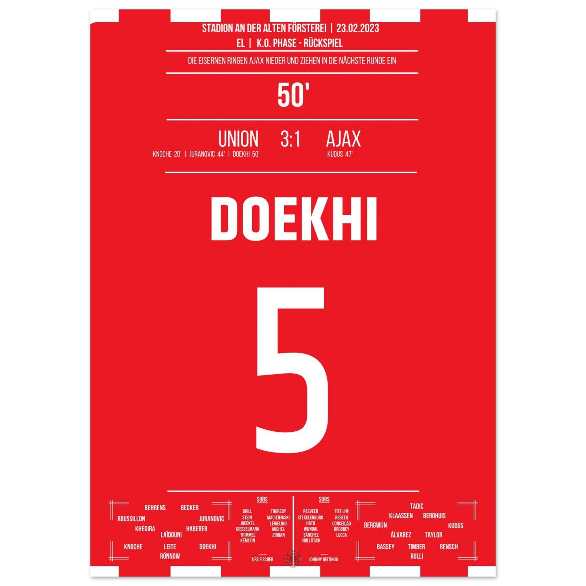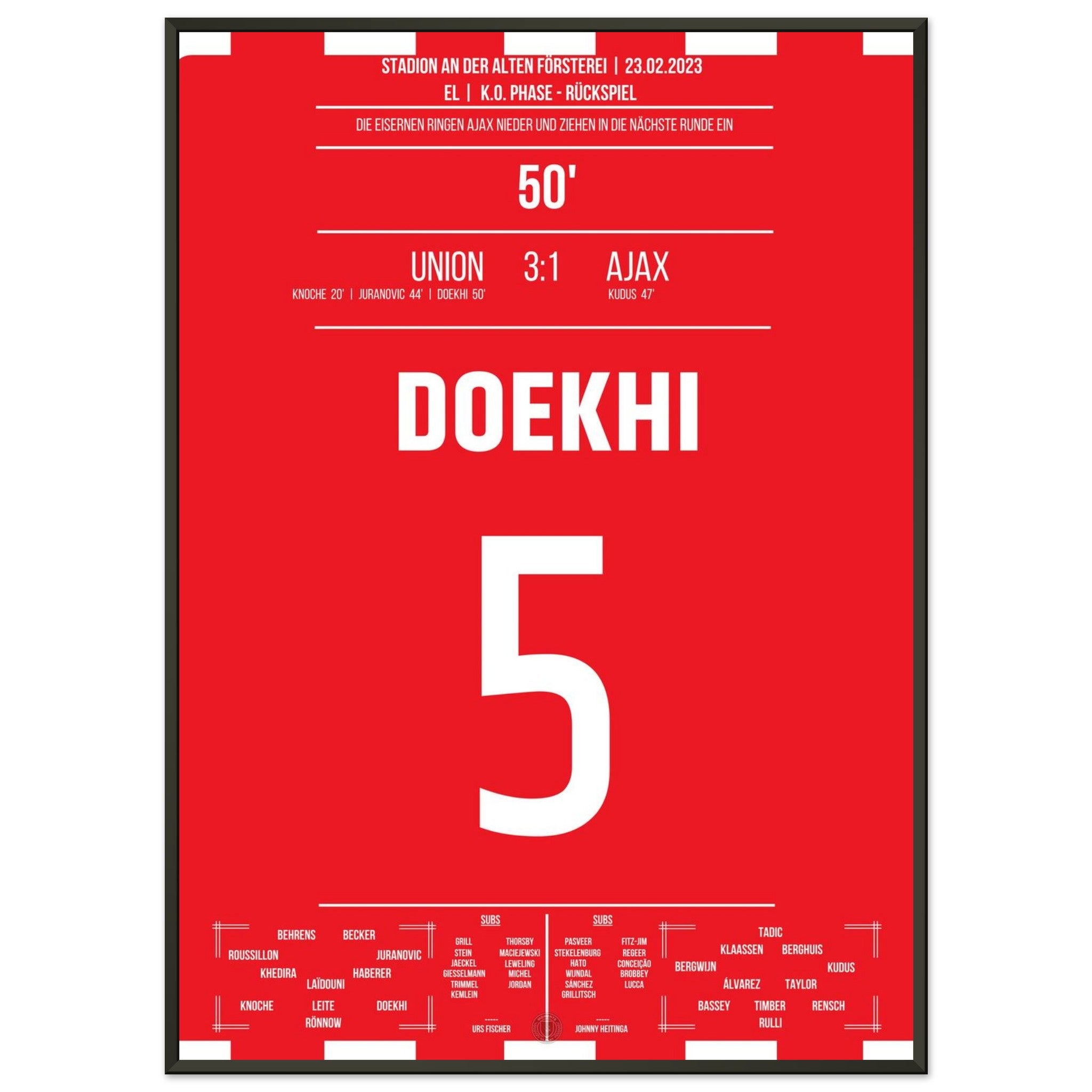 23. Februar 2023 – Berlin vs. Amsterdam 3:1: In der 50. Minute steigt Danilho Doekhi nach einem Eckball am höchsten und köpft das 2:0 gegen Ajax – mitten im vollen Stadion An der Alten Försterei. Mit seinem Treffer ebnet er Union den Weg ins Achtelfinale. Unser Poster hält diesen magischen Europapokal-Moment fest.