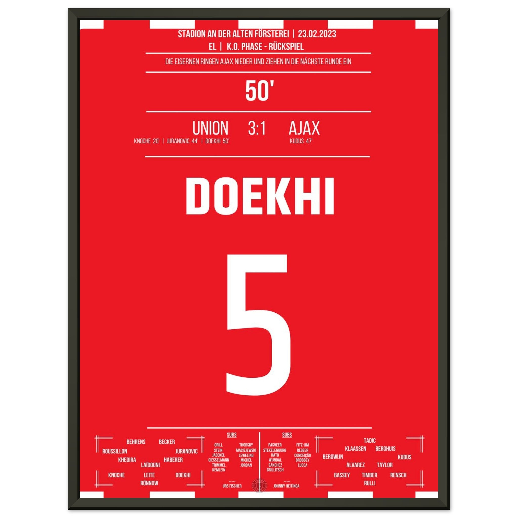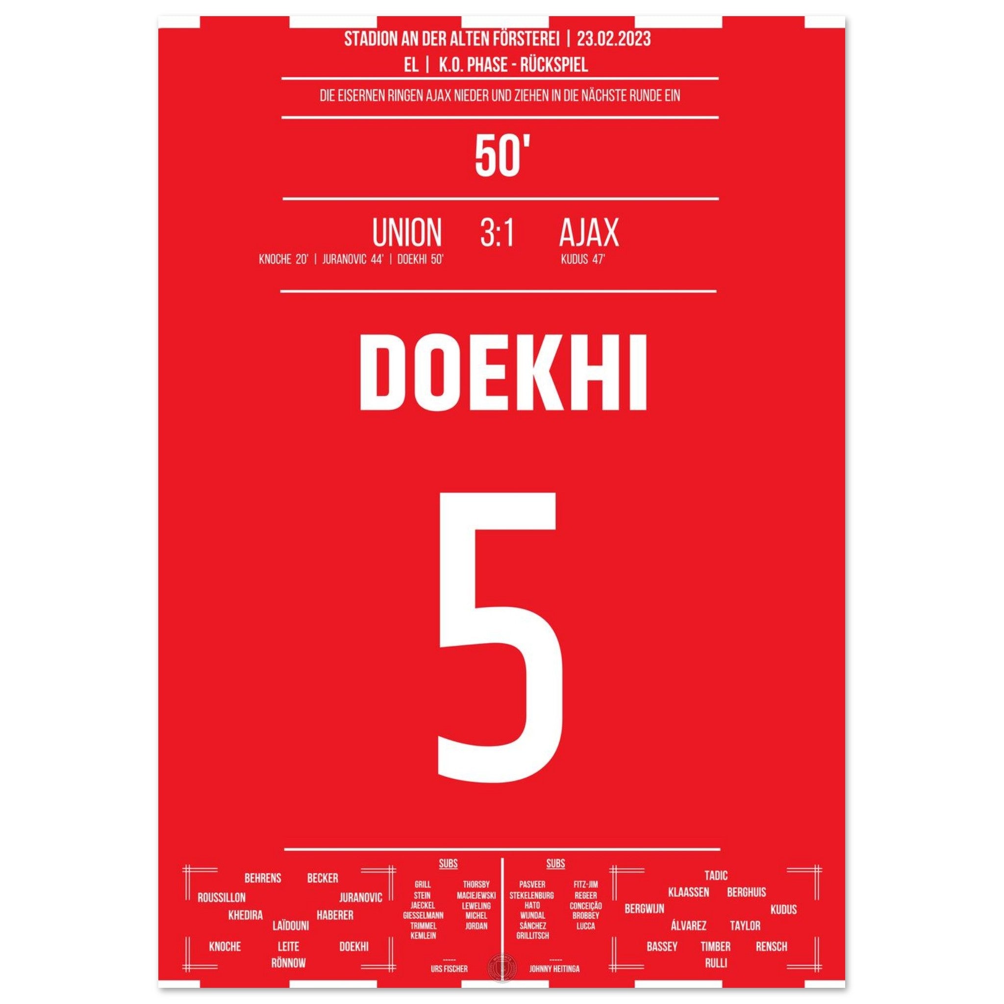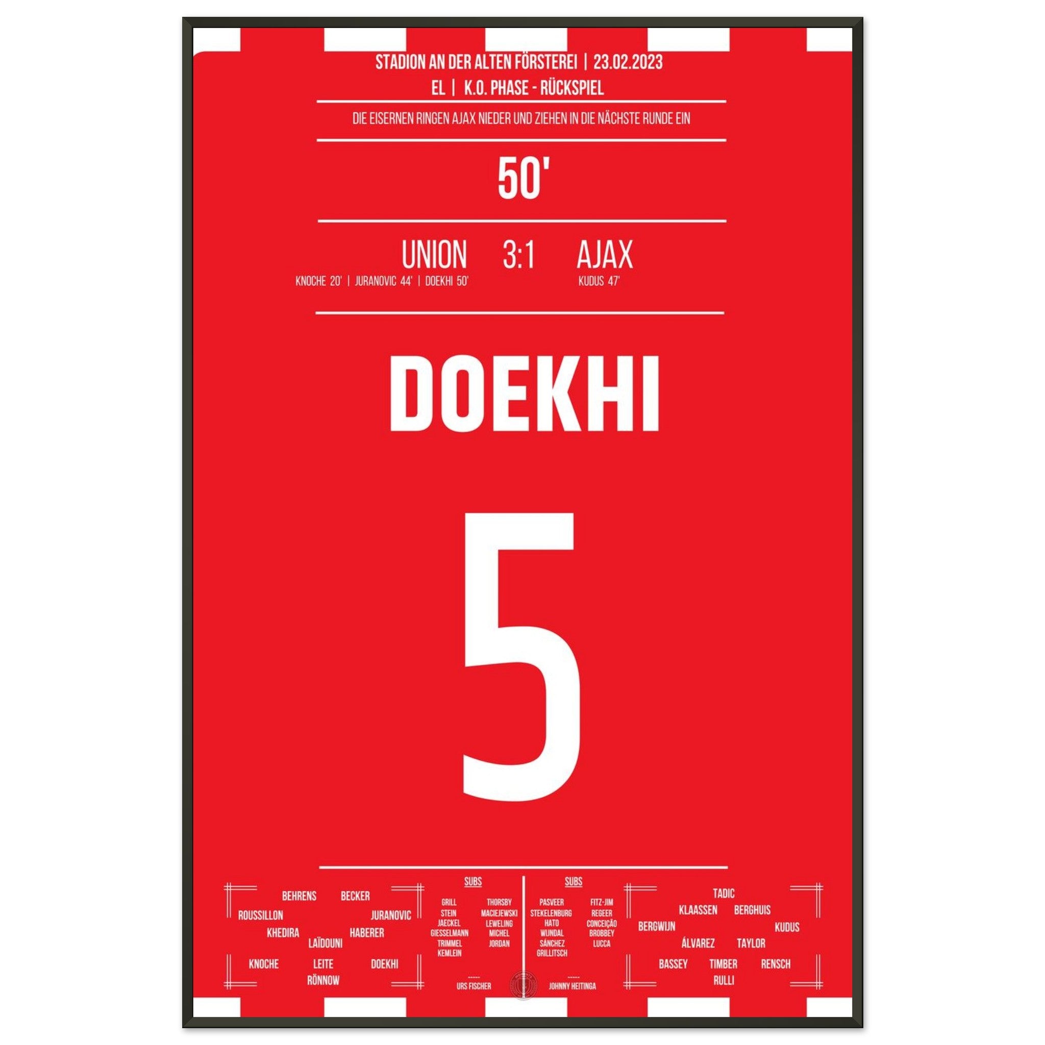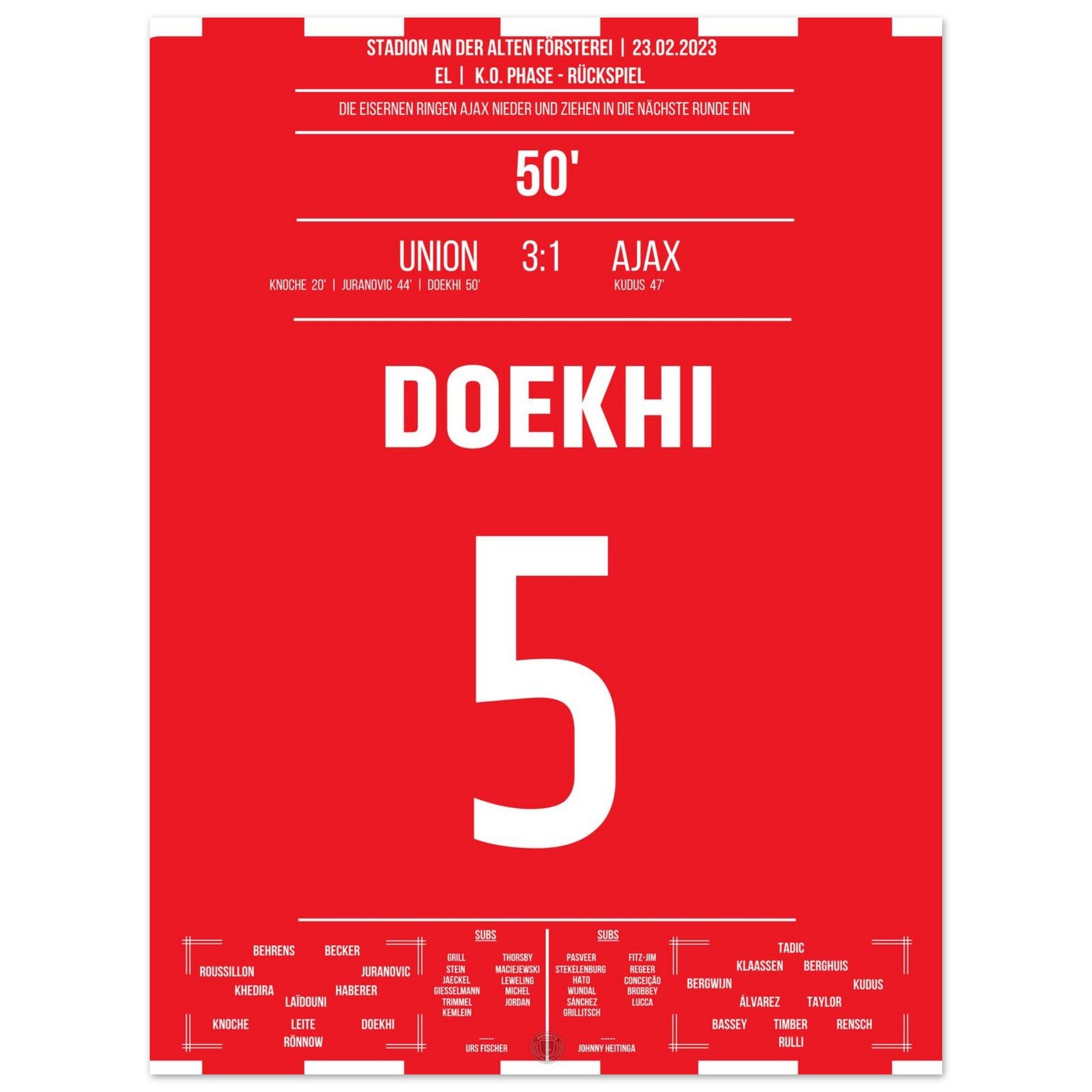 23. Februar 2023 – Berlin vs. Amsterdam 3:1: In der 50. Minute steigt Danilho Doekhi nach einem Eckball am höchsten und köpft das 2:0 gegen Ajax – mitten im vollen Stadion An der Alten Försterei. Mit seinem Treffer ebnet er Union den Weg ins Achtelfinale. Unser Poster hält diesen magischen Europapokal-Moment fest.