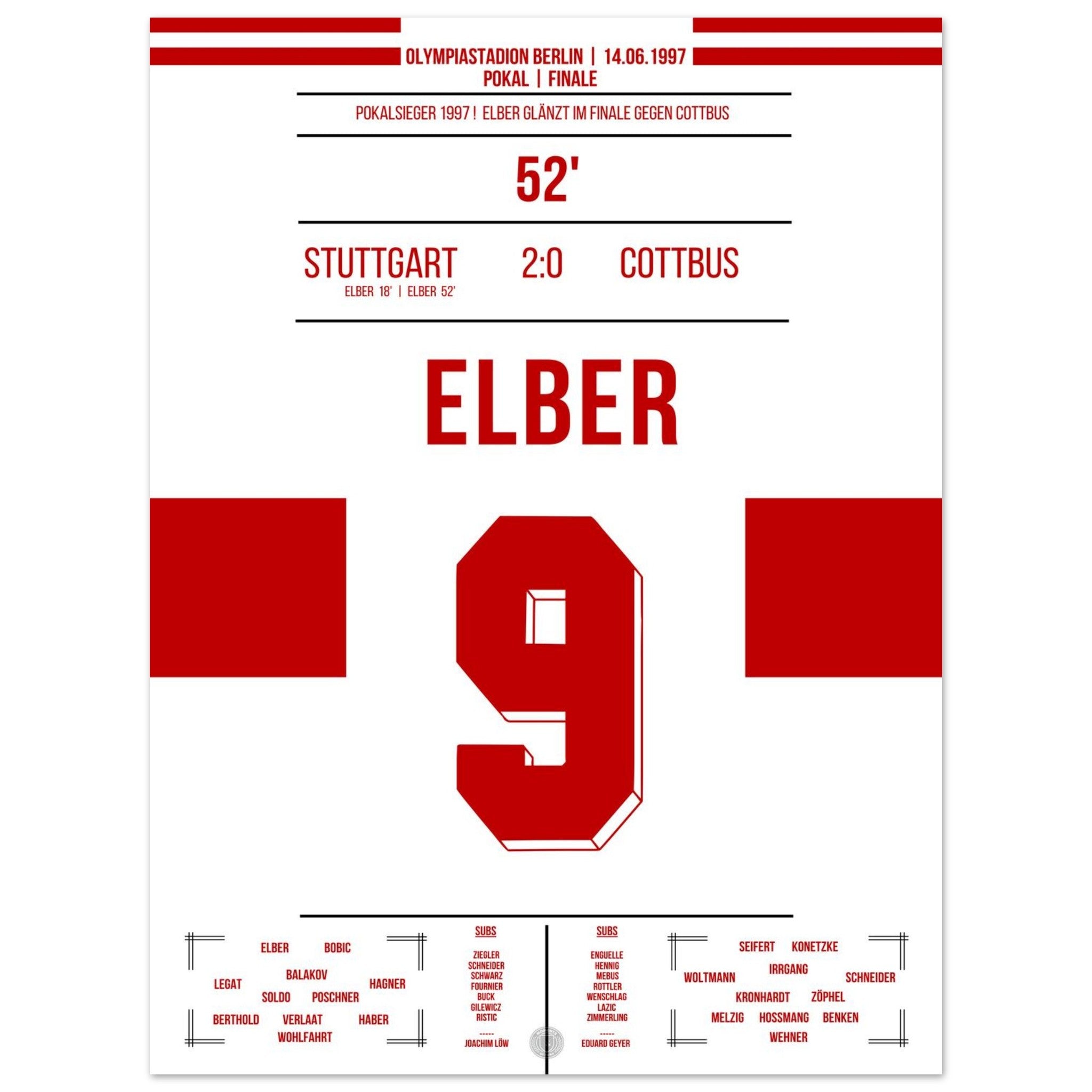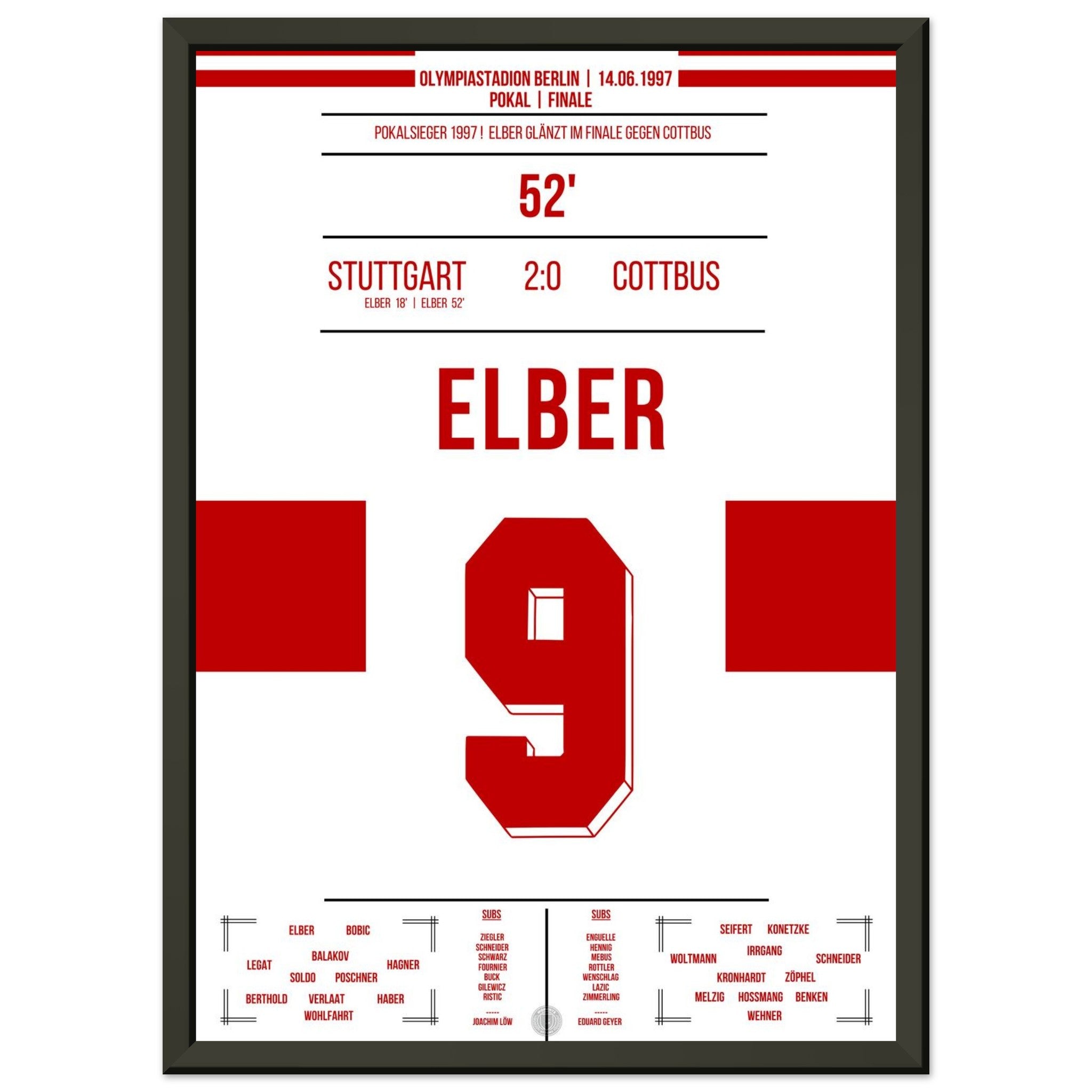14. Juni 1997 – Stuttgart vs. Cottbus 2:0: Giovane Élber trifft im Pokalfinale doppelt und krönt eine starke Saison der Schwaben mit dem Titel. Ein heißer Sommertag in Berlin, ein brasilianischer Torjäger – und der Pokal in Stuttgarter Händen. Unser Poster verewigt diesen goldenen Élber-Moment.