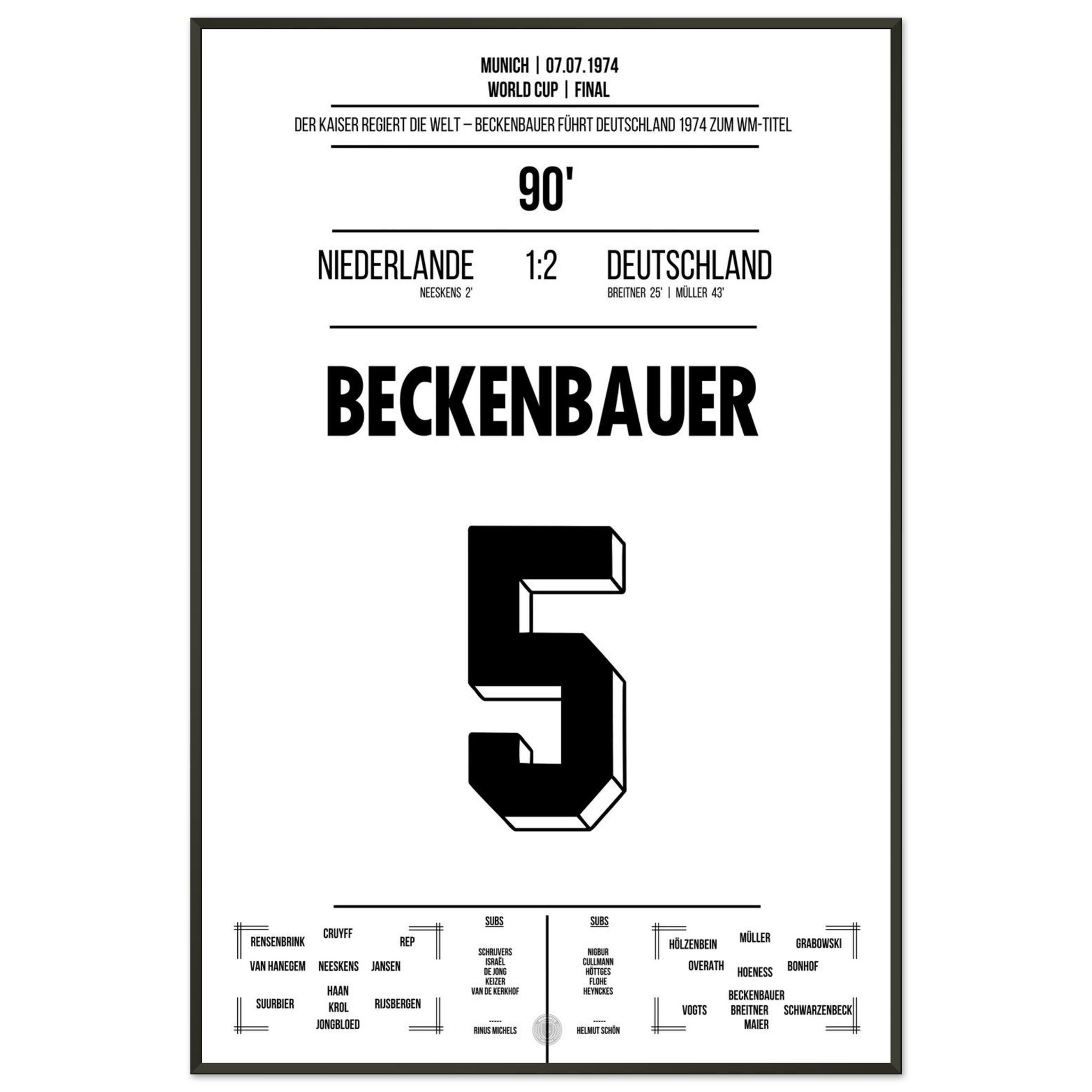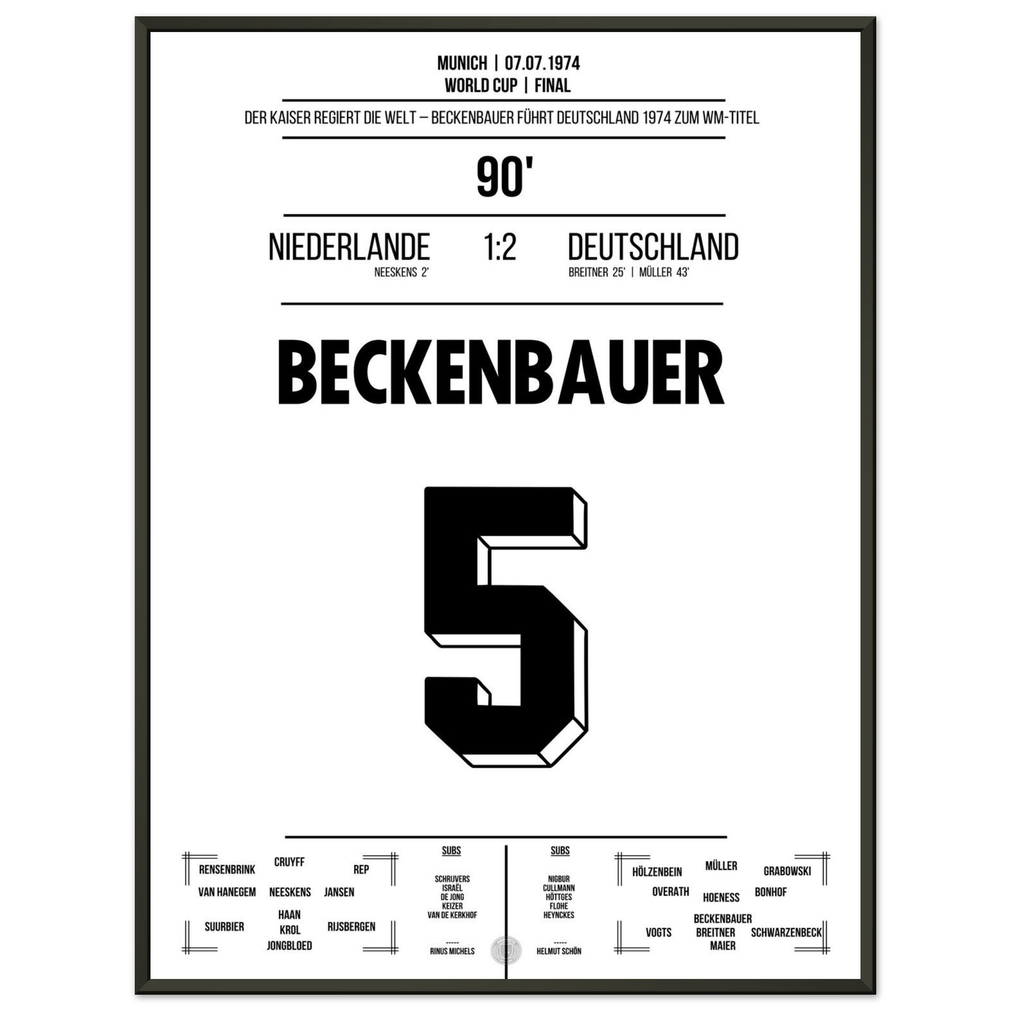 7. Juli 1974 – Niederlande vs. Deutschland 1:2: Im WM-Finale von München führt Franz Beckenbauer als Kapitän die deutsche Mannschaft zum Titel – gegen die favorisierten Niederländer um Cruyff. Ein historischer Triumph im eigenen Land, ein Tag für die Ewigkeit. Unser Poster fängt diesen goldenen WM-Moment von 1974 ein.