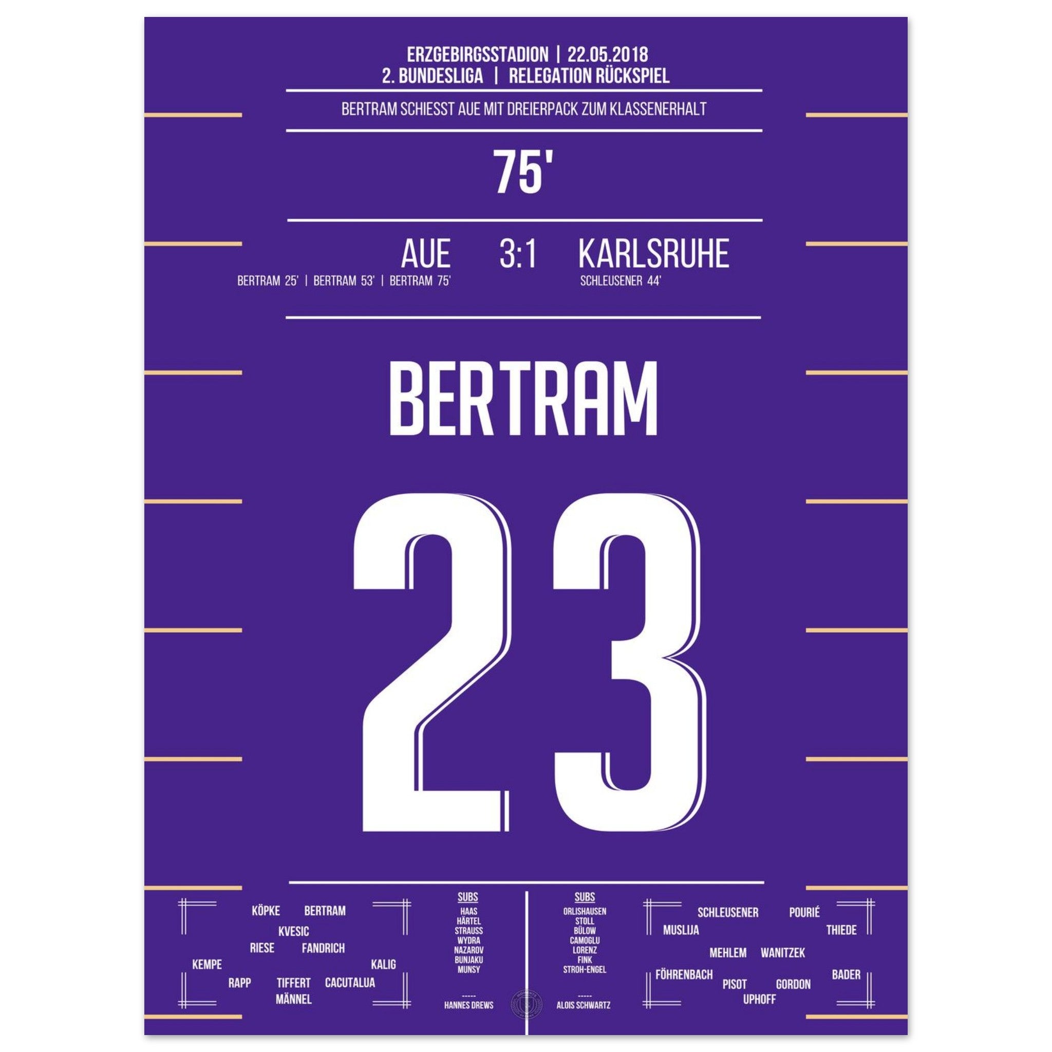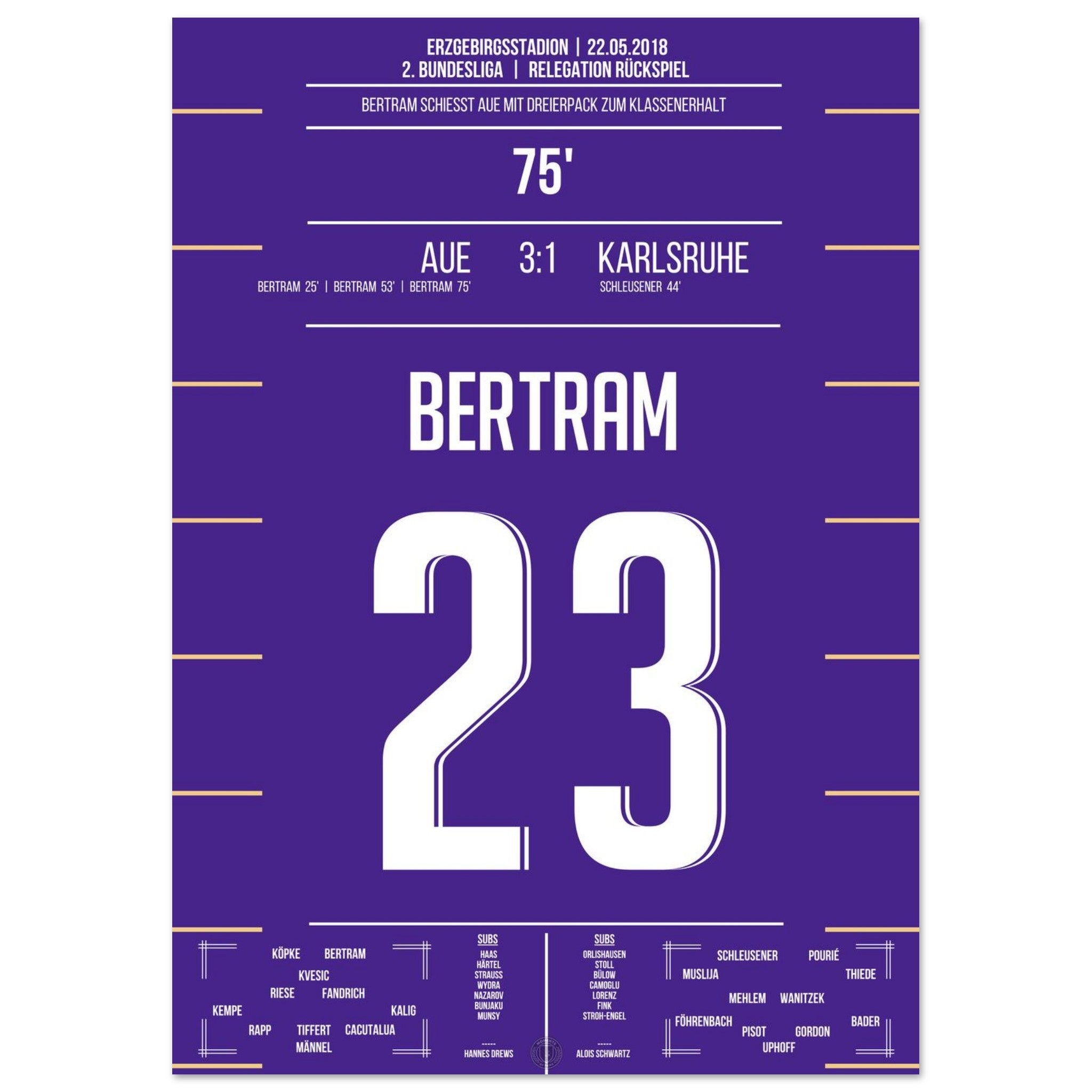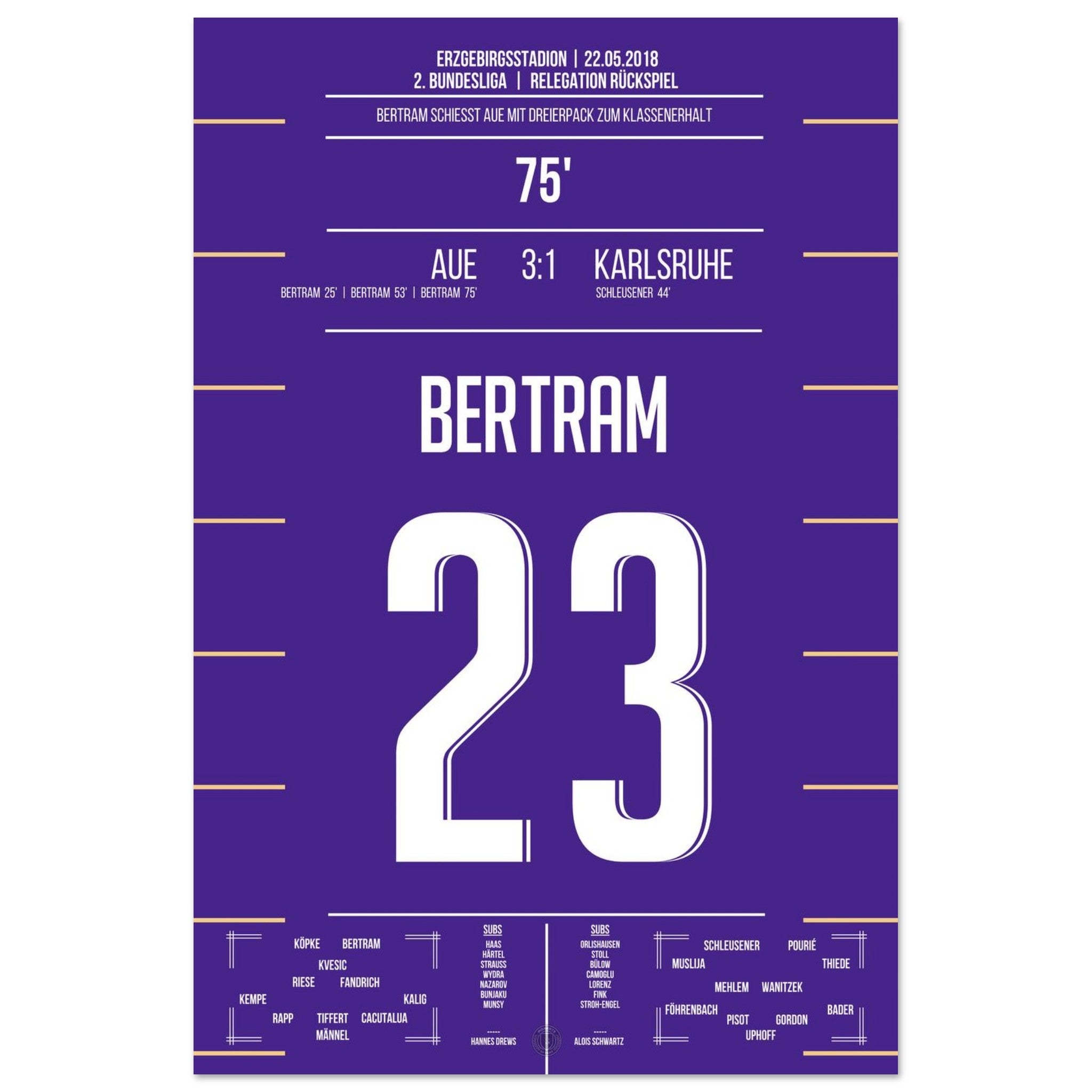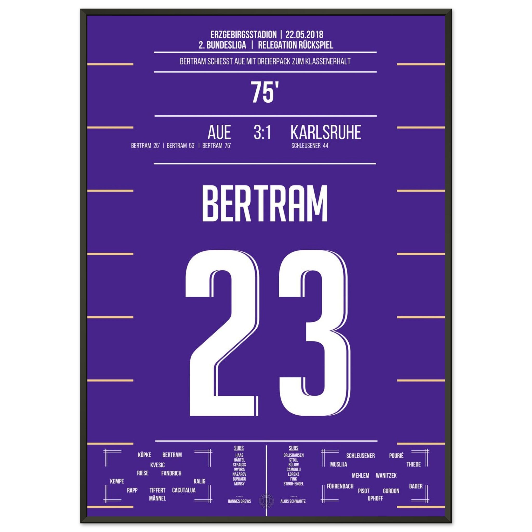 Bertram schnürt einen beeindruckenden Dreierpack und wird zum Matchwinner des Abends. Mit seinem dritten Treffer in der 75. Minute sichert er Aue den Verbleib in der 2. Bundesliga – pure Erleichterung und grenzenloser Jubel auf den Rängen!
