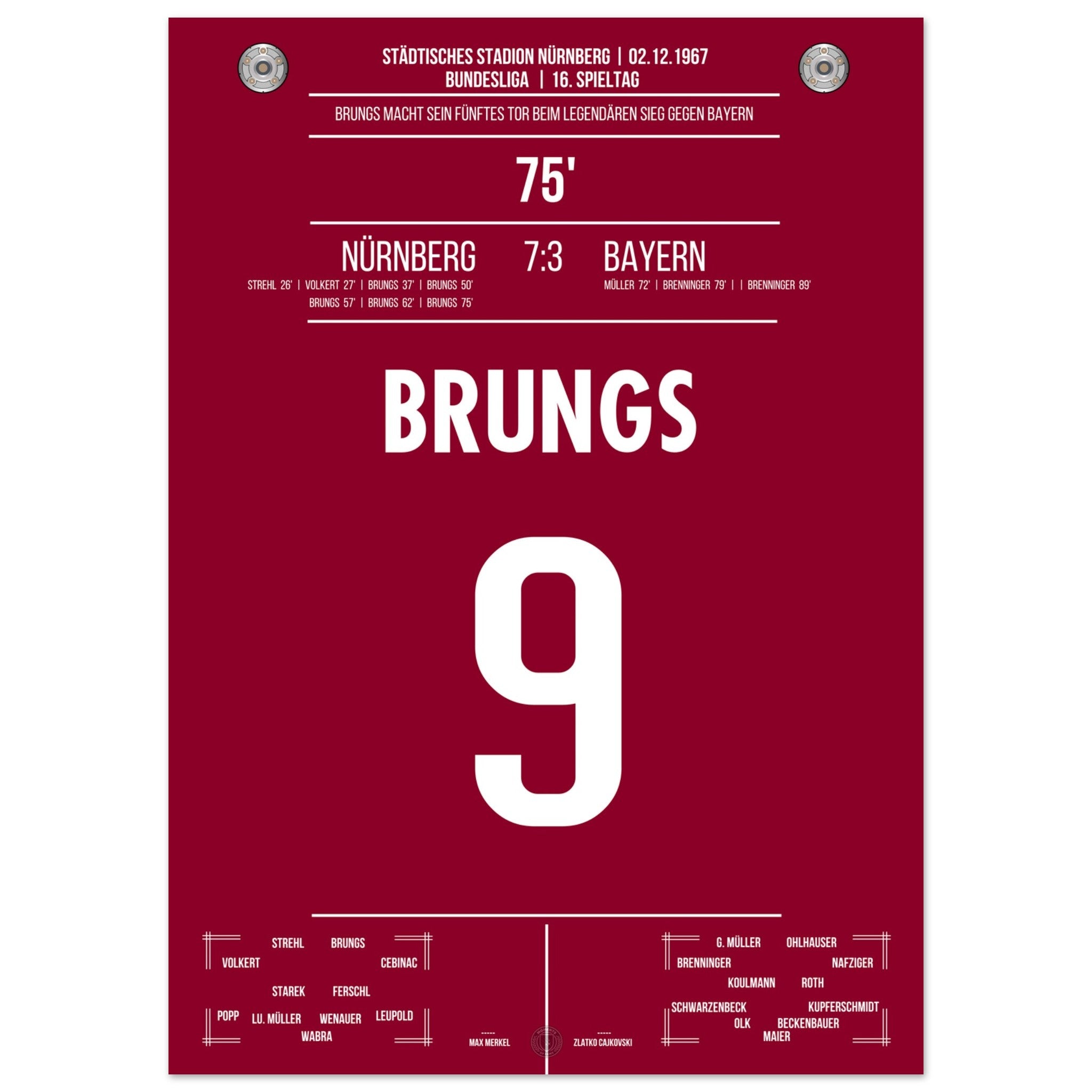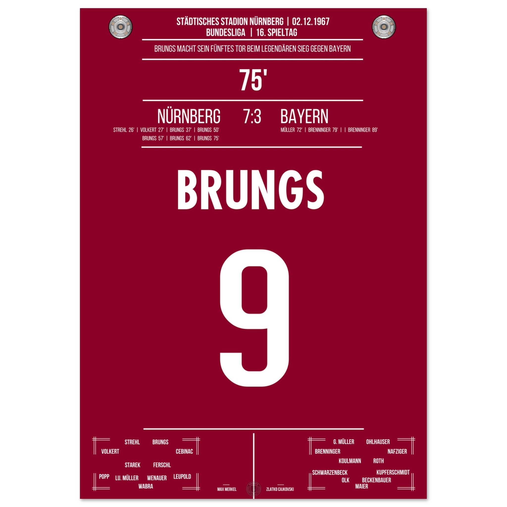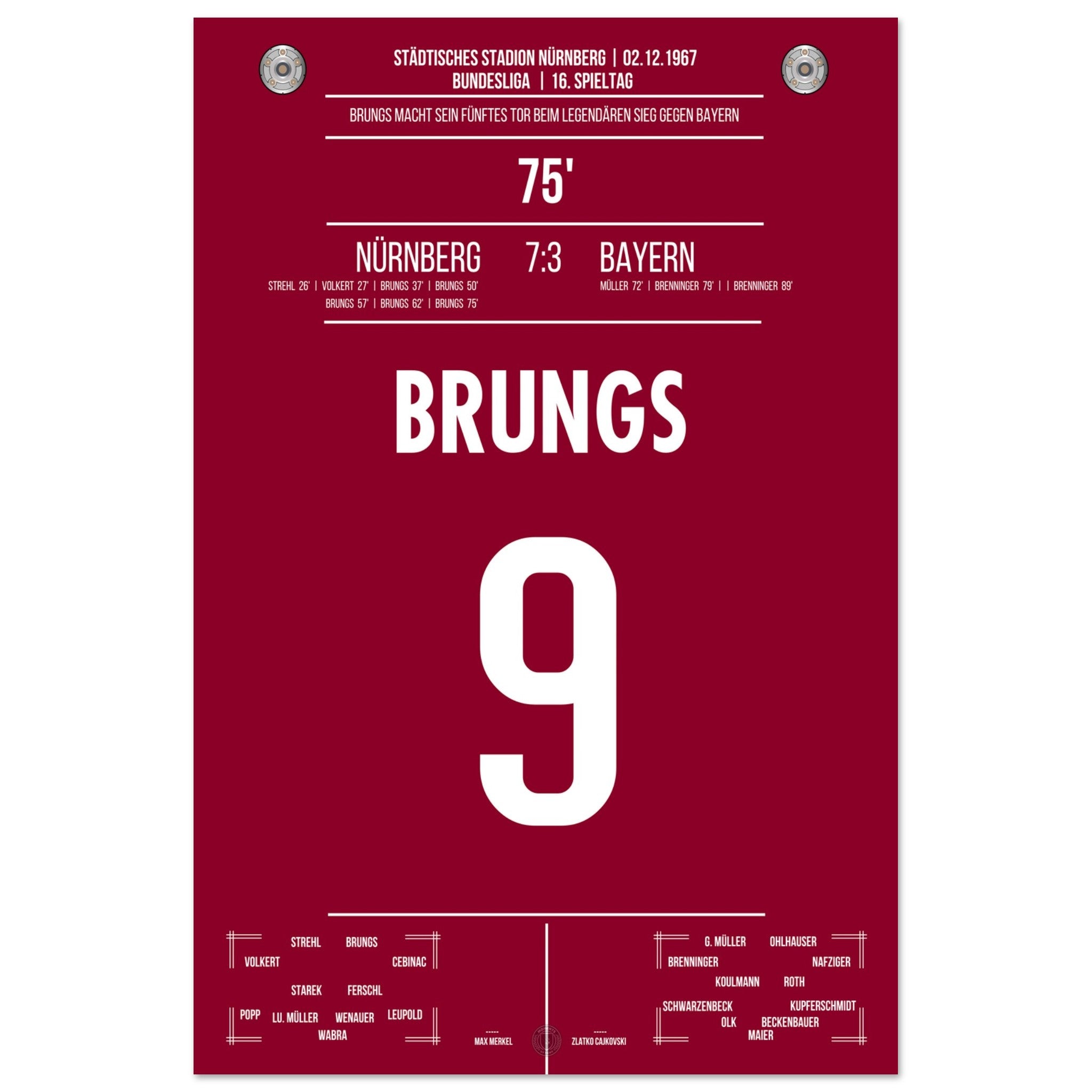 02. Dezember 1967 – Nürnberg vs. Bayern 5:1:Mann des Tages war Brungs: Mit fünf Treffern, Ein historischer Auftritt, den es so nie wieder gab. Unser Poster feiert diesen legendären Fünferpack als Krönung seiner Karriere.