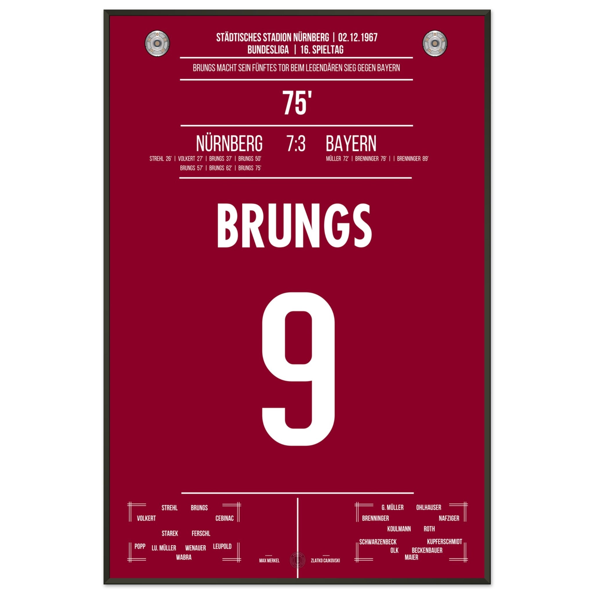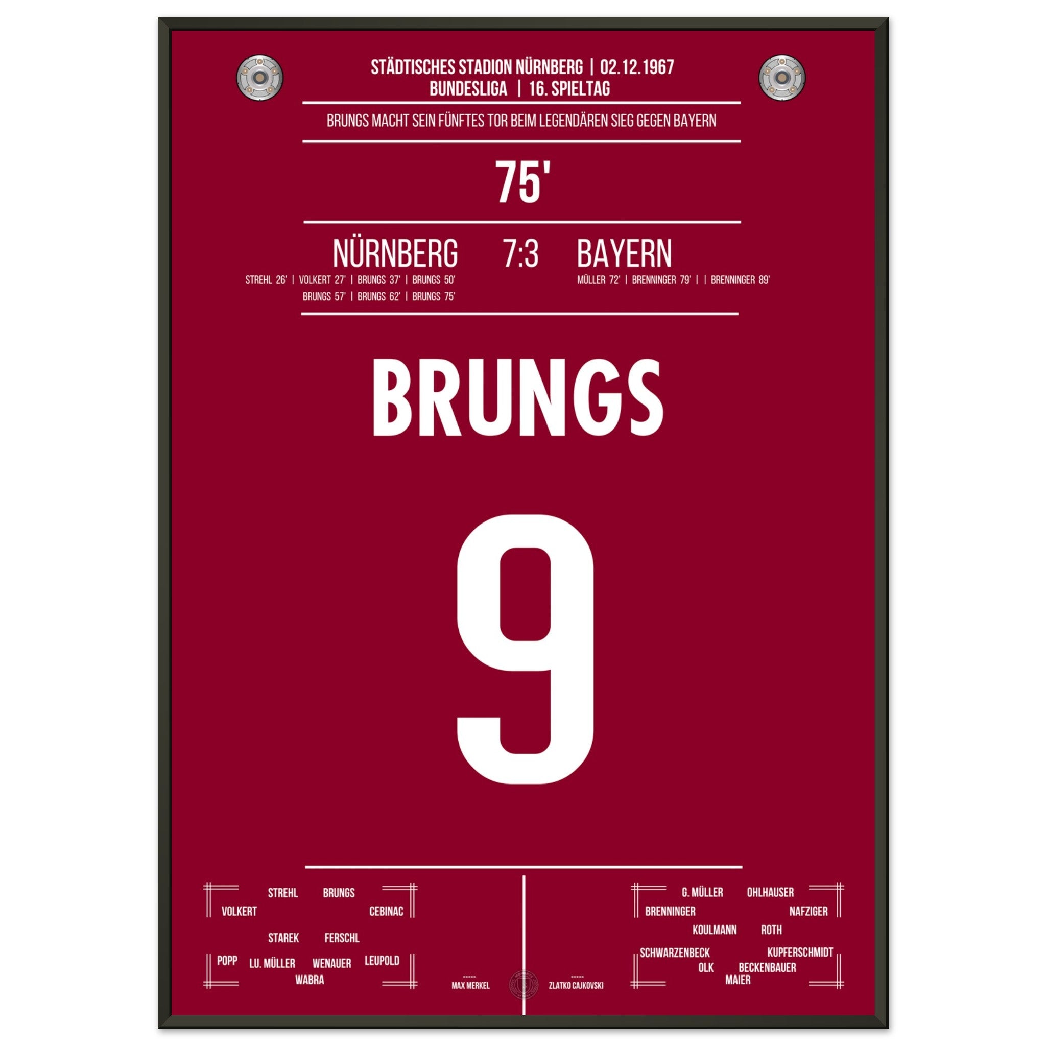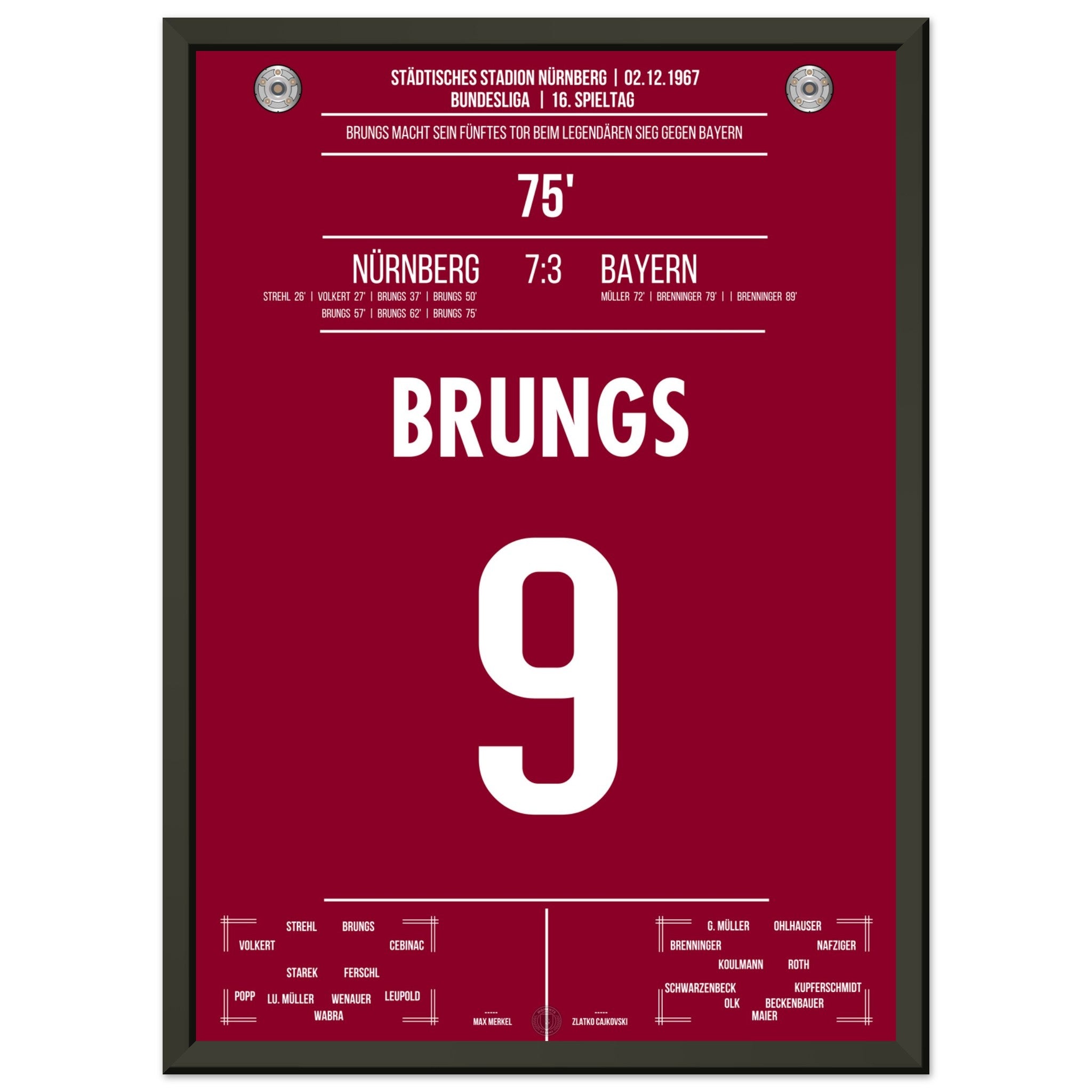 02. Dezember 1967 – Nürnberg vs. Bayern 5:1:Mann des Tages war Brungs: Mit fünf Treffern, Ein historischer Auftritt, den es so nie wieder gab. Unser Poster feiert diesen legendären Fünferpack als Krönung seiner Karriere.