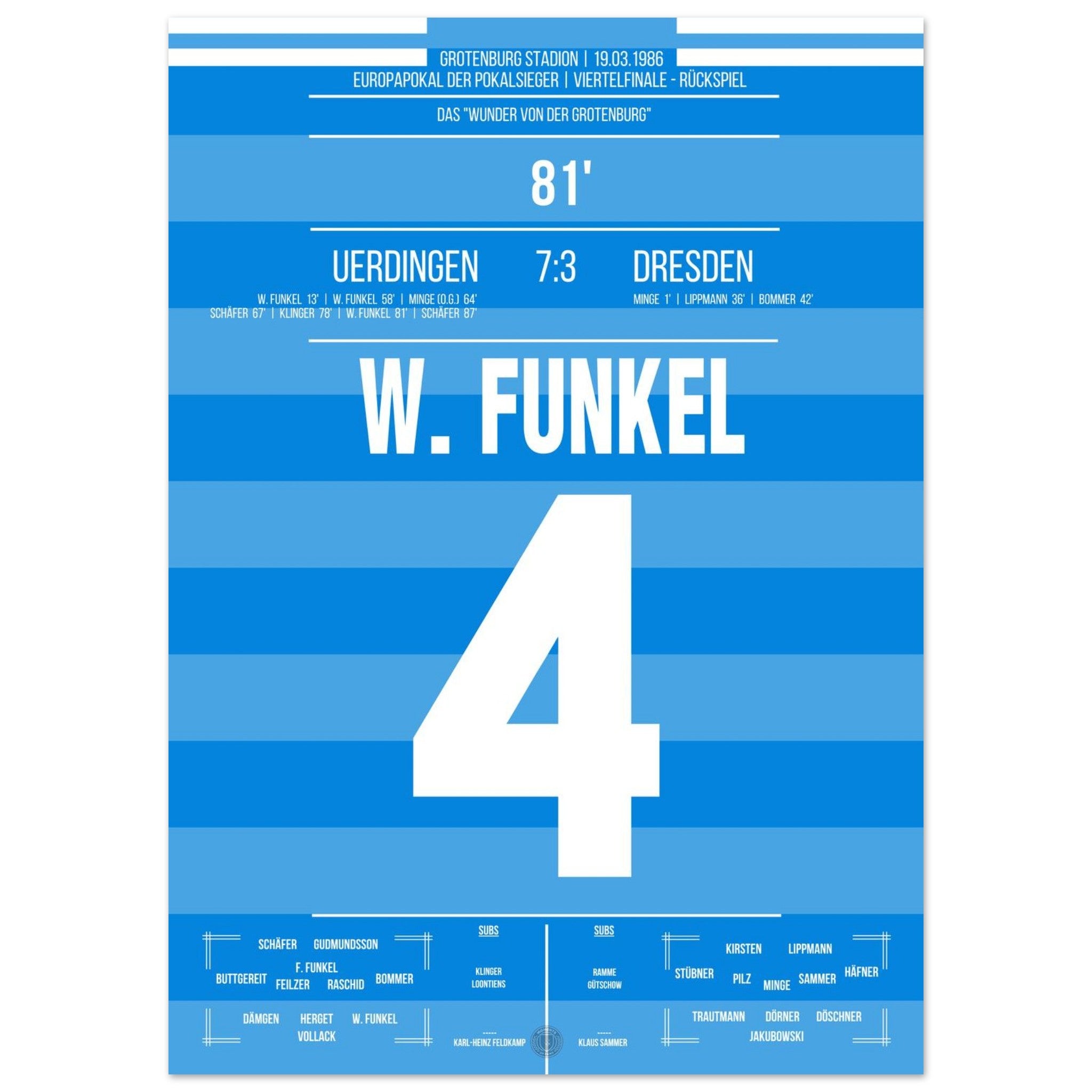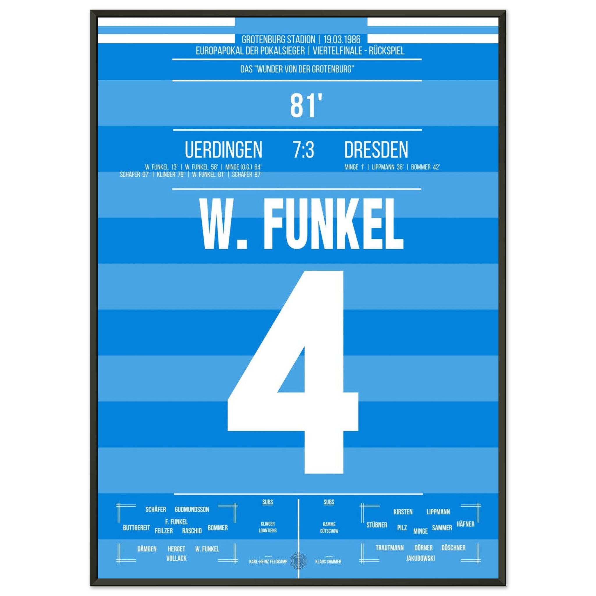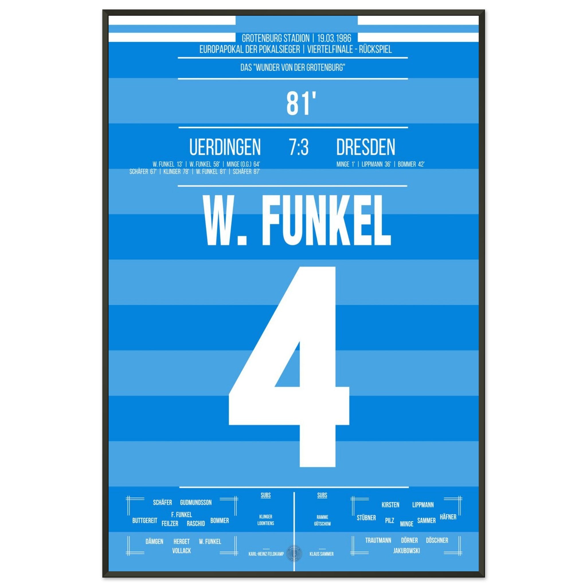 19. März 1986 – Uerdingen vs. Dresden 7:3: Zur Halbzeit scheint alles verloren – Uerdingen liegt 1:3 zurück und steht vor dem Aus im Europapokal. Doch was dann folgt, ist pure Fußballmagie: In einer legendären zweiten Hälfte schießt das Team sechs Tore und dreht das Viertelfinale gegen Dresden spektakulär. Das „Wunder von der Grotenburg“ ist geboren. Unser Poster hält dieses einmalige Kapitel Fußballgeschichte für immer fest.