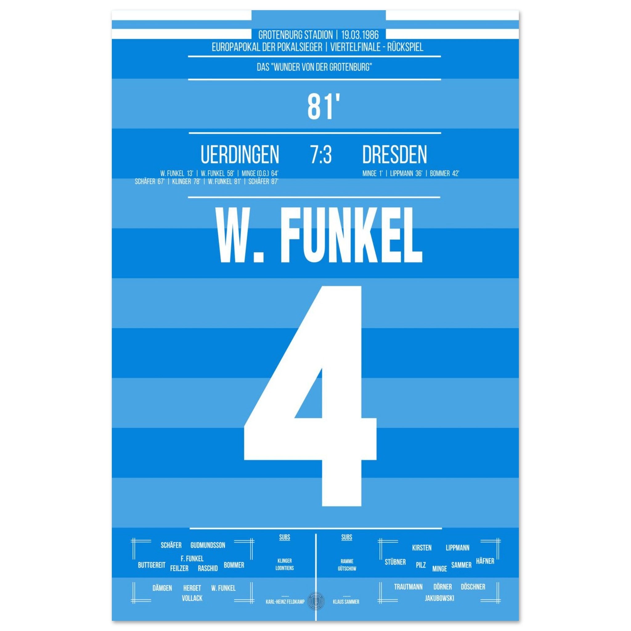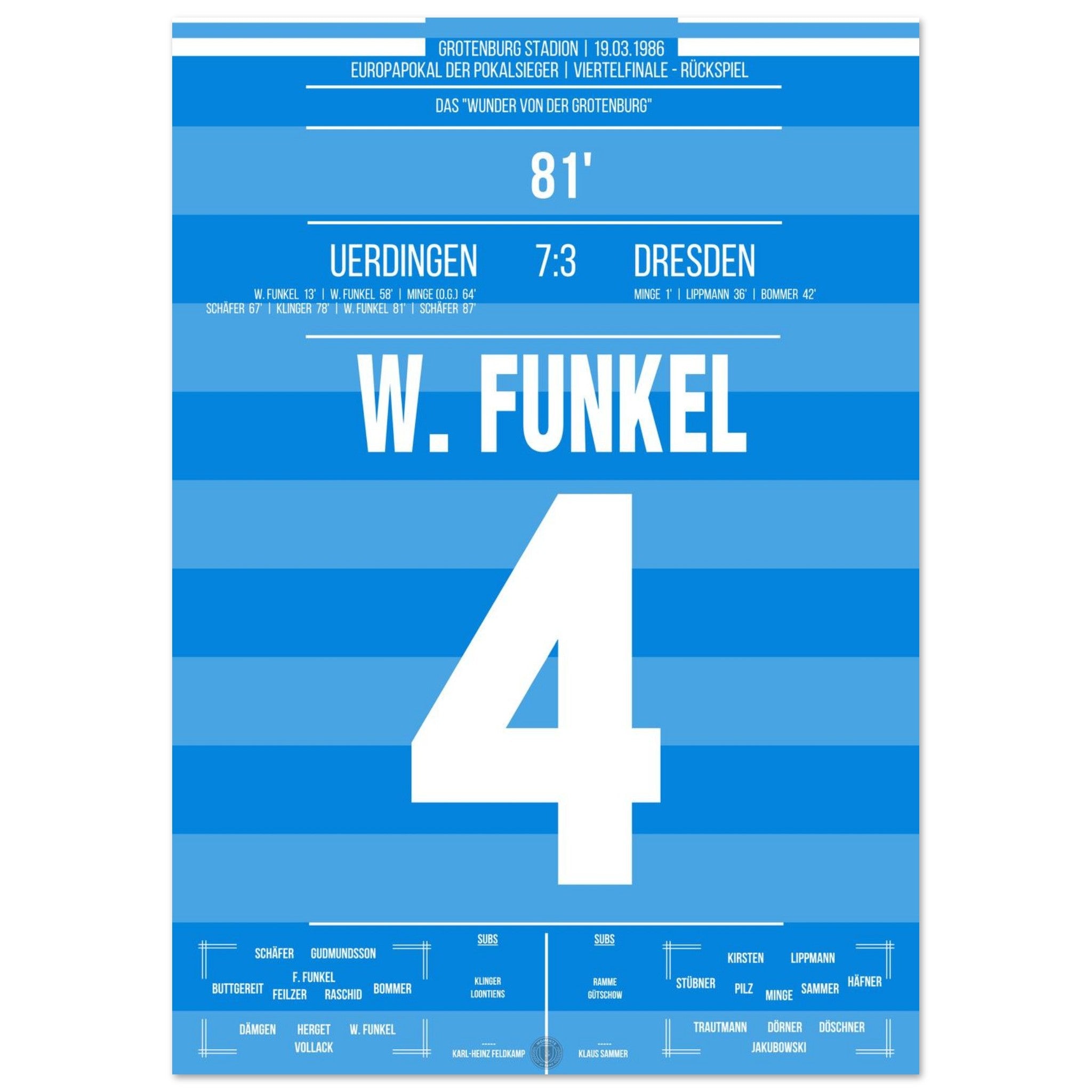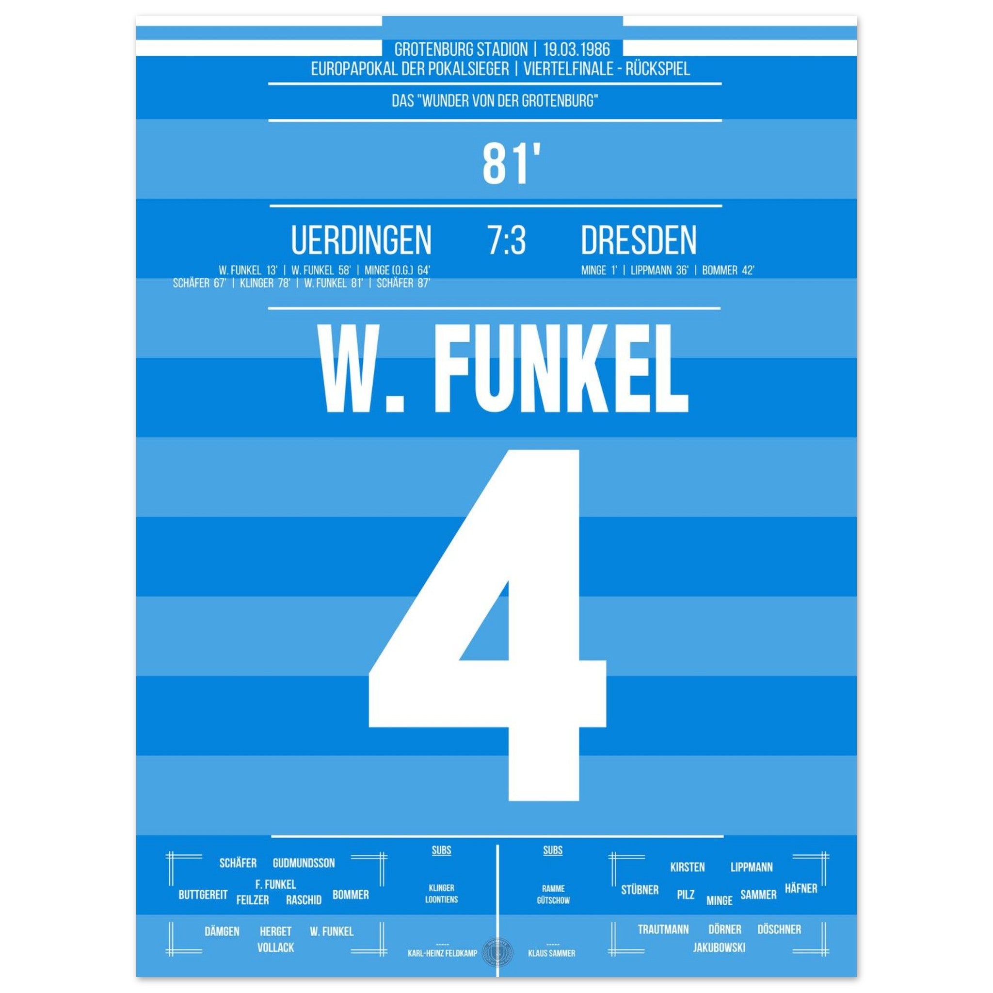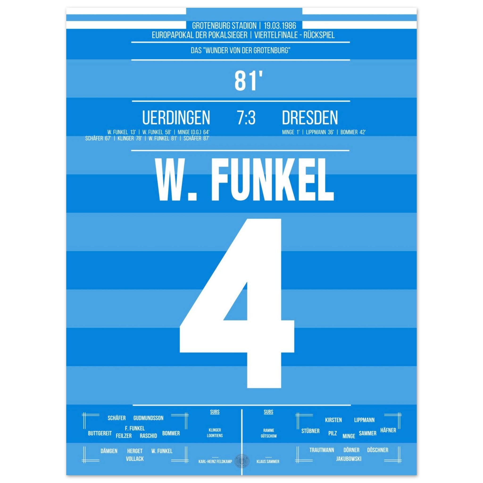 19. März 1986 – Uerdingen vs. Dresden 7:3: Zur Halbzeit scheint alles verloren – Uerdingen liegt 1:3 zurück und steht vor dem Aus im Europapokal. Doch was dann folgt, ist pure Fußballmagie: In einer legendären zweiten Hälfte schießt das Team sechs Tore und dreht das Viertelfinale gegen Dresden spektakulär. Das „Wunder von der Grotenburg“ ist geboren. Unser Poster hält dieses einmalige Kapitel Fußballgeschichte für immer fest.