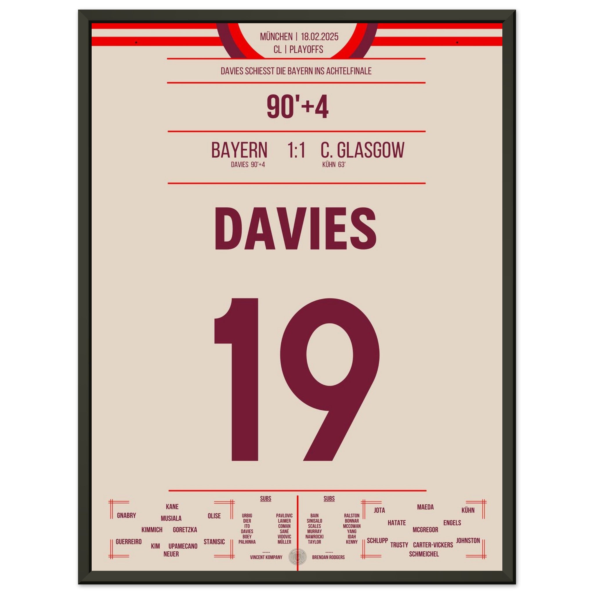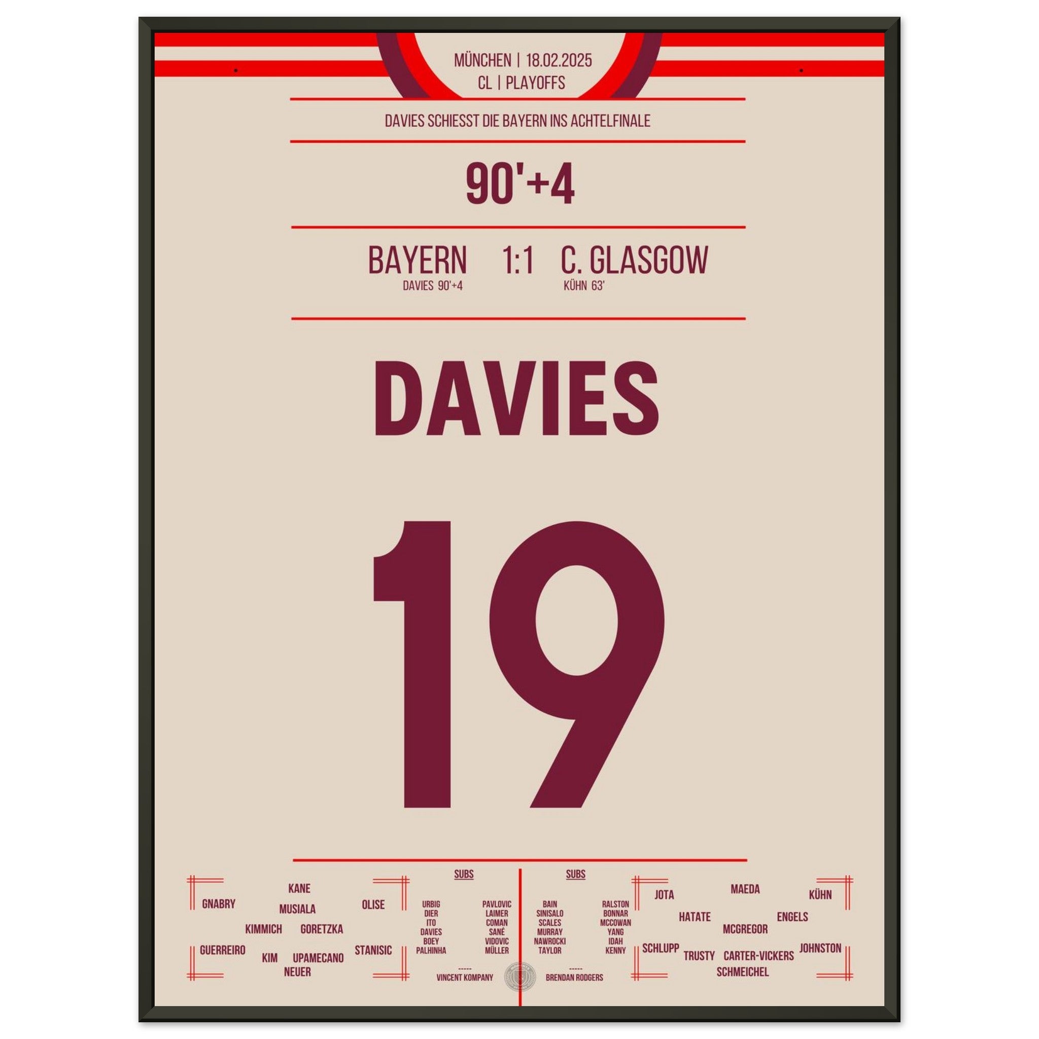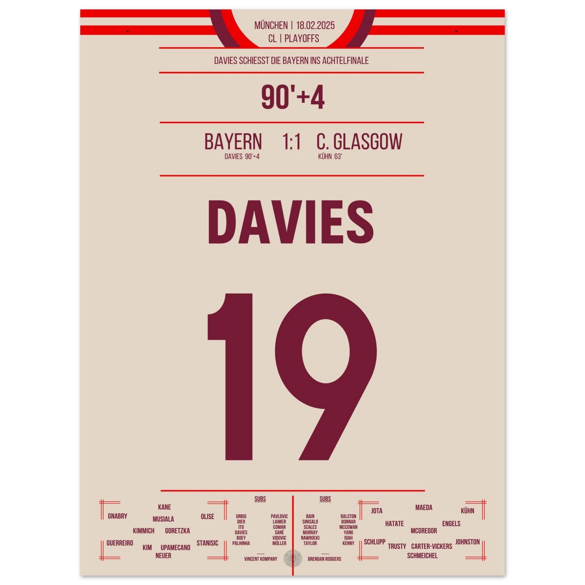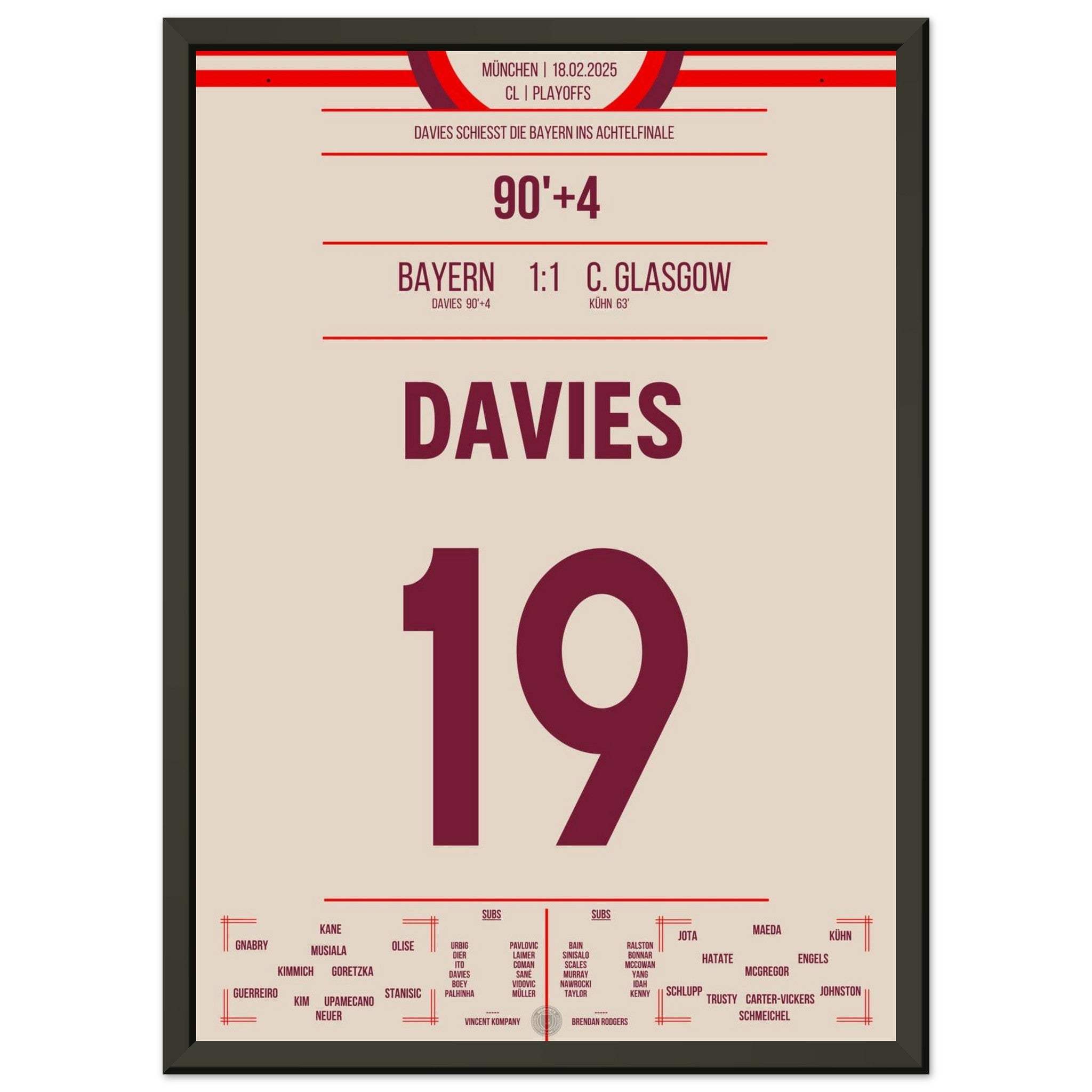 18. Februar 2025 – Bayern vs. Celtic 1:1: In der 94. Minute explodiert die Arena – Alphonso Davies drückt den Ball in letzter Sekunde über die Linie und rettet Bayern das Remis gegen Celtic. Ein Last-Minute-Moment voller Wille und Wucht – festgehalten auf unserem emotionalen Poster.