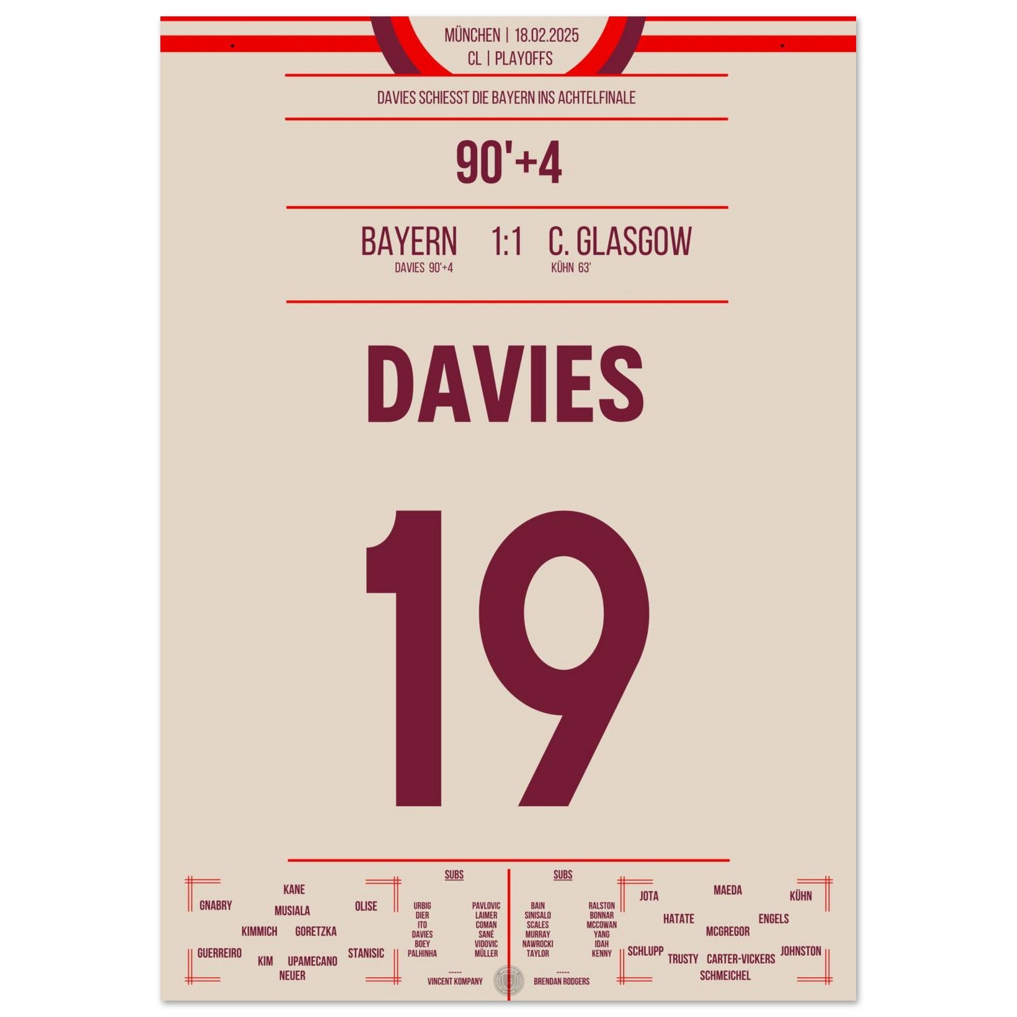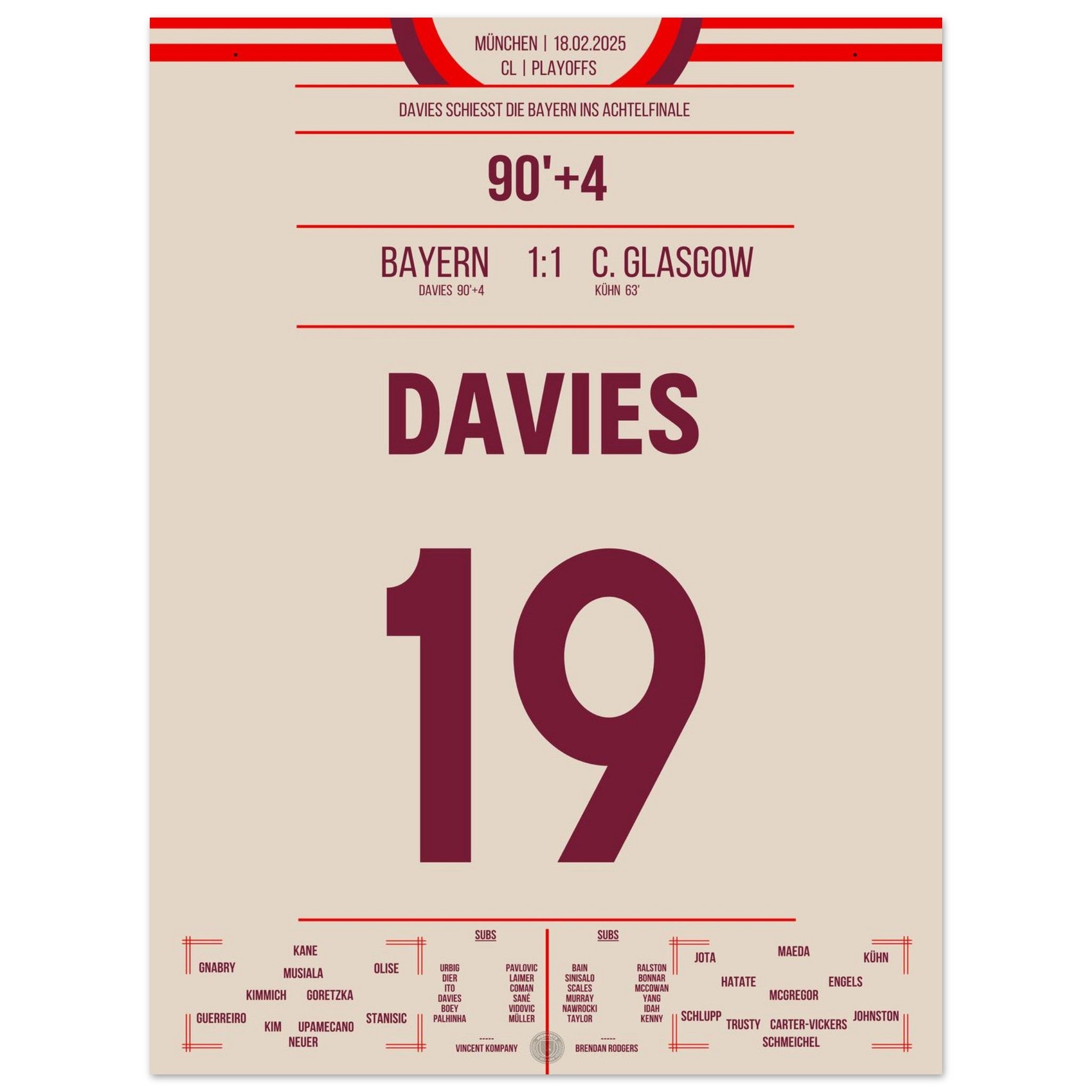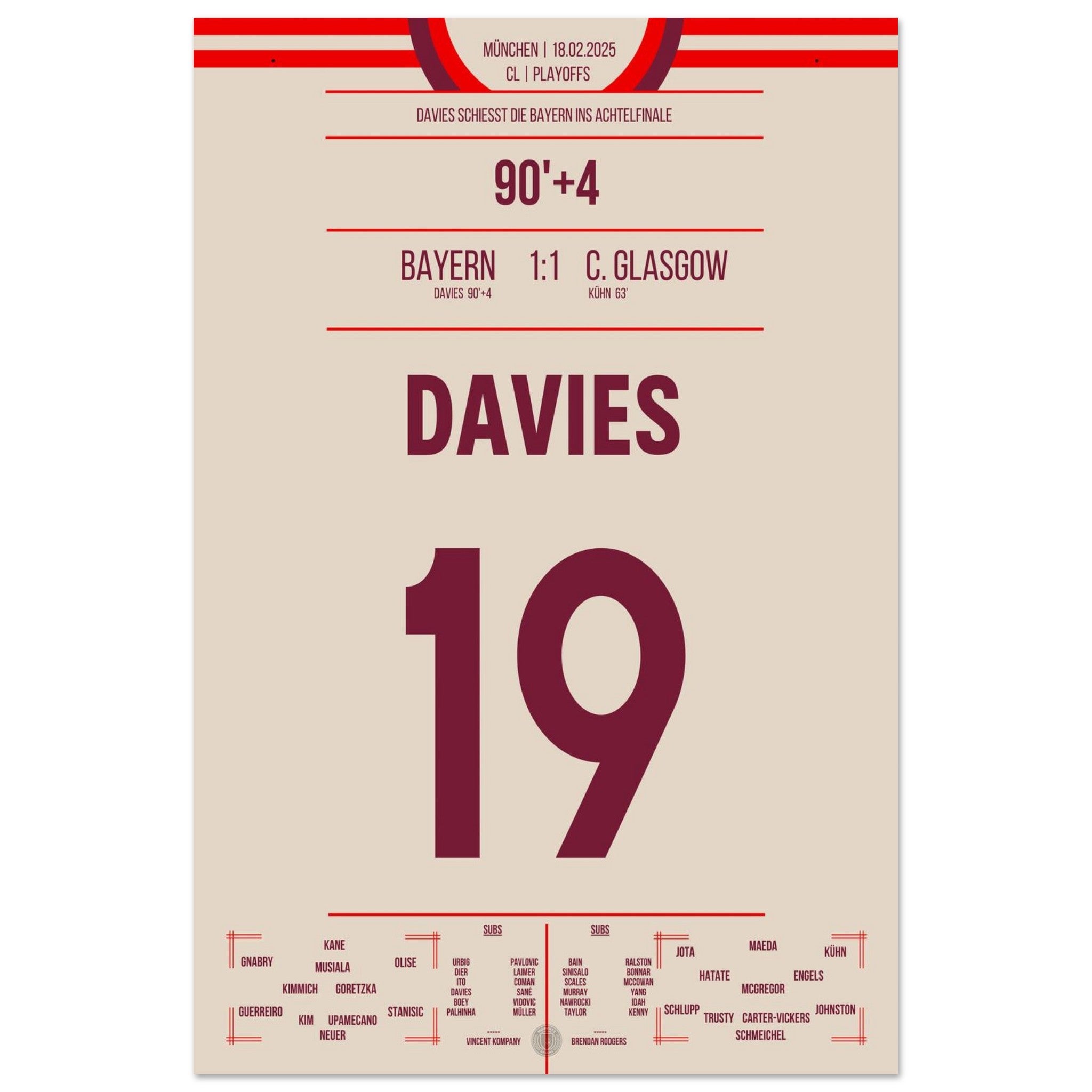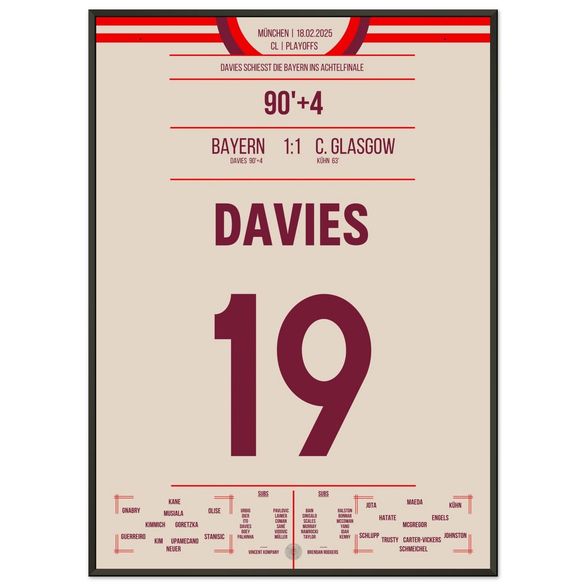 18. Februar 2025 – Bayern vs. Celtic 1:1: In der 94. Minute explodiert die Arena – Alphonso Davies drückt den Ball in letzter Sekunde über die Linie und rettet Bayern das Remis gegen Celtic. Ein Last-Minute-Moment voller Wille und Wucht – festgehalten auf unserem emotionalen Poster.