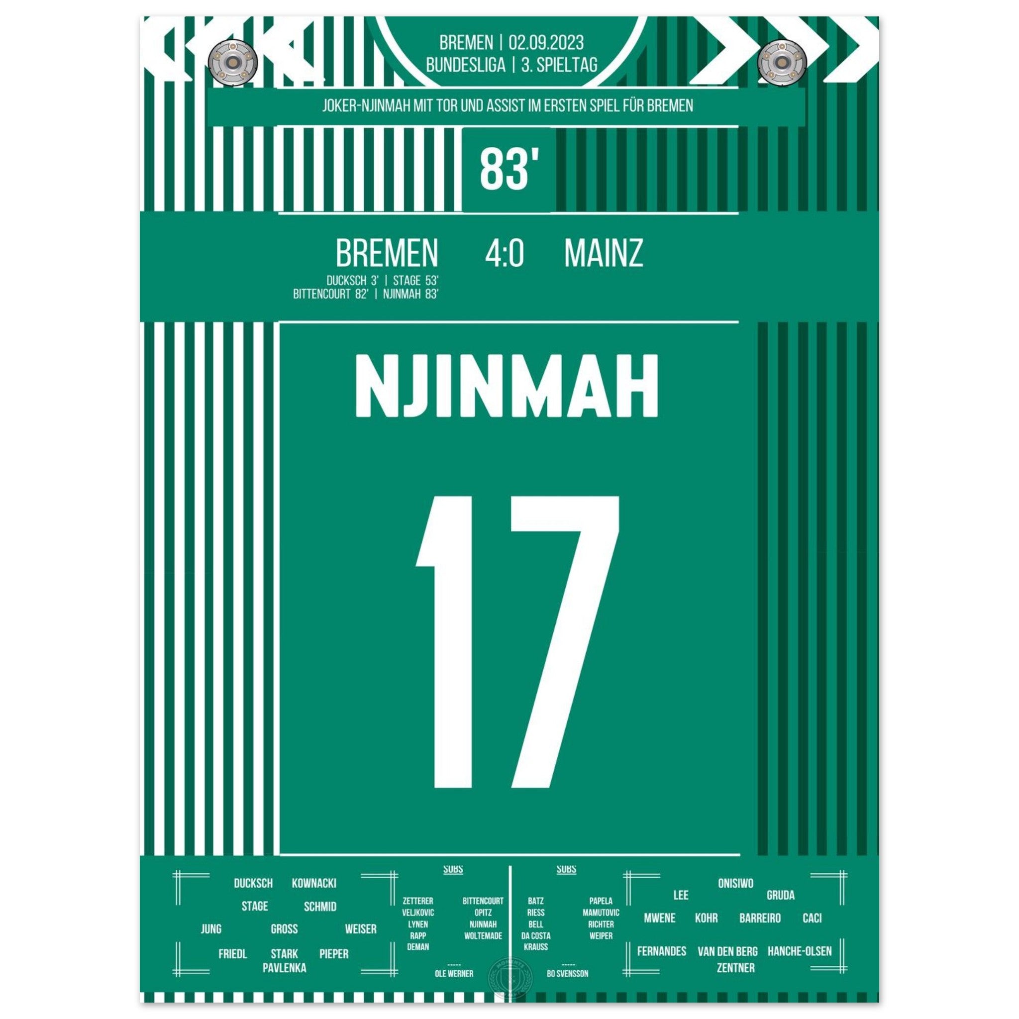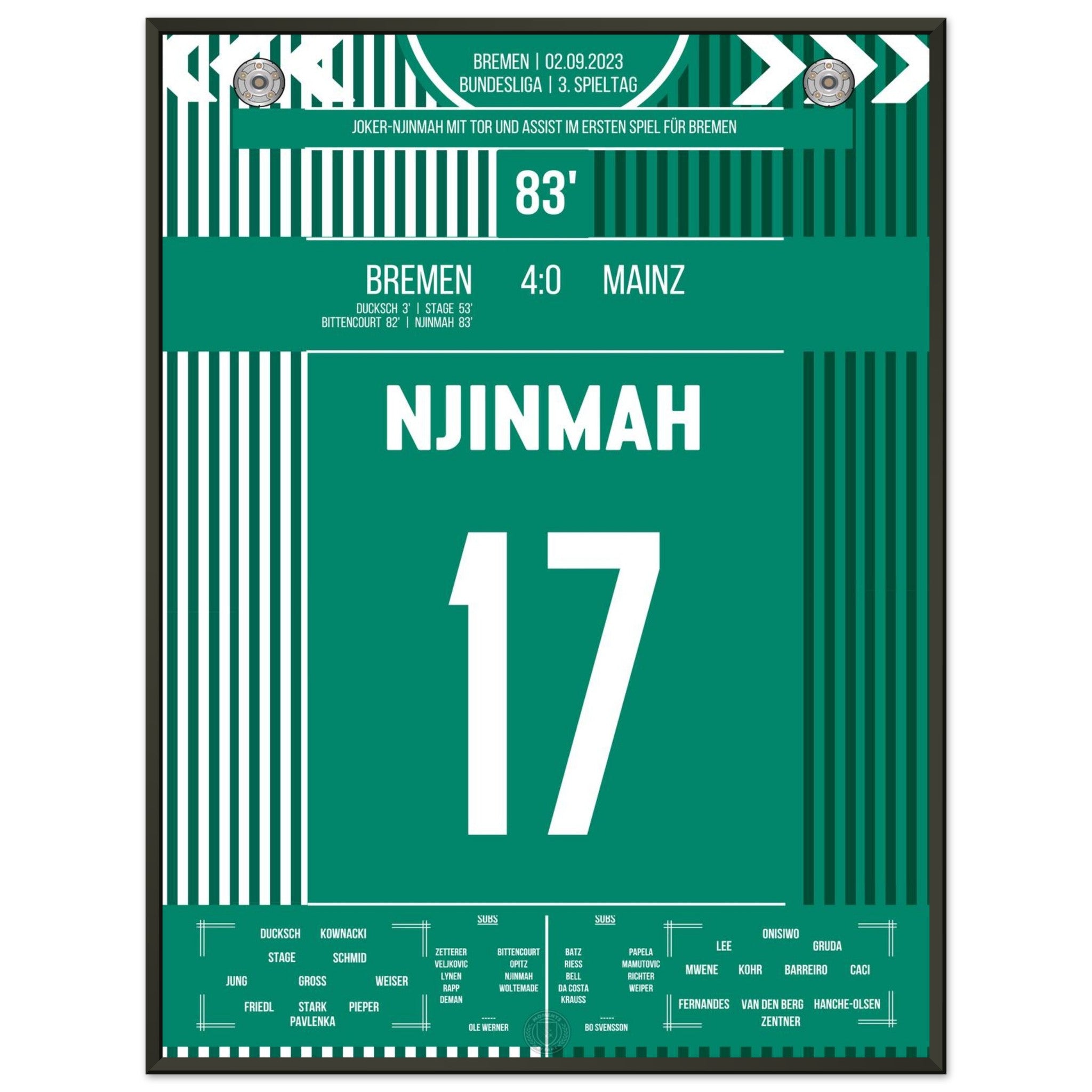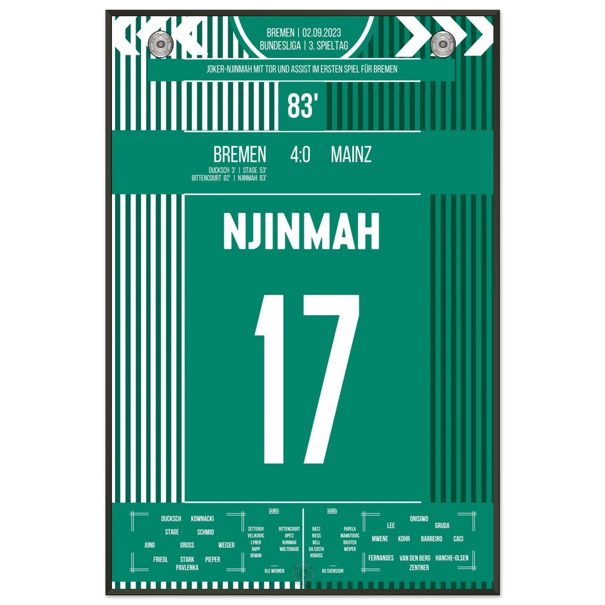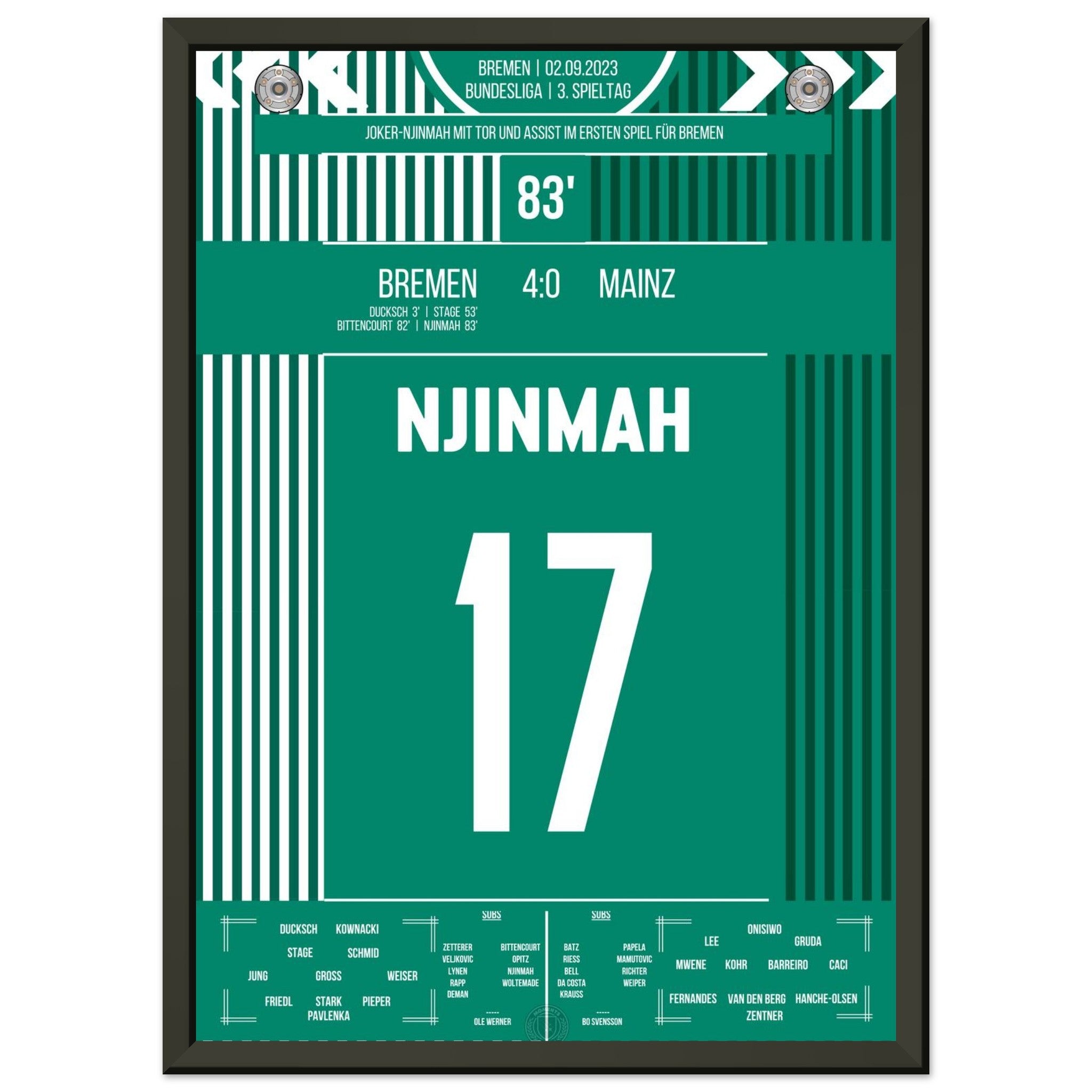 Justin Njinmah betritt in der 76. Minute das Weserstadion – Assist, Tor, Gänsehaut. Ein Debüt wie gemalt, jetzt als Poster für deine Wand.