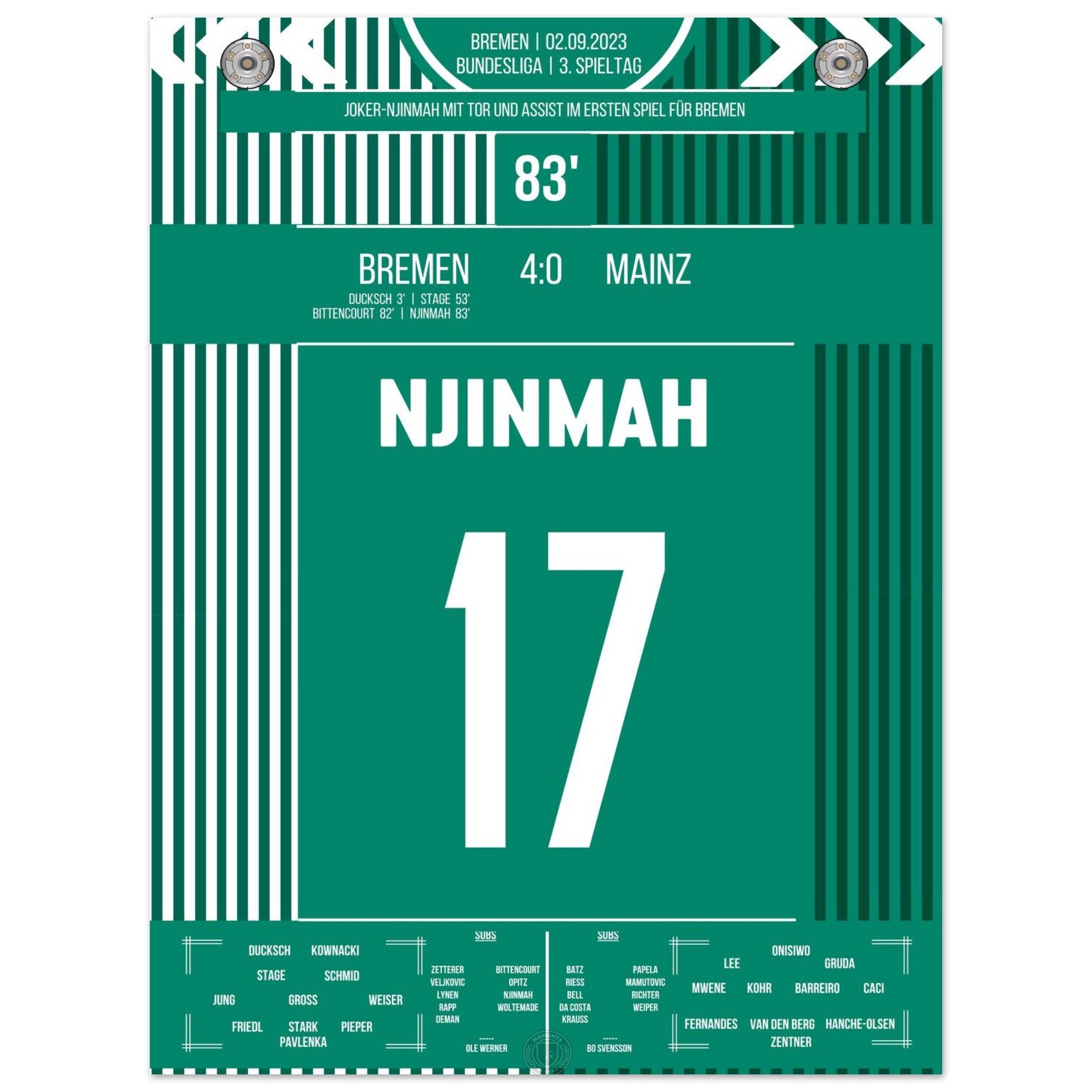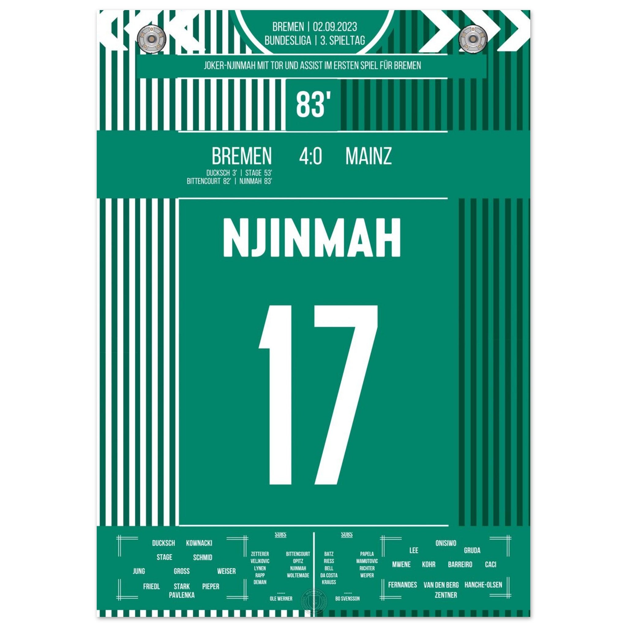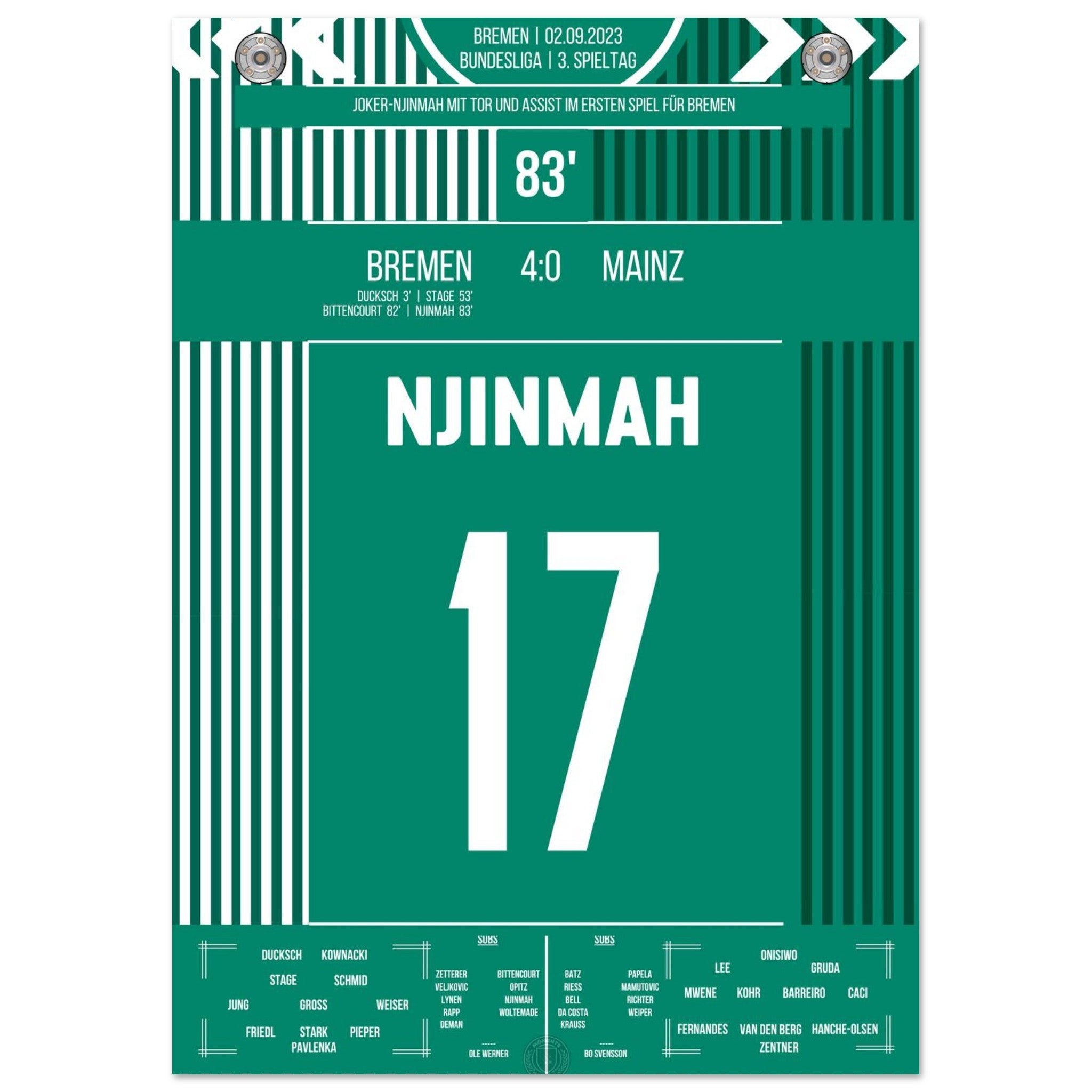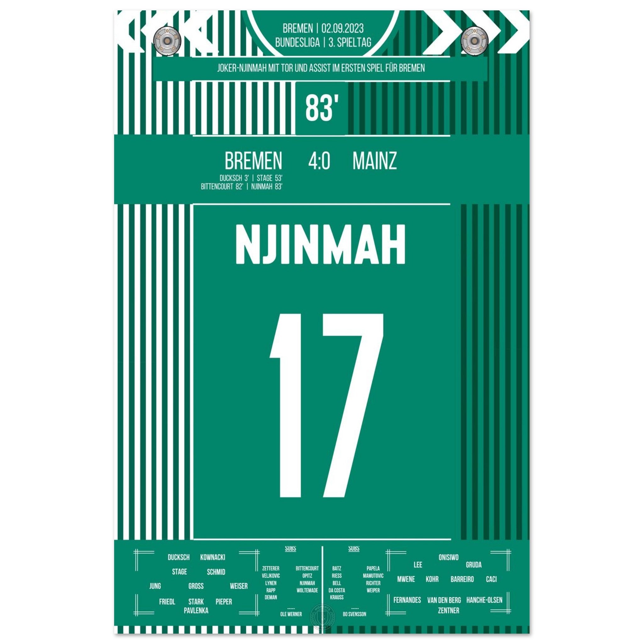 Justin Njinmah betritt in der 76. Minute das Weserstadion – Assist, Tor, Gänsehaut. Ein Debüt wie gemalt, jetzt als Poster für deine Wand.