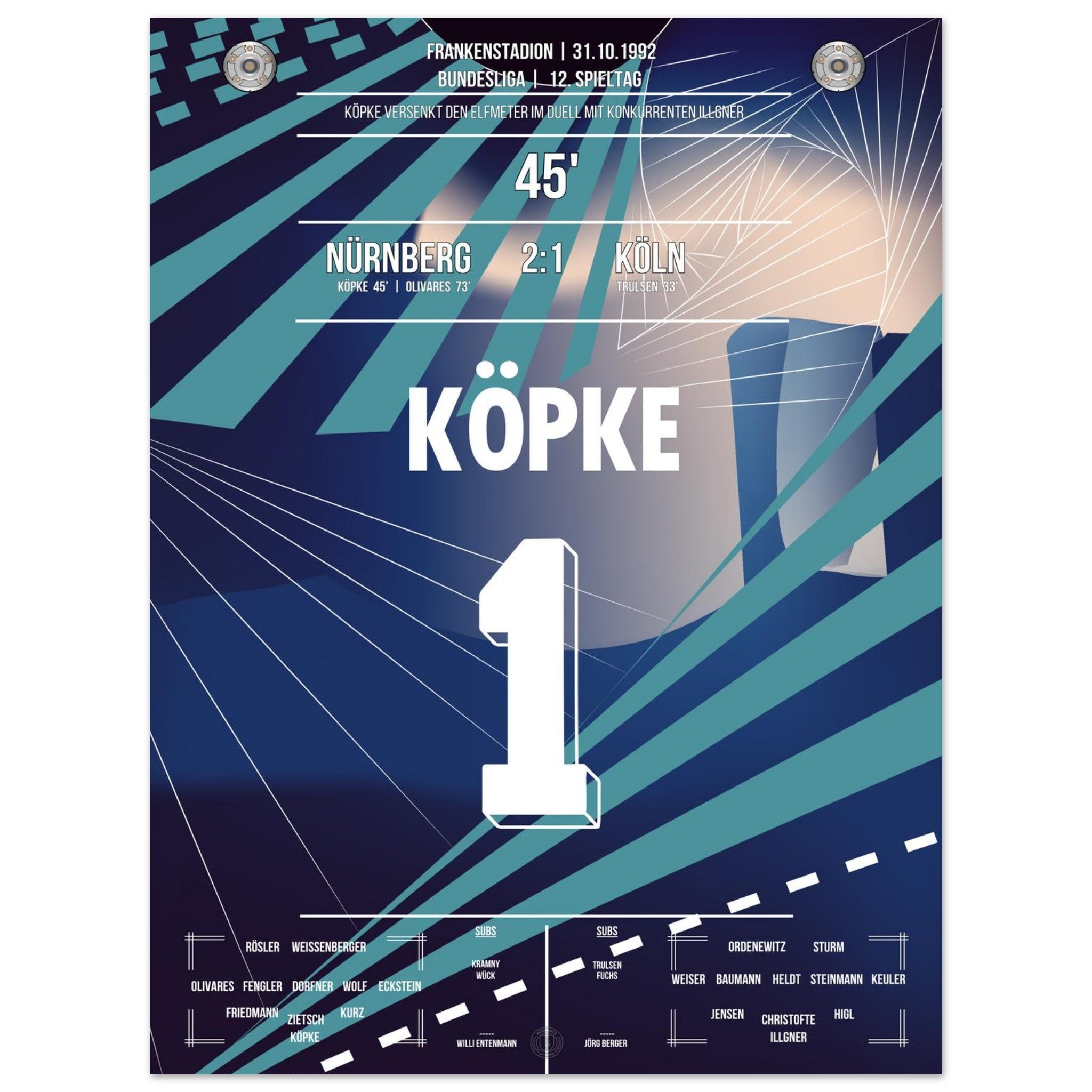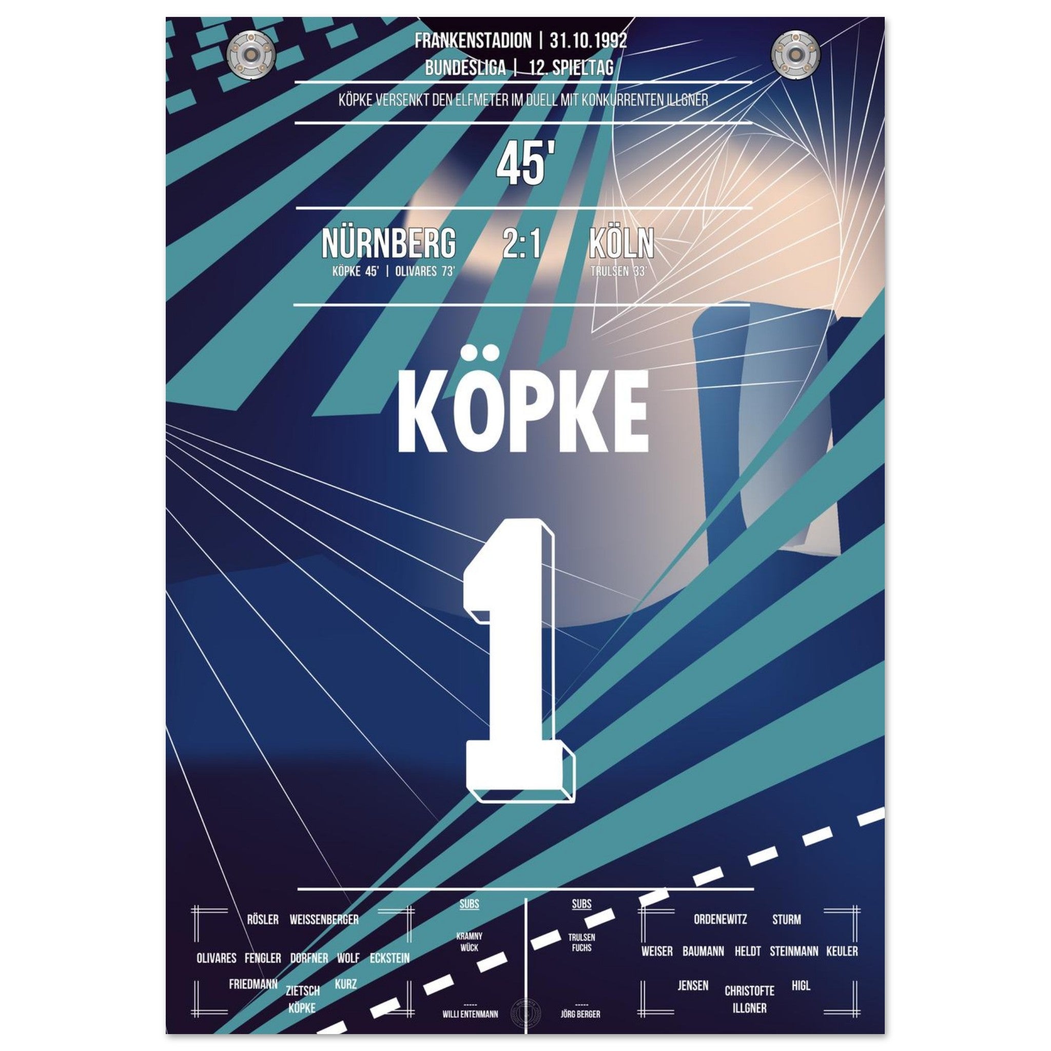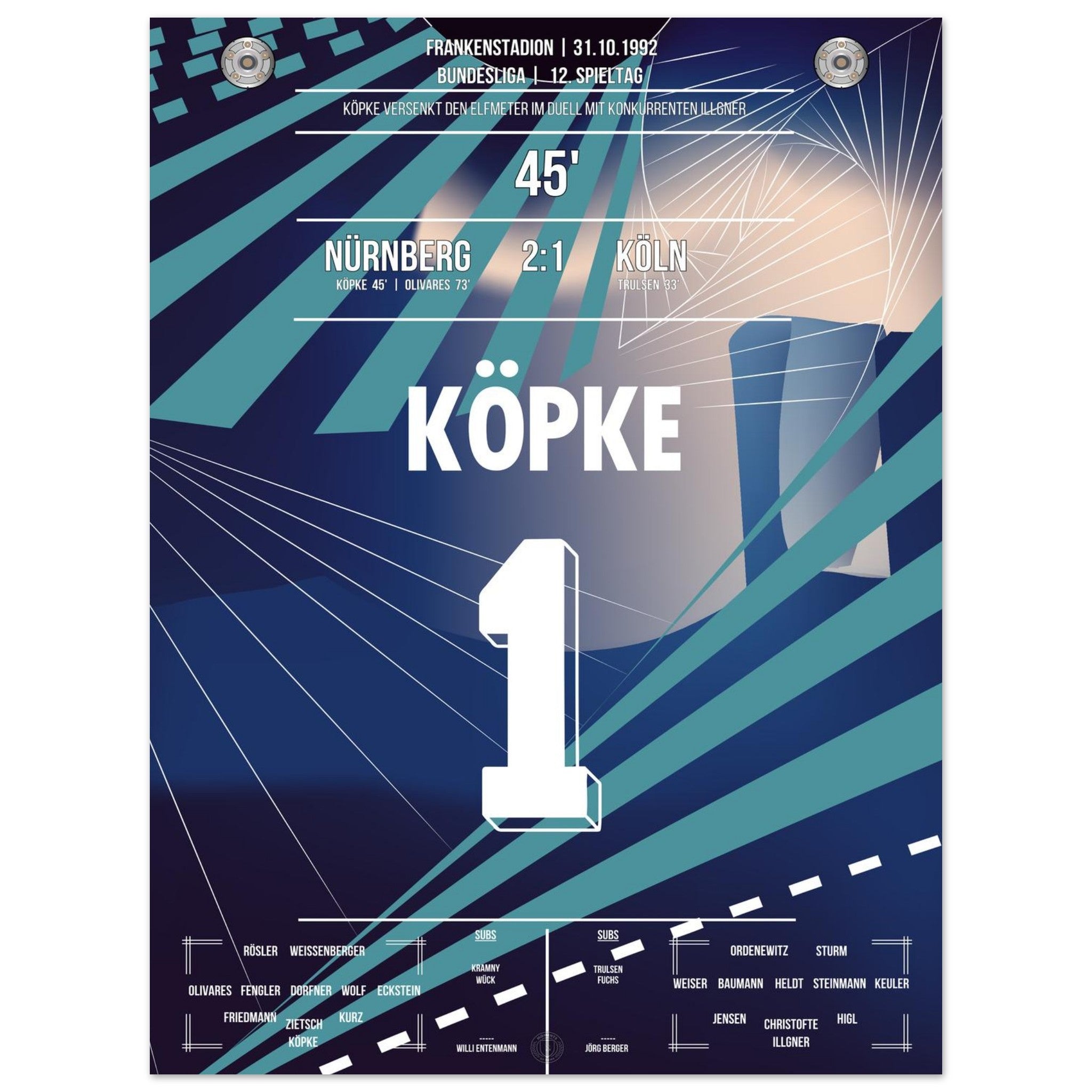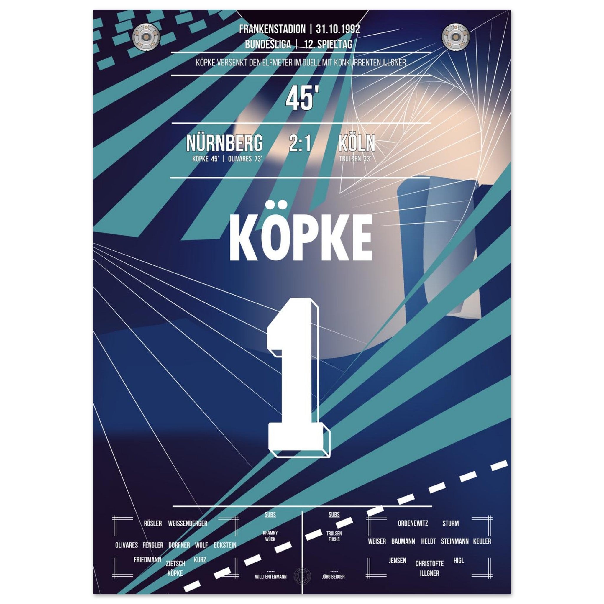 24. Oktober 1992 – Nürnberg vs. Köln 2:1: Club-Keeper Andreas Köpke tritt selbstbewusst zum Elfmeter an und verwandelt eiskalt gegen Konkurrent und Nationaltorwart Bodo Illgner – ein seltener Treffer eines Torhüters, der Nürnberg zum Sieg führt. Ein besonderer Moment in einer legendären Karriere. Unser Poster hält diesen außergewöhnlichen Augenblick fest.
