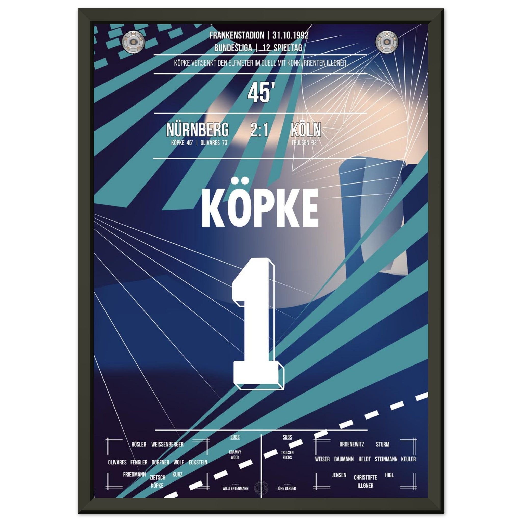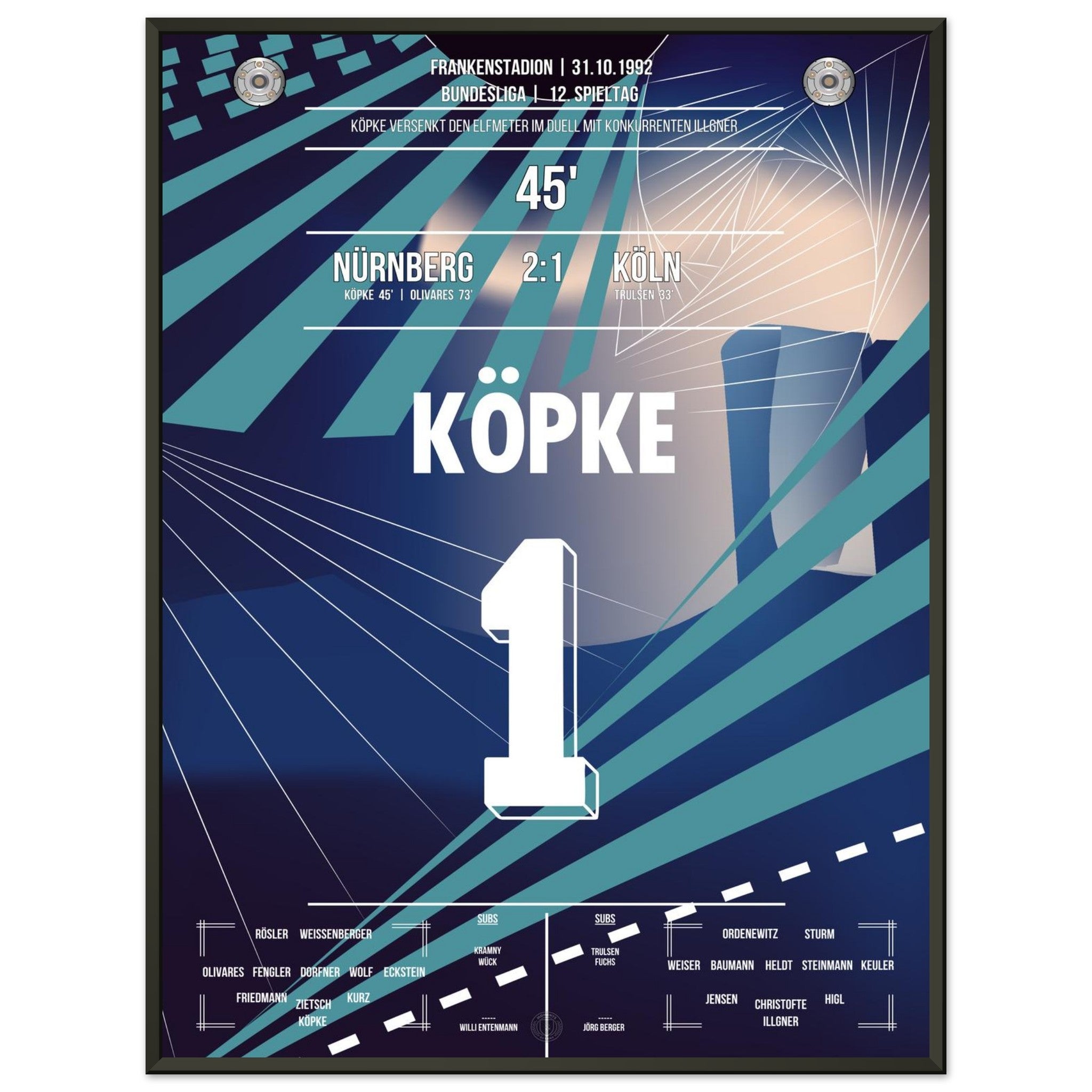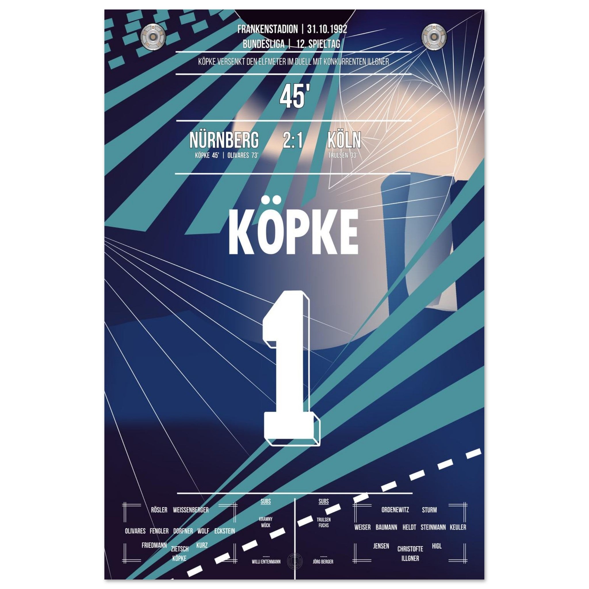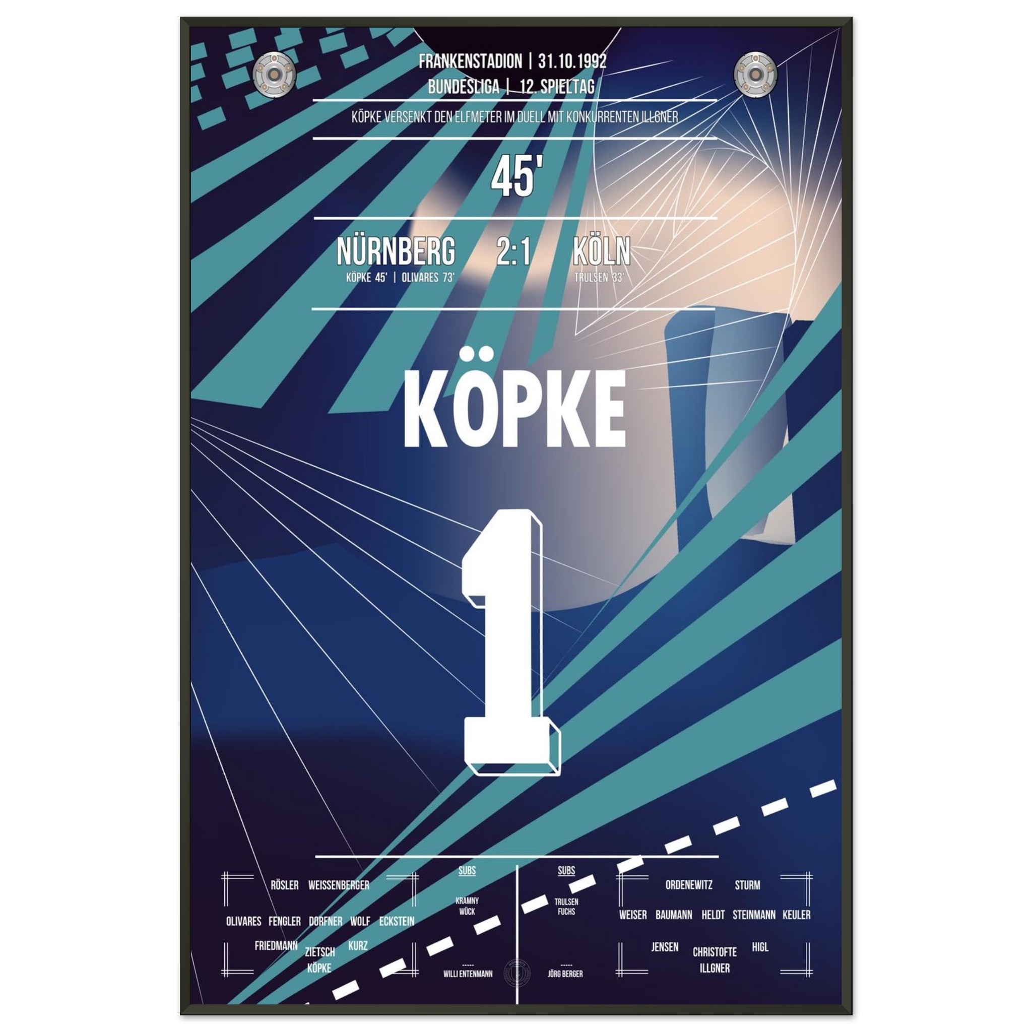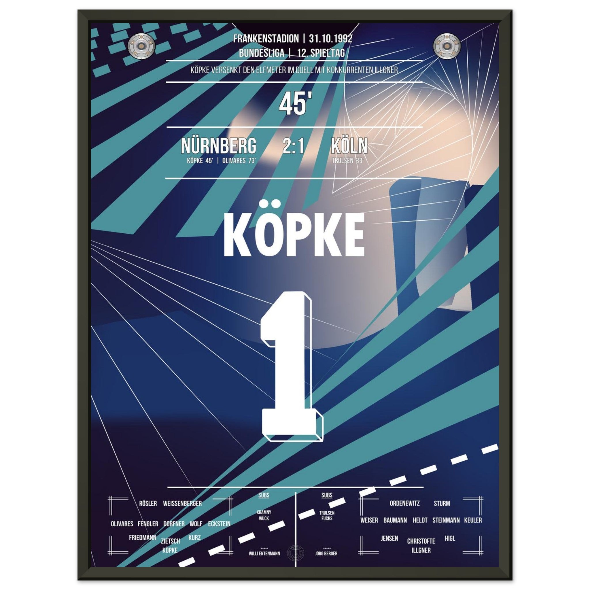 24. Oktober 1992 – Nürnberg vs. Köln 2:1: Club-Keeper Andreas Köpke tritt selbstbewusst zum Elfmeter an und verwandelt eiskalt gegen Konkurrent und Nationaltorwart Bodo Illgner – ein seltener Treffer eines Torhüters, der Nürnberg zum Sieg führt. Ein besonderer Moment in einer legendären Karriere. Unser Poster hält diesen außergewöhnlichen Augenblick fest.