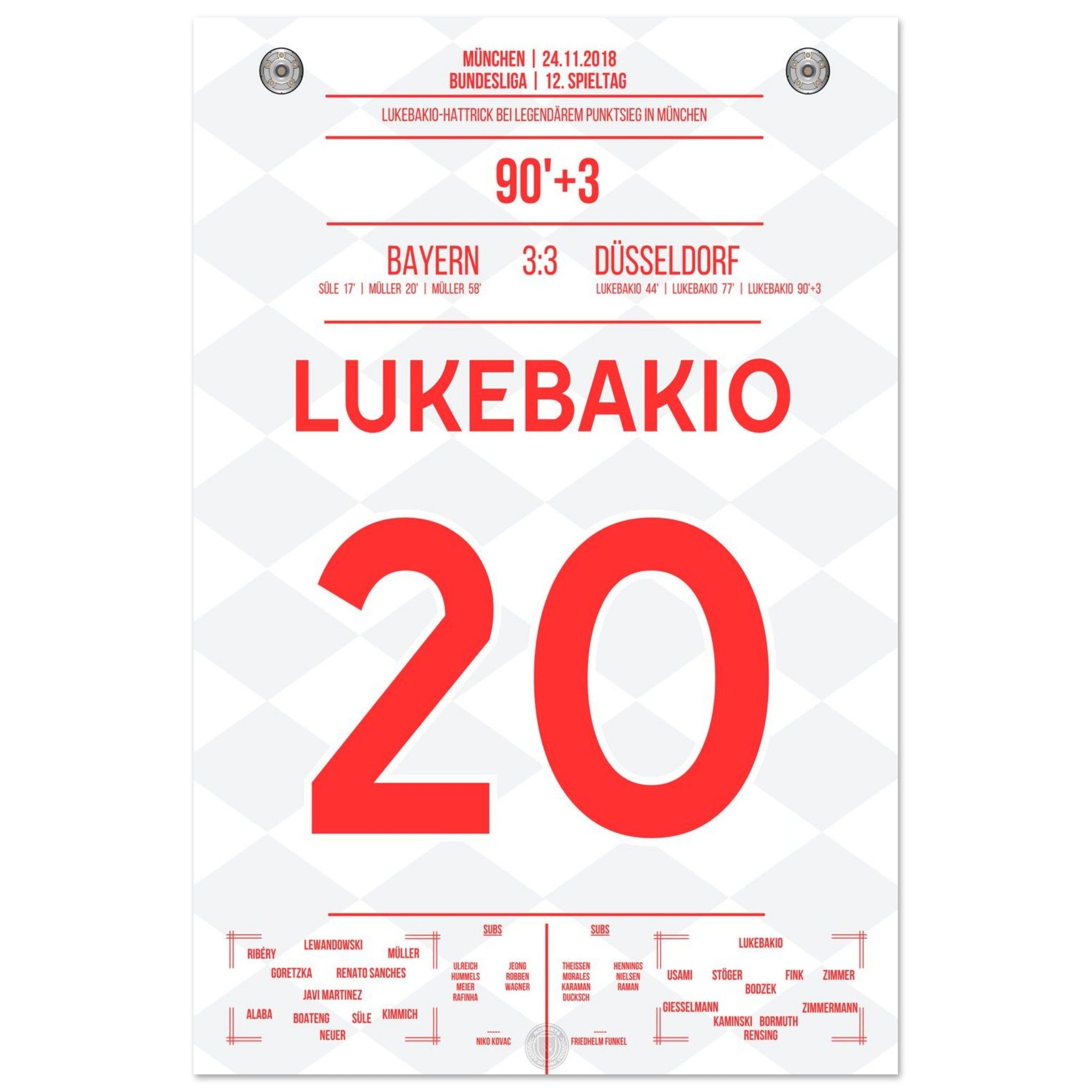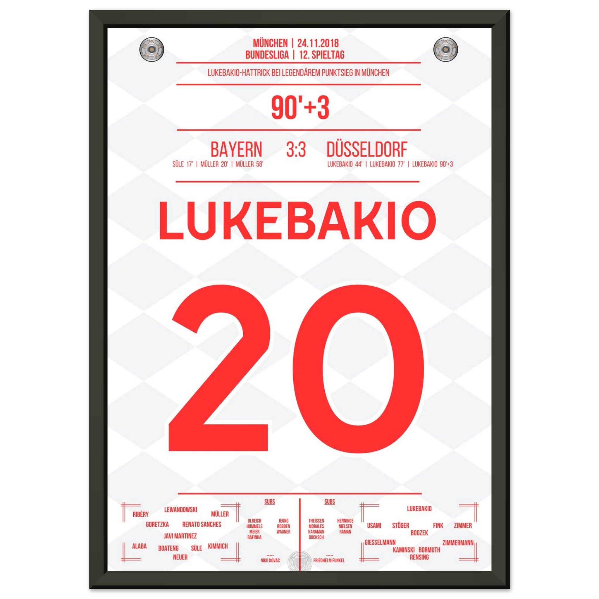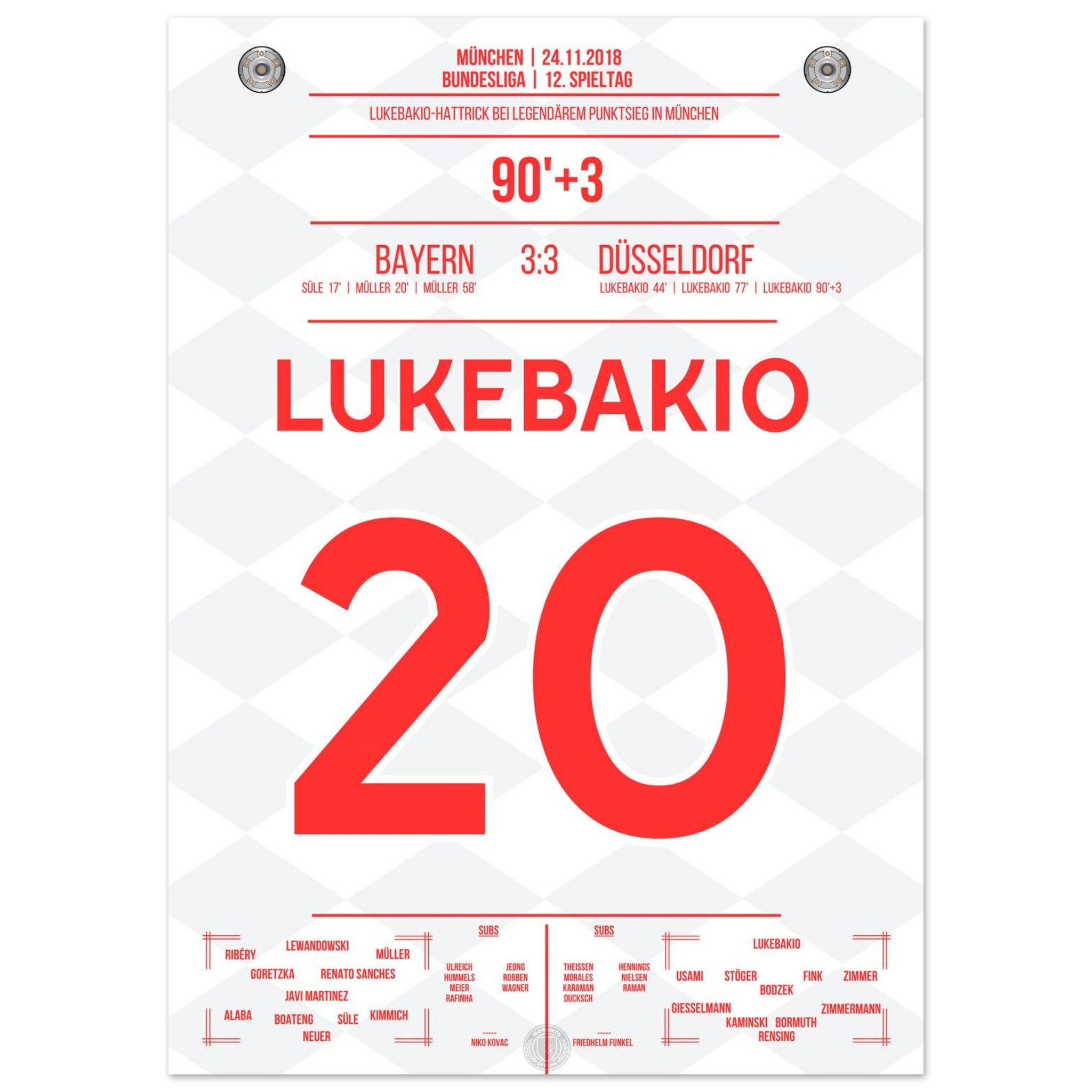 24. November 2018 – Bayern vs. Düsseldorf 3:3: Dodi Lukebakio schockt die Bayern mit einem historischen Hattrick in München und rettet Düsseldorf sensationell einen Punkt. Als erster Spieler überhaupt trifft er dreimal gegen Manuel Neuer in einem Bundesliga-Spiel. Unser Poster feiert diesen unvergesslichen Auftritt des Bayern-Schrecks.