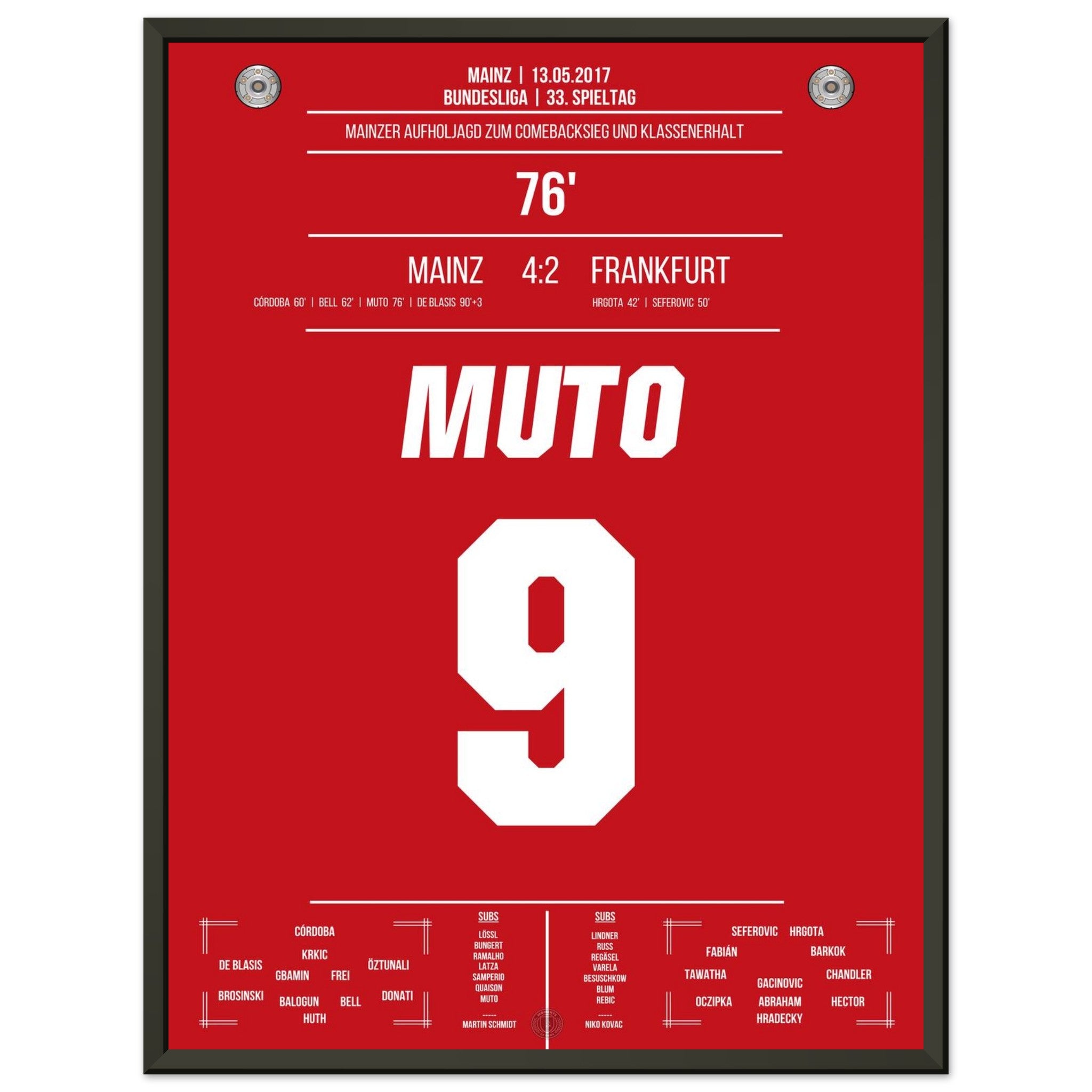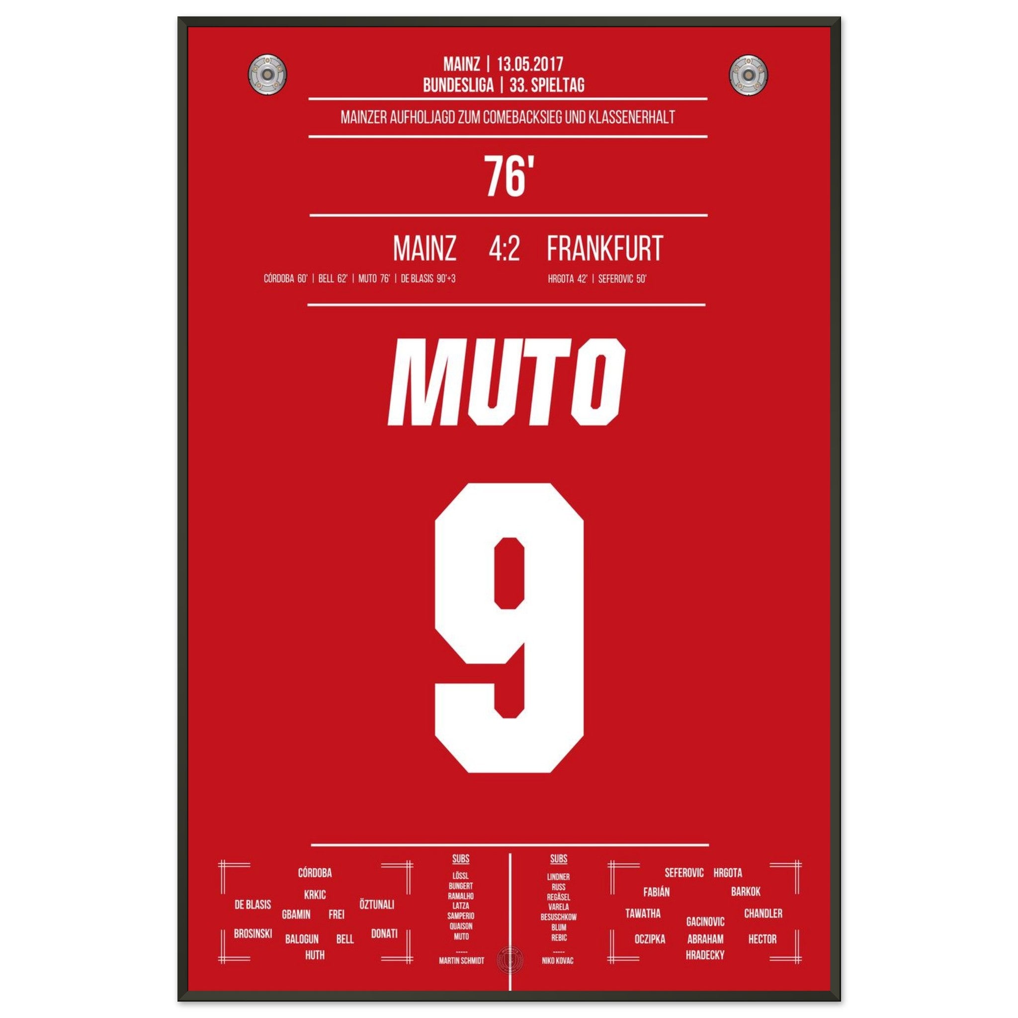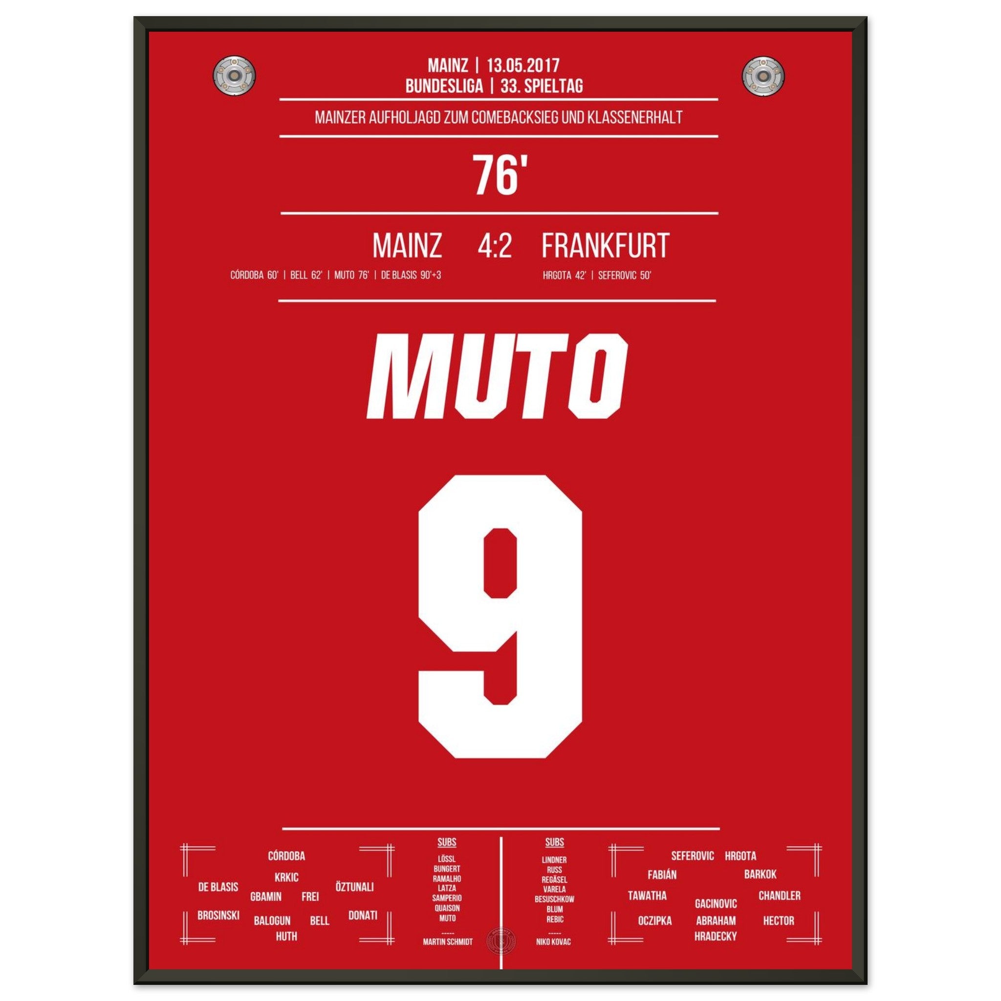 13. Mai 2017 – Mainz vs. Frankfurt 4:2: Nach einem 0:2-Rückstand dreht Mainz das Spiel im Abstiegskampf mit unbändigem Willen – und Muto trifft in der 76. Minute zum 3:2 und bringt das Stadion zum Beben. Sein Tor krönt die emotionale Aufholjagd und bringt Mainz auf Klassenerhaltskurs. Unser Poster hält diesen entscheidenden Moment voller Leidenschaft fest.