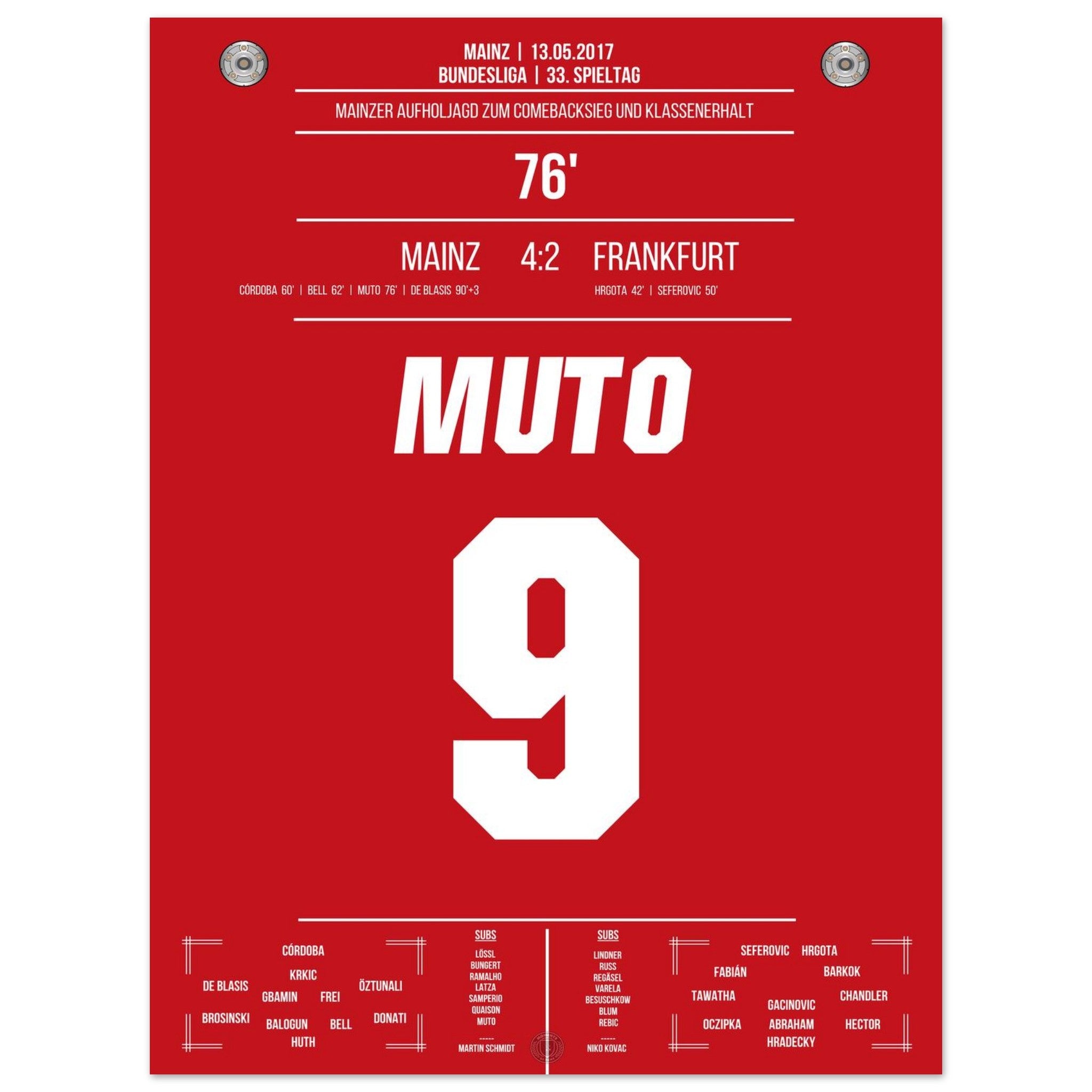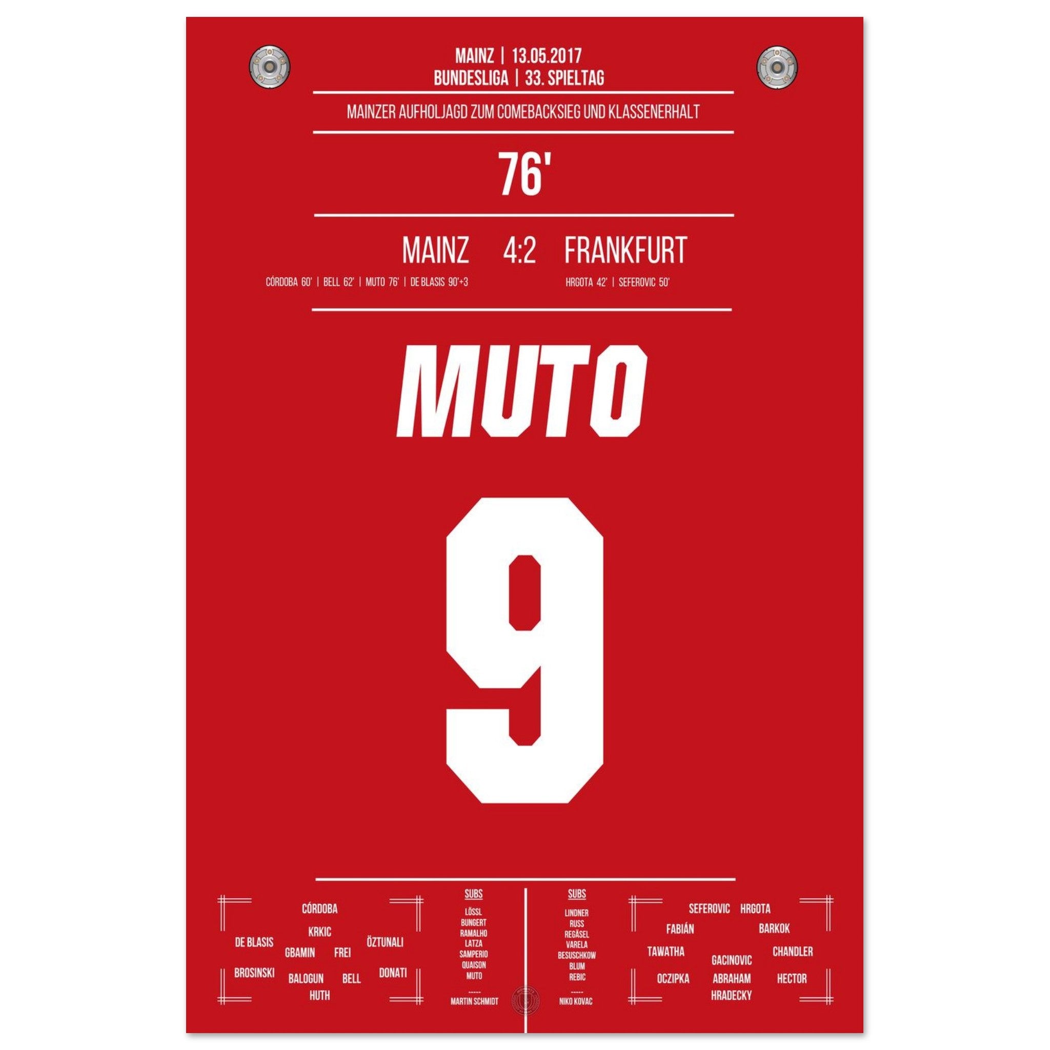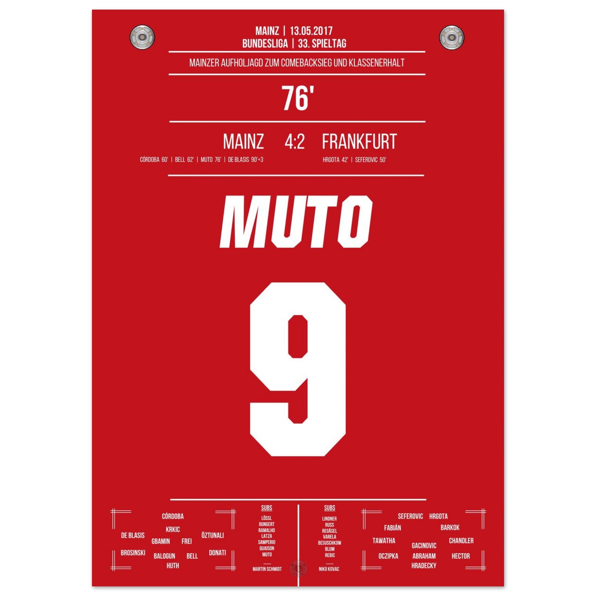 13. Mai 2017 – Mainz vs. Frankfurt 4:2: Nach einem 0:2-Rückstand dreht Mainz das Spiel im Abstiegskampf mit unbändigem Willen – und Muto trifft in der 76. Minute zum 3:2 und bringt das Stadion zum Beben. Sein Tor krönt die emotionale Aufholjagd und bringt Mainz auf Klassenerhaltskurs. Unser Poster hält diesen entscheidenden Moment voller Leidenschaft fest.