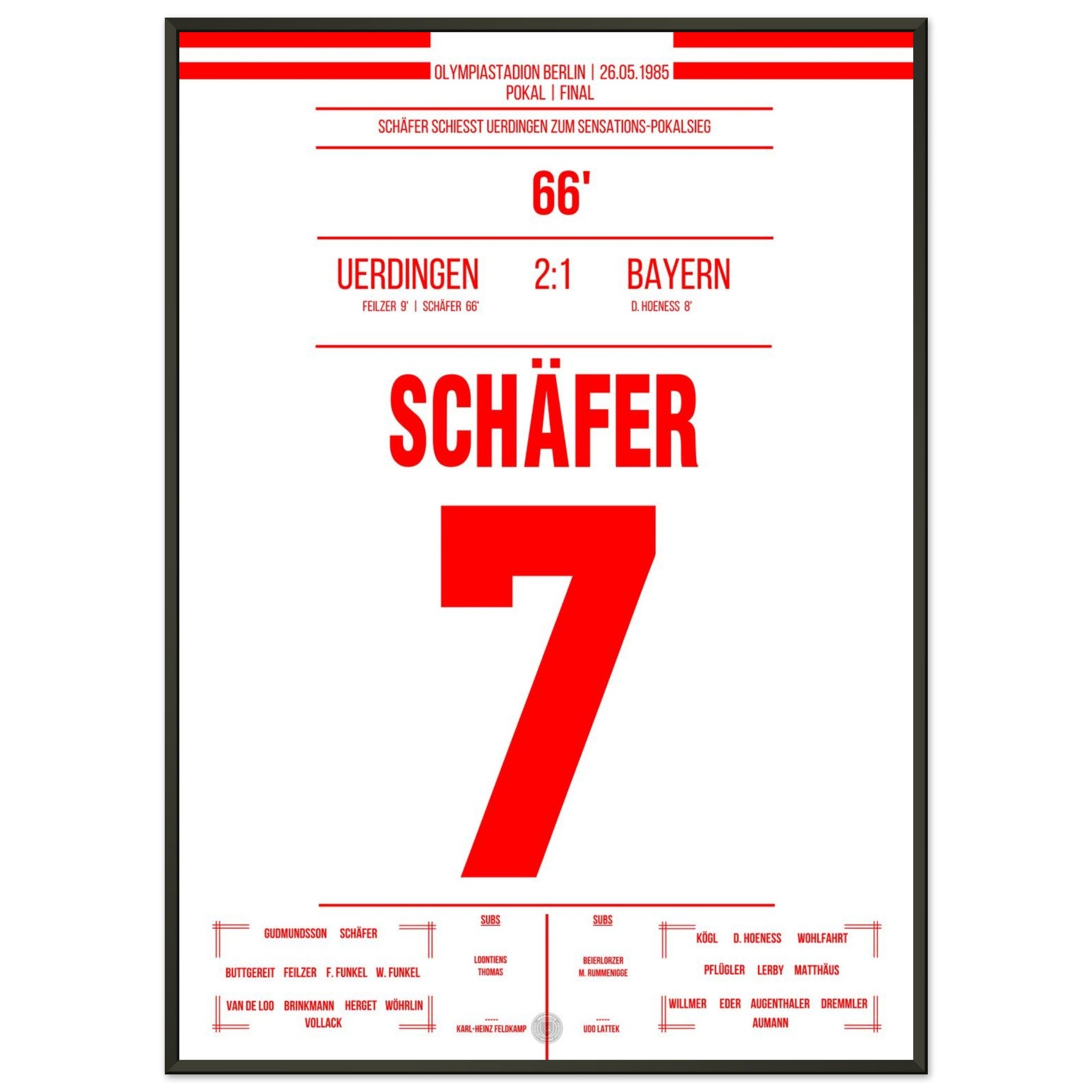26. Mai 1985 – Bayern vs. Uerdingen 1:2: Es ist das Wunder von Berlin: Bayer Uerdingen dreht das Pokalfinale gegen den haushohen Favoriten aus München und schreibt Fußballgeschichte. Nach Rückstand kämpft sich das Team leidenschaftlich zurück – Wolfgang Schäfer gleicht aus, und in der 81. Minute sorgt Horst Feilzer mit seinem Treffer für Ekstase. Uerdingen krönt sich zum Pokalsieger und bringt die Schale mit an den Niederrhein. Unser Poster feiert diesen unvergesslichen Triumph im Olympiastadion.