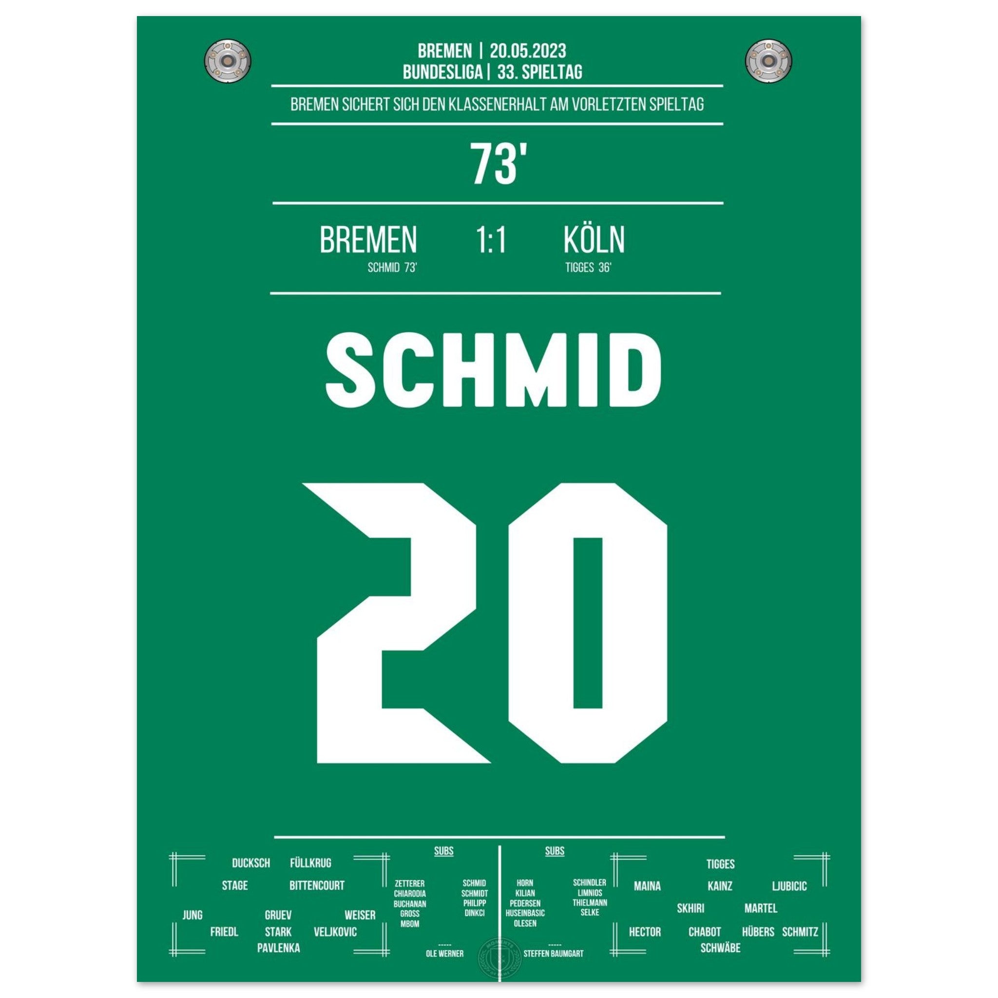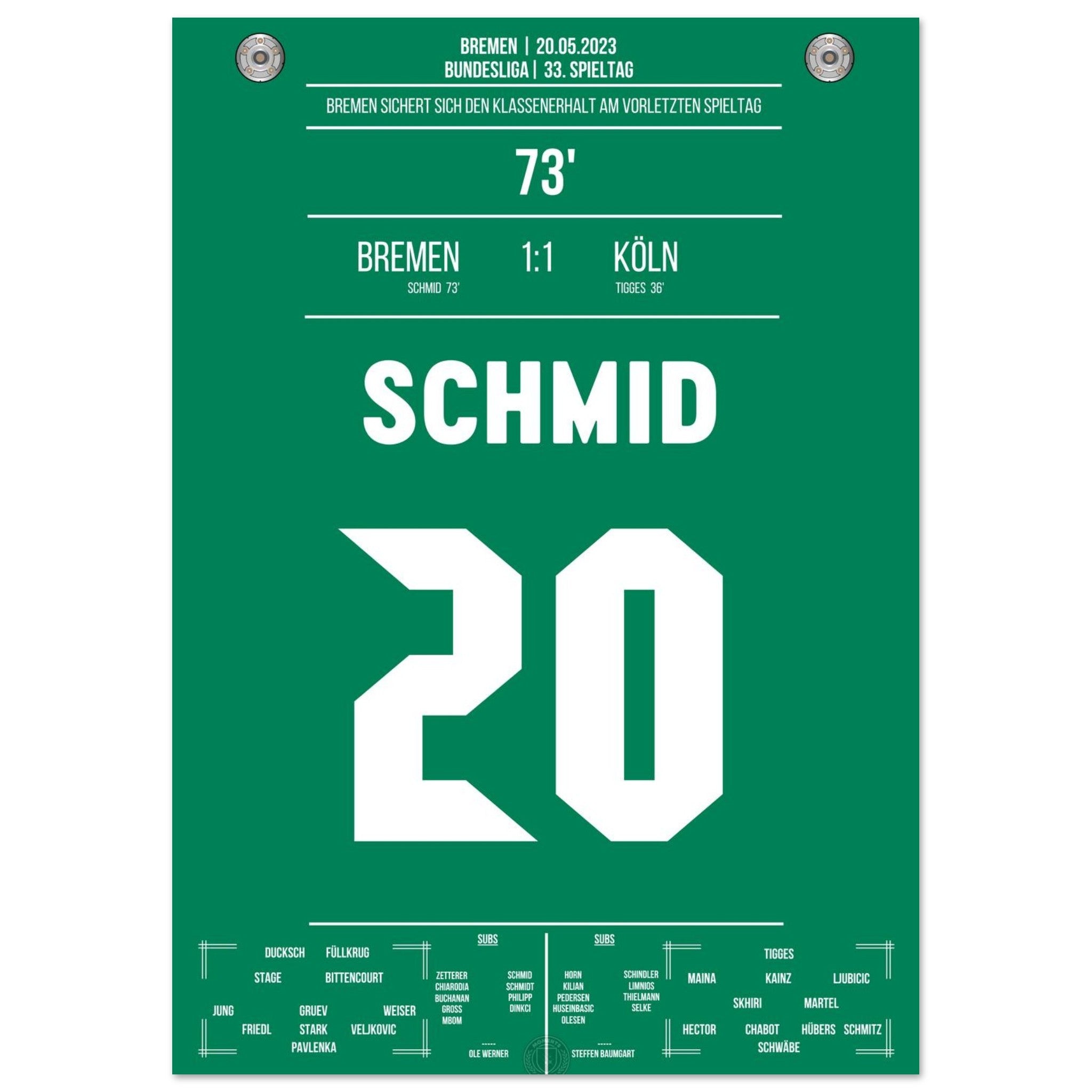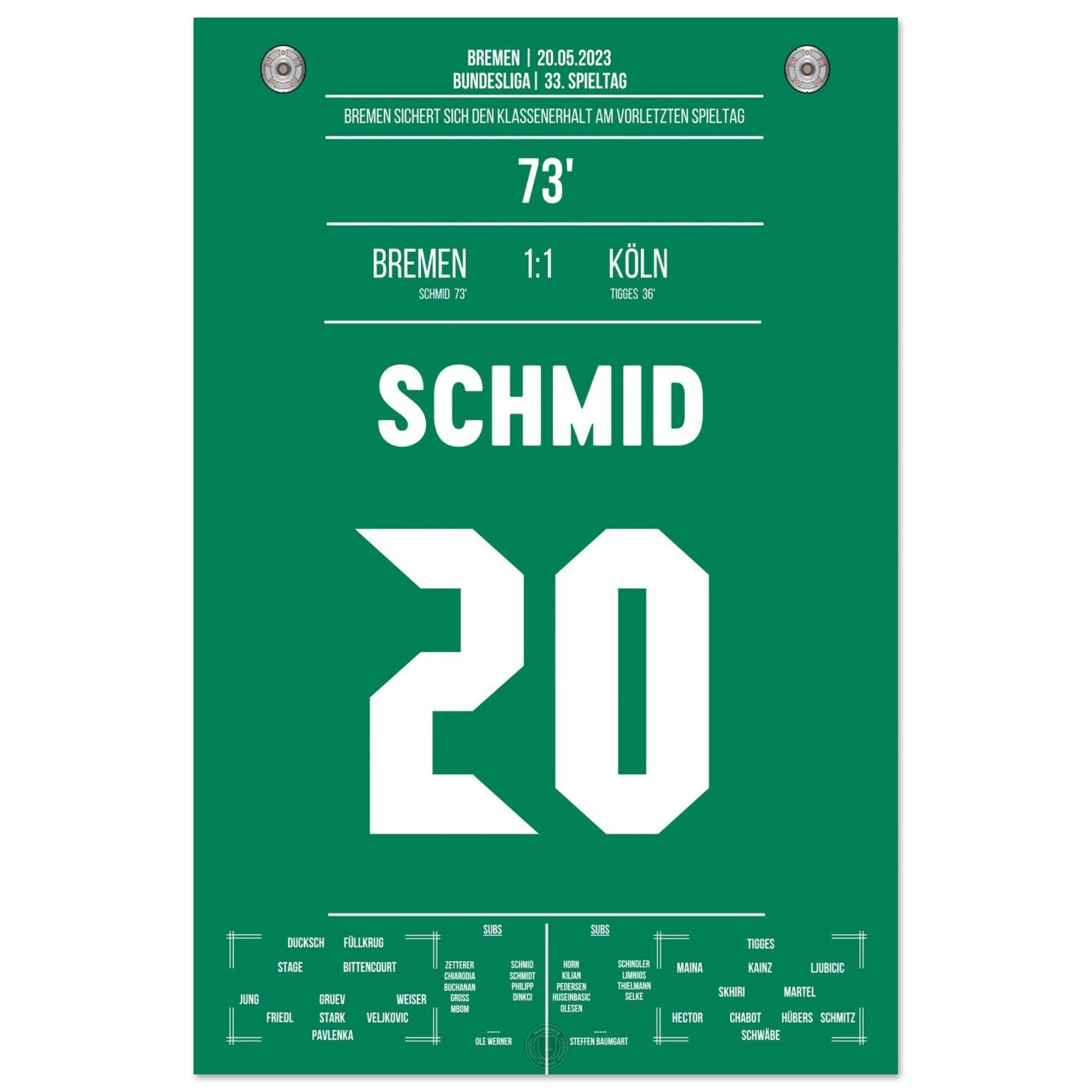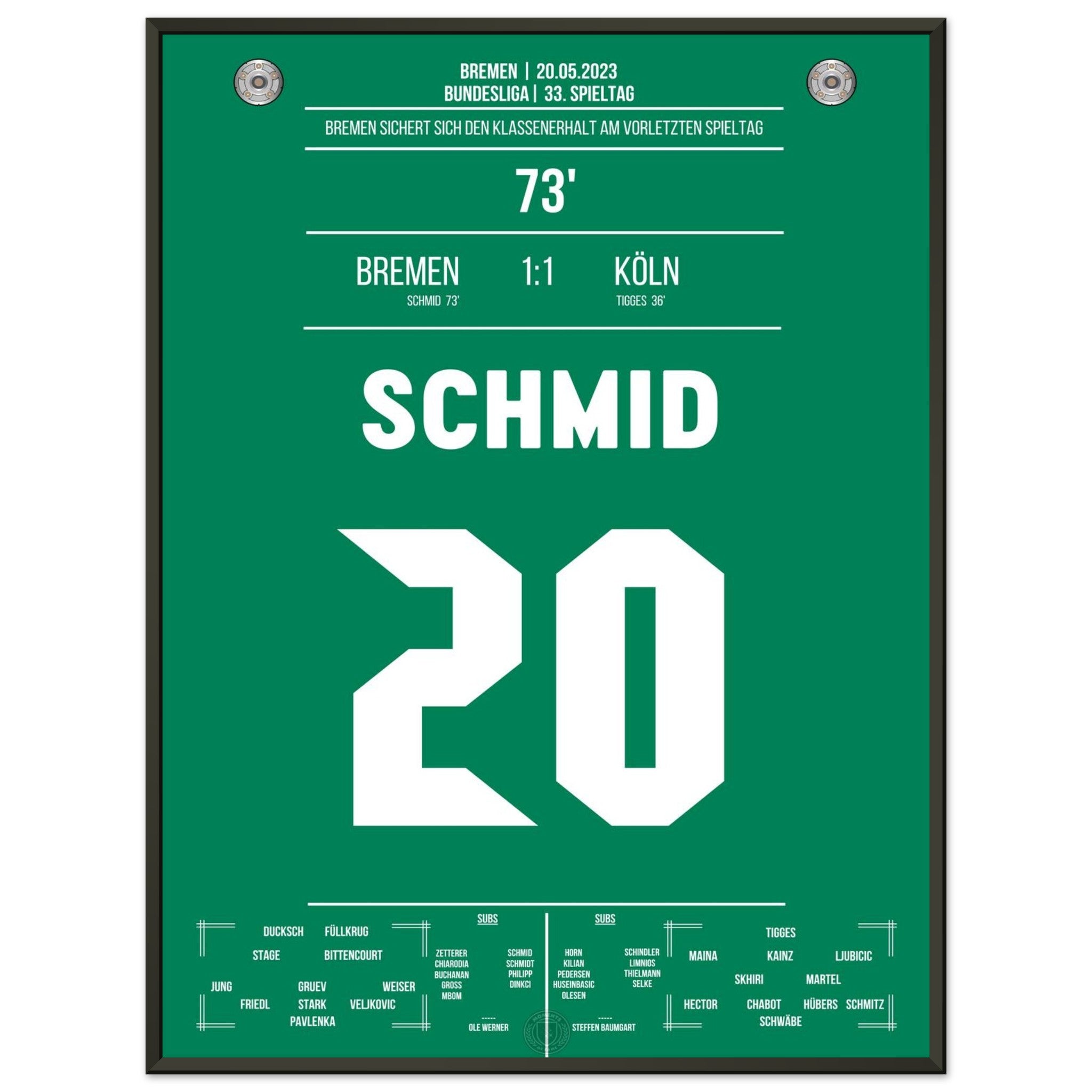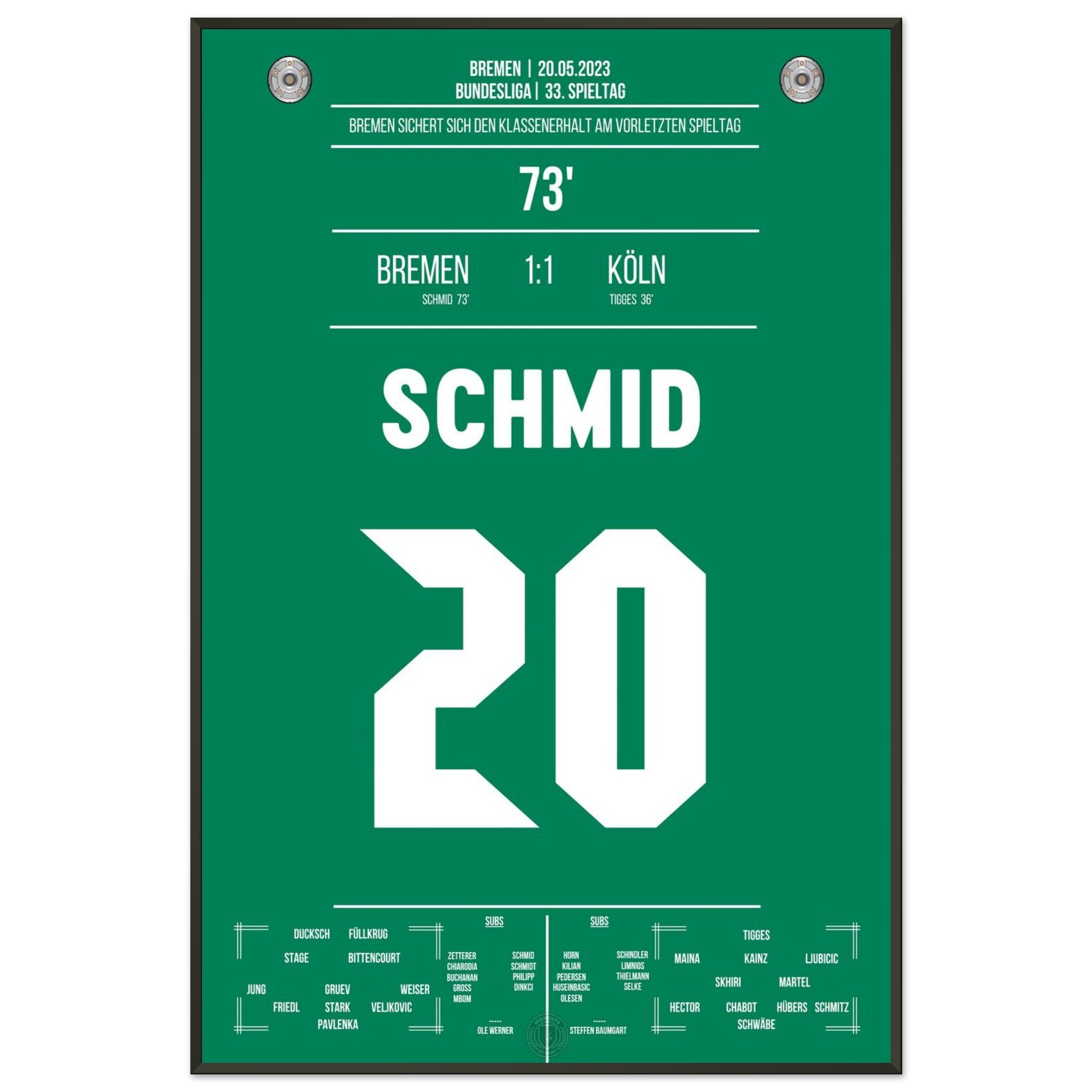 Schmid trifft in der 73. Minute und sichert Bremen den wichtigen Sieg zum Klassenerhalt. Ein entscheidender Treffer, der die Basis für die weitere Bundesliga-Zugehörigkeit legt – großer Jubel bei den Fans!