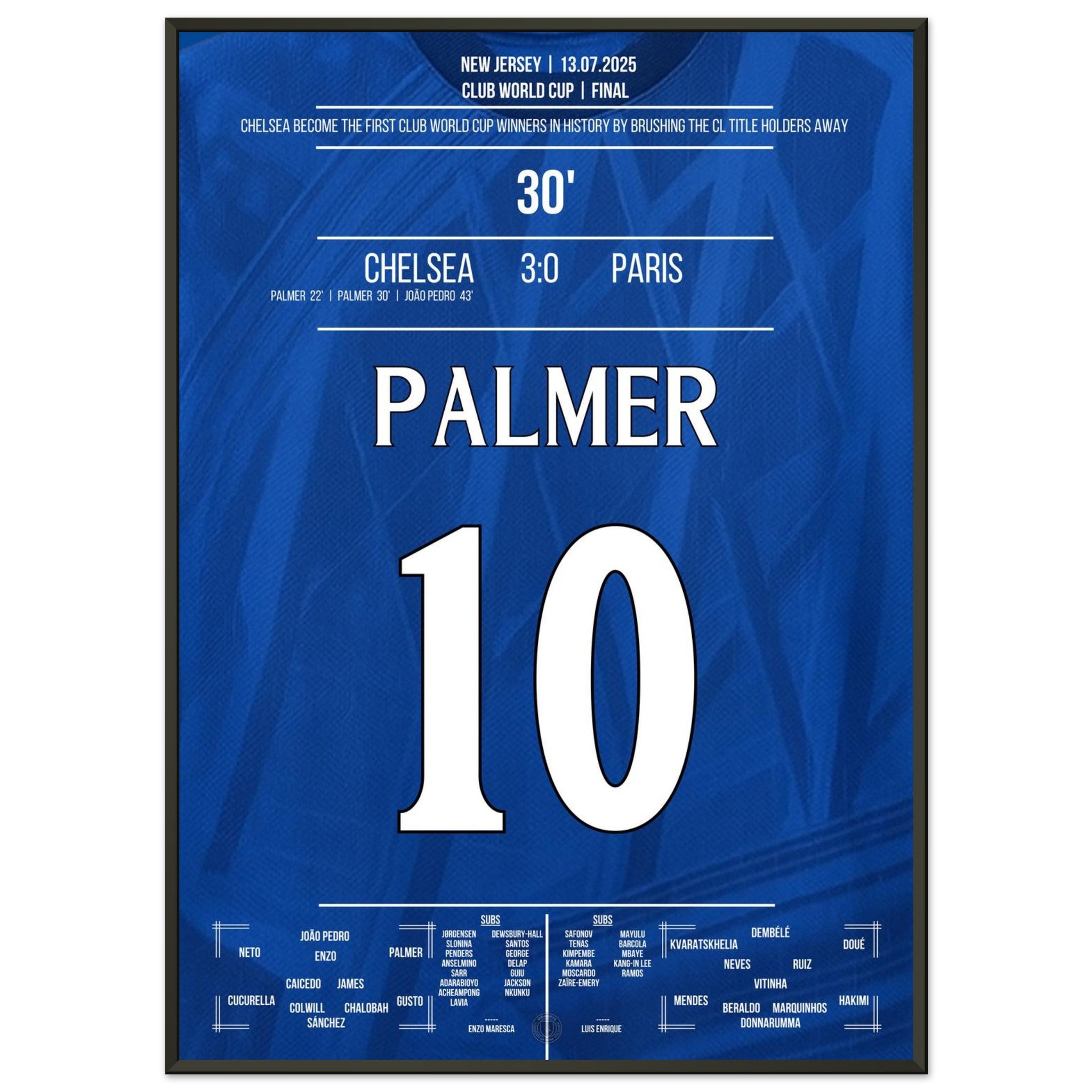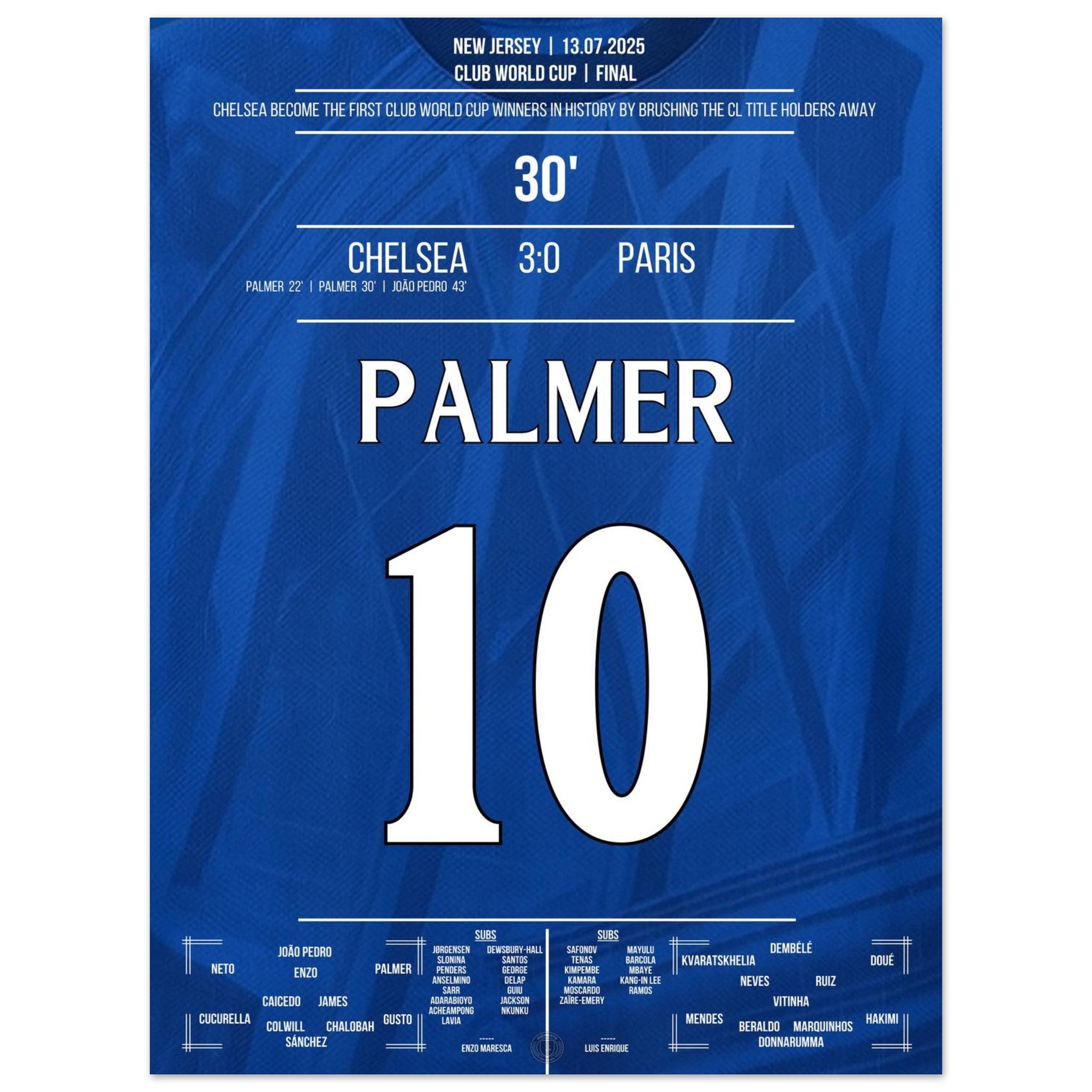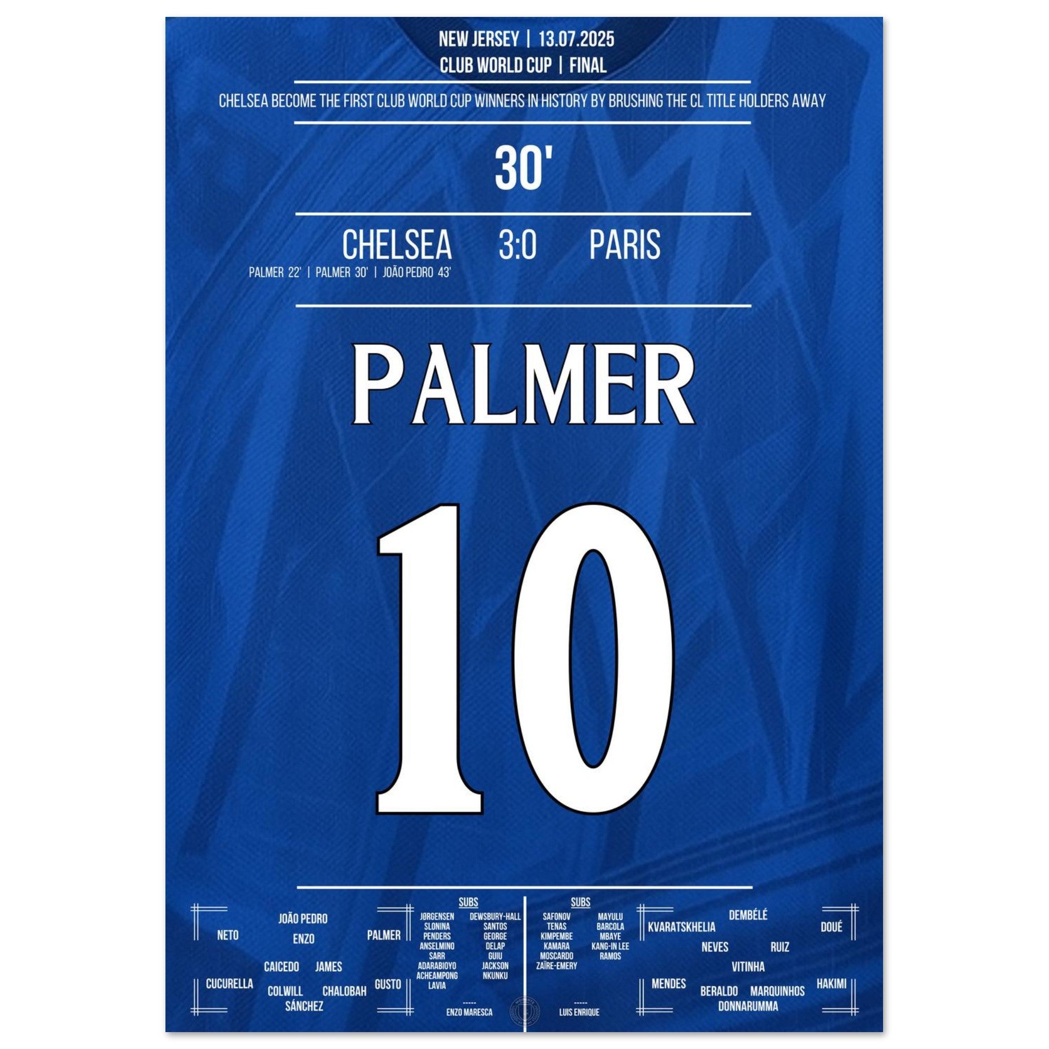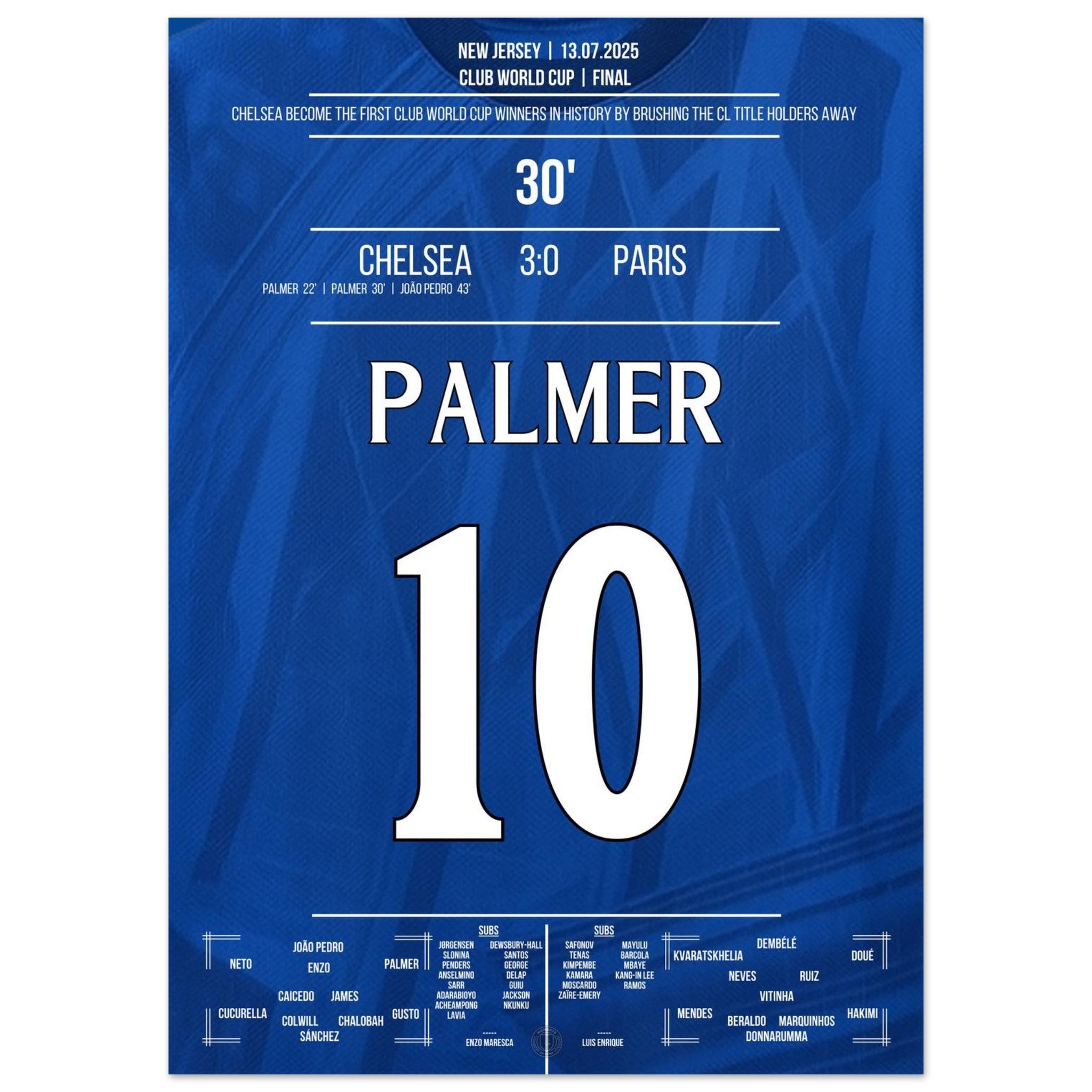 Cole Palmer – eiskalt im größten Moment. Mit seinem entscheidenden Treffer im Finale gegen Paris führt er Chelsea zum Titel und schreibt Geschichte: als erster Sieger überhaupt in der Klub-WM. Dieses Poster fängt den Moment ein, in dem ein junger Spieler zum Helden wird – und ein Verein zur Legende. Für alle, die an Magie, Timing und blaue Geschichte glauben.