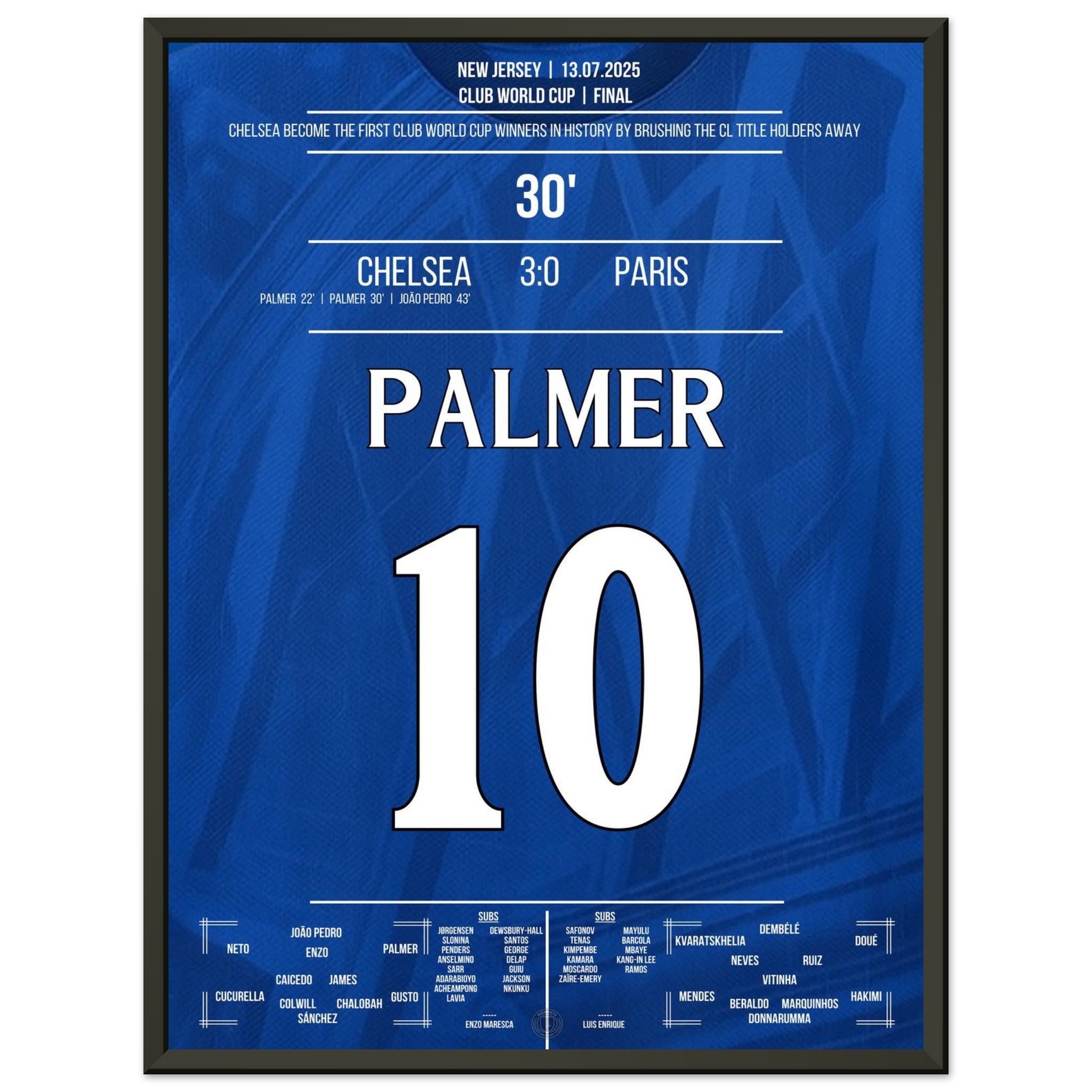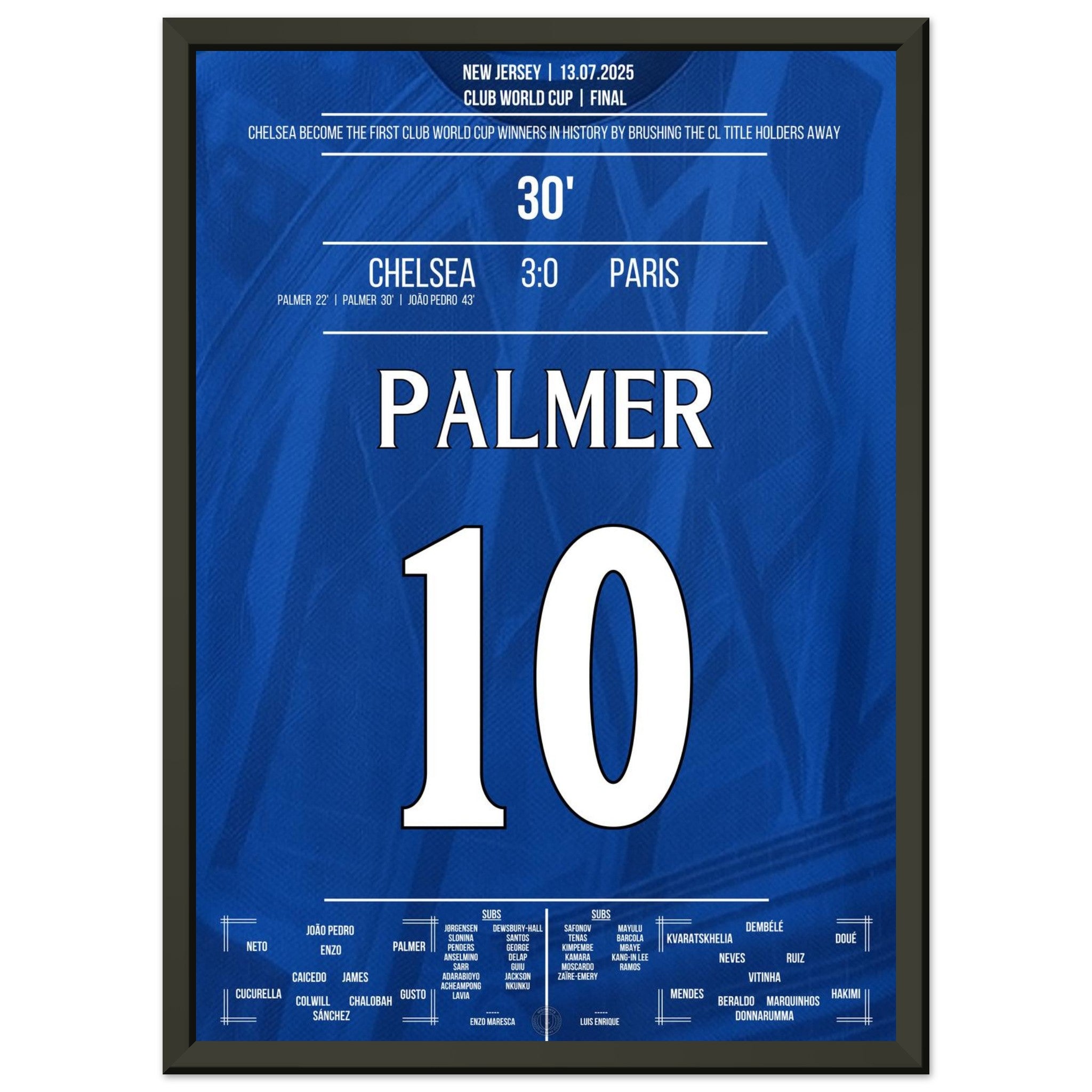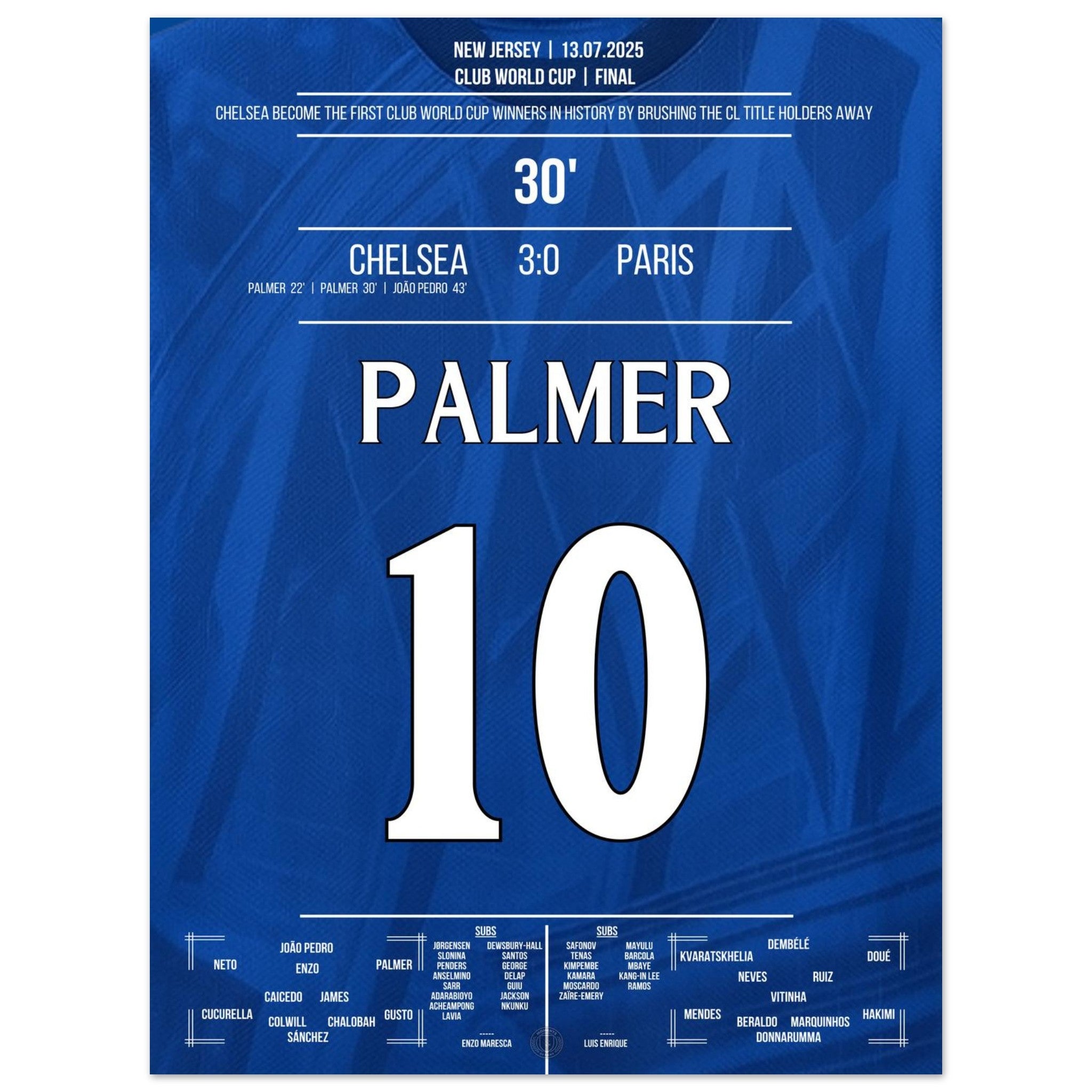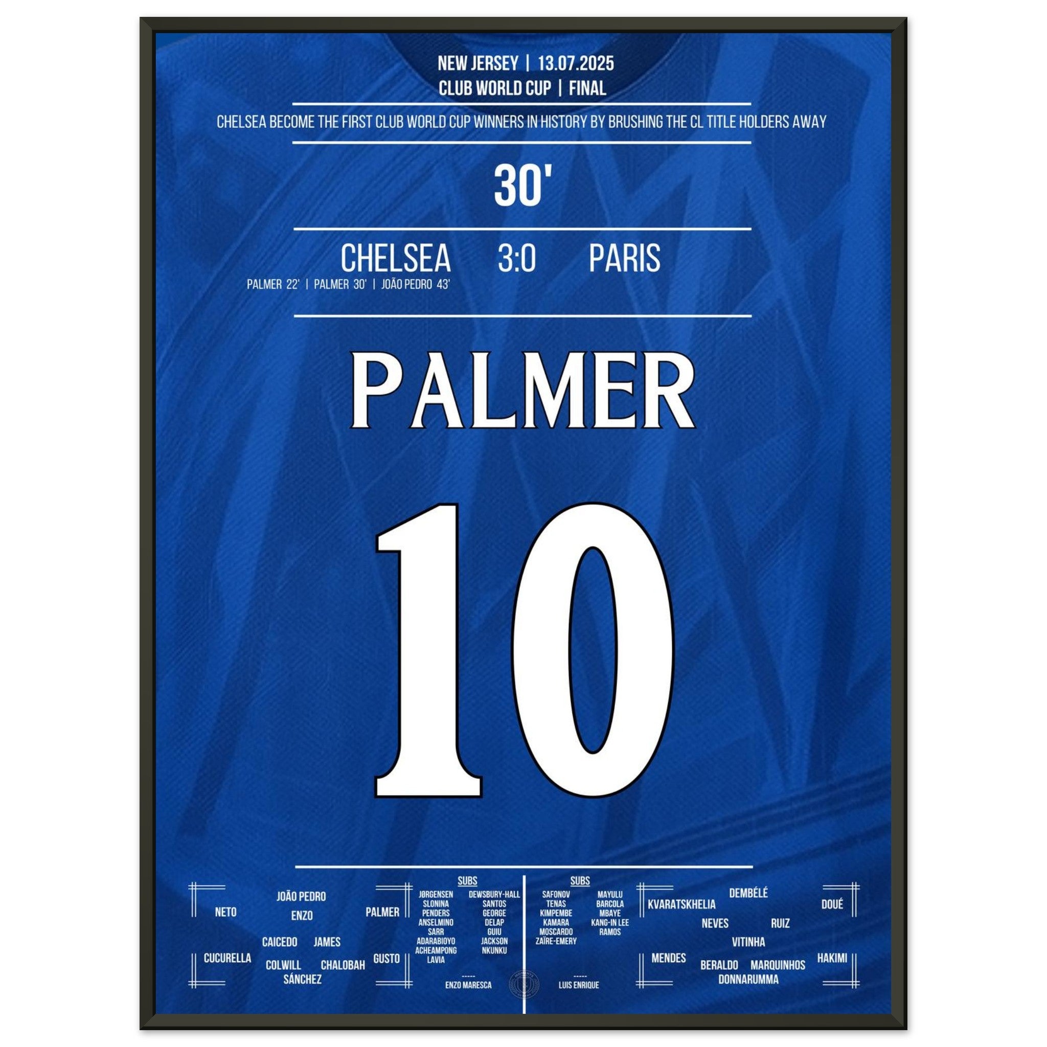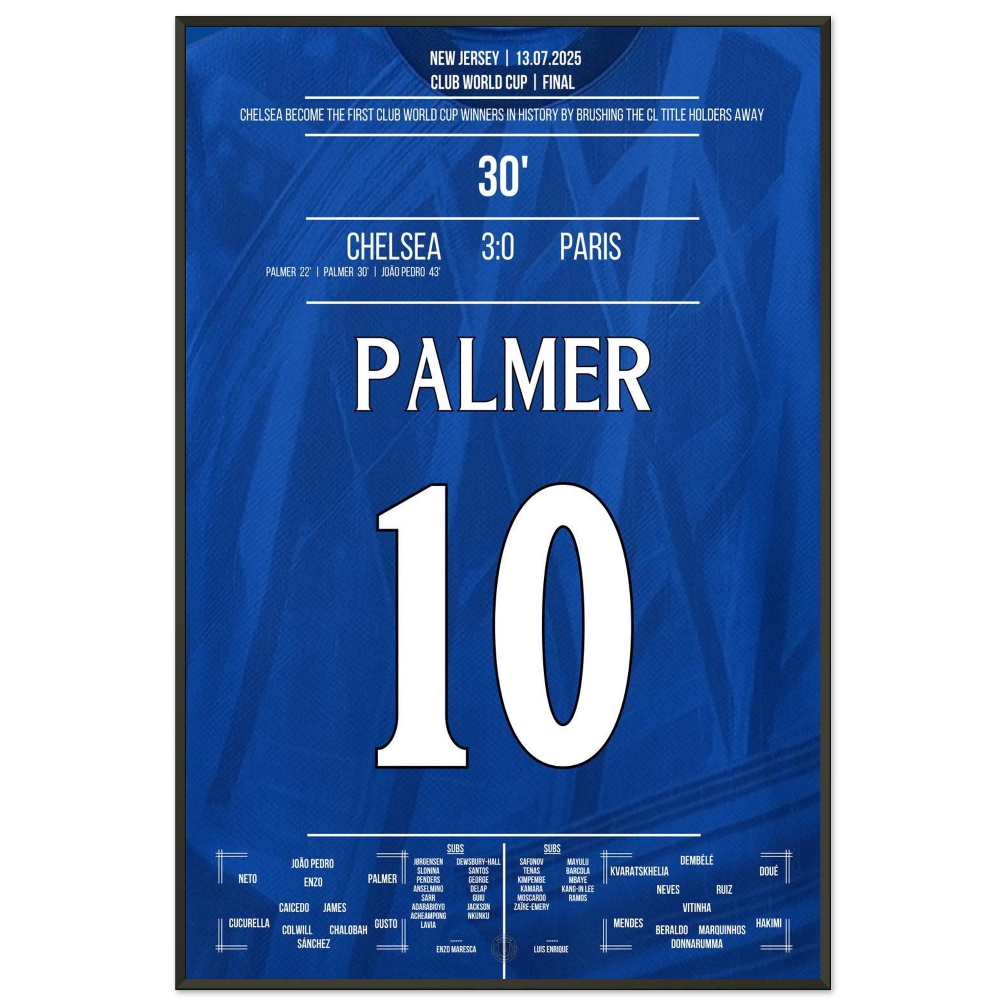 Cole Palmer – eiskalt im größten Moment. Mit seinem entscheidenden Treffer im Finale gegen Paris führt er Chelsea zum Titel und schreibt Geschichte: als erster Sieger überhaupt in der Klub-WM. Dieses Poster fängt den Moment ein, in dem ein junger Spieler zum Helden wird – und ein Verein zur Legende. Für alle, die an Magie, Timing und blaue Geschichte glauben.