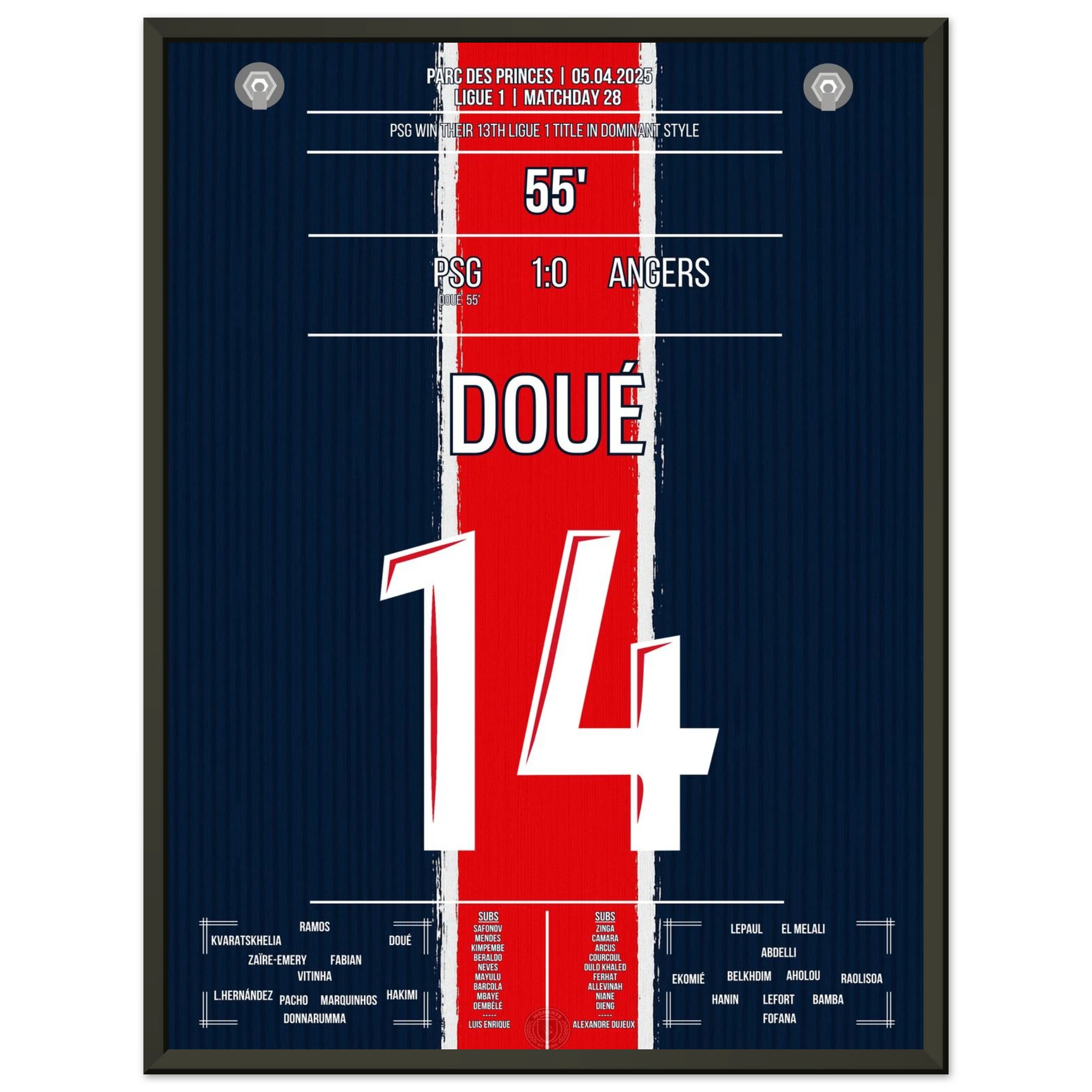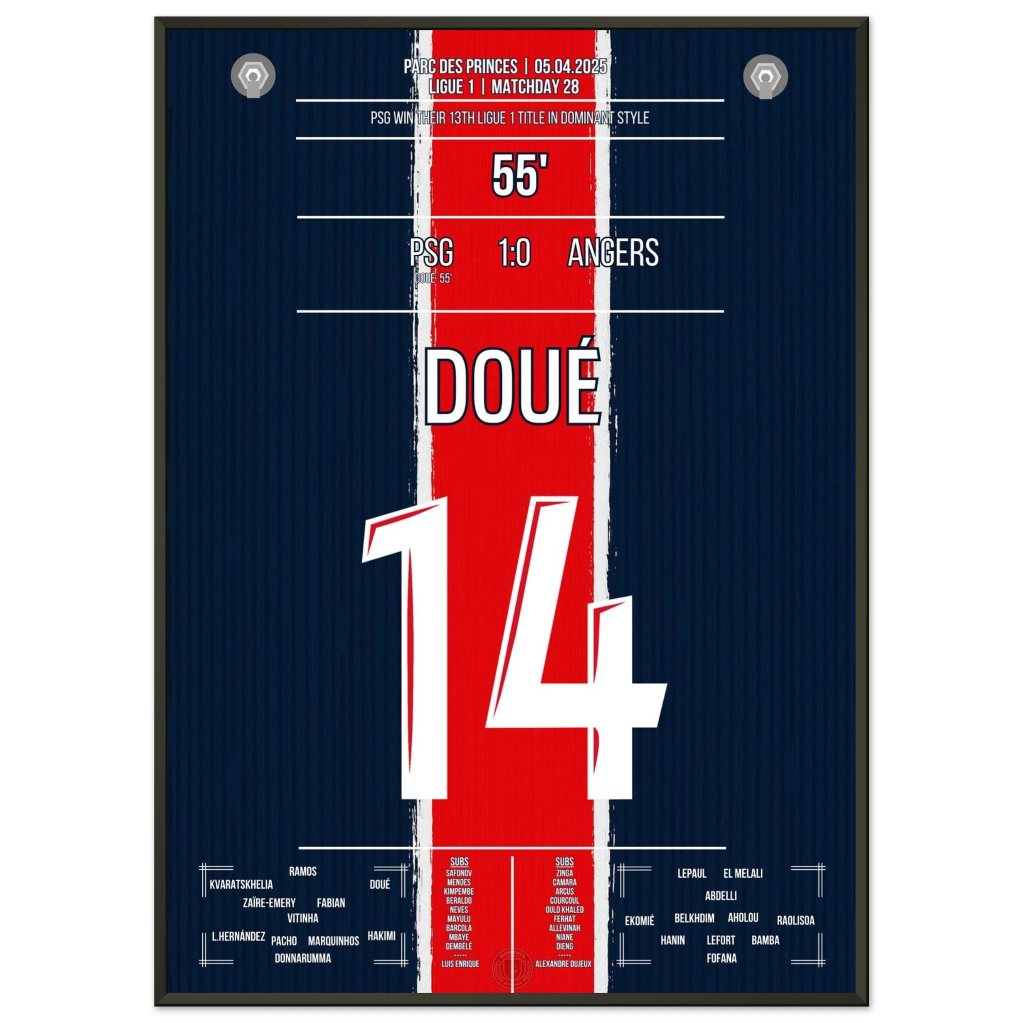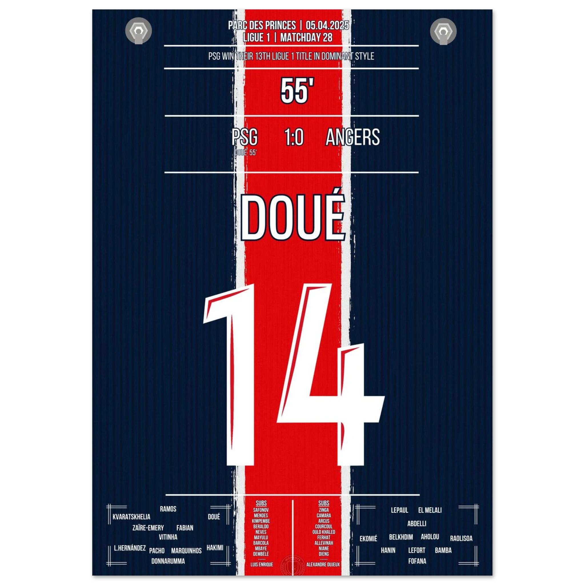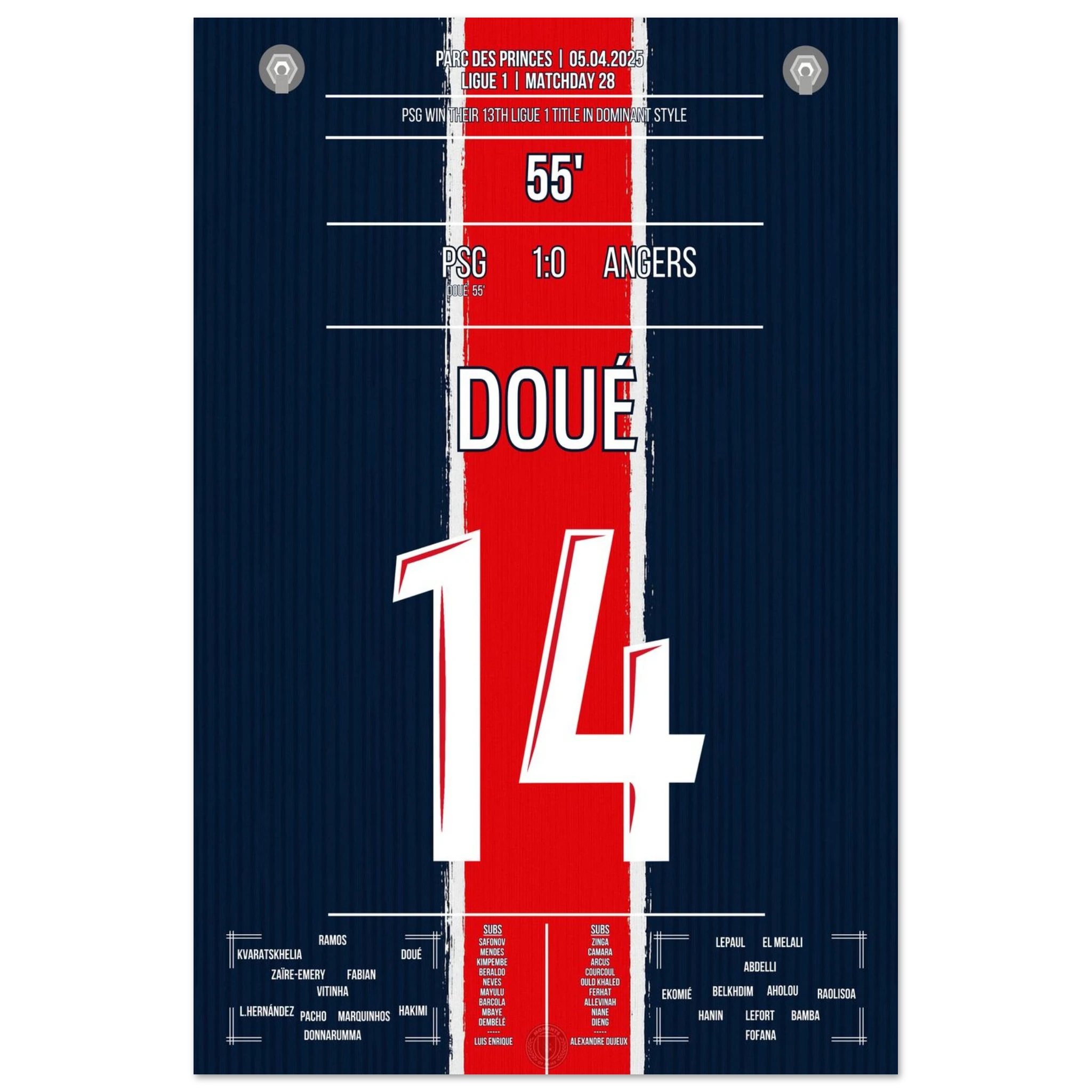 Gegen ein tief stehendes Angers tut sich Paris lange schwer. Doch in der 56. Minute erlöst Désiré Doué die Fans im Prinzenpark mit einem wuchtigen Schuss aus der Distanz. Der 1:0-Sieg bleibt glanzlos – aber am Ende reichen sie zum vorzeitigen Gewinn der 13. Meisterschaft.