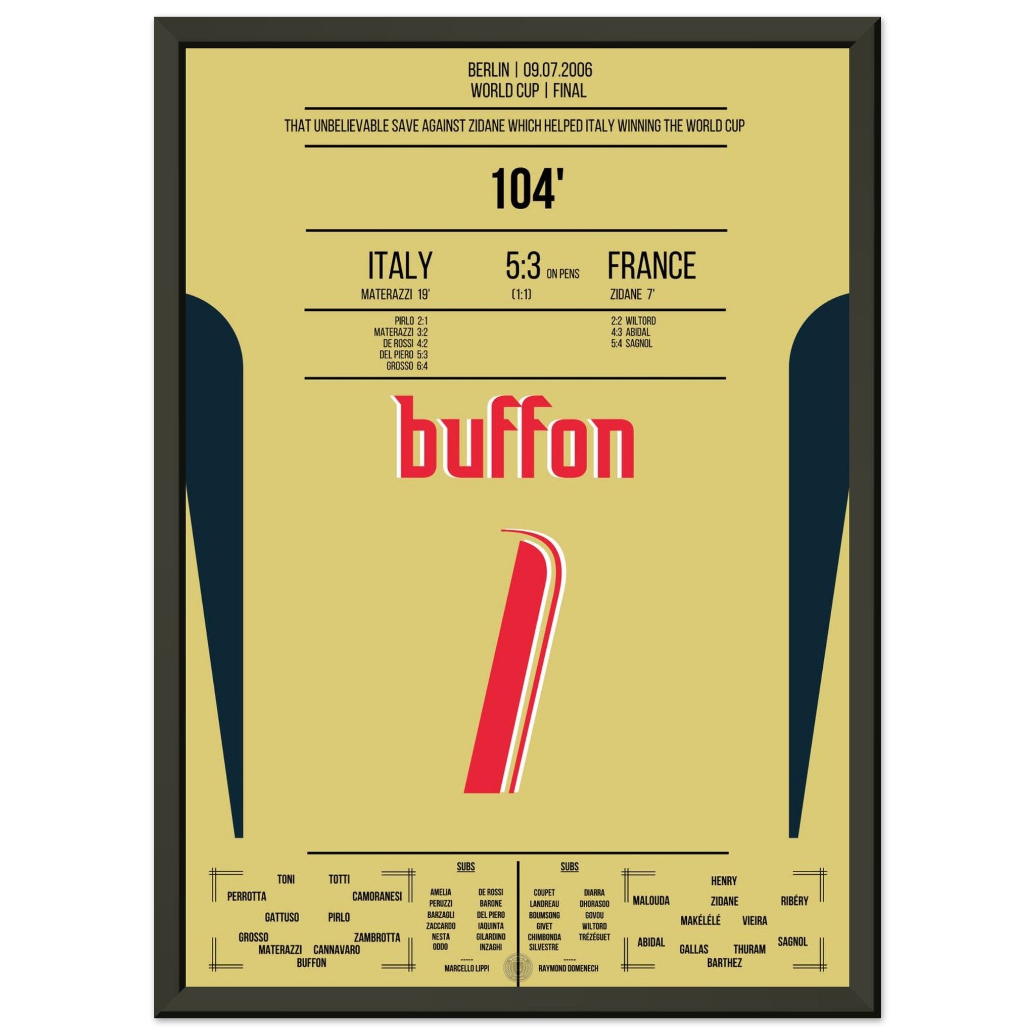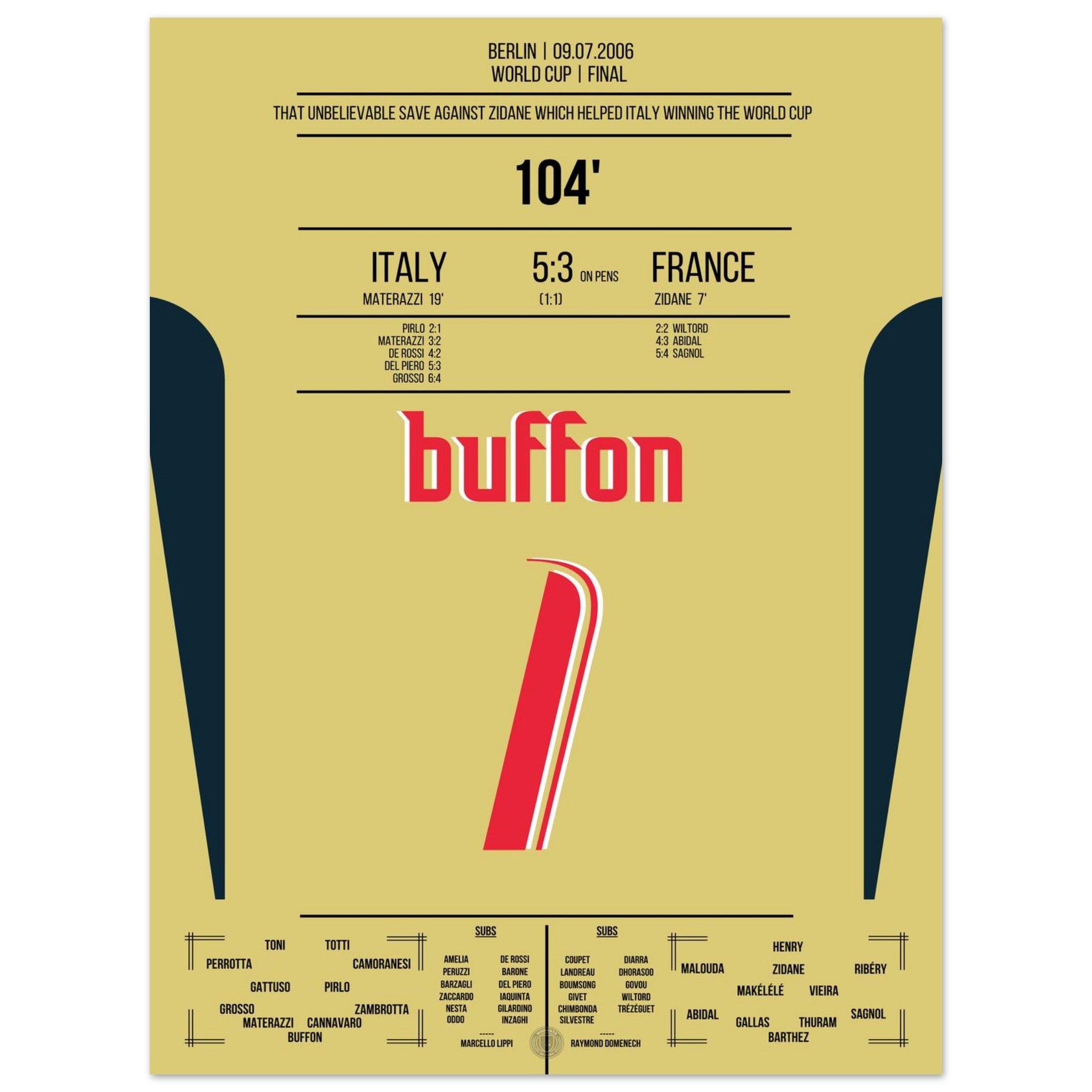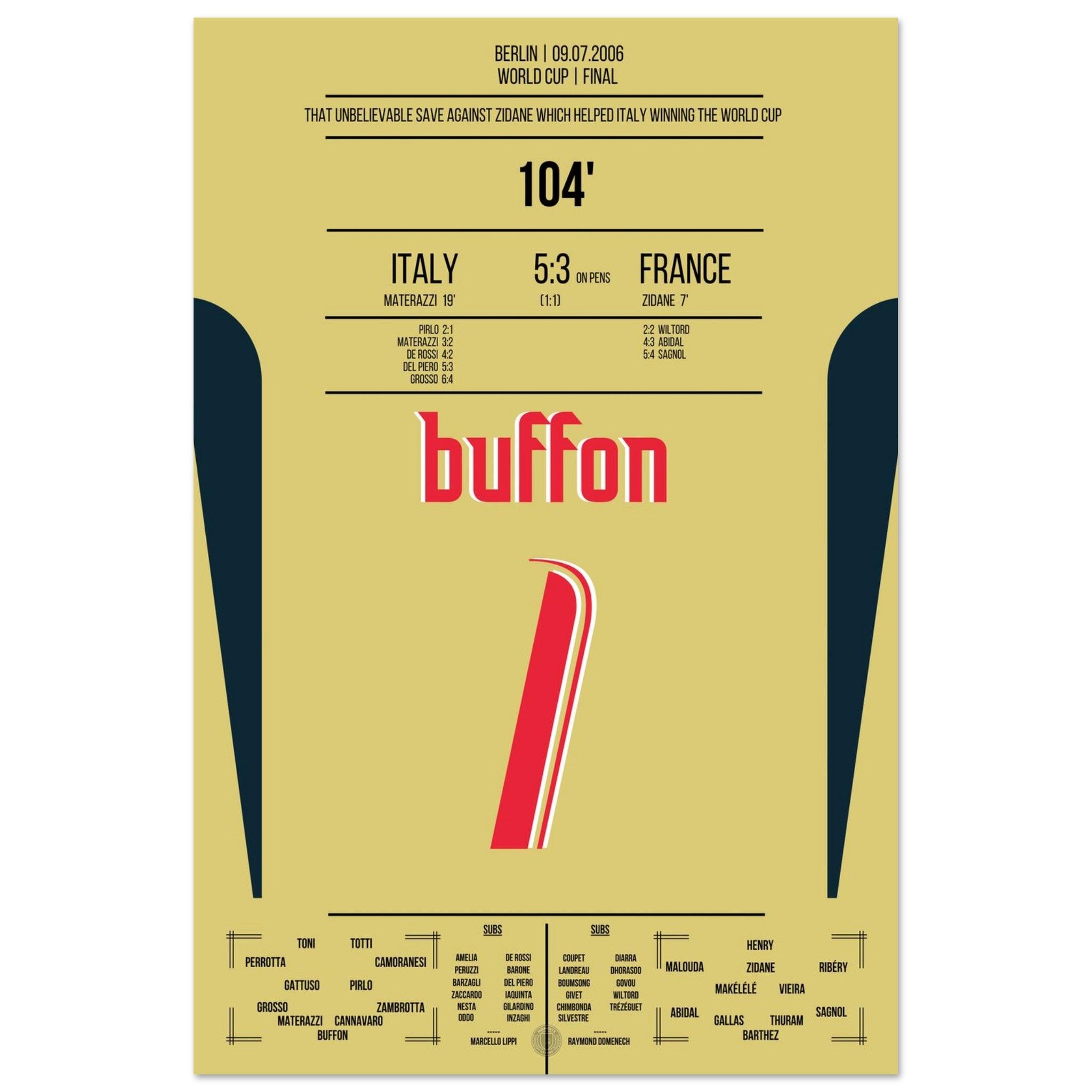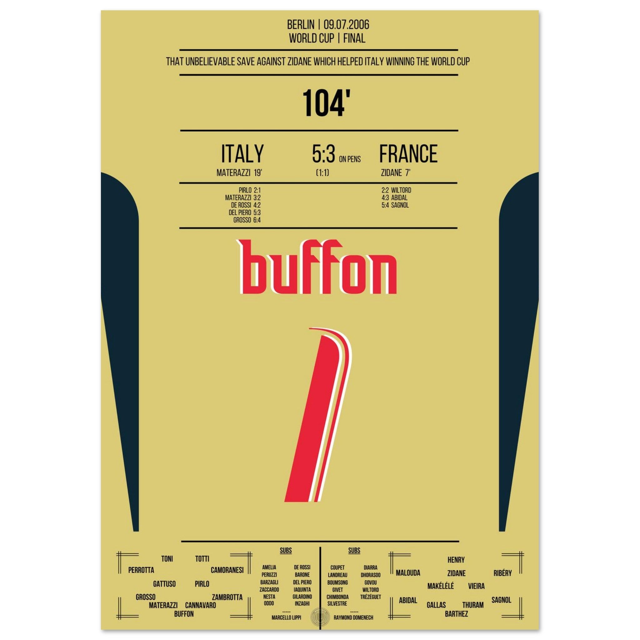 Buffon's legendary reaction against Zidane in the 2006 World Cup final.