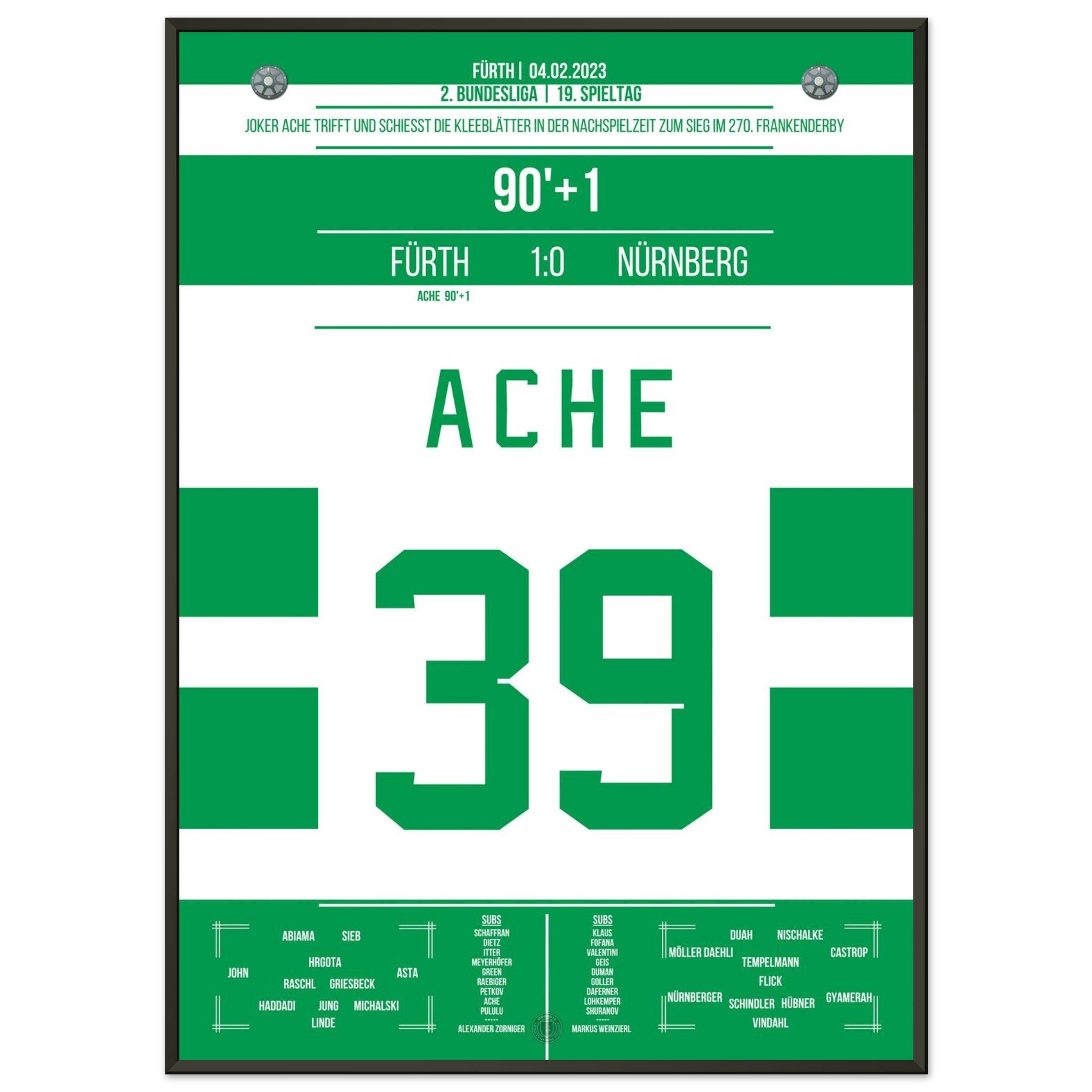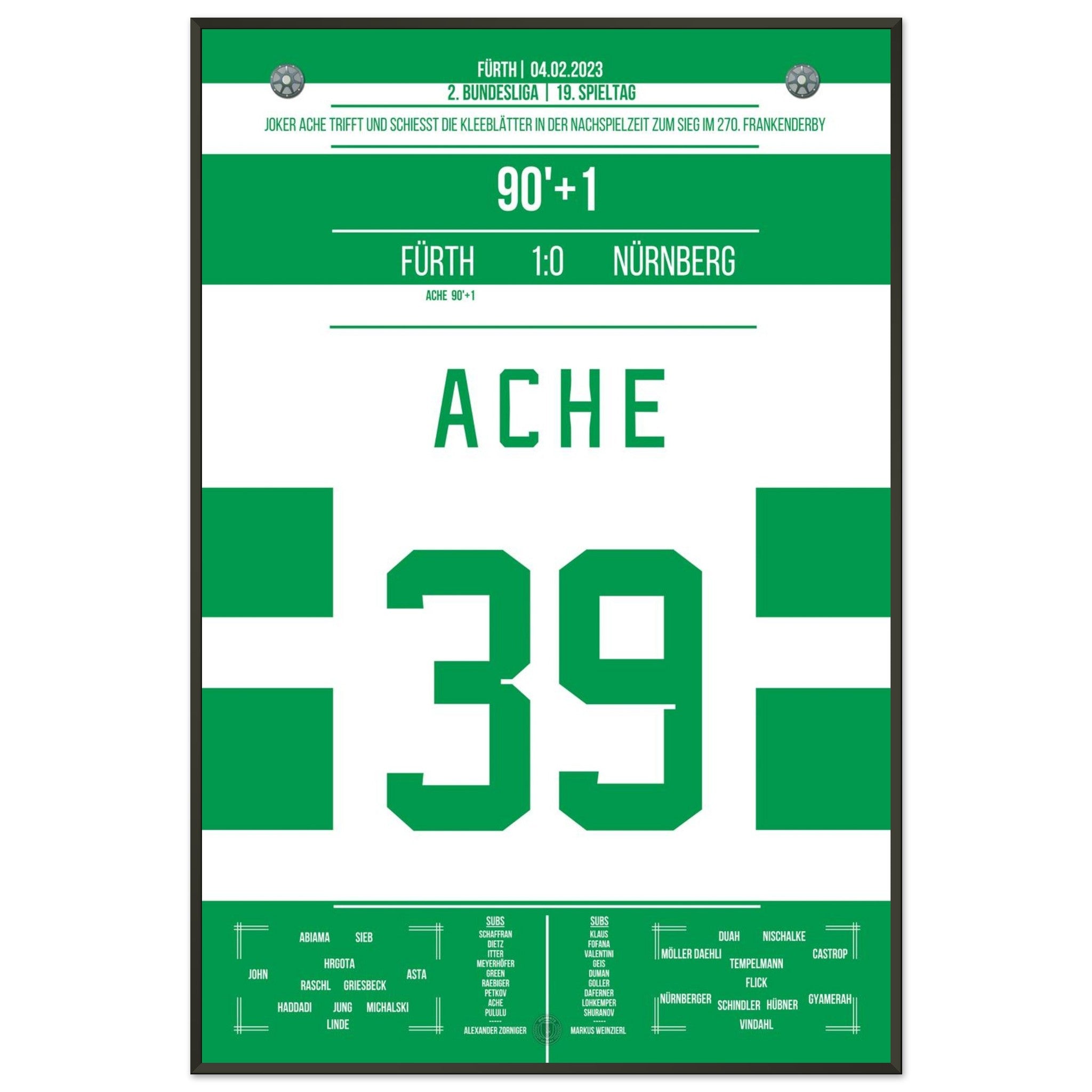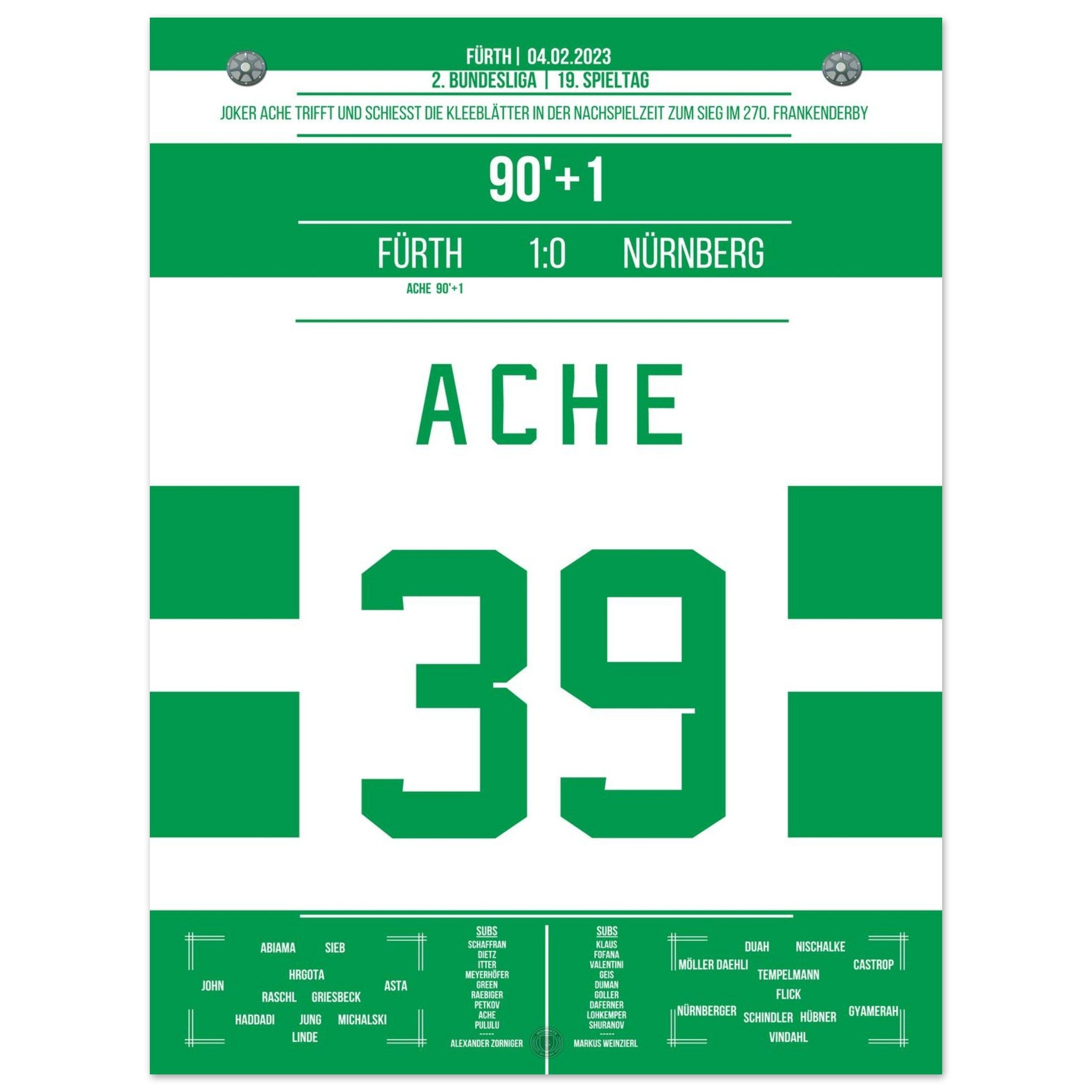 February 4, 2023 – Fürth vs. Nürnberg 1:0: In stoppage time, Ragnar Ache decides the Franconian derby with a close-range rebound, sending the stadium on Laubenweg into jubilation. His goal for 1:0 is the final scene of the match and grants Fürth a late but deserved derby victory. Our poster captures this emotional conclusion for eternity.