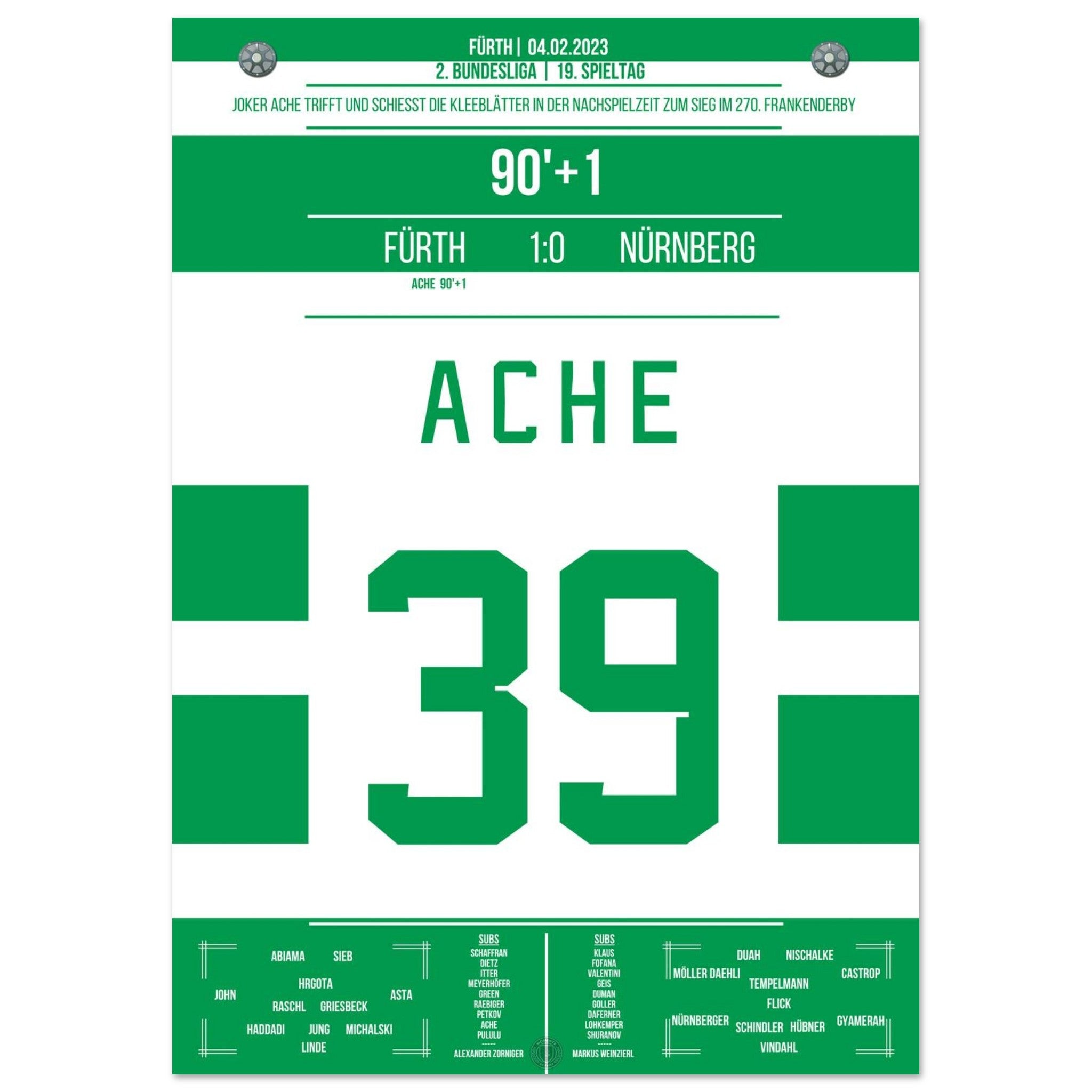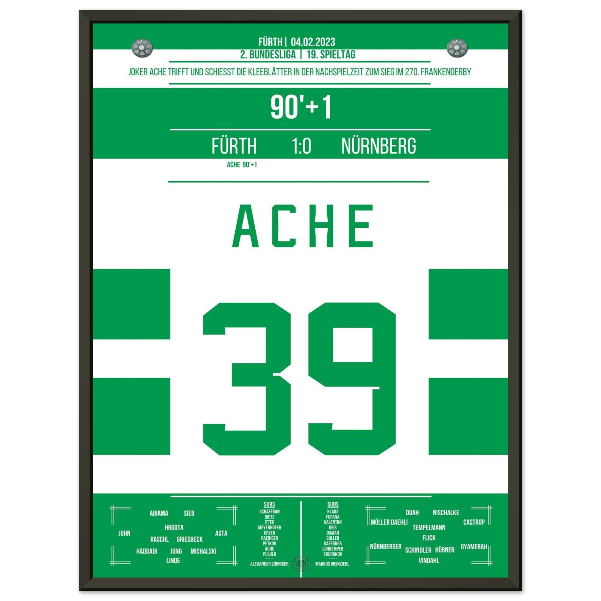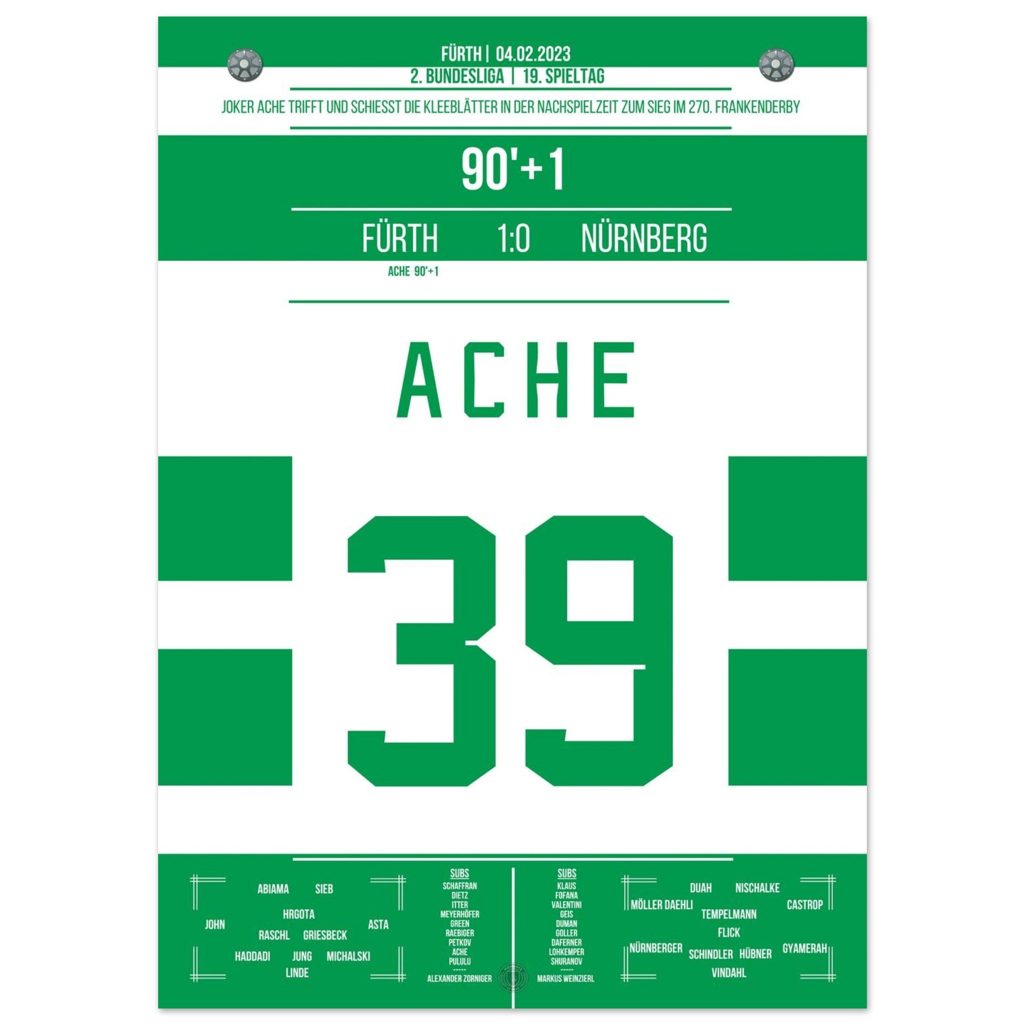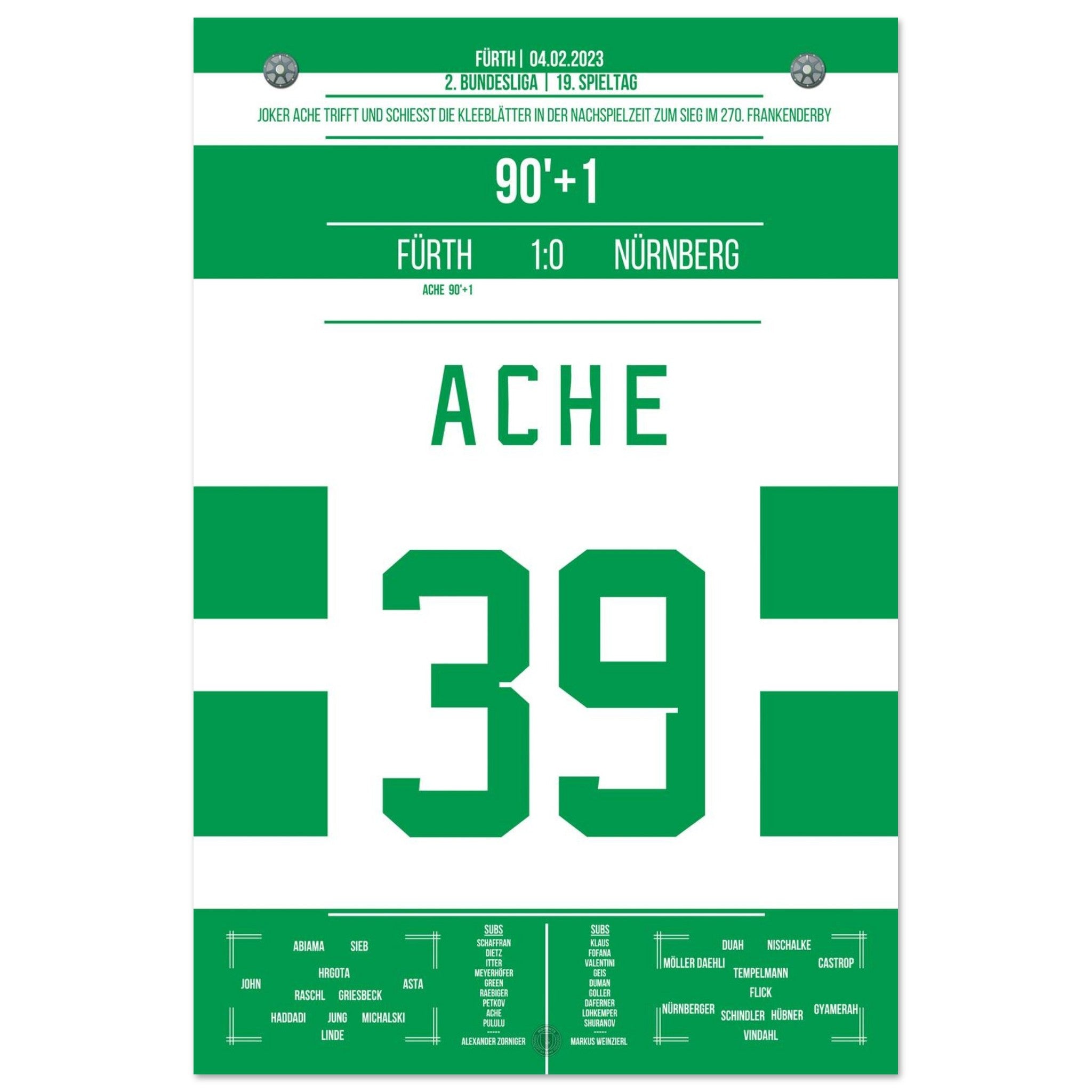 February 4, 2023 – Fürth vs. Nürnberg 1:0: In stoppage time, Ragnar Ache decides the Franconian derby with a close-range rebound, sending the stadium on Laubenweg into jubilation. His goal for 1:0 is the final scene of the match and grants Fürth a late but deserved derby victory. Our poster captures this emotional conclusion for eternity.