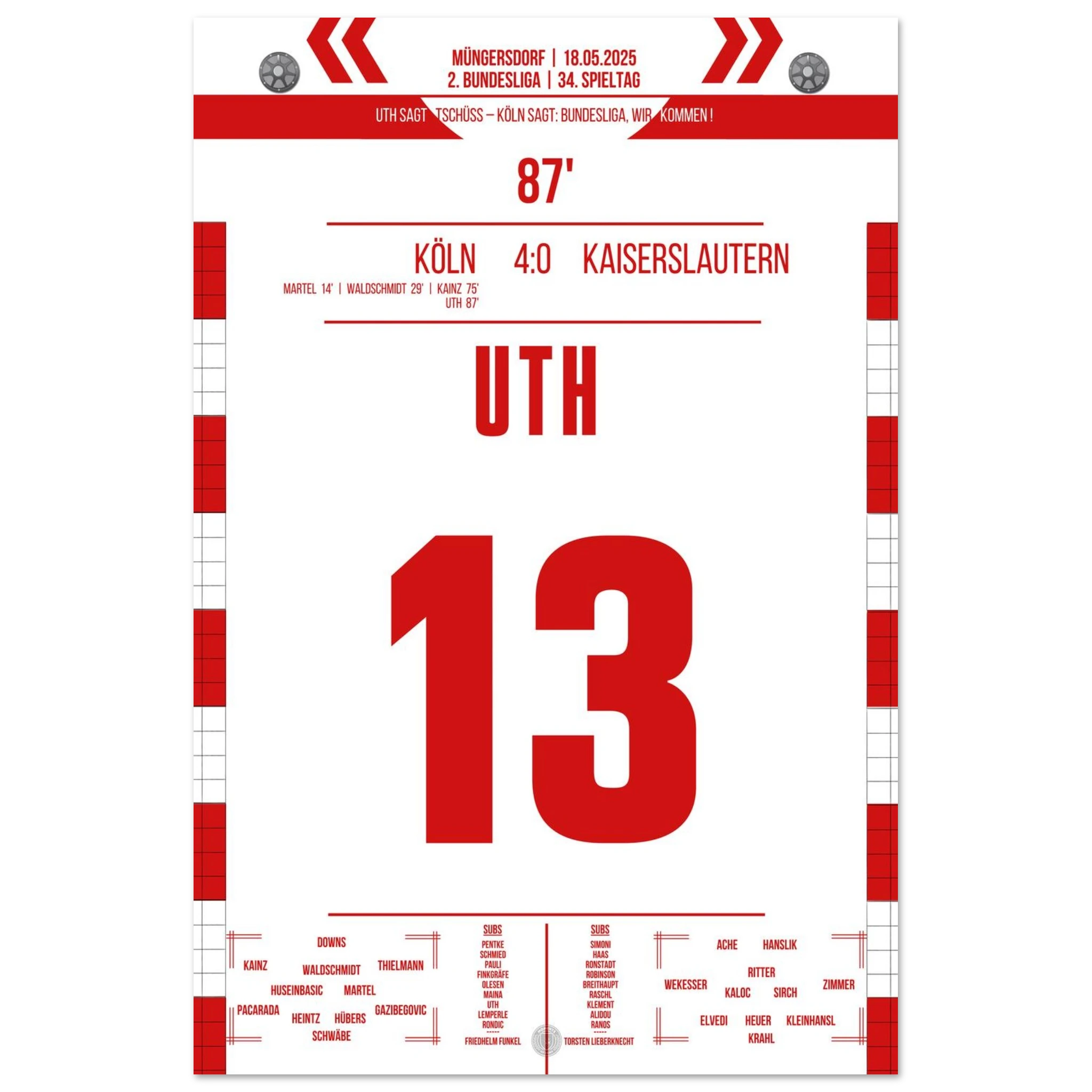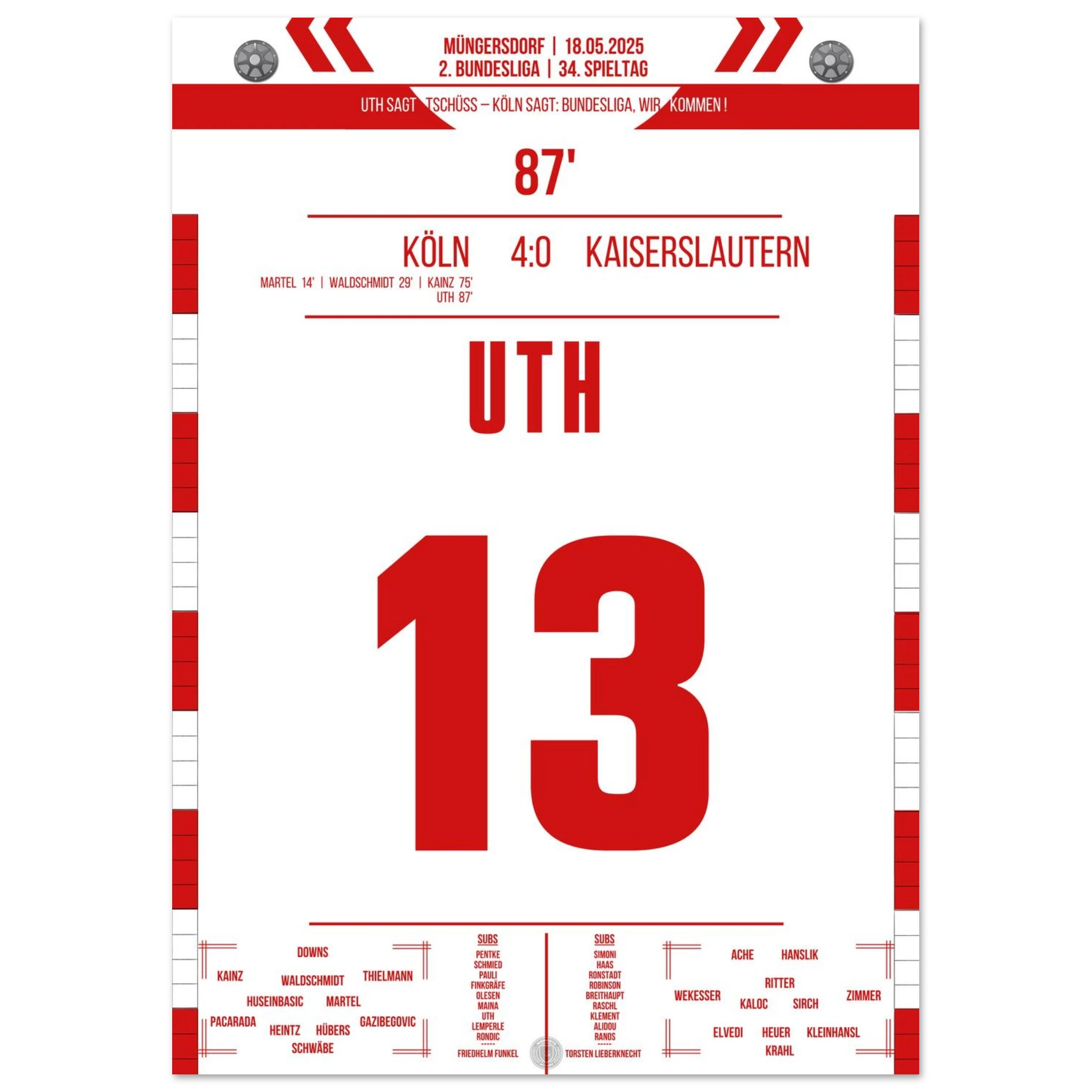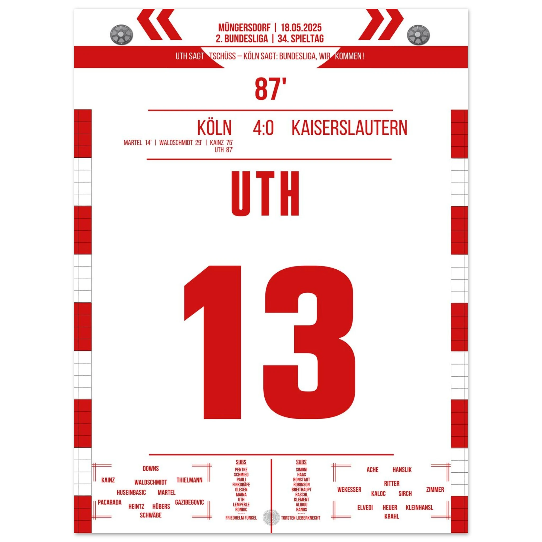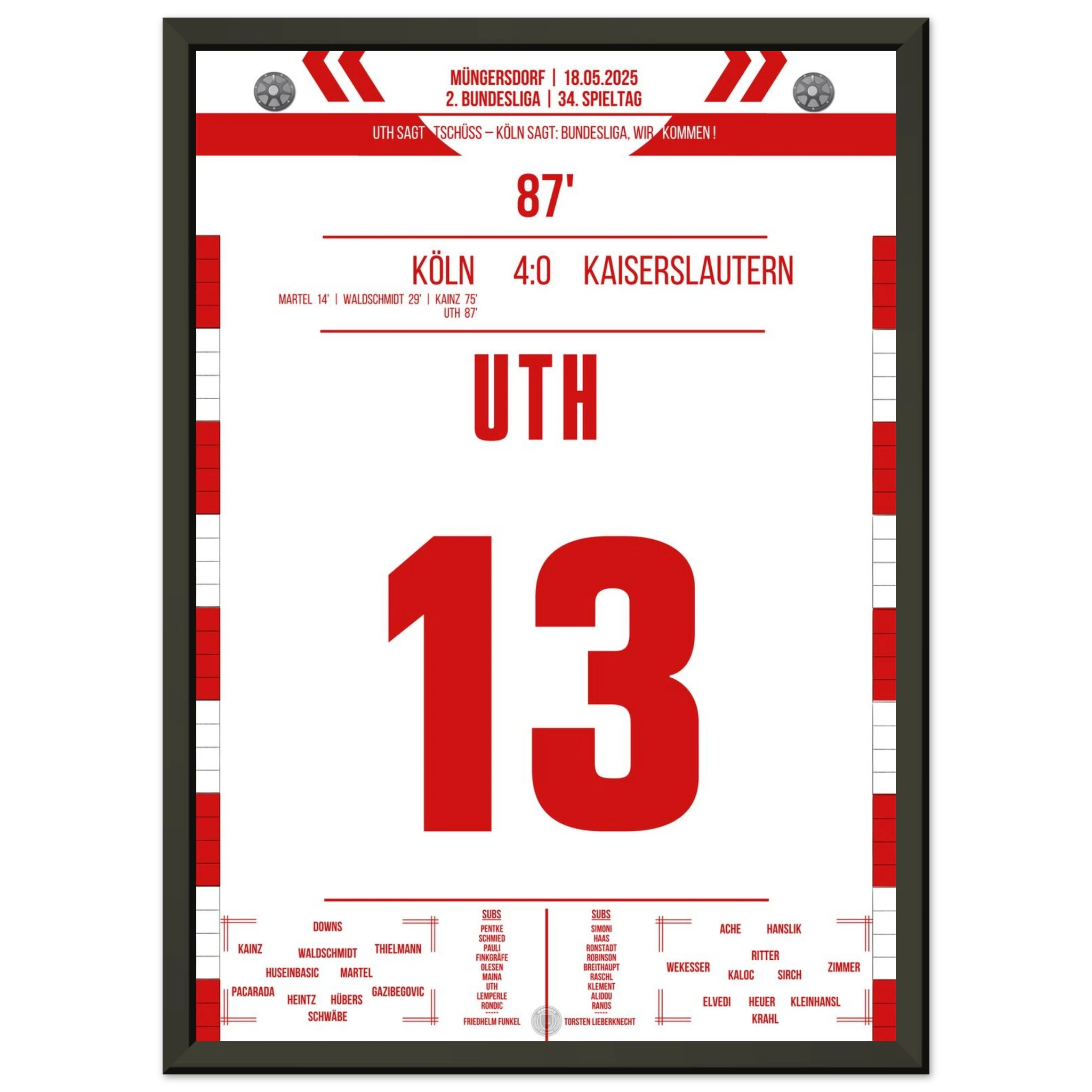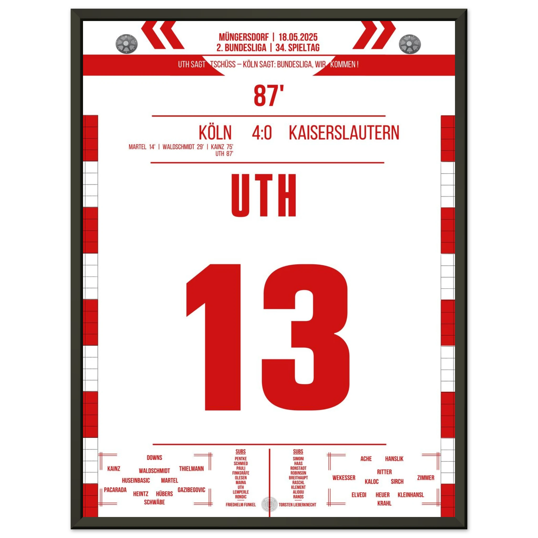 18. Mai 2025 – Köln vs. Kaiserslautern 4:0: Beim emotionalen Heimfinale verabschiedet sich Mark Uth mit Standing Ovations von den Fans des FC. Ein klarer Sieg, Aufstieg, ein bewegender Moment – und ein Abschied, der unter die Haut geht. Unser Poster hält diesen würdevollen Uth-Abschied in Rot-Weiß für die Ewigkeit fest.