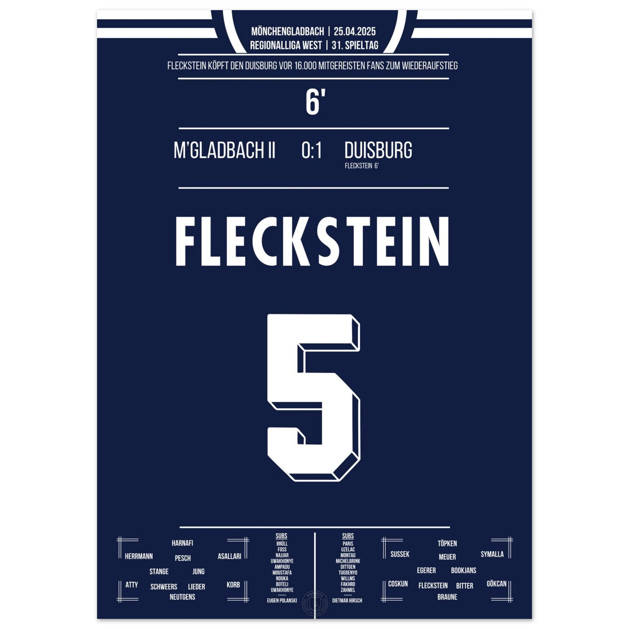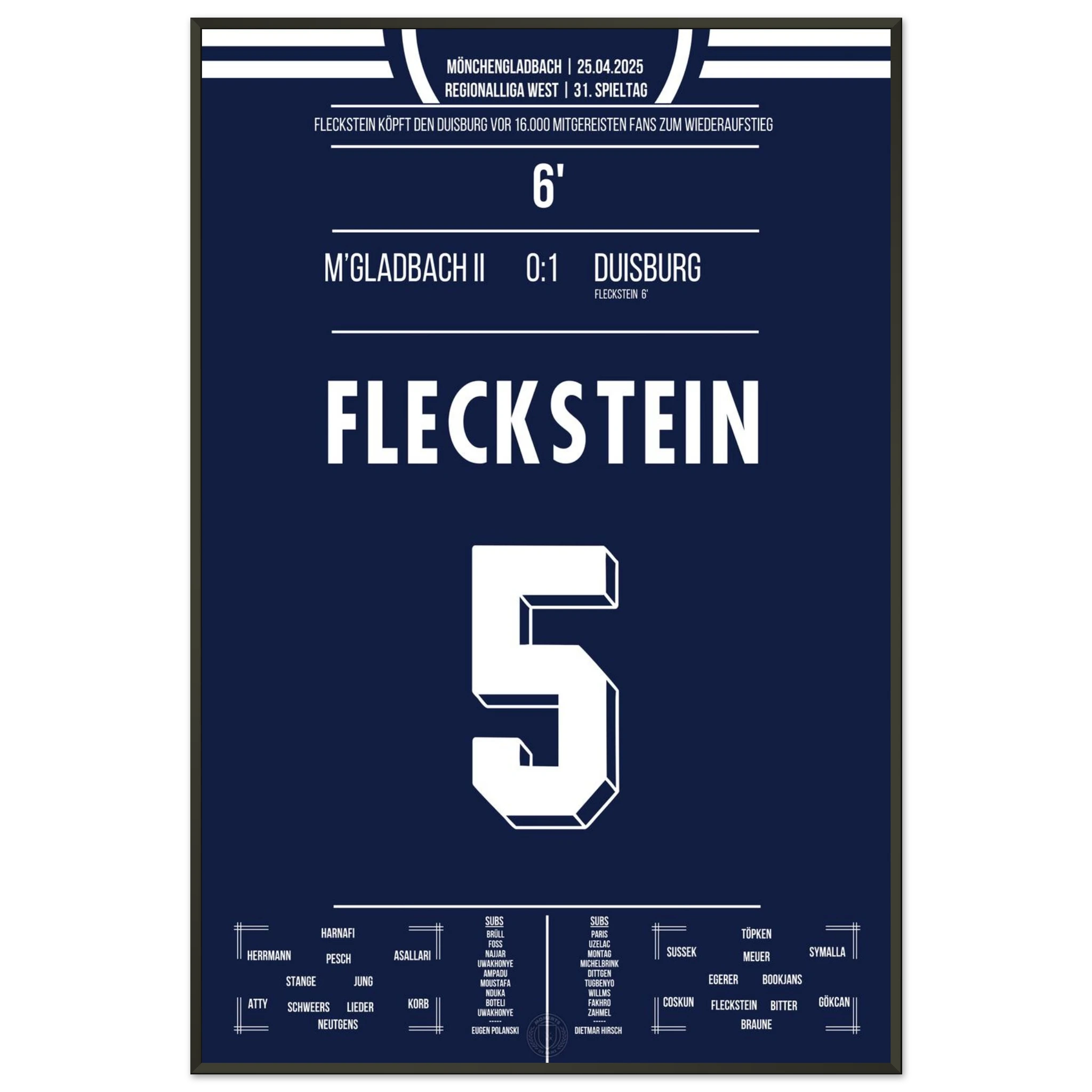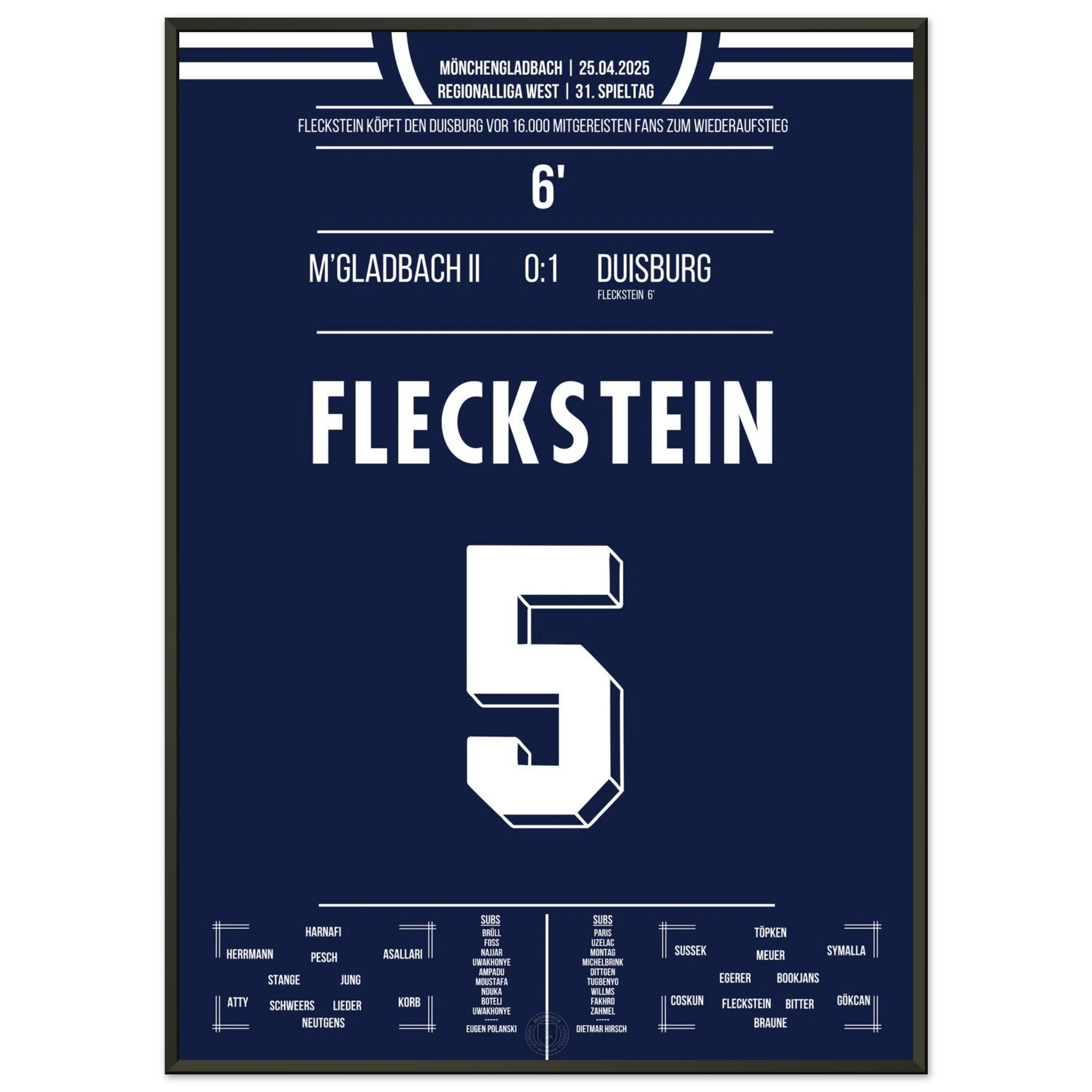18. Mai 2024 – Mönchengladbach II vs. Duisburg 0:1: In der 93. Minute köpft Marvin Fleckstein die Zebras zum entscheidenden Auswärtssieg am letzten Spieltag und sichert damit den Aufstieg in die 3. Liga. Ein dramatischer Schlusspunkt einer nervenaufreibenden Saison. Unser Poster verewigt diesen emotionalen Aufstiegsmoment.