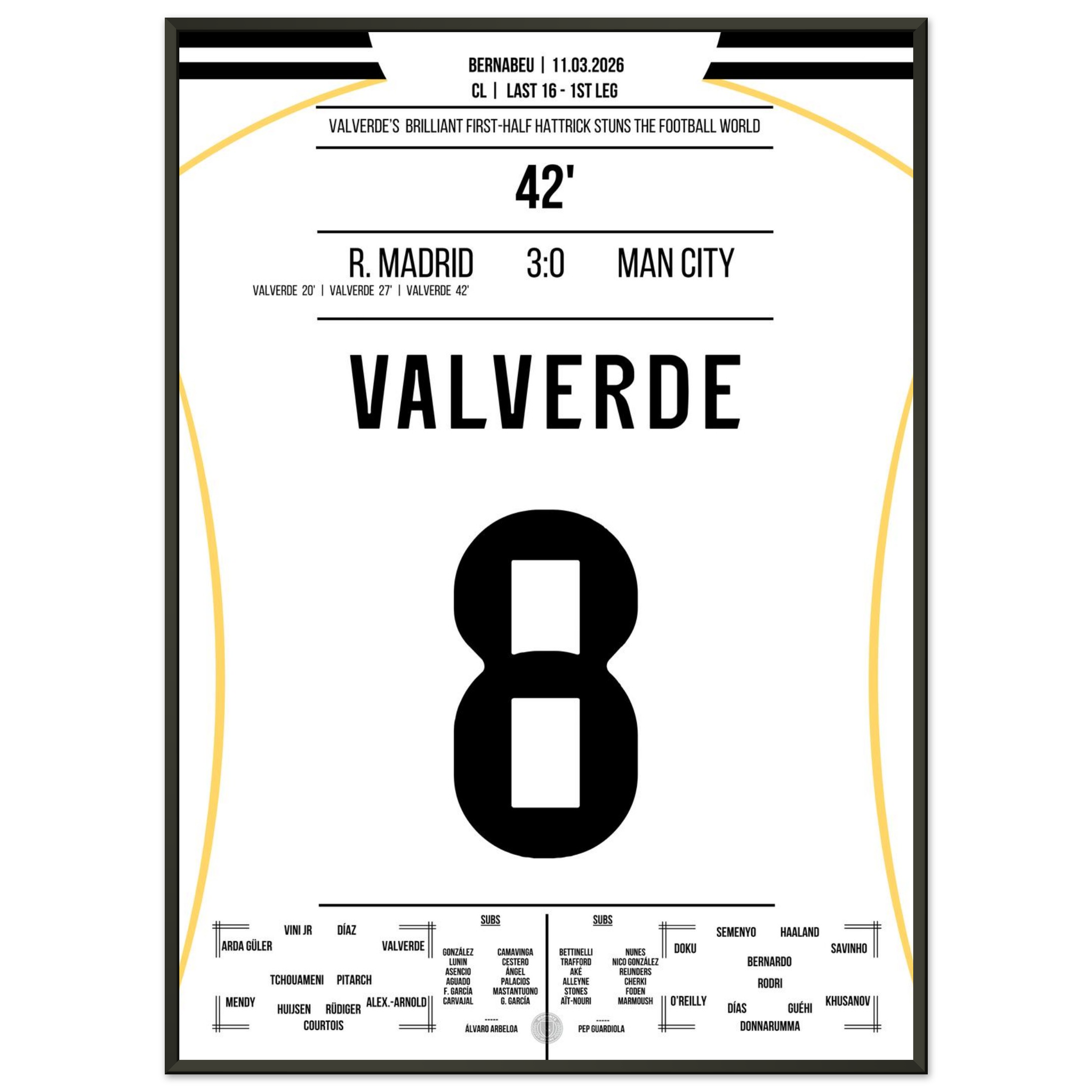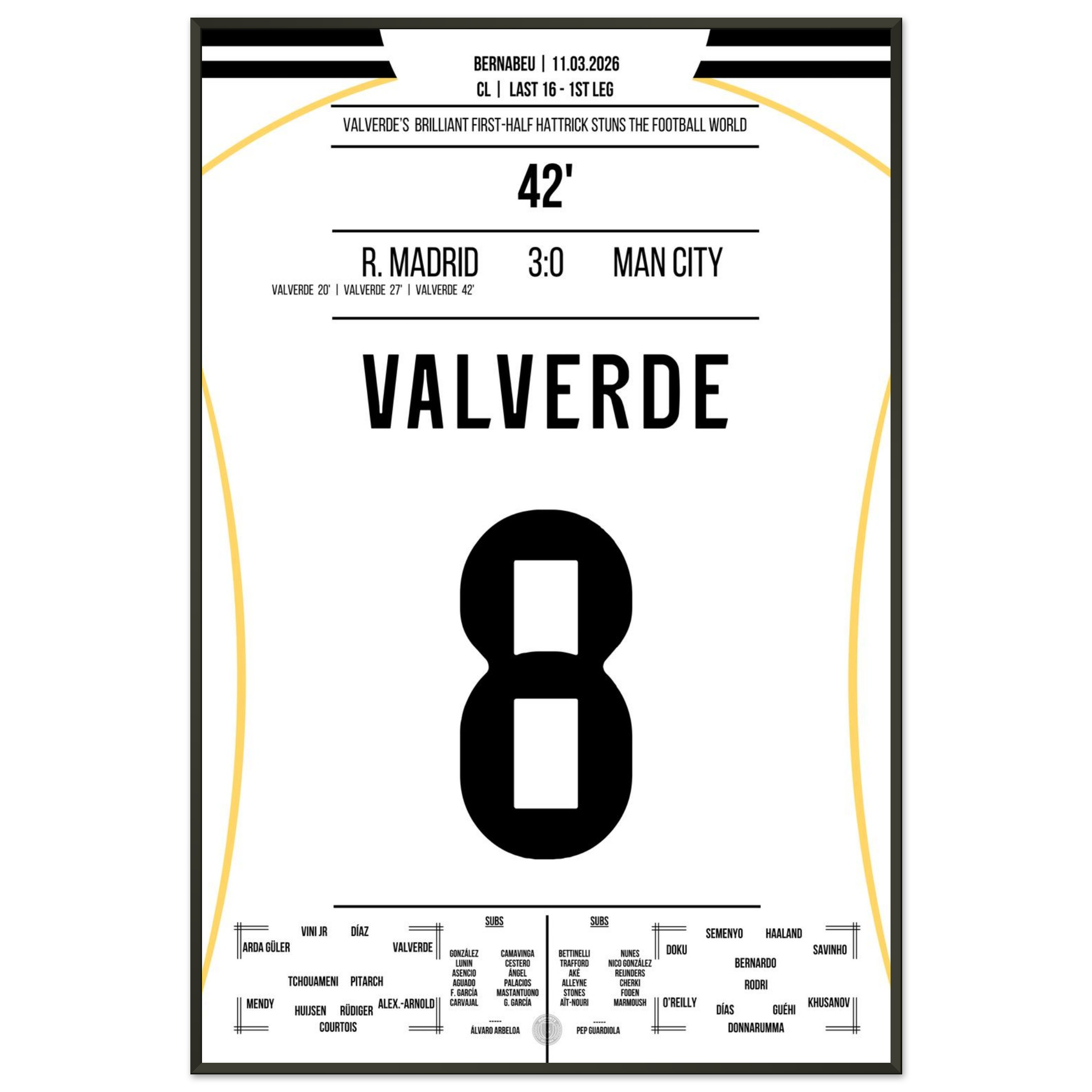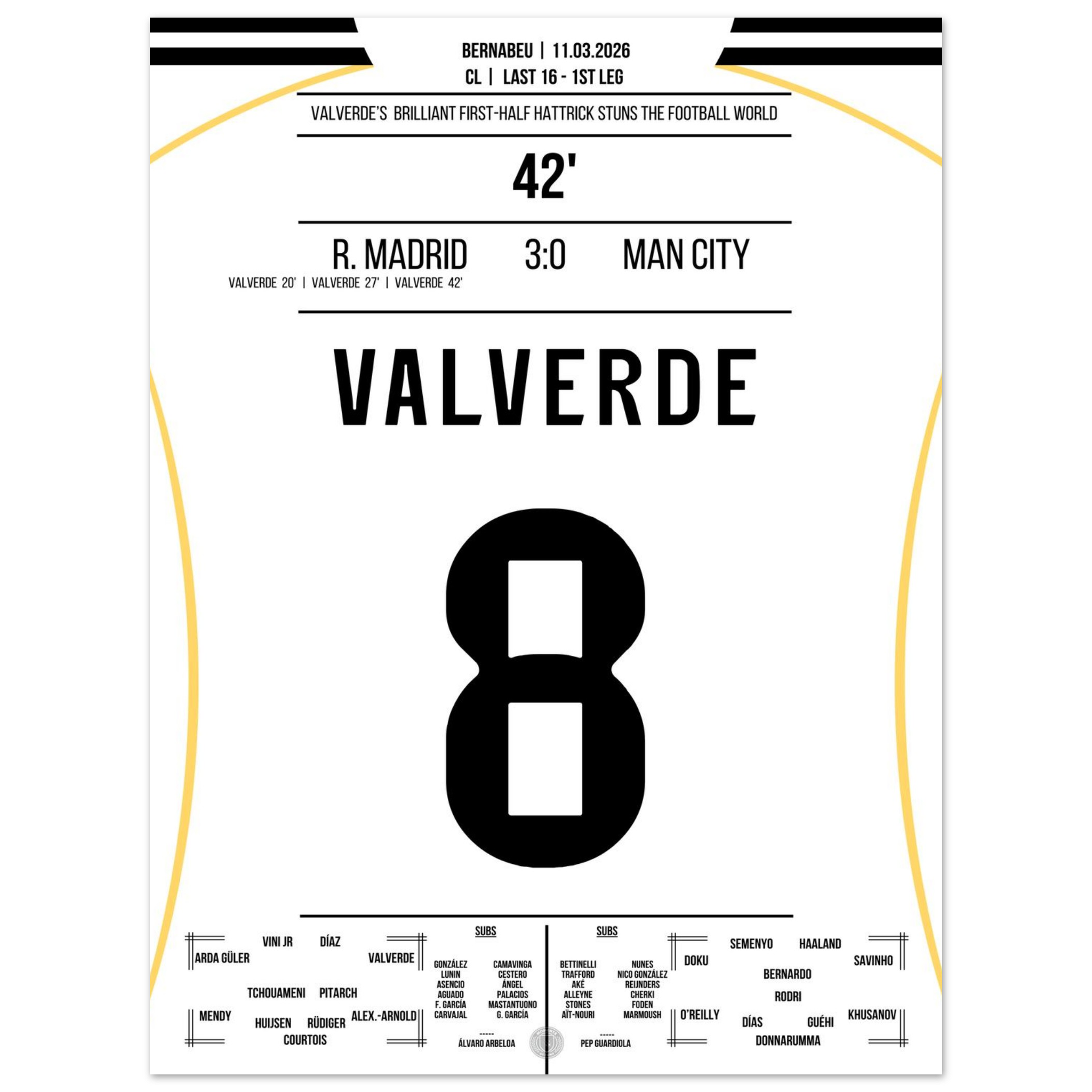 Dieses Poster hält den Moment fest, in dem Valverde mit seinem Hattrick das Bernabéu zum Beben brachte – eine Nacht für die Ewigkeit.